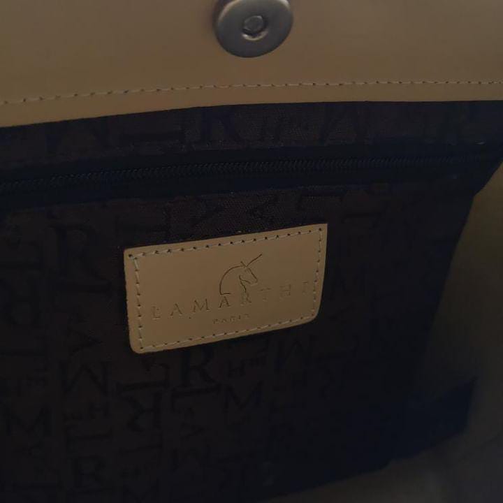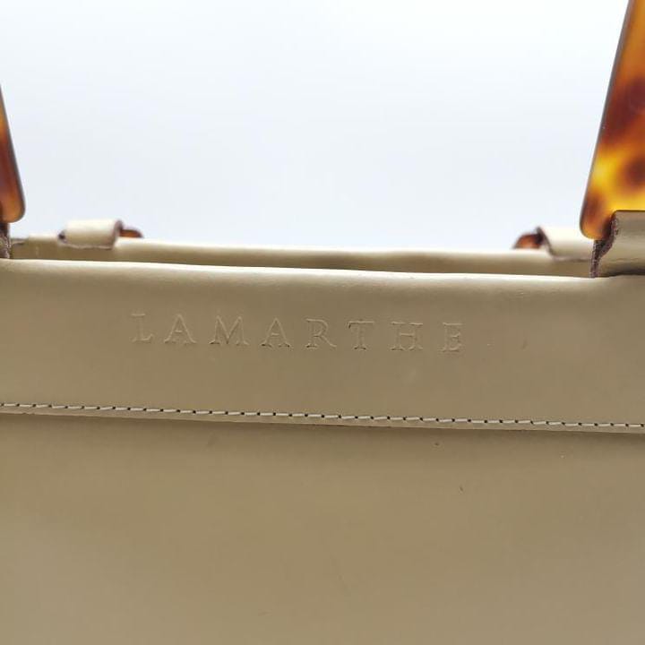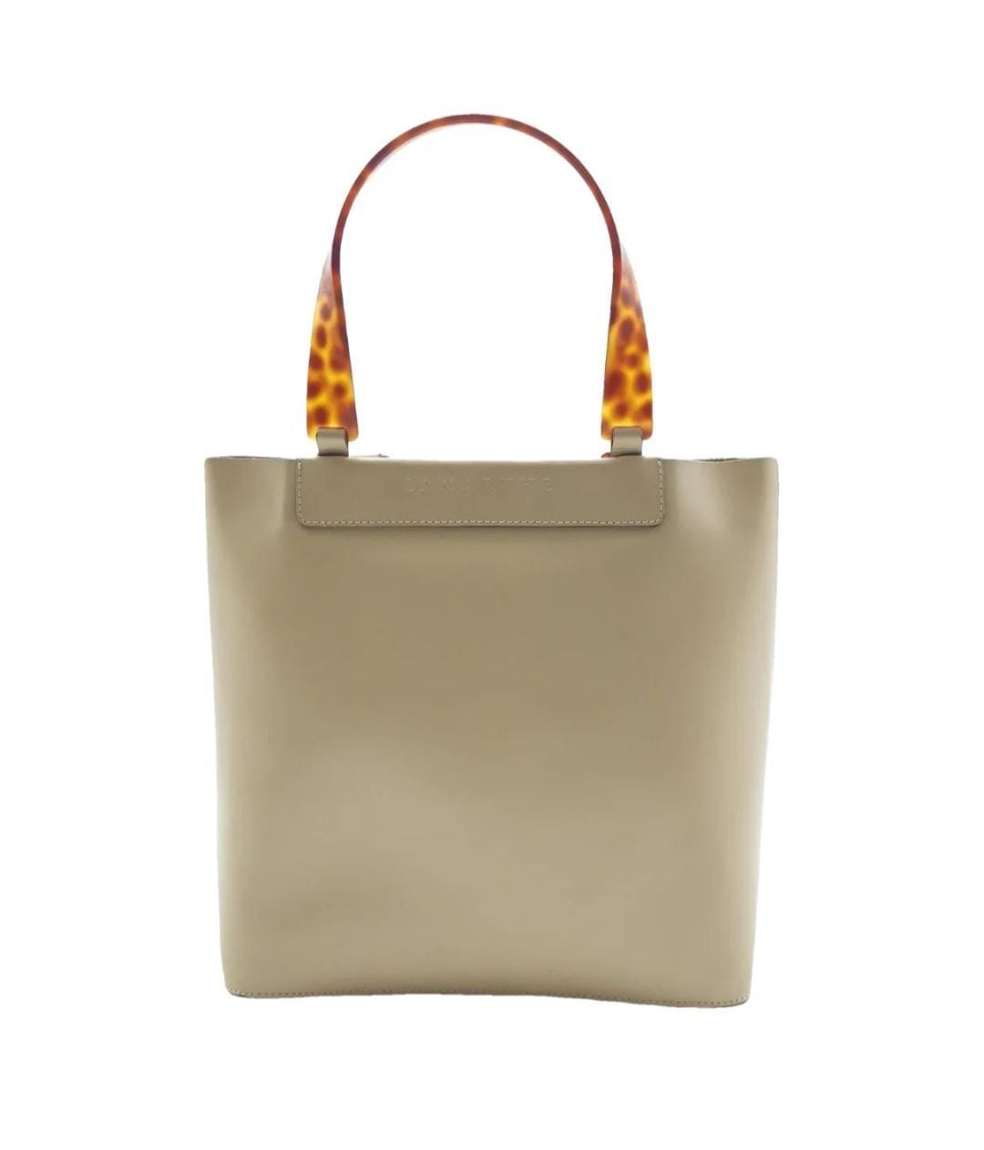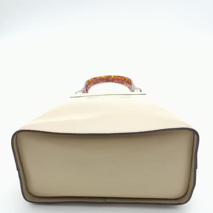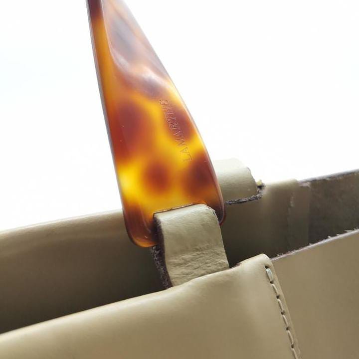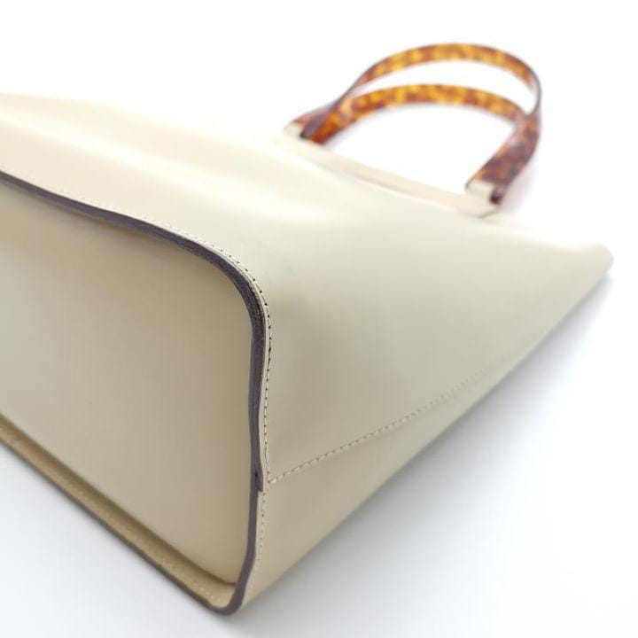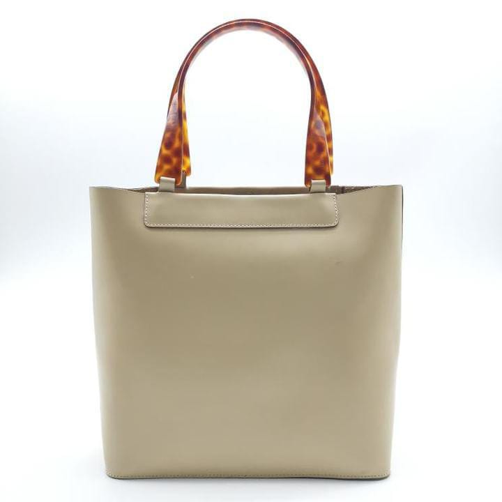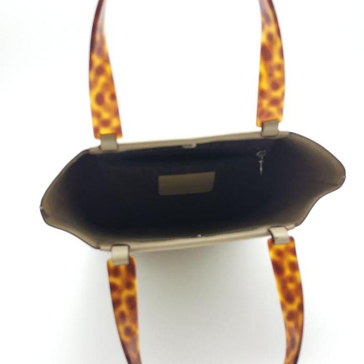 Beige leather bag with tortoiseshell effect plastic handles. Suede interior with fabric pocket, a few small marks.