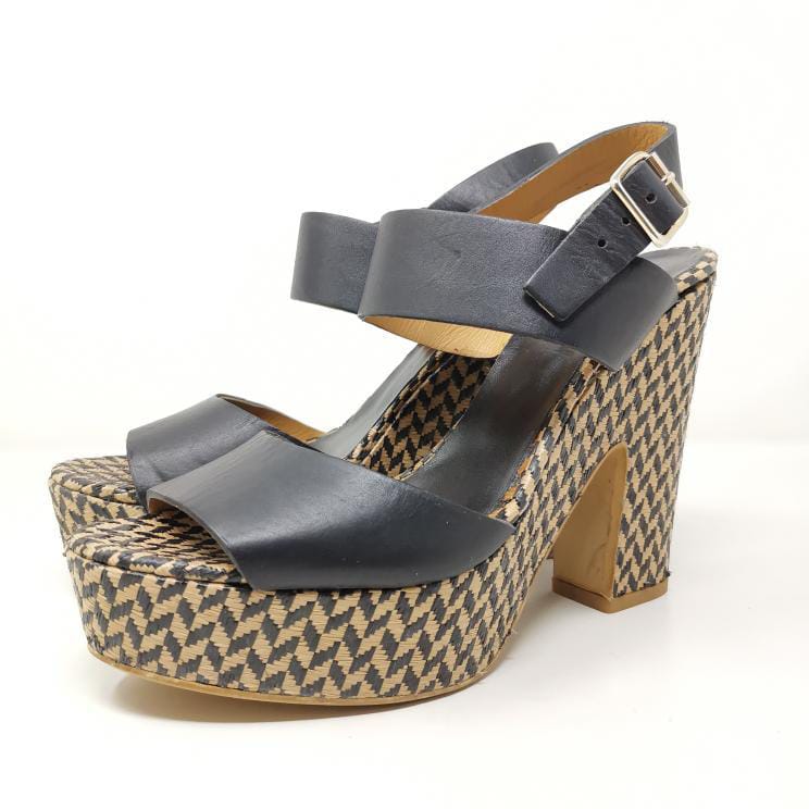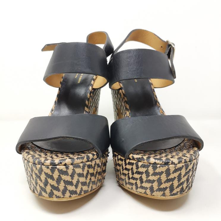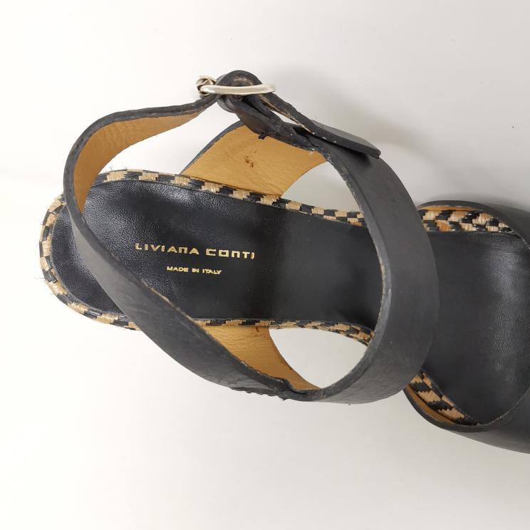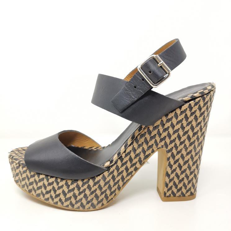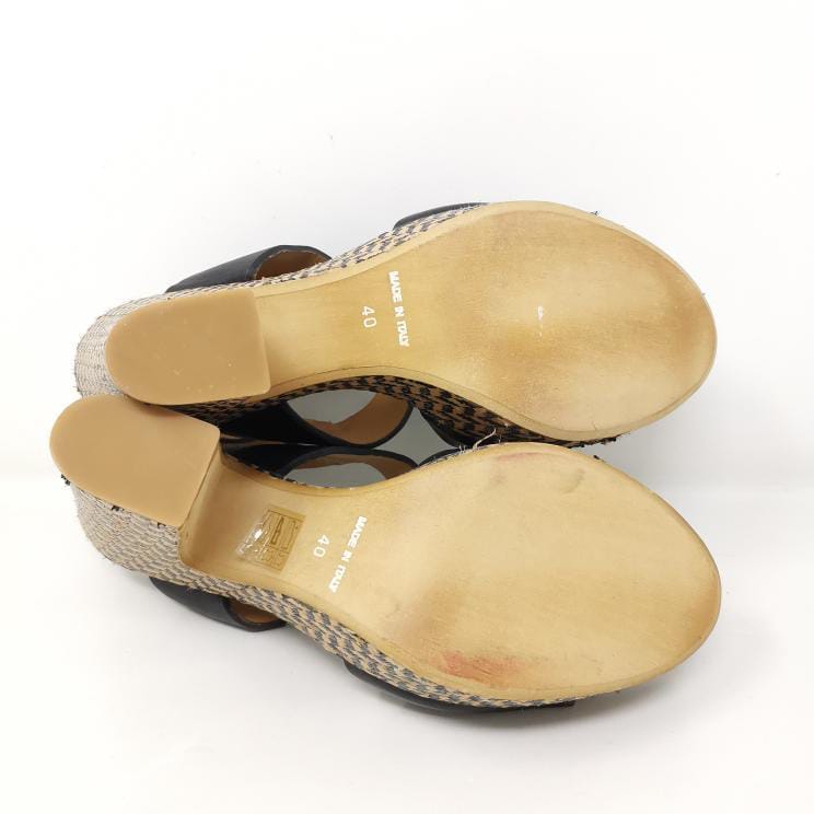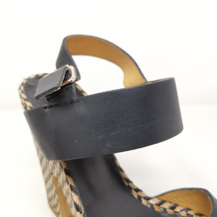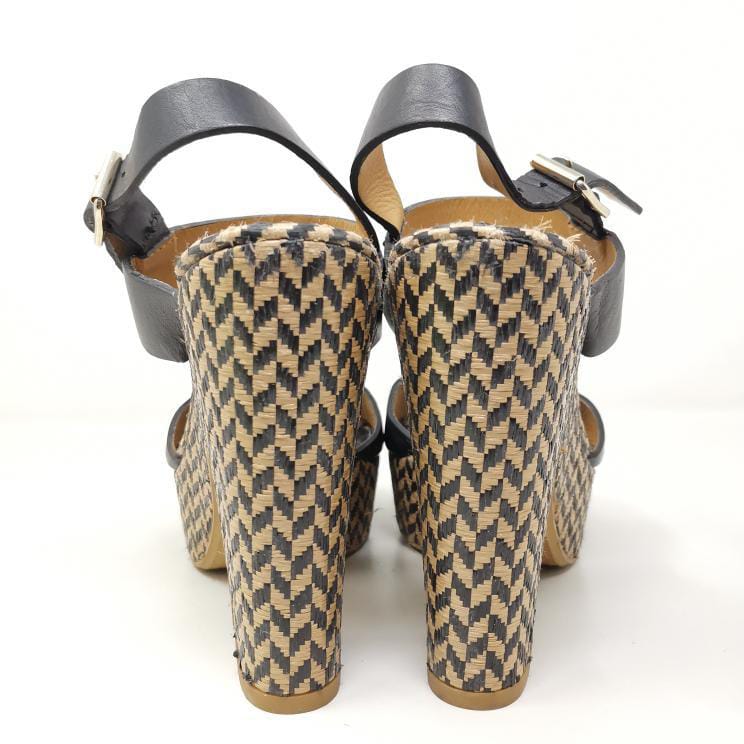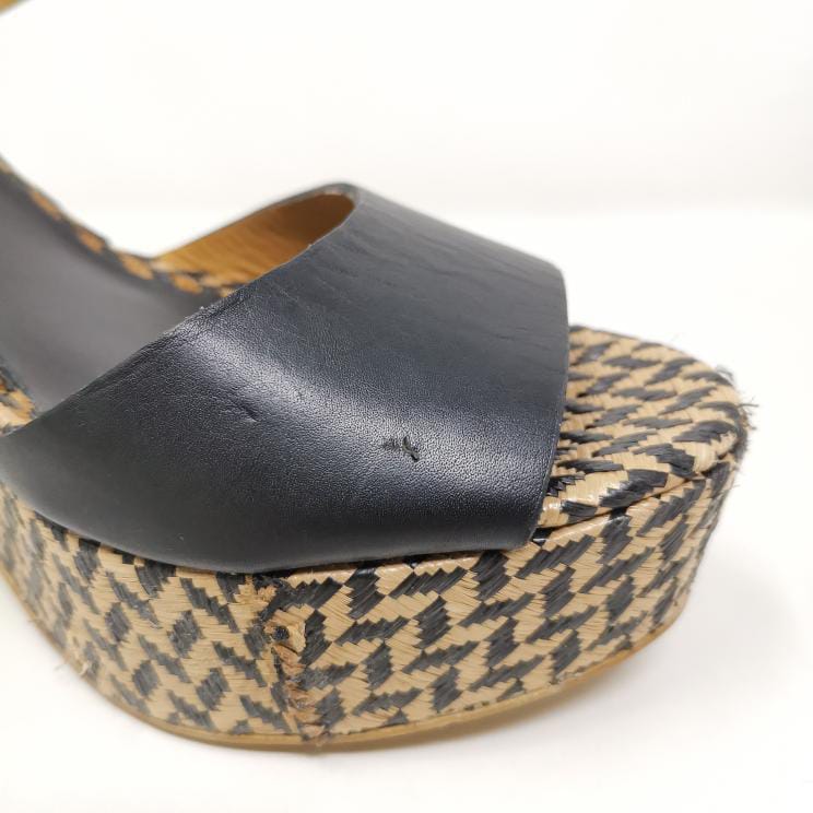 Black leather sandals with 13 cm high heel and 3.5 cm platform in woven raffia, adjustable ankle strap. The leather insole measures 25 cm. Some small marks on the leather part.