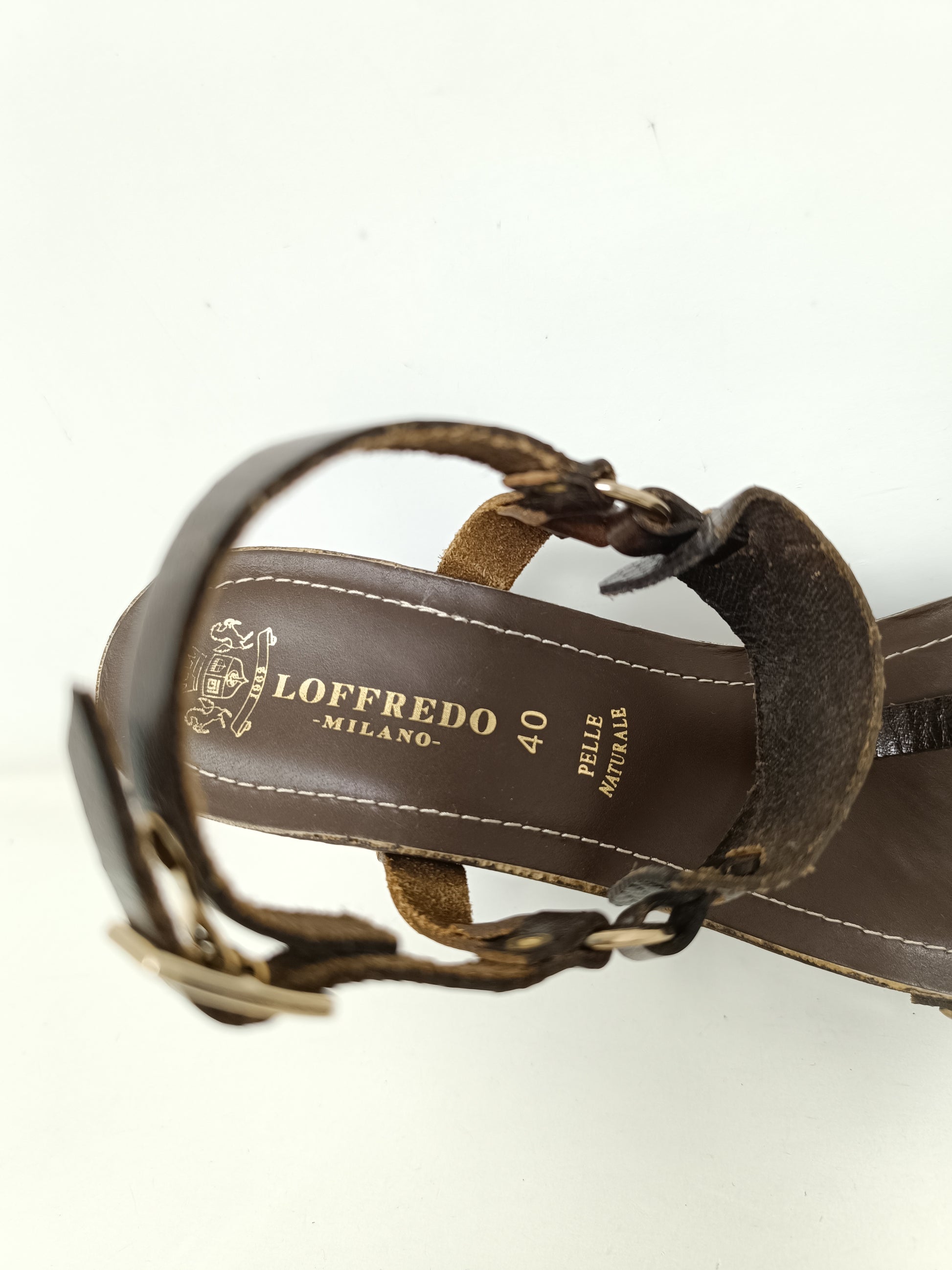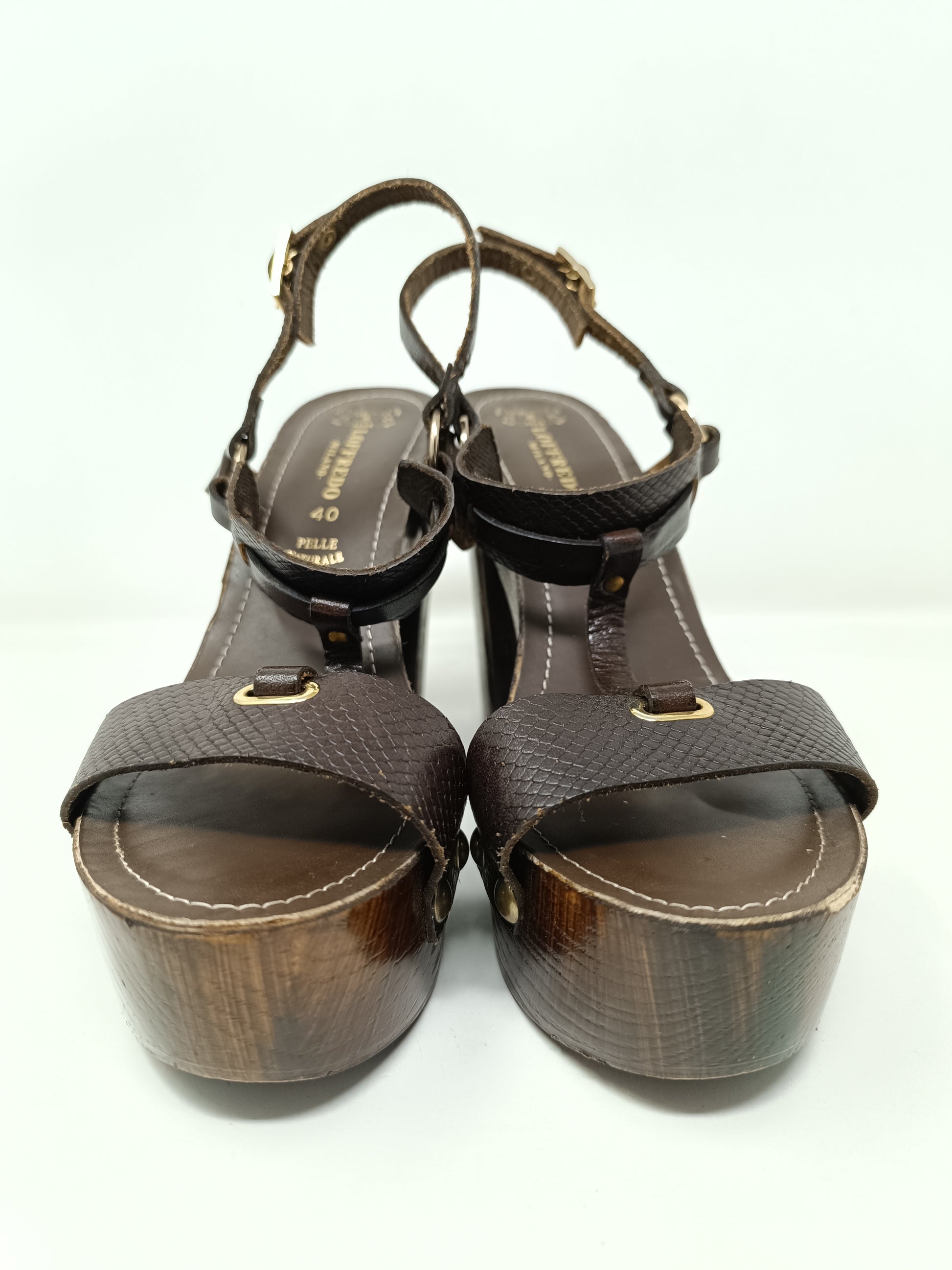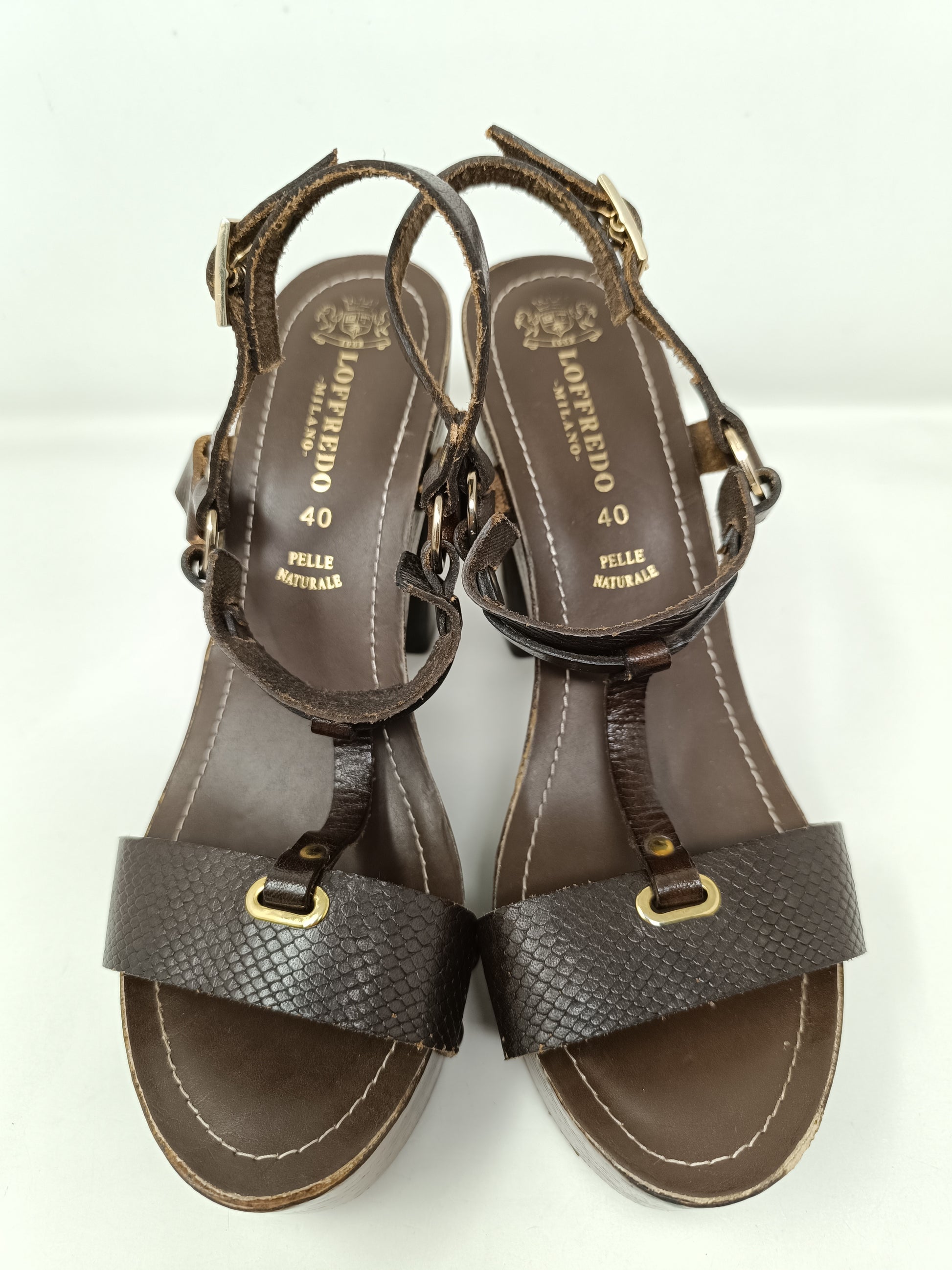 Loffredo Milano brown leather sandals, adjustable ankle strap, 12 cm high heel and 4 cm wooden platform. Leather insole measures 25cm, rubber coated outsole. Gold-tone decorative staples, small wear mark on the left toe. Very good condition. Size 40 EU.