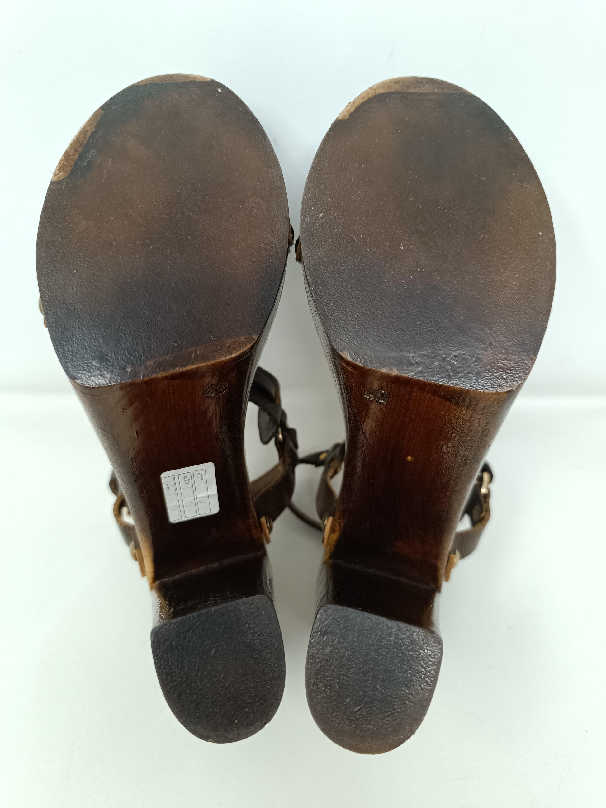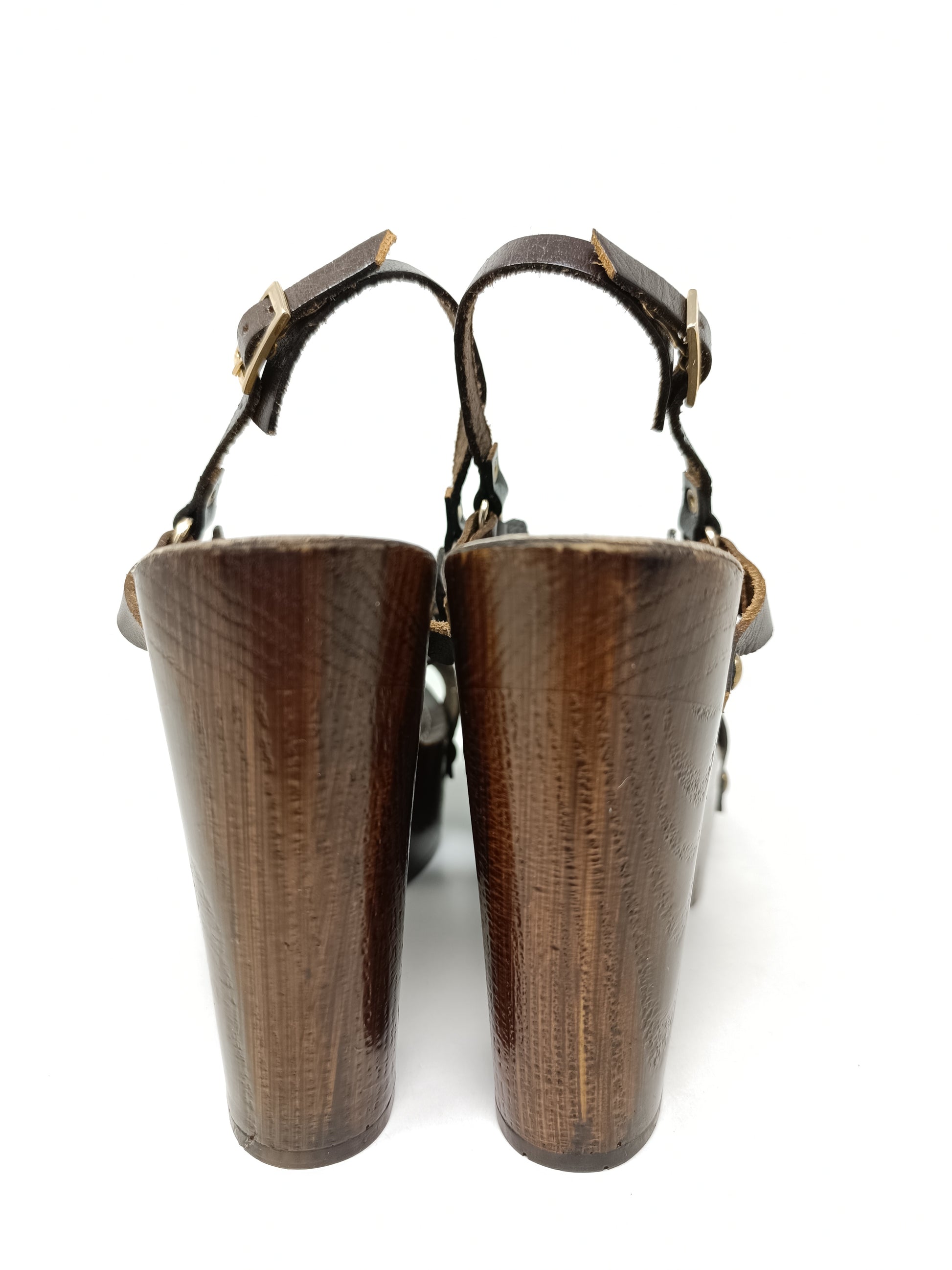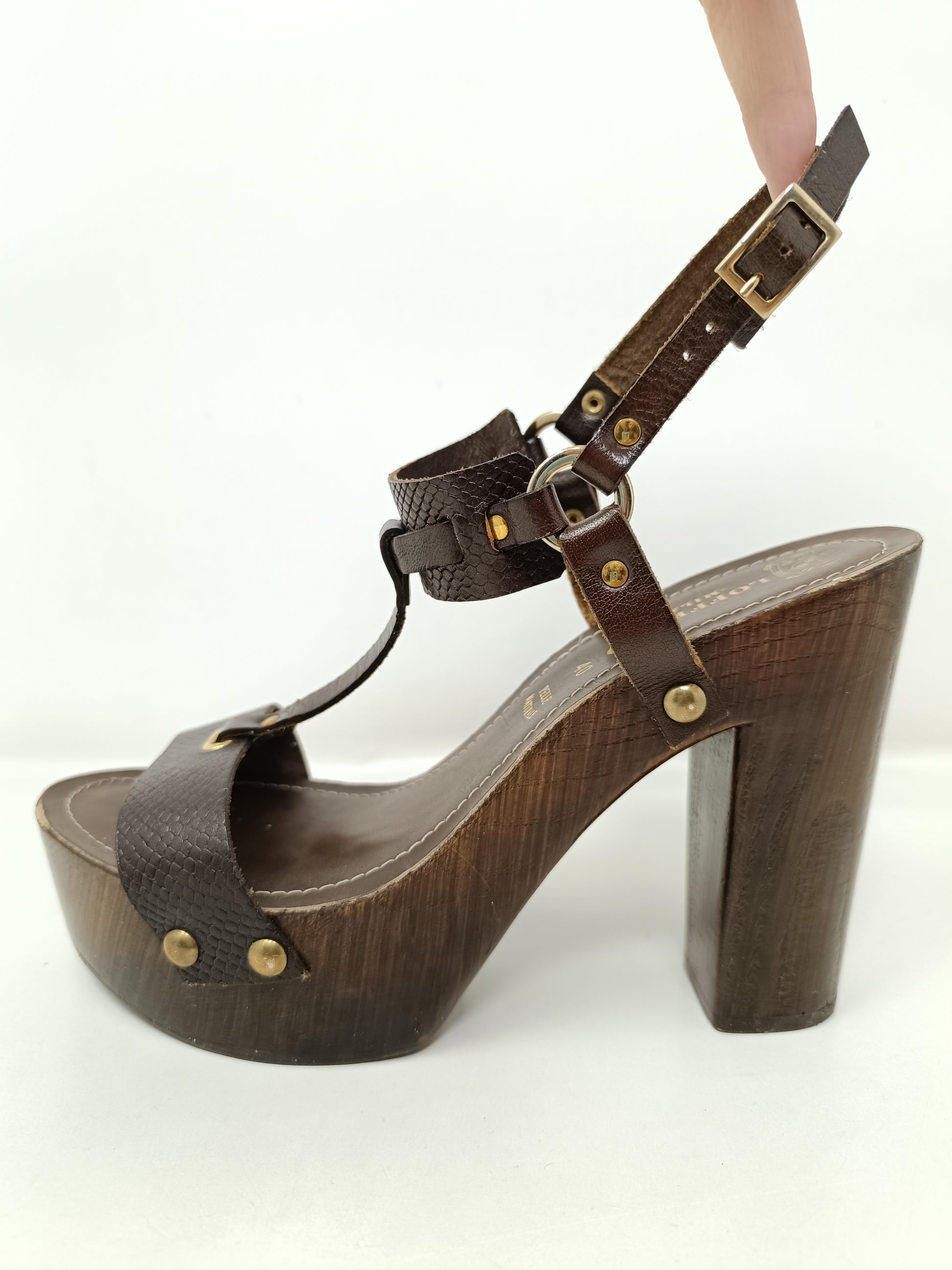 Loffredo Milano brown leather sandals, adjustable ankle strap, 12 cm high heel and 4 cm wooden platform. Leather insole measures 25cm, rubber coated outsole. Gold-tone decorative staples, small wear mark on the left toe. Very good condition. Size 40 EU.