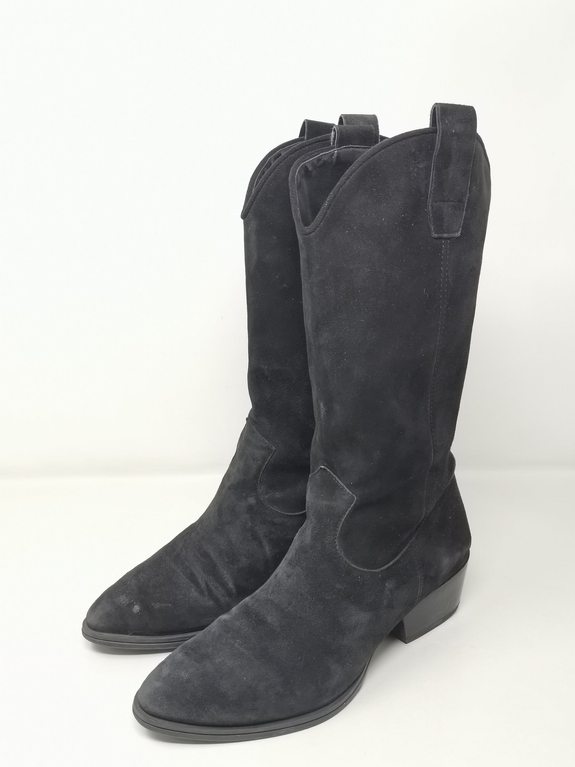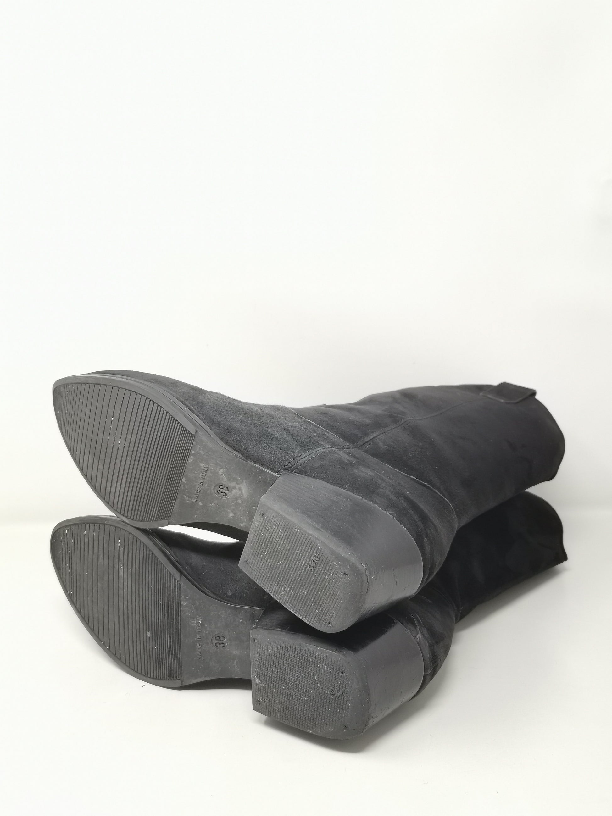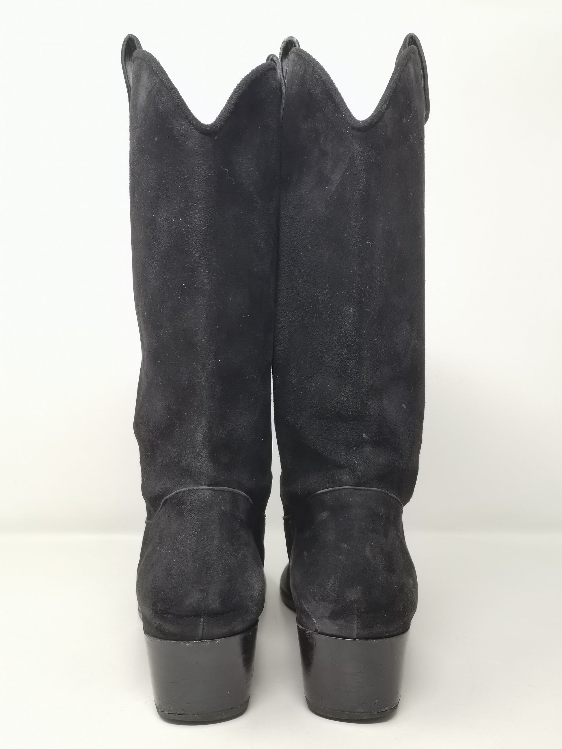 Black suede boots with 4.5 cm high heel, leather interior and rubber outer sole. Some small marks on the right heel and on the suede part in general due to the natural preservation of the leather.