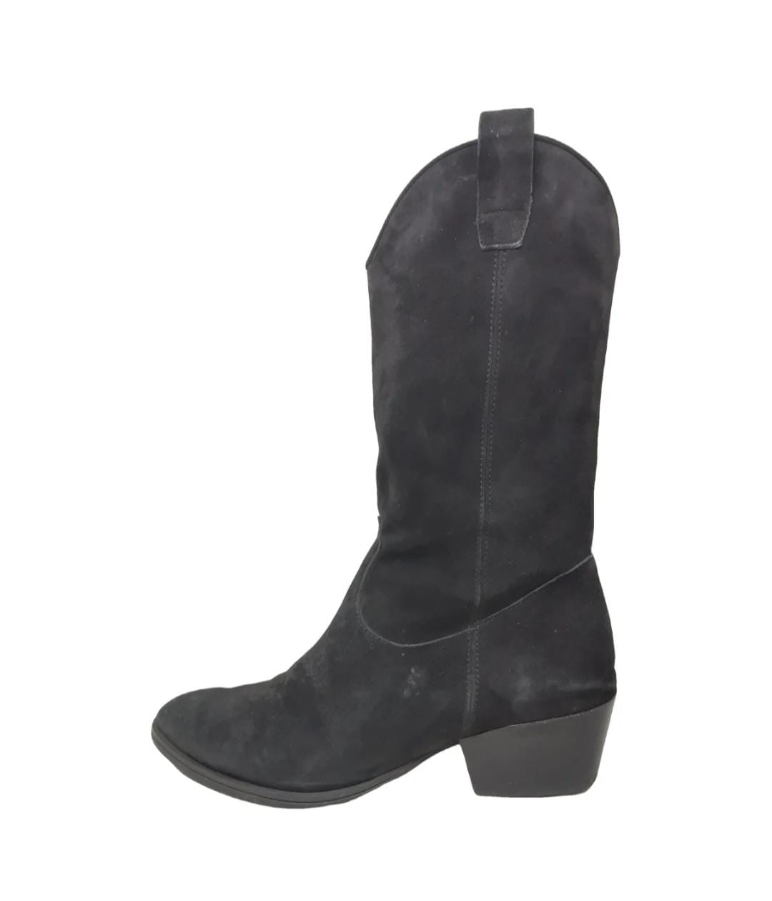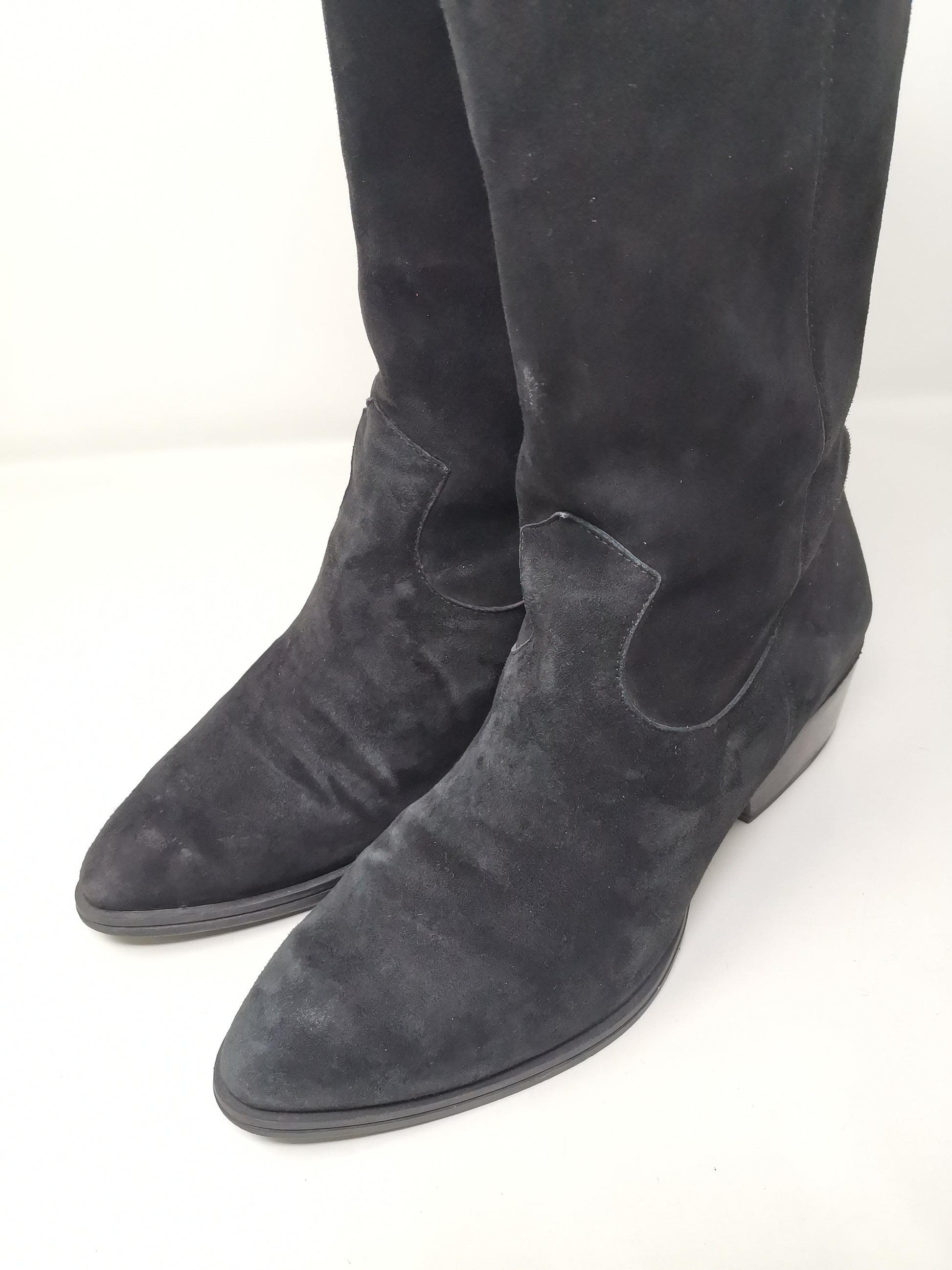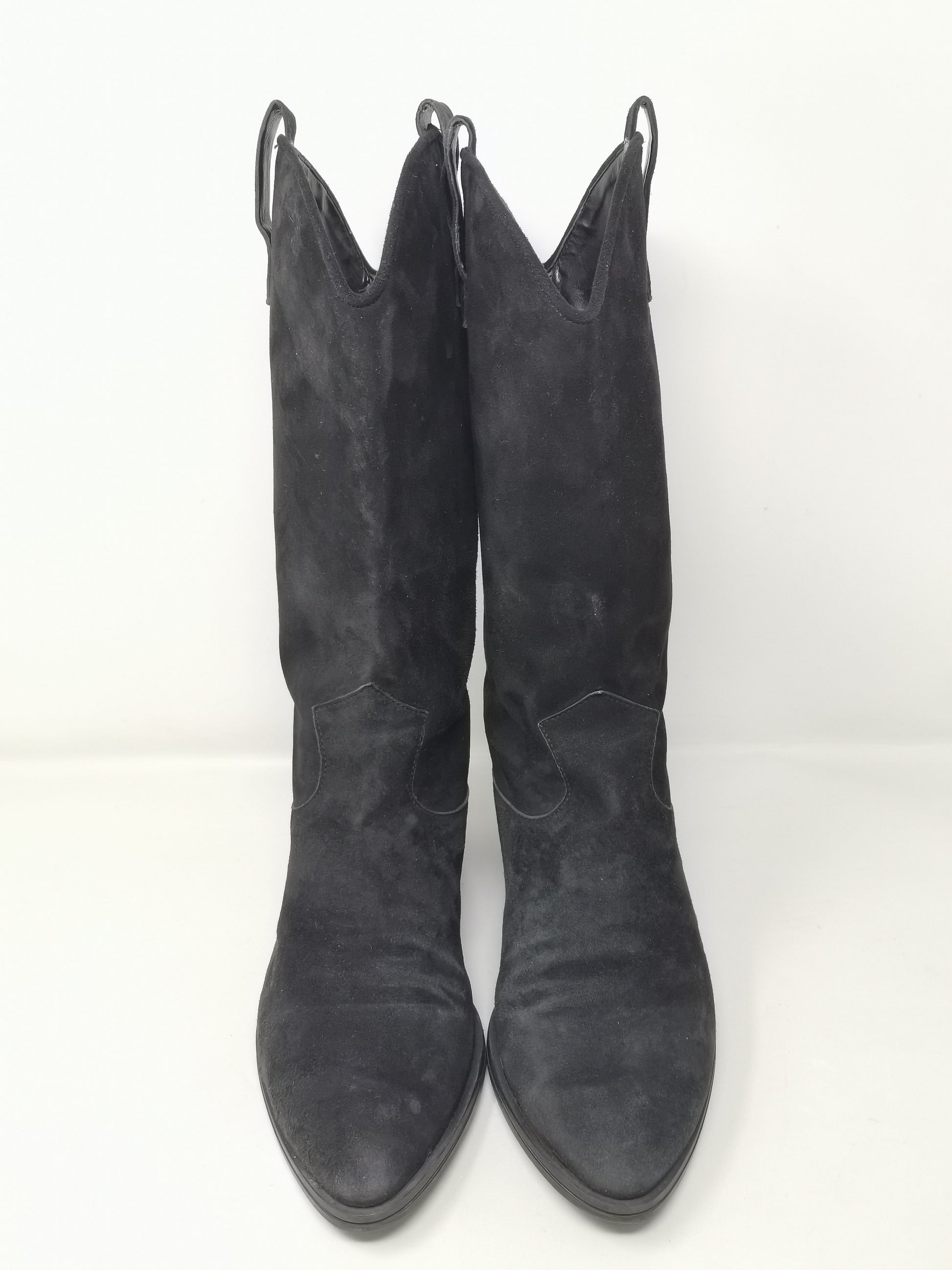 Black suede boots with 4.5 cm high heel, leather interior and rubber outer sole. Some small marks on the right heel and on the suede part in general due to the natural preservation of the leather.