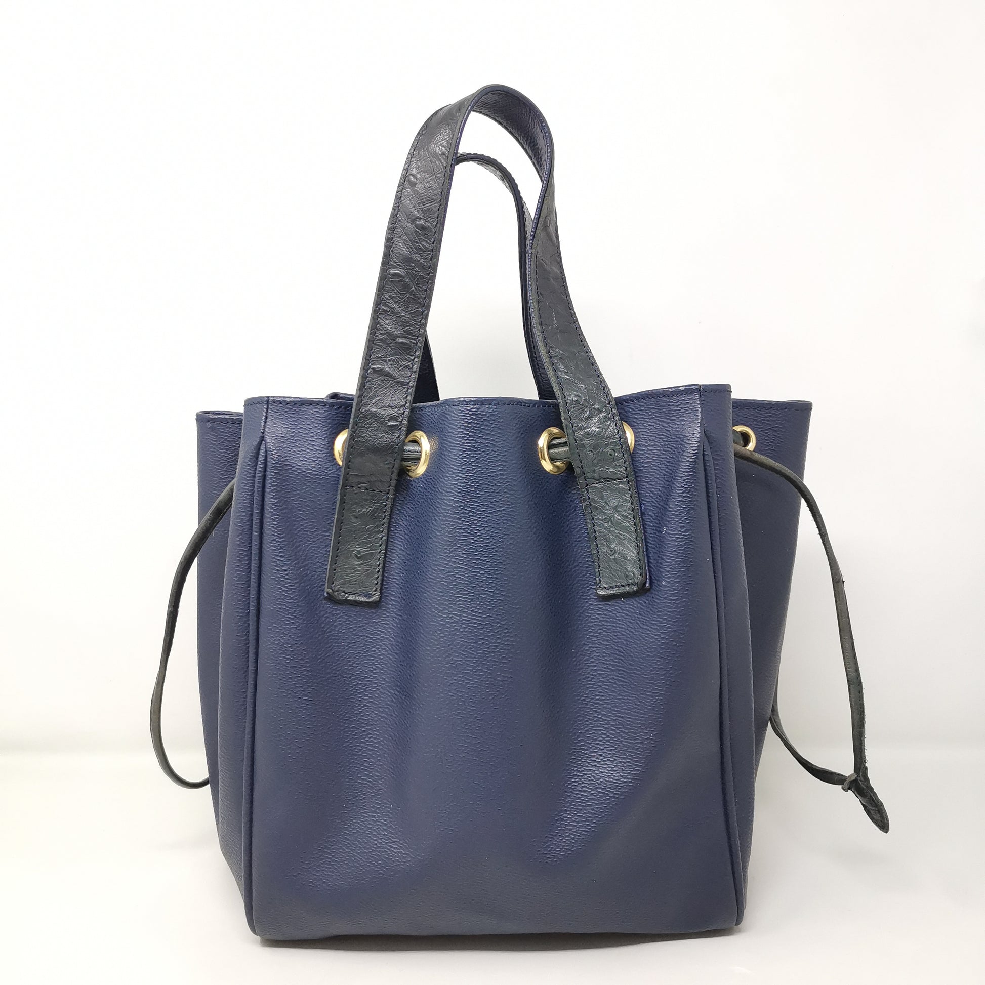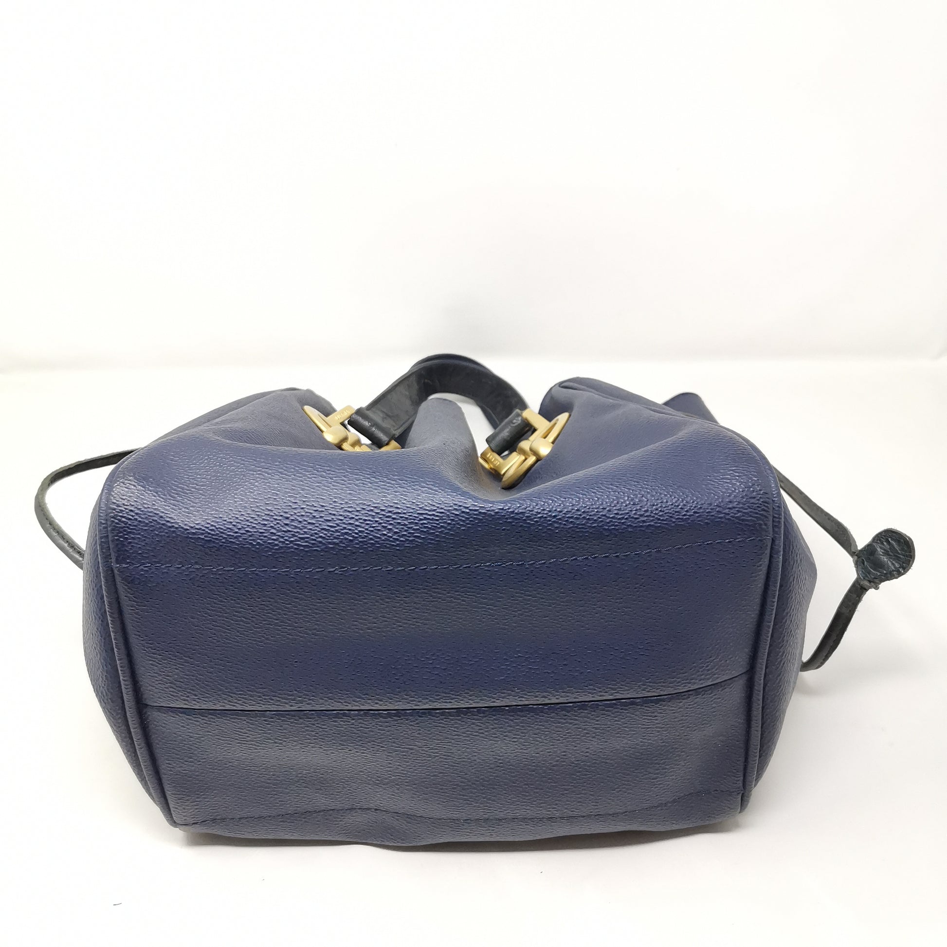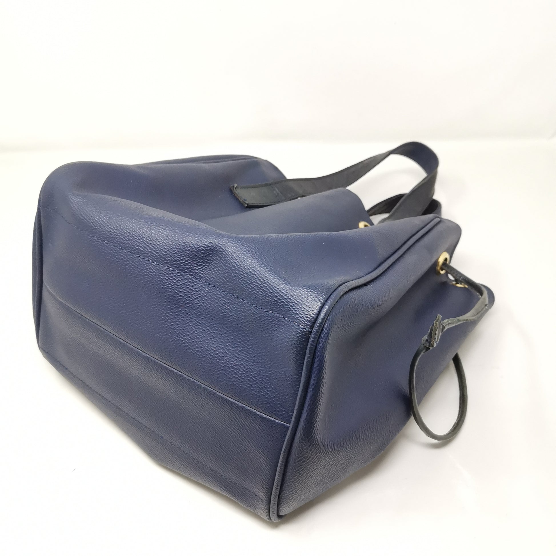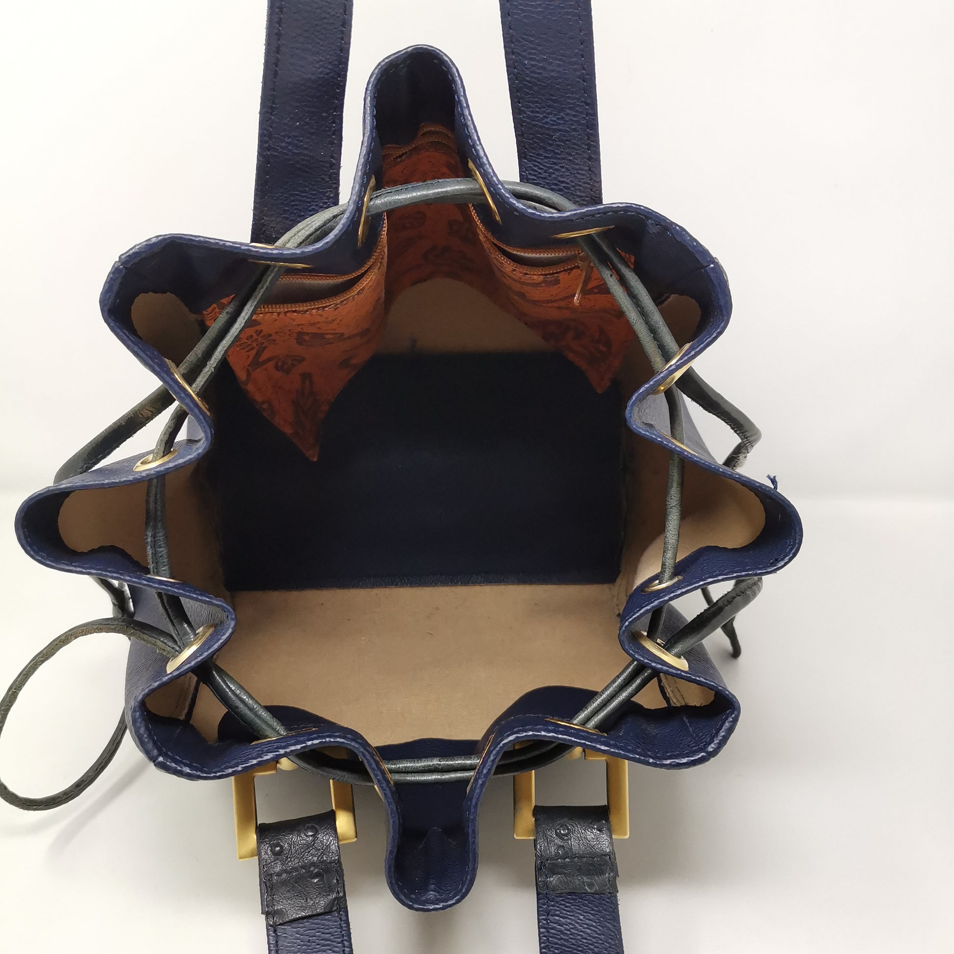 Blue canvas bag with leather handles, drawstring closure and fabric interior with pocket. Gold colored metal hardware, some small marks on the outside and ink stains on the inside. Width 23cm, height 26cm, depth 15cm, handle height 14cm.