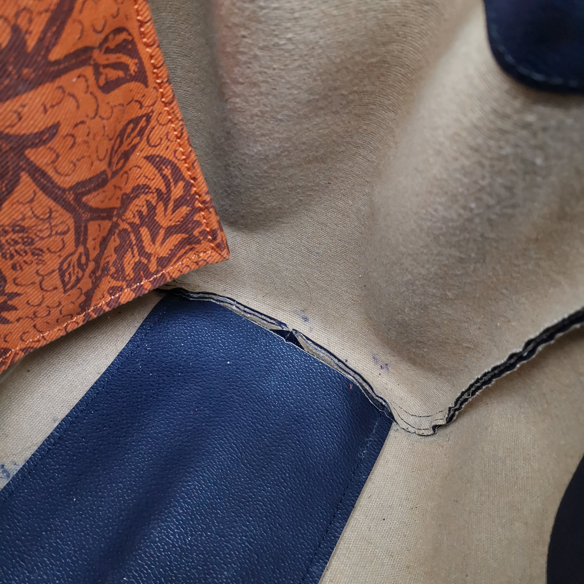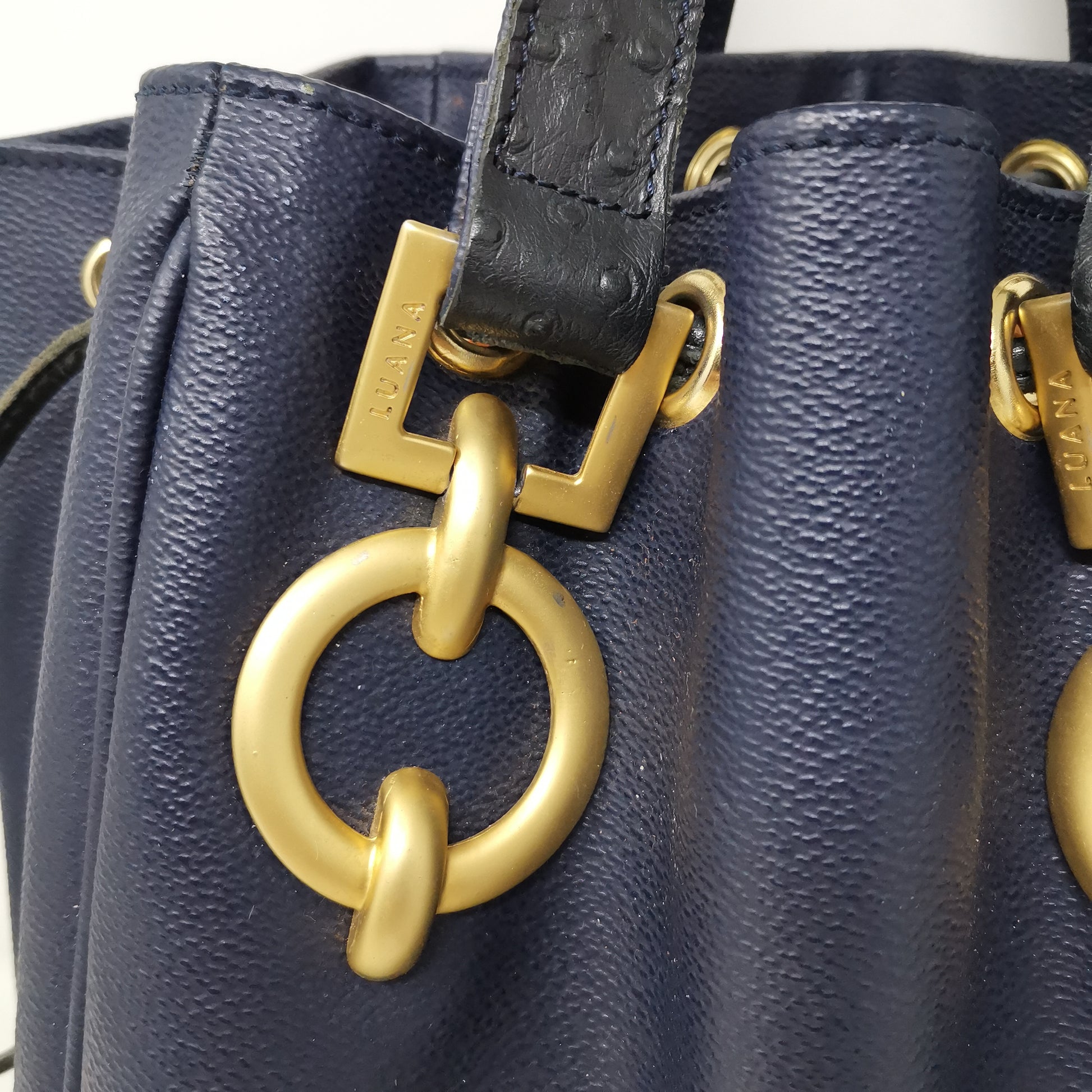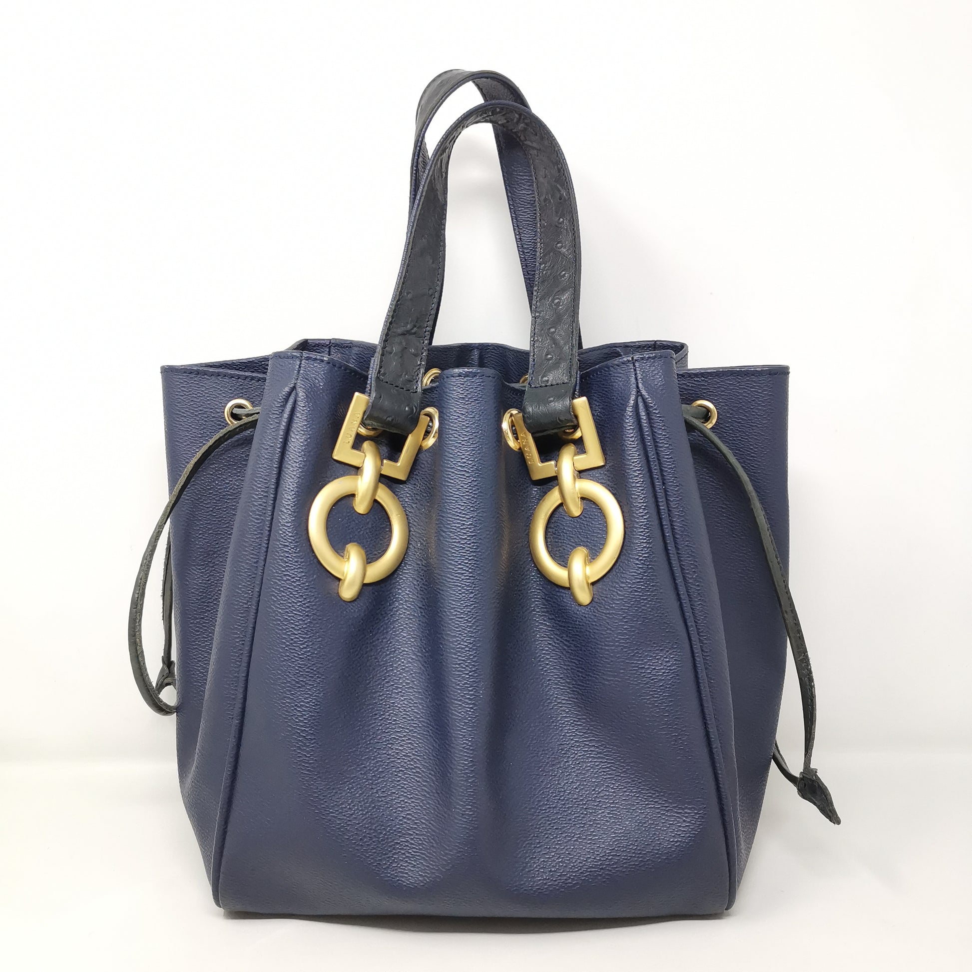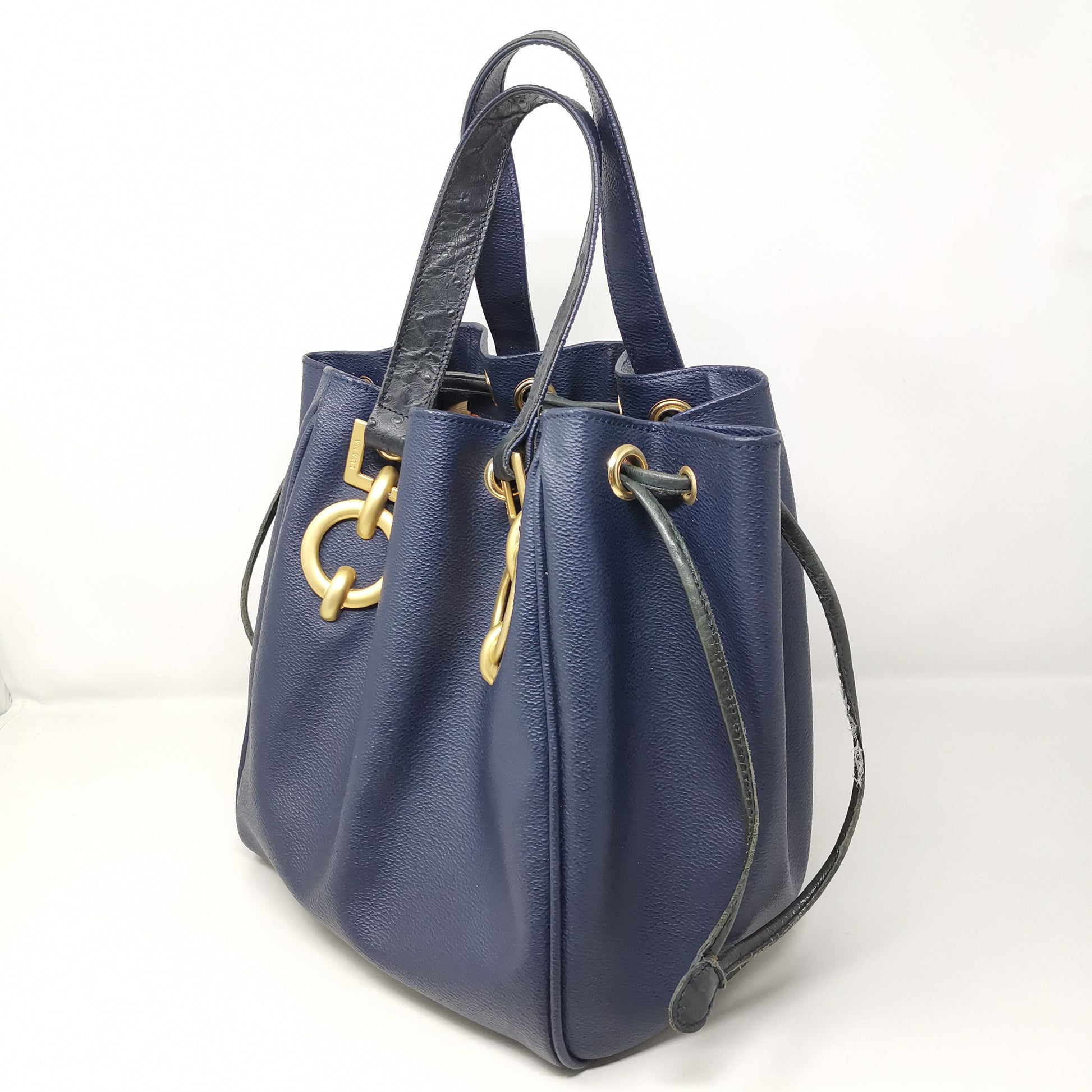 Blue canvas bag with leather handles, drawstring closure and fabric interior with pocket. Gold colored metal hardware, some small marks on the outside and ink stains on the inside. Width 23cm, height 26cm, depth 15cm, handle height 14cm.