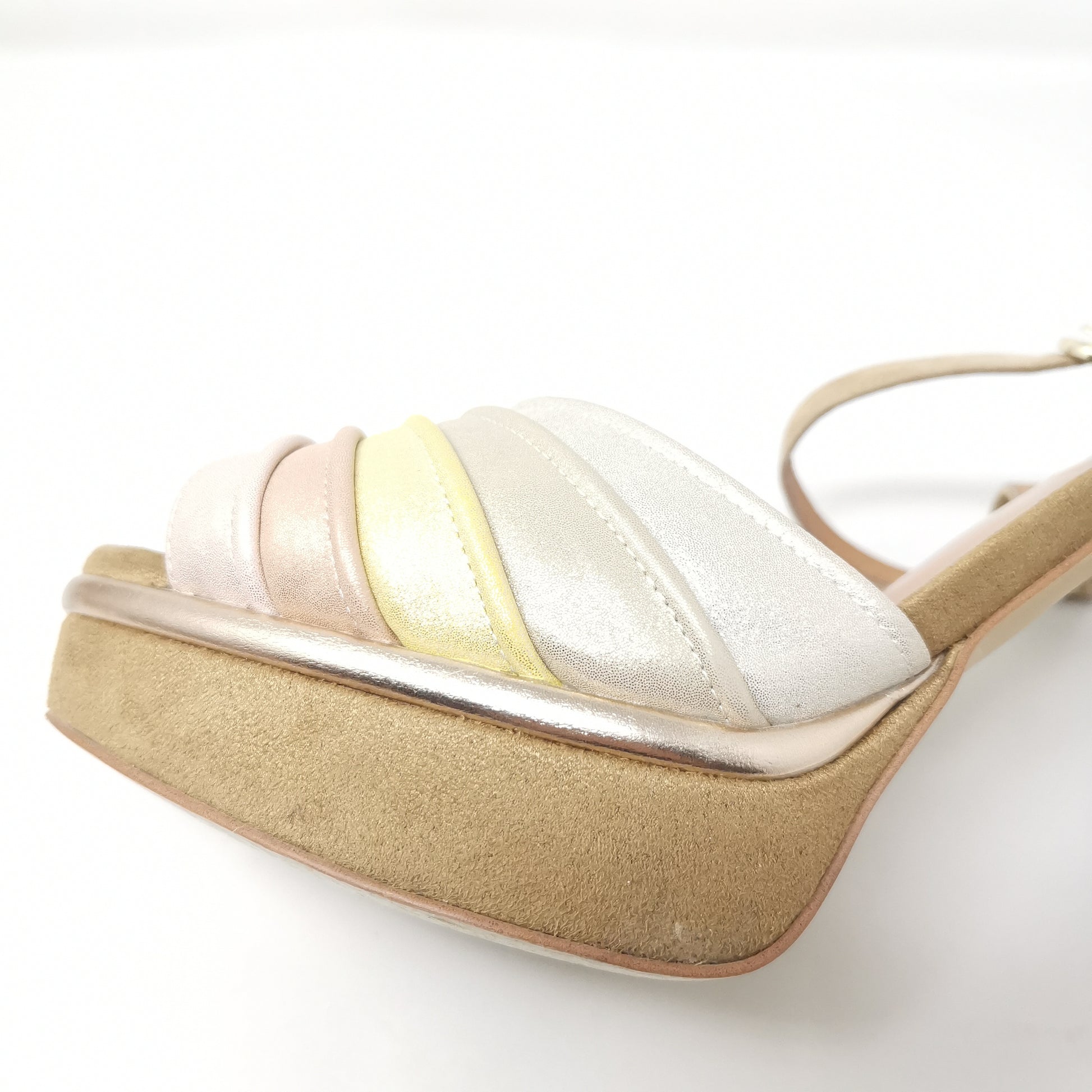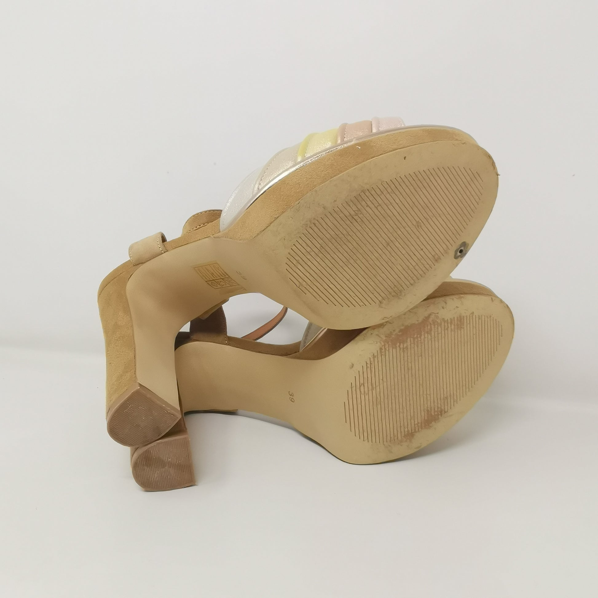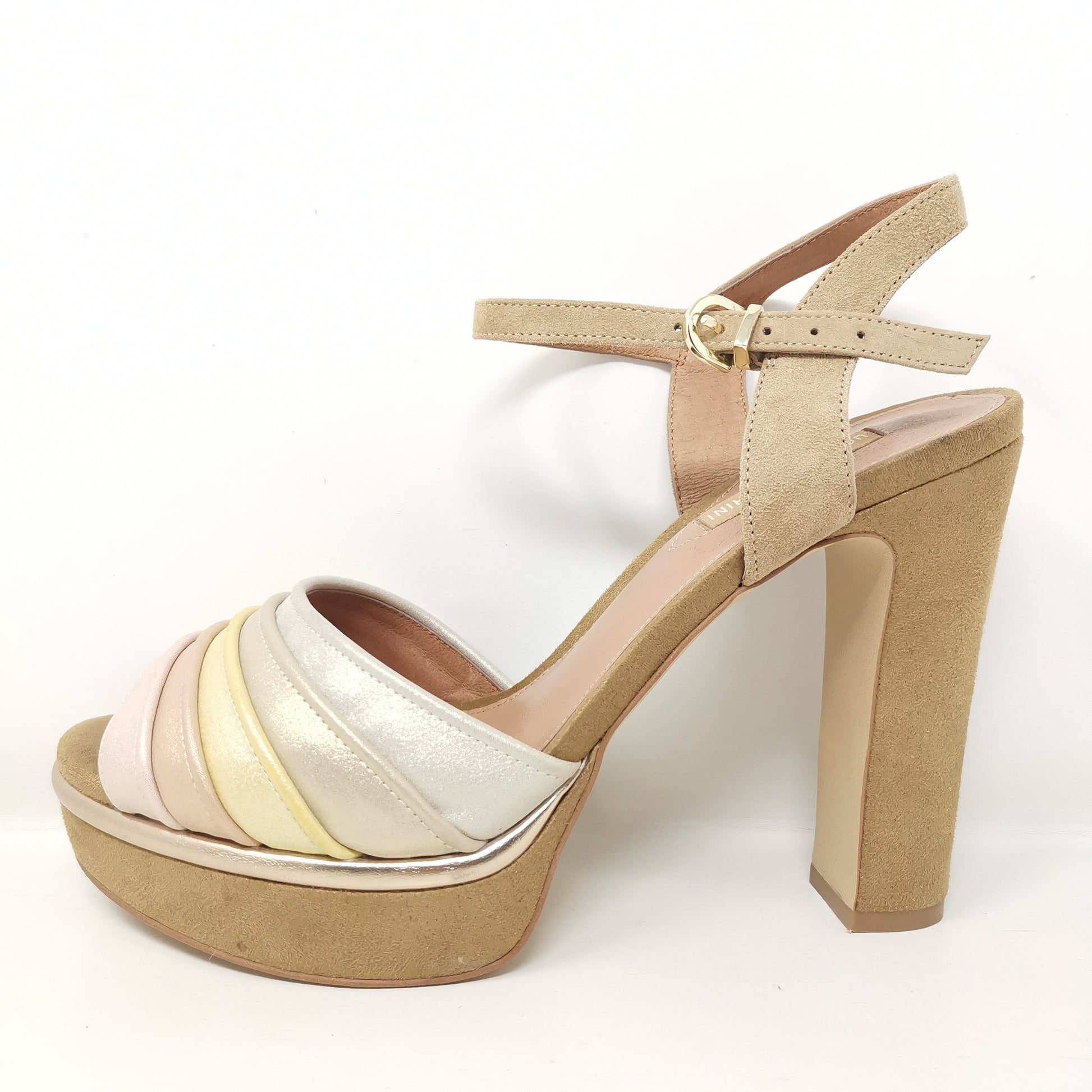 Beige suede sandals with 12 cm high heels and 2 cm platform. Adjustable strap, leather insole measures 25 cm. The upper is made of coloured leather, some small marks. Size 39.