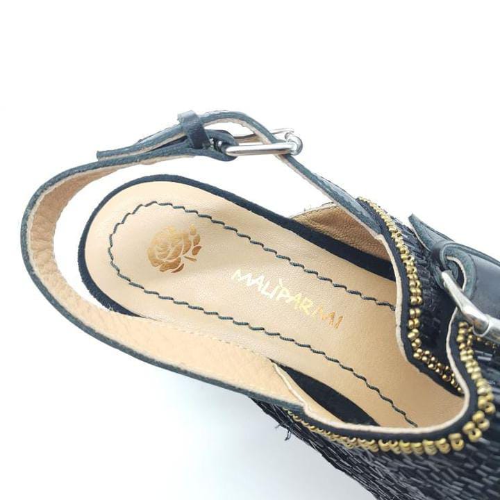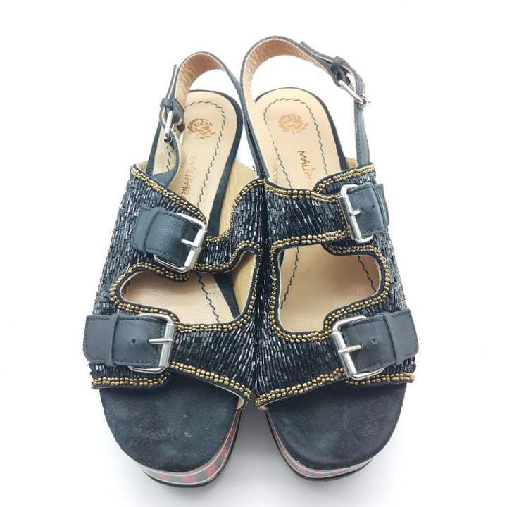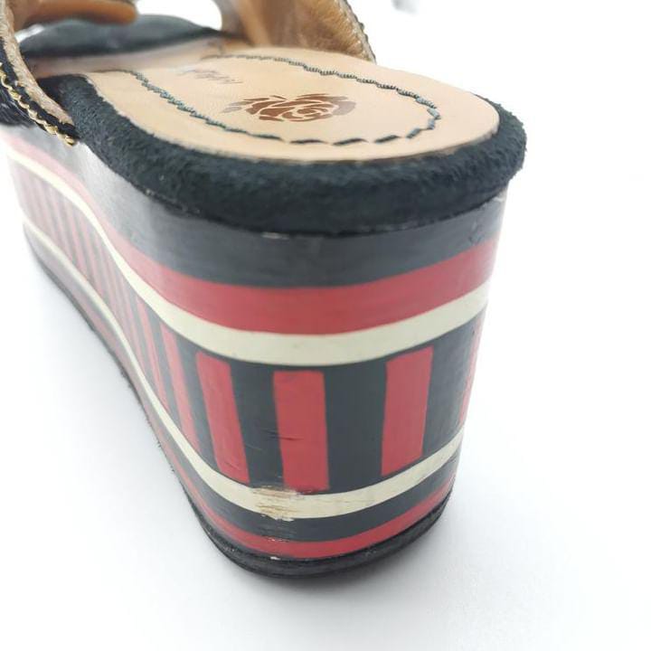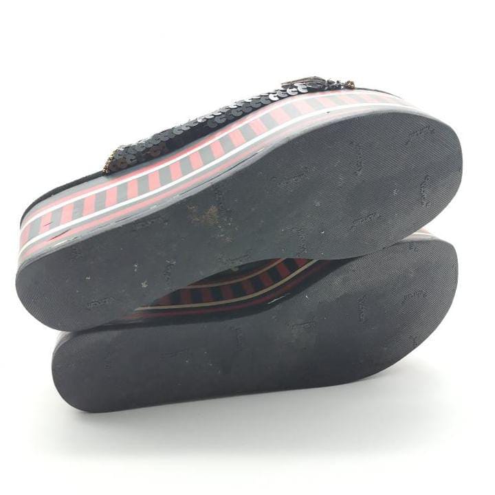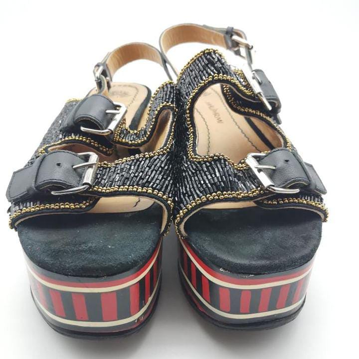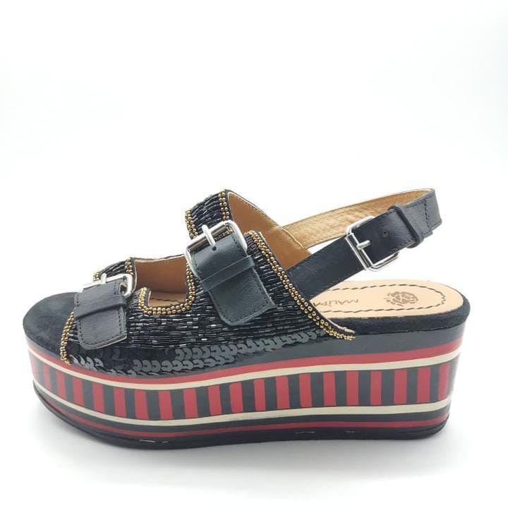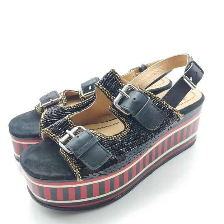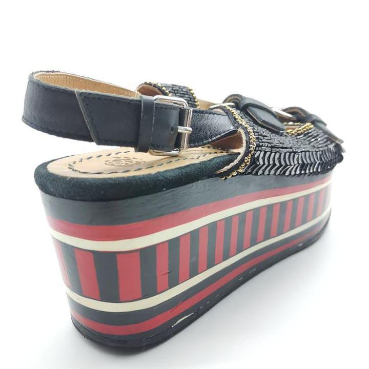 Leather sandals covered in black beads and sequins with a 6.8 cm high black and red wooden wedge.