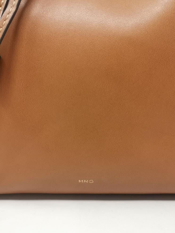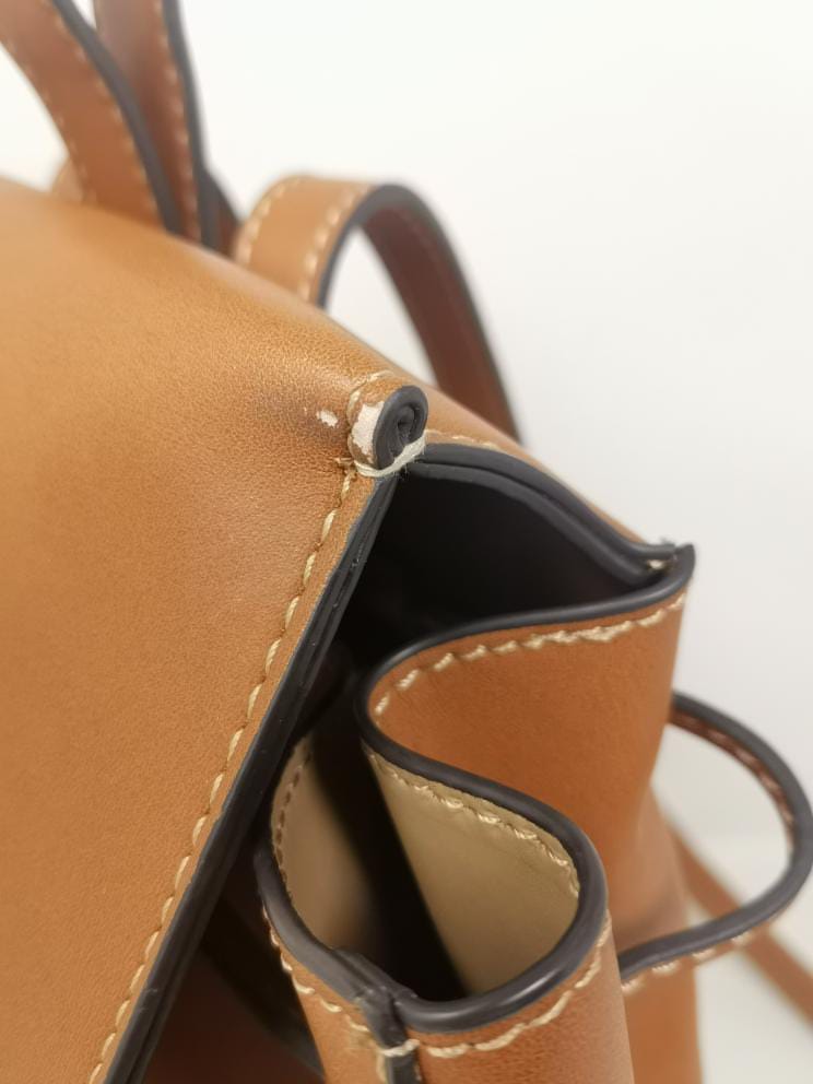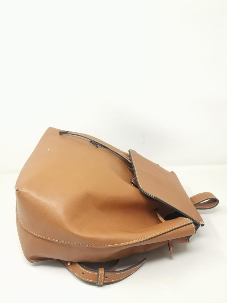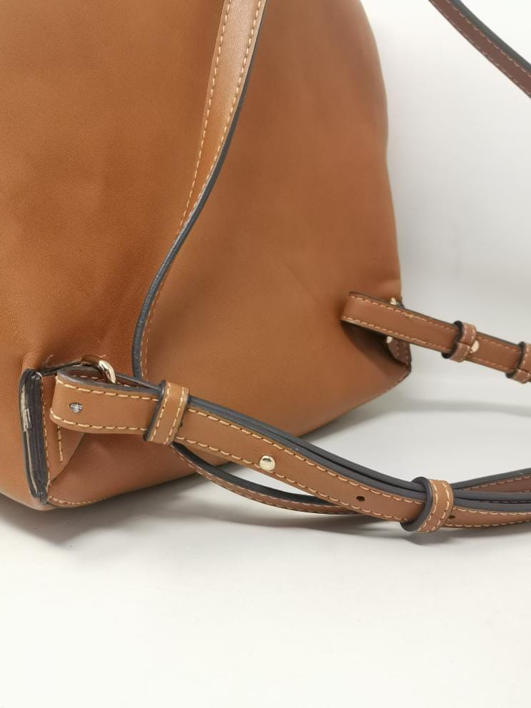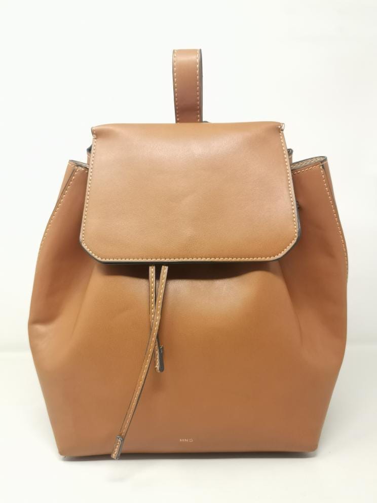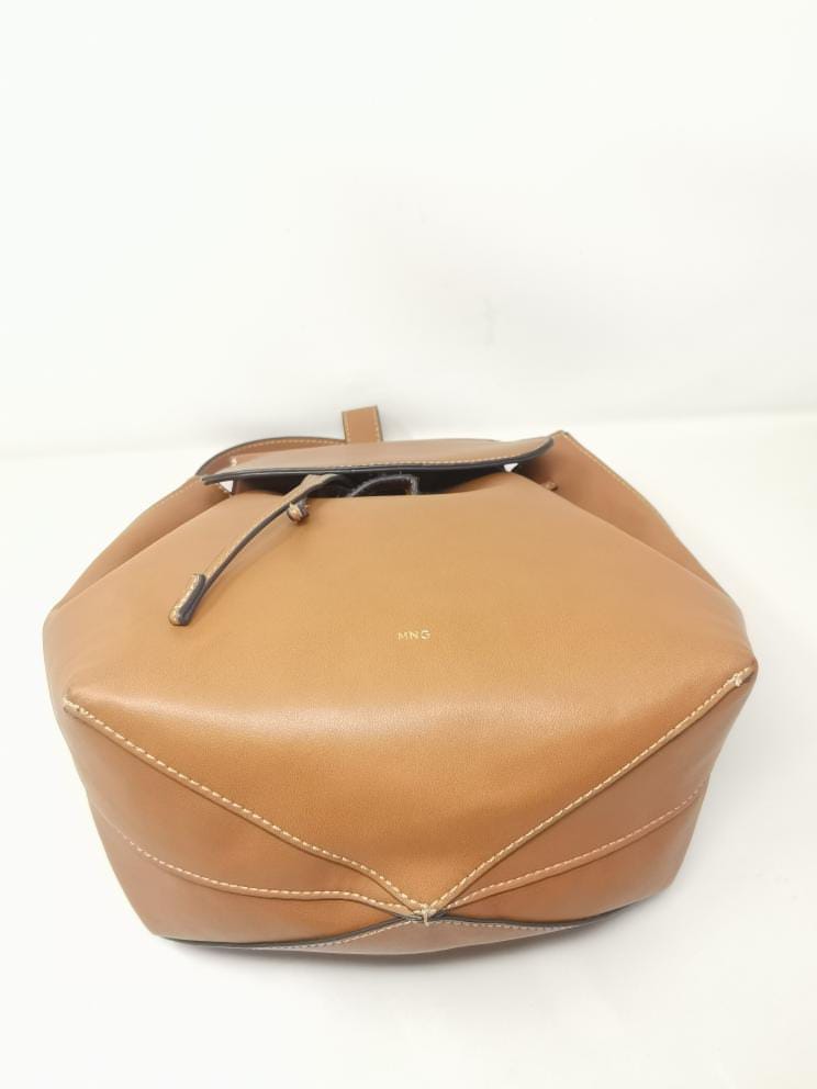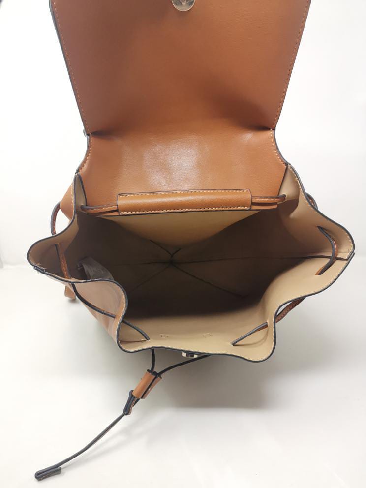 Brown faux leather backpack, flap closure, inside button and drawstring. Adjustable straps and gold-coloured metal hardware.