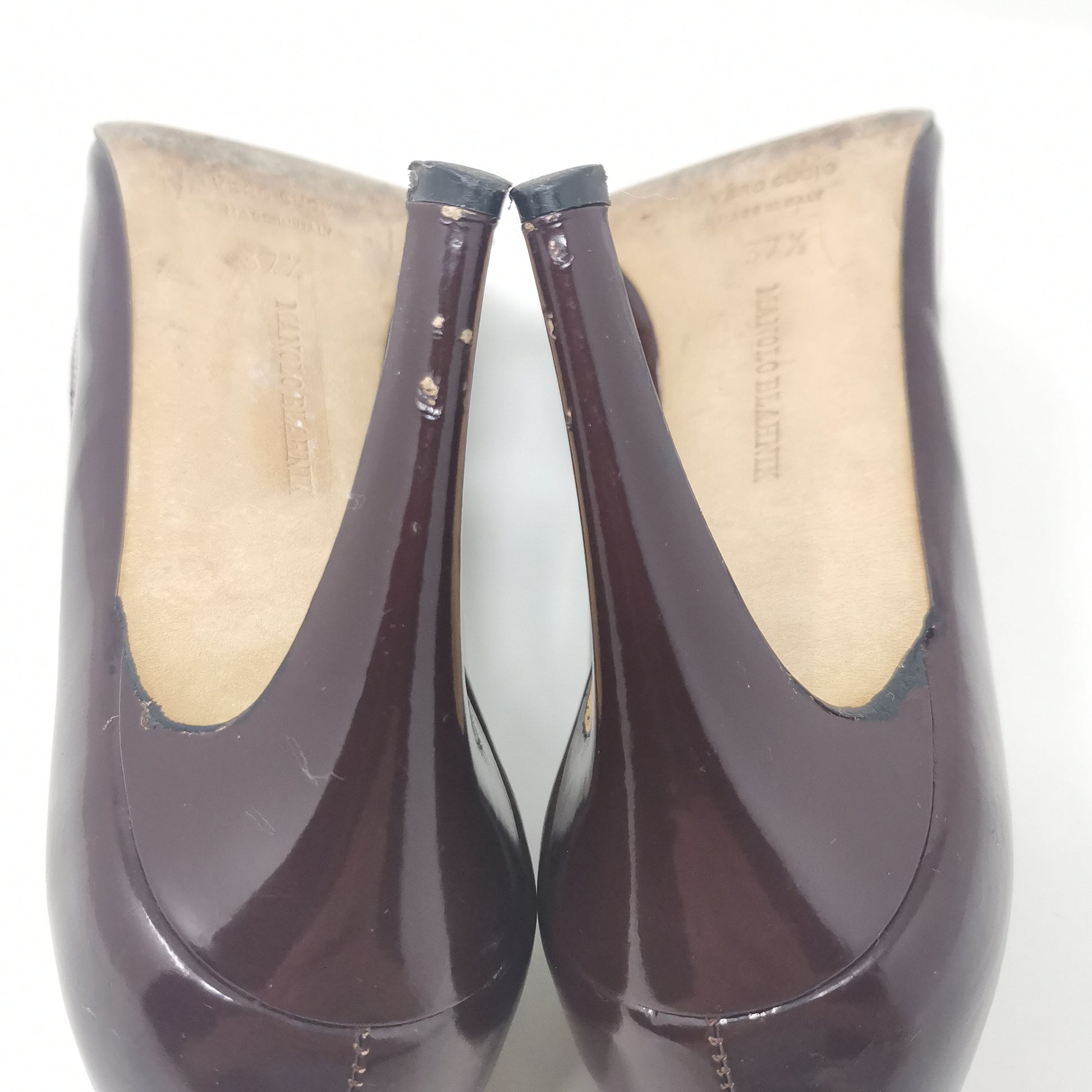 Pumps in brown / bordeaux shiny leather with tassels on the upper. Heel 8.5 cm high, the inner sole in leather with some halo measures about 24.4 cm. The marked outer sole is in leather, some small marks on the heels, edges and leather parts in general. Size 37.5 EU.