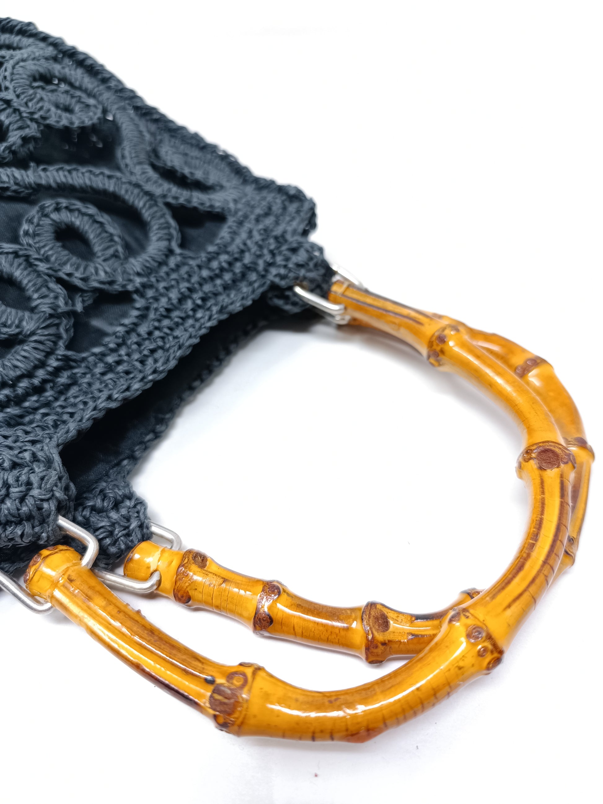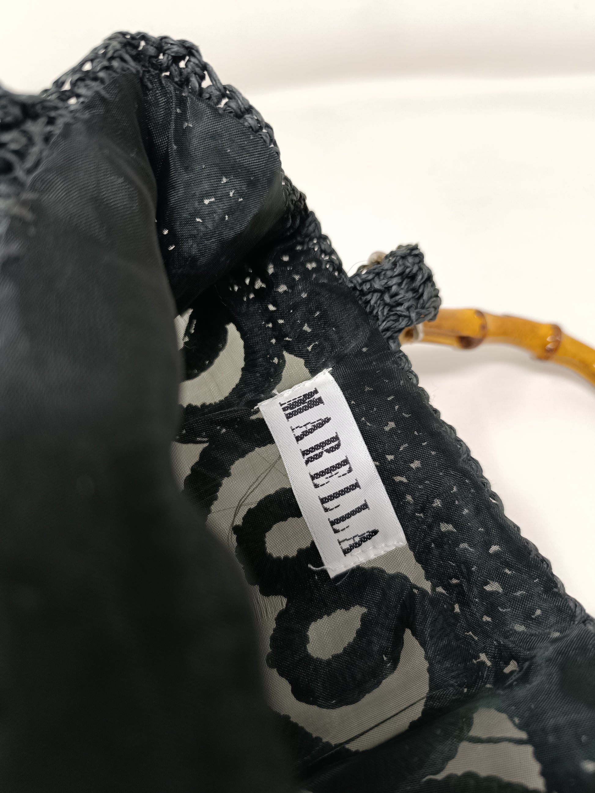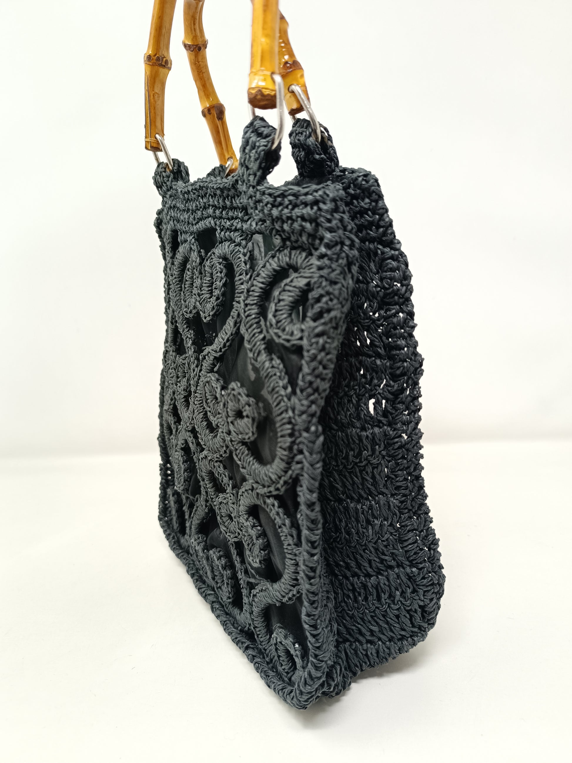 Handmade black paper bag with double bamboo handles, polyester interior. Width 21cm, height 24cm, depth 10cm.