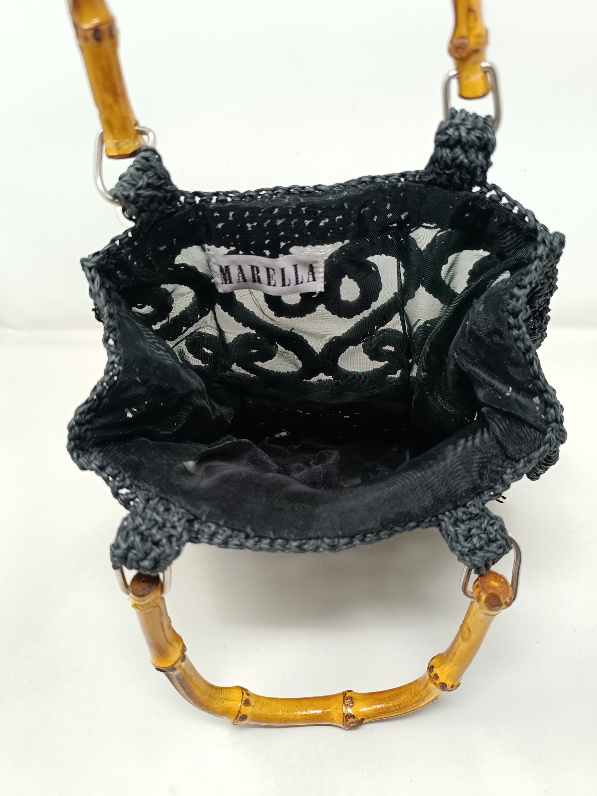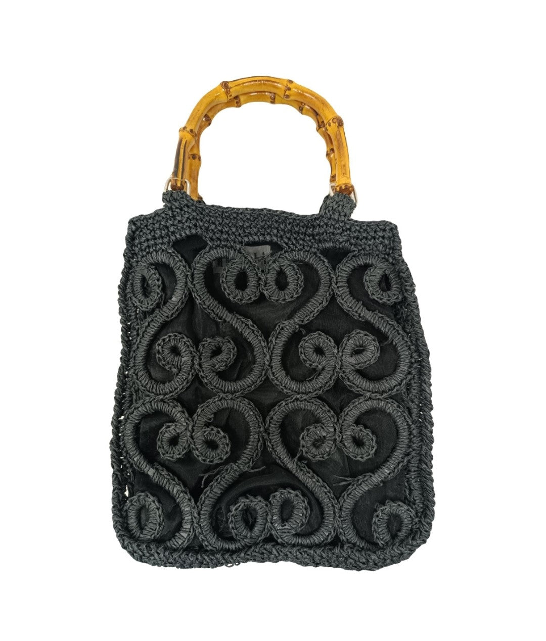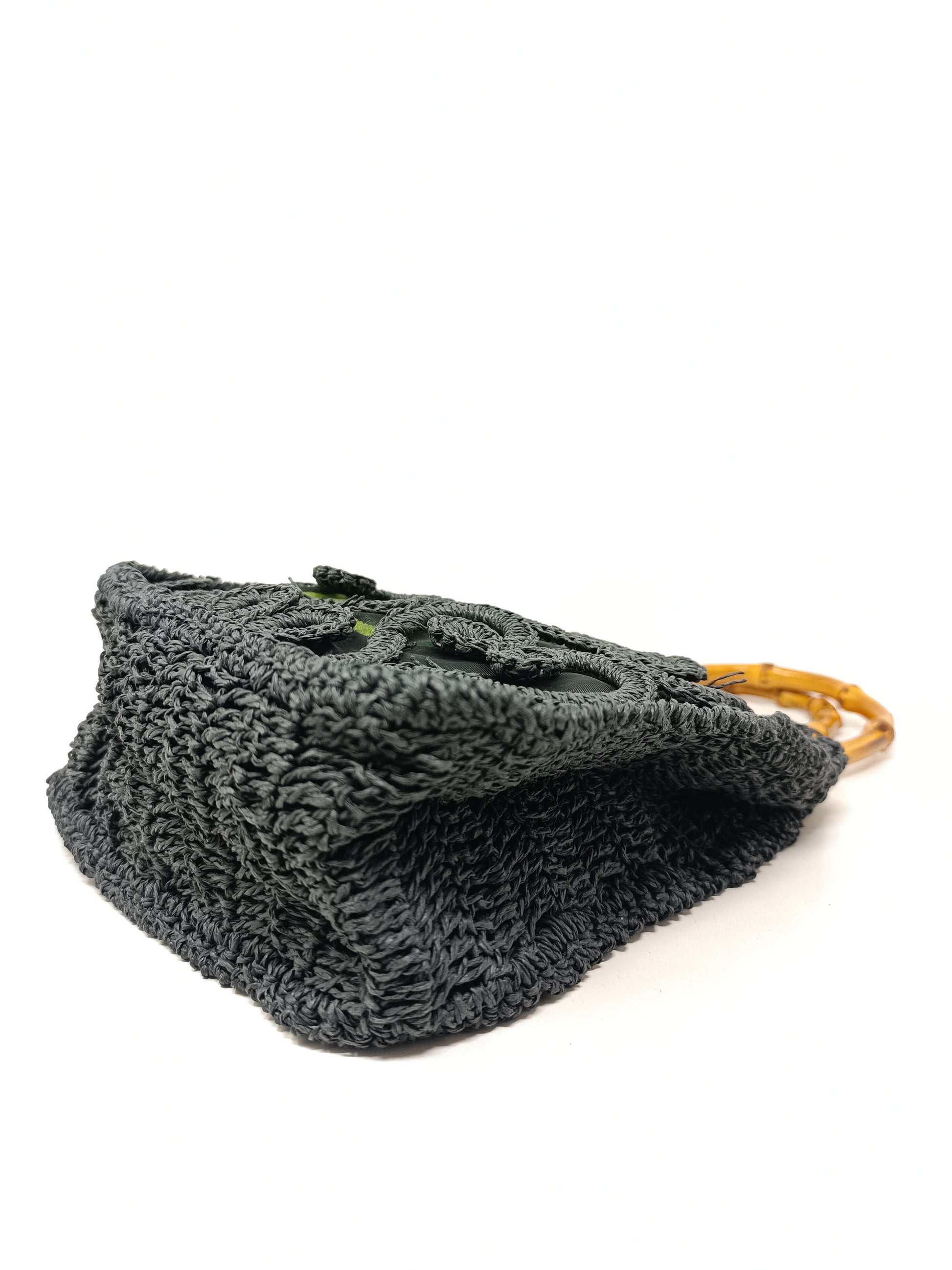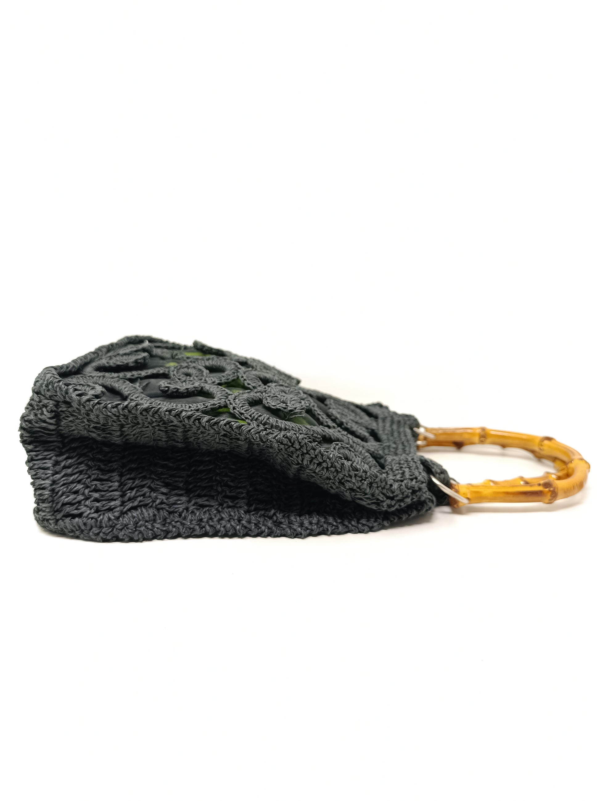 Handmade black paper bag with double bamboo handles, polyester interior. Width 21cm, height 24cm, depth 10cm.