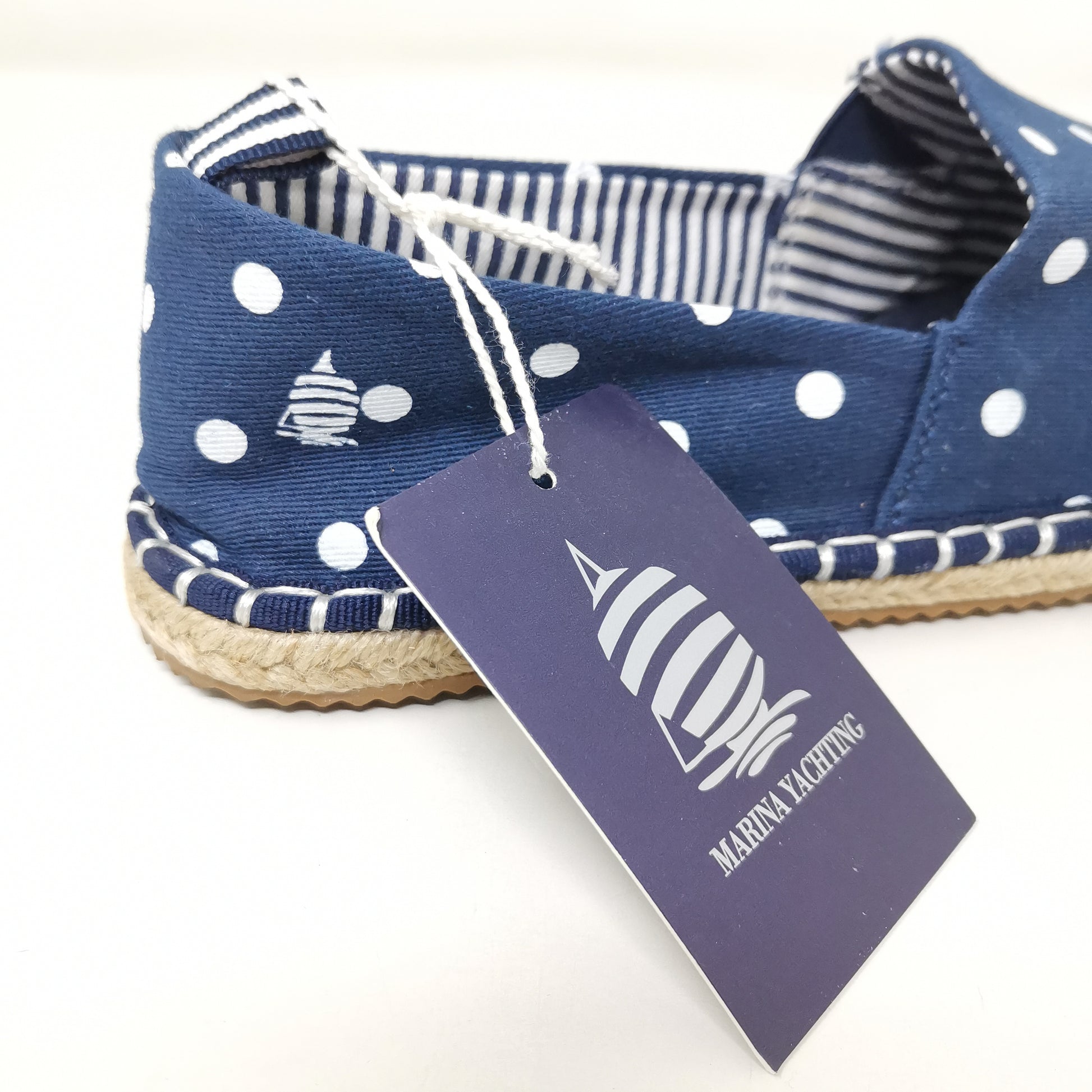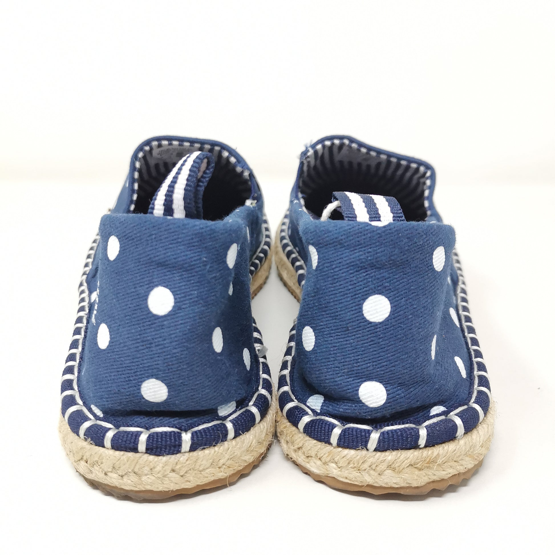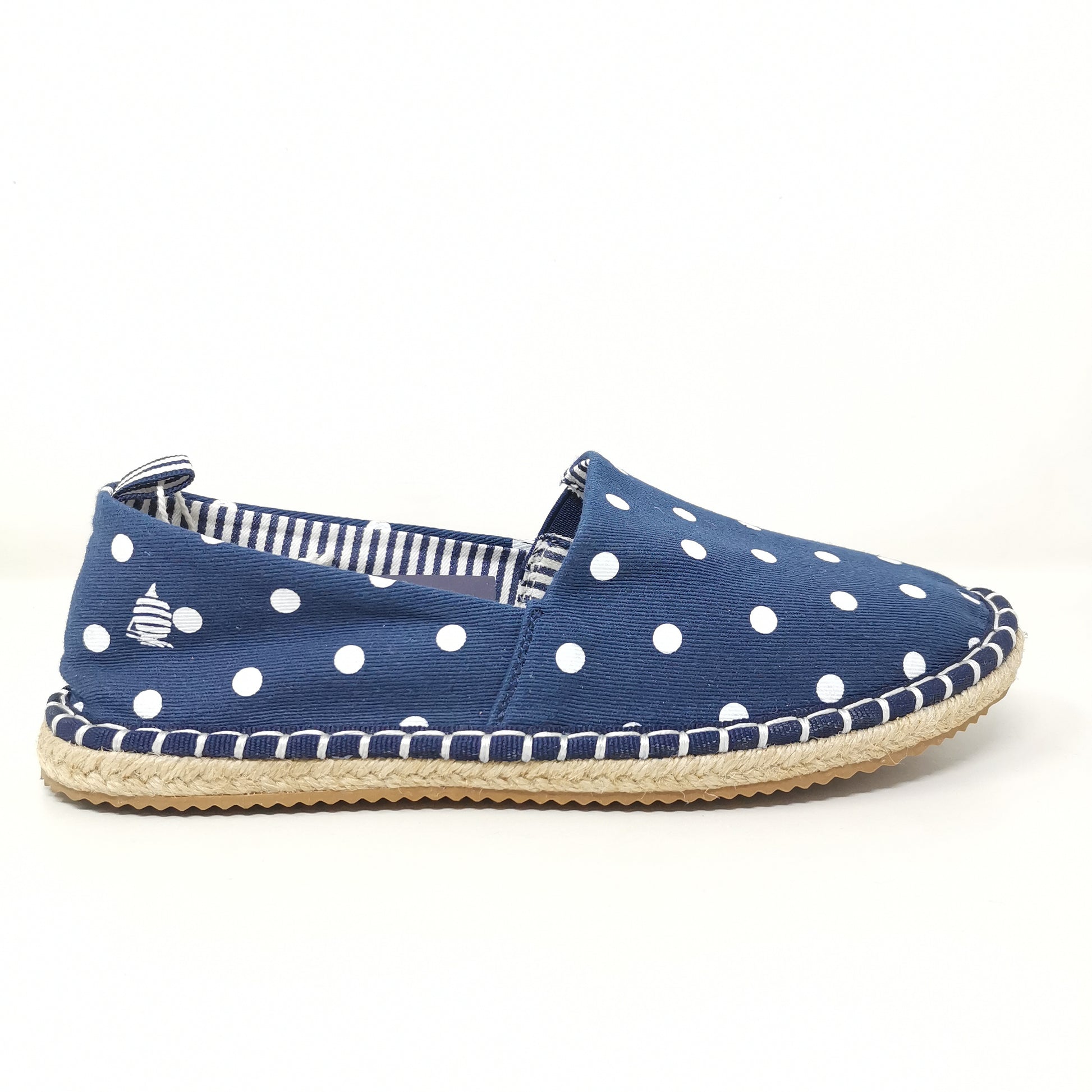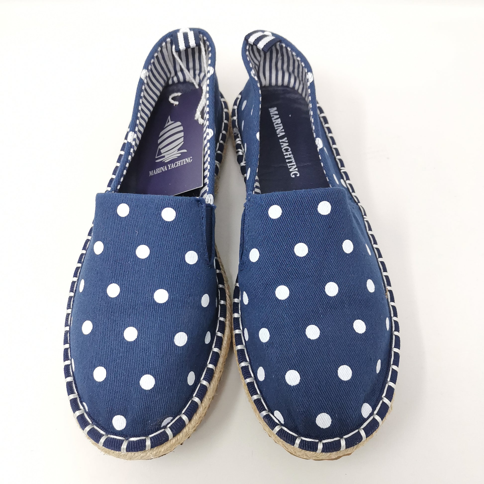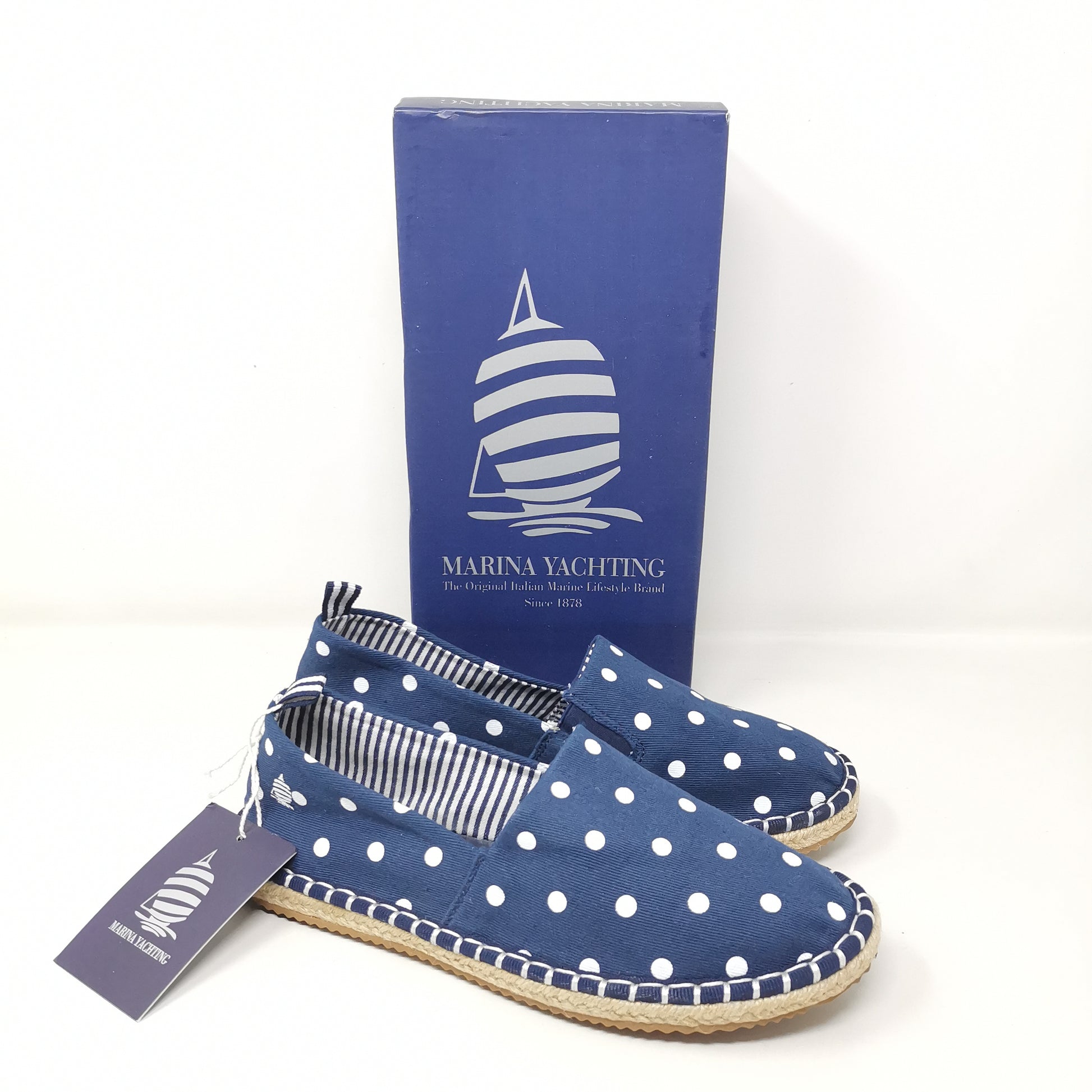 Slip on in blue canvas with white polka dots, complete with tag and box. Non-marking rubber outsole and beige rope overlay. The insole measures 24 cm. White contrast stitching. Complete with tags and original box. Size 37 EU, fit 36.