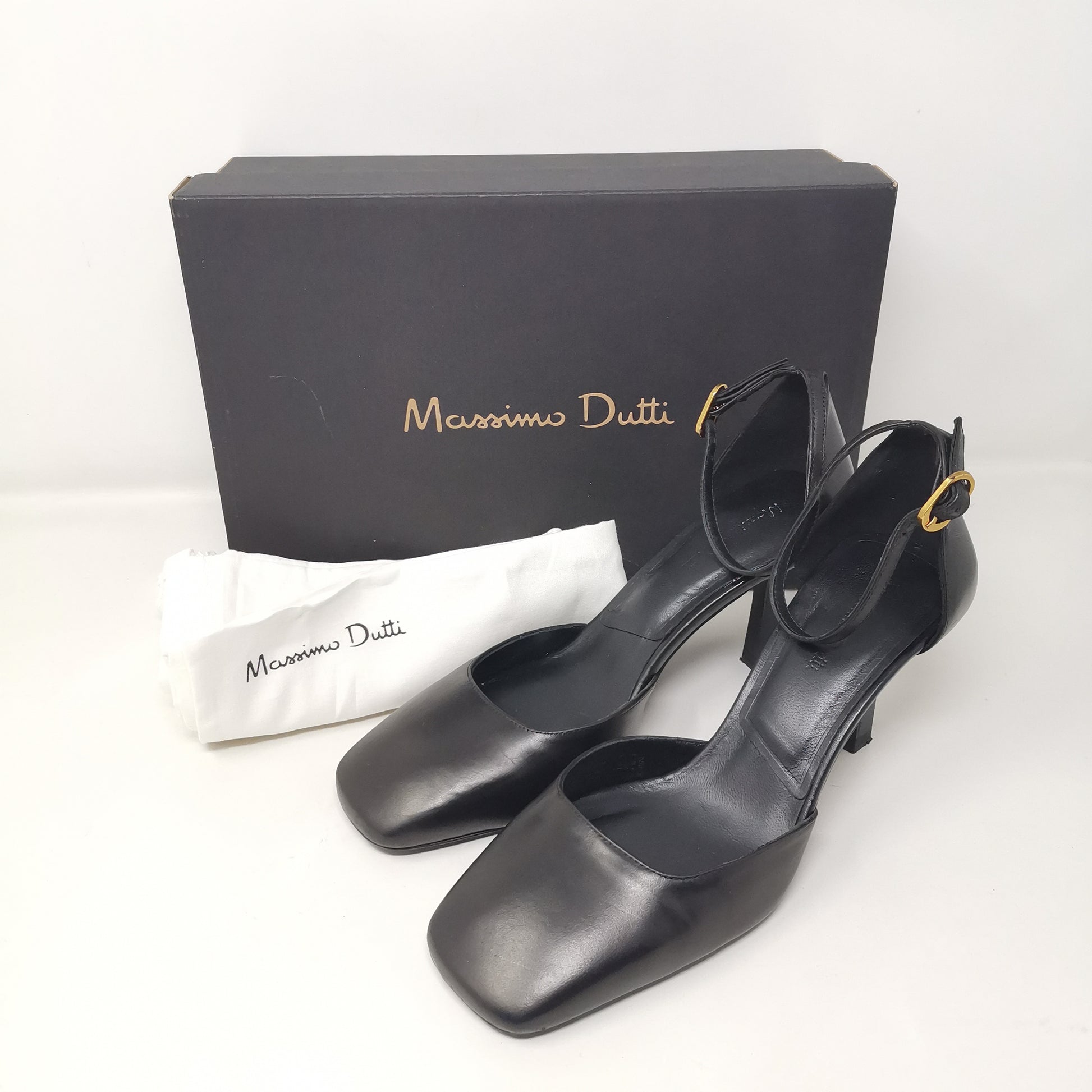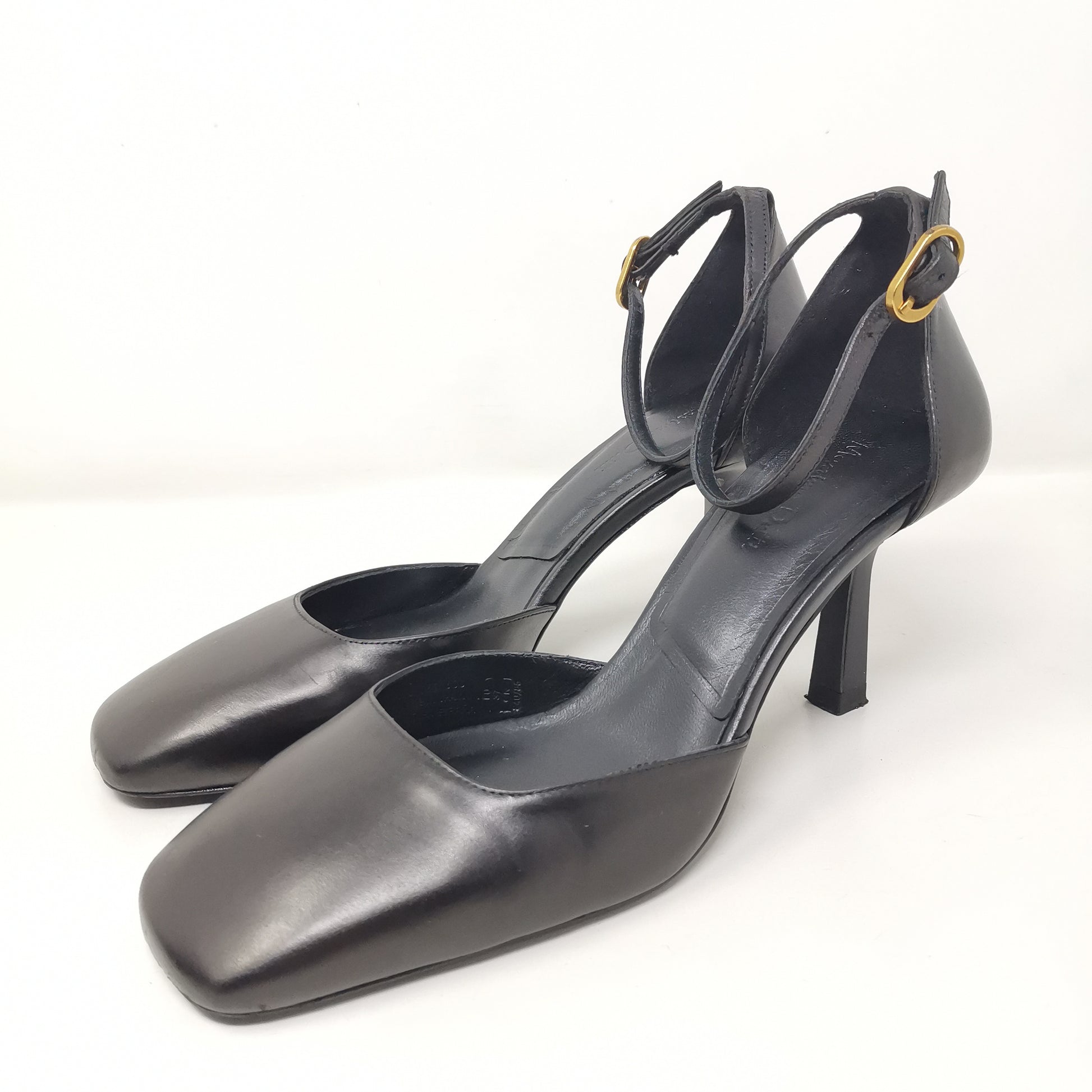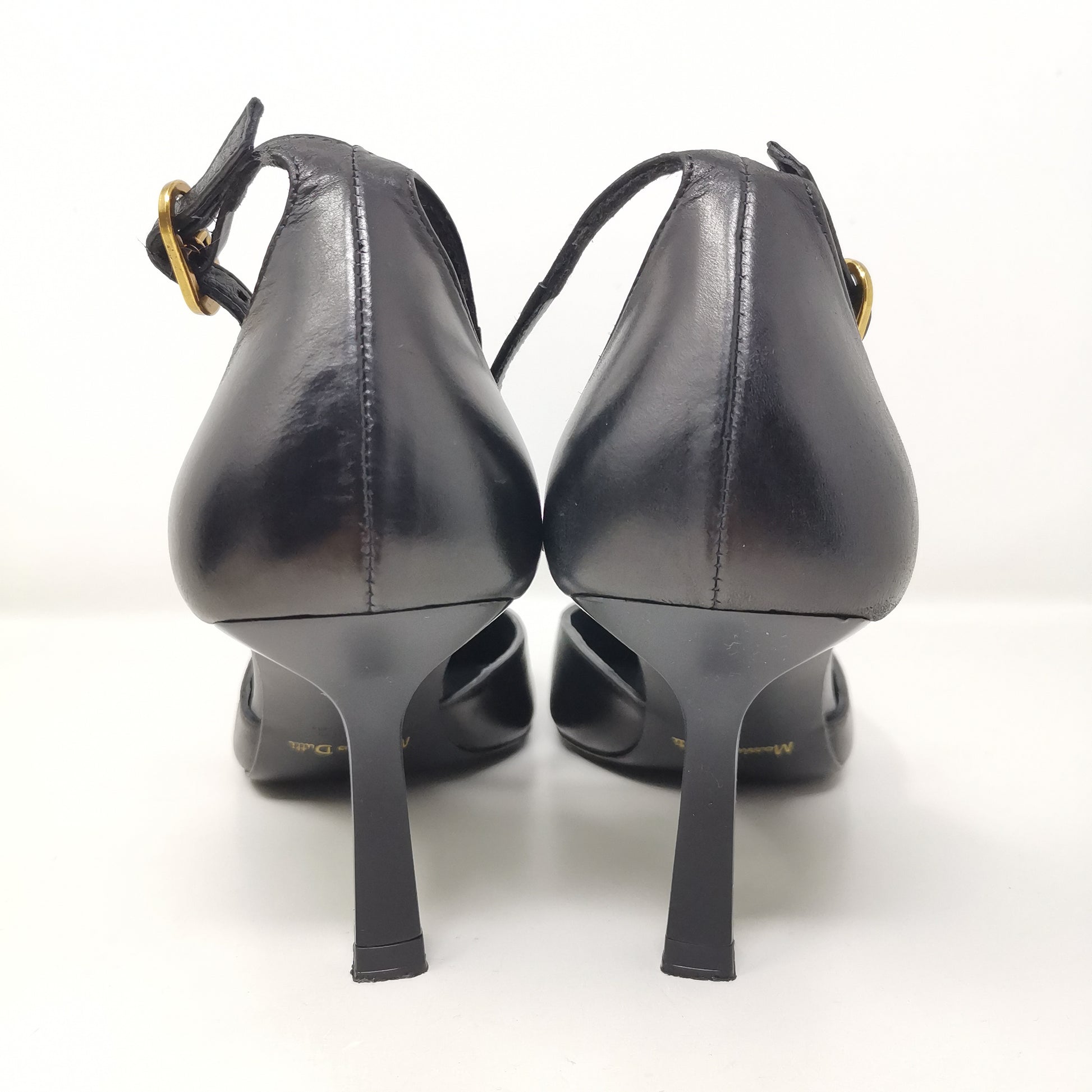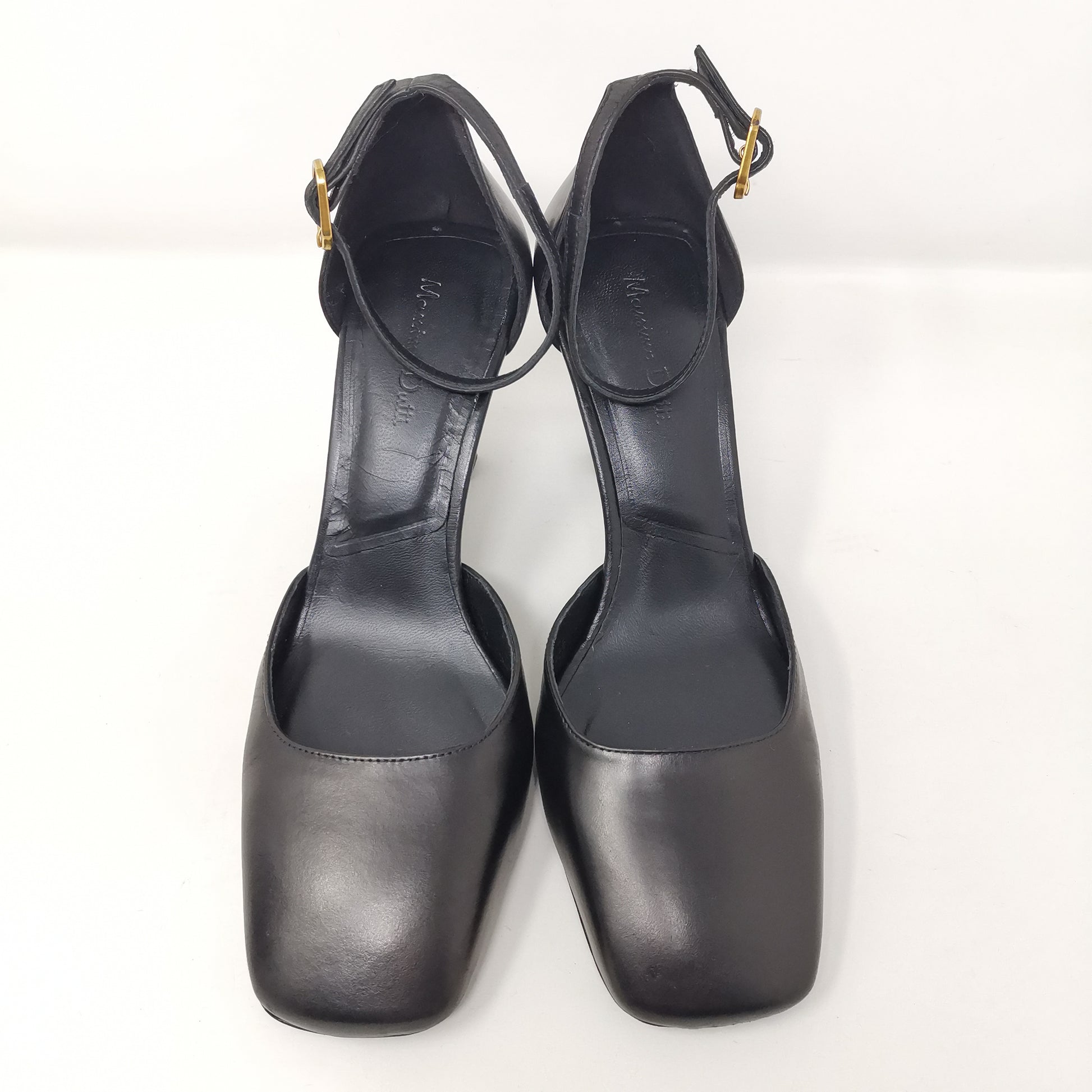 Pumps in black leather with 7.5 cm high heel and adjustable ankle strap. Square toe, the leather insole measures approximately 24.5cm. Complete with original box and dustbag. Size 37 EU.