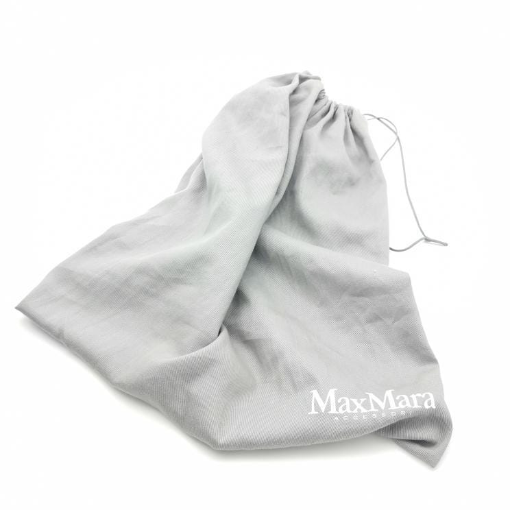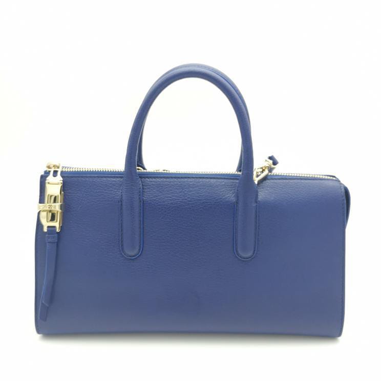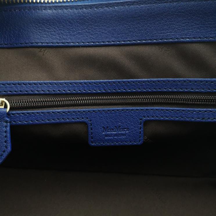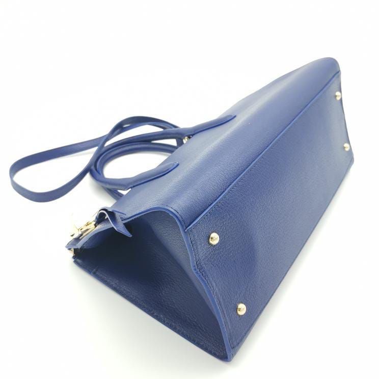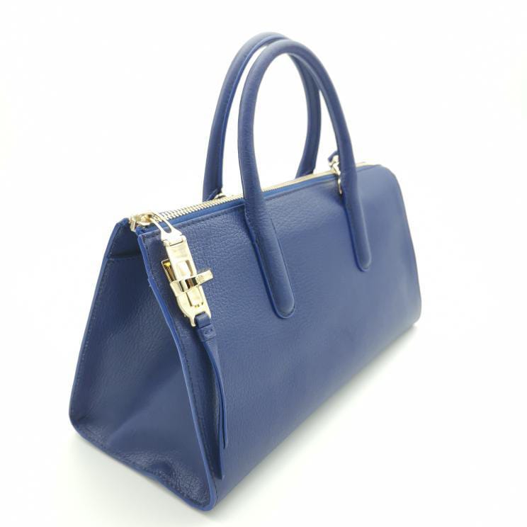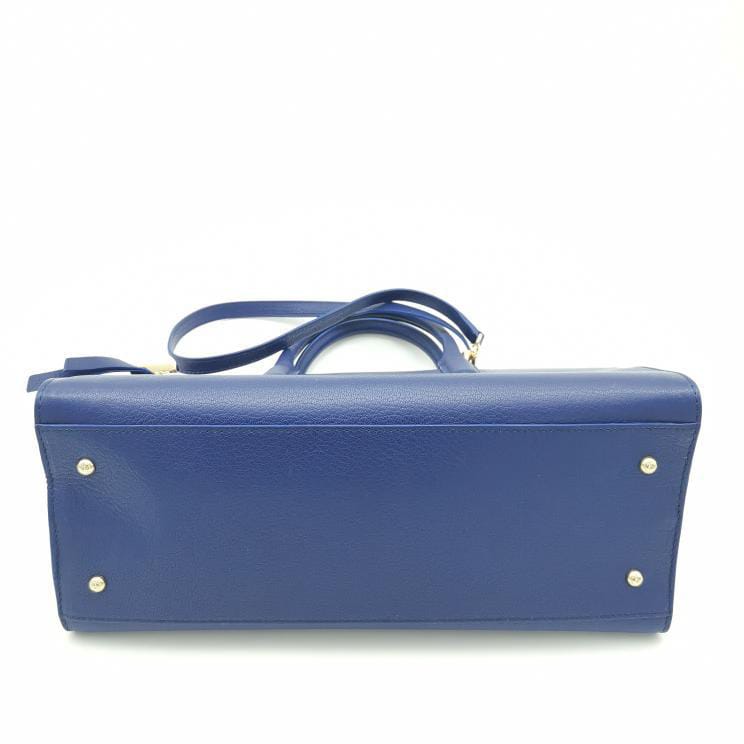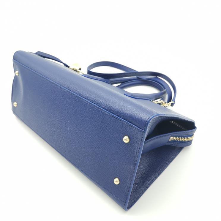 Blue leather bag with double handles and removable shoulder strap. Zipped opening and fabric interior with pocket, protective metal parts on the bottom and gold-coloured metal hardware. Complete with dustbag.