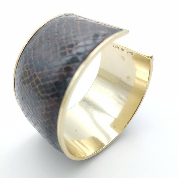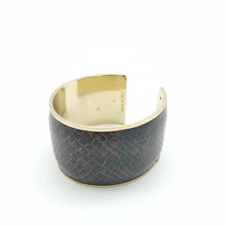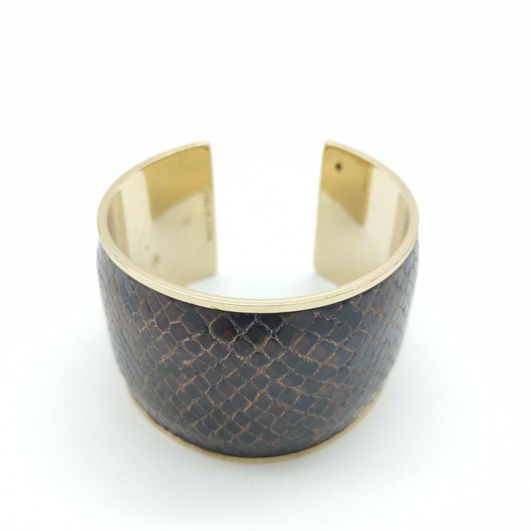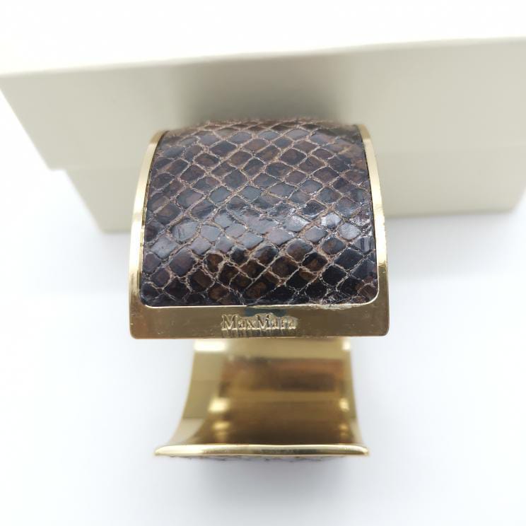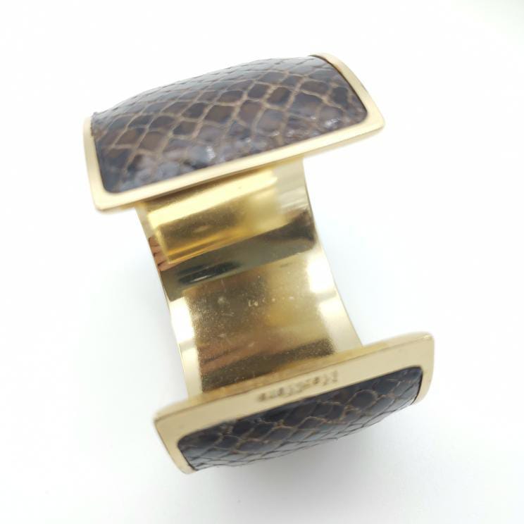Gold-coloured metal bracelet with brown leather band. Small scratches on the inside metal part. Complete with box. Diameter 6.3 cm, height 3.8 cm.