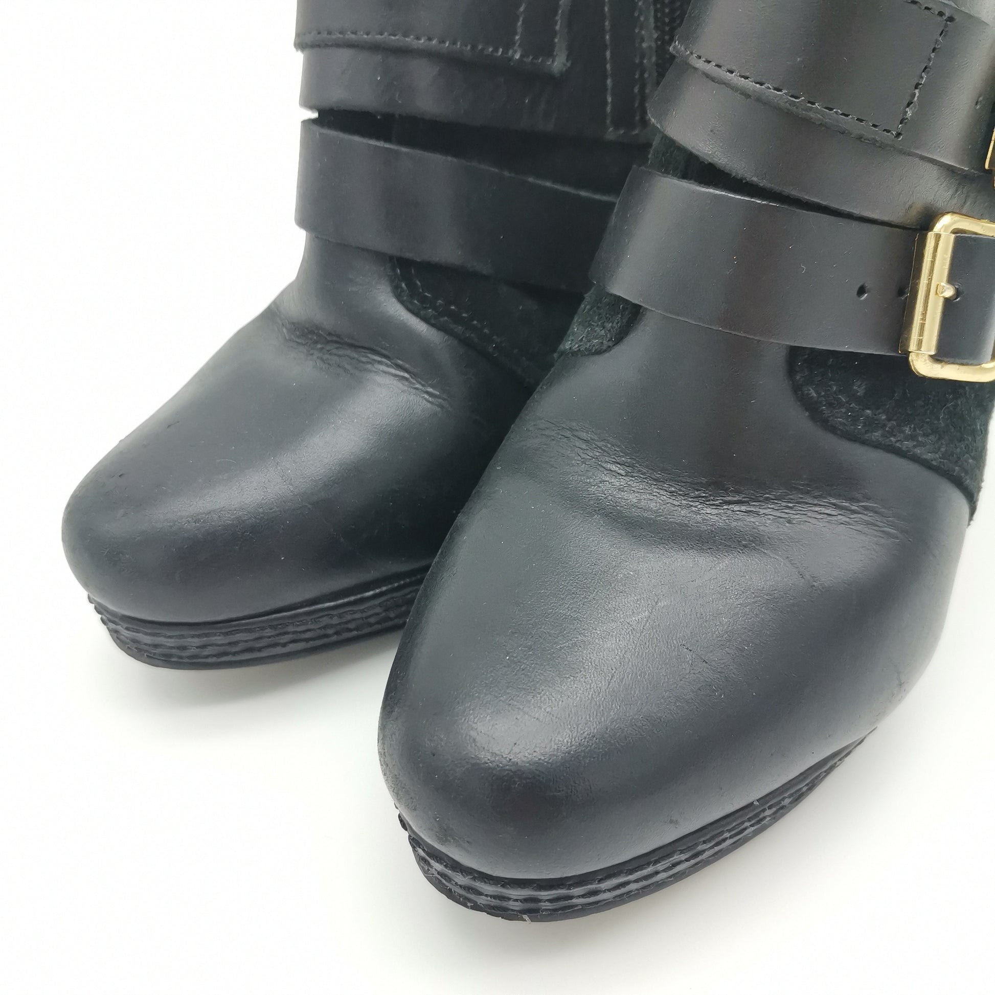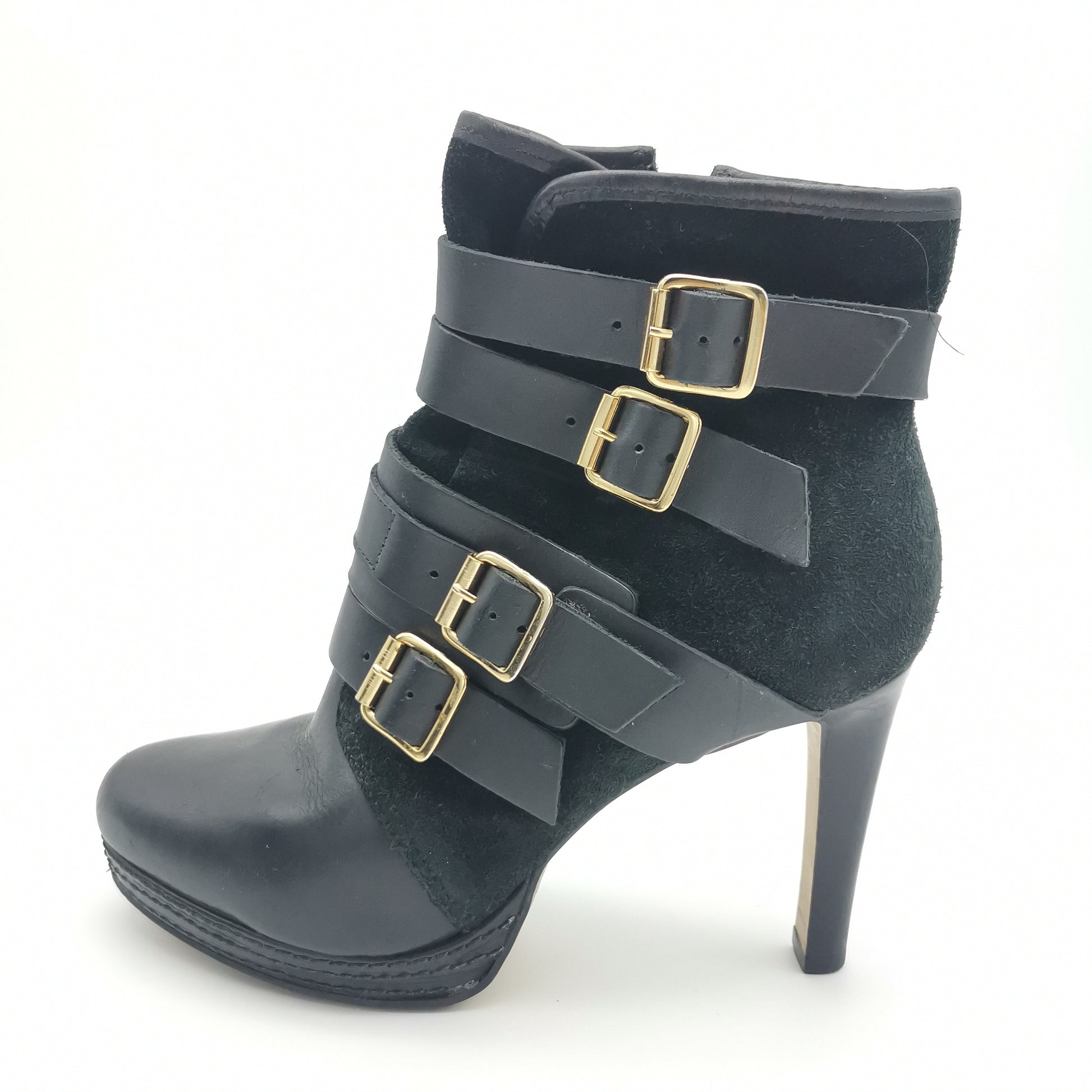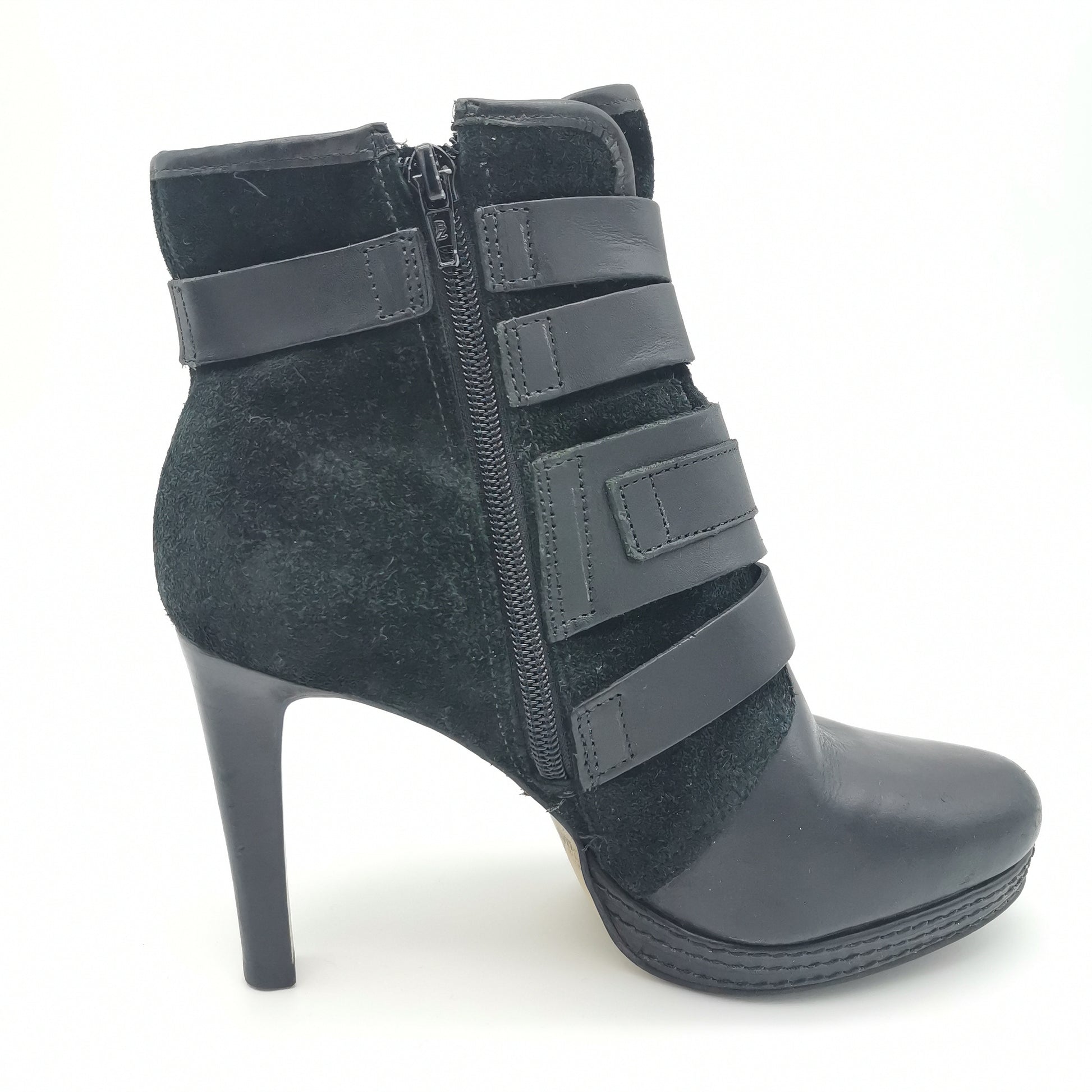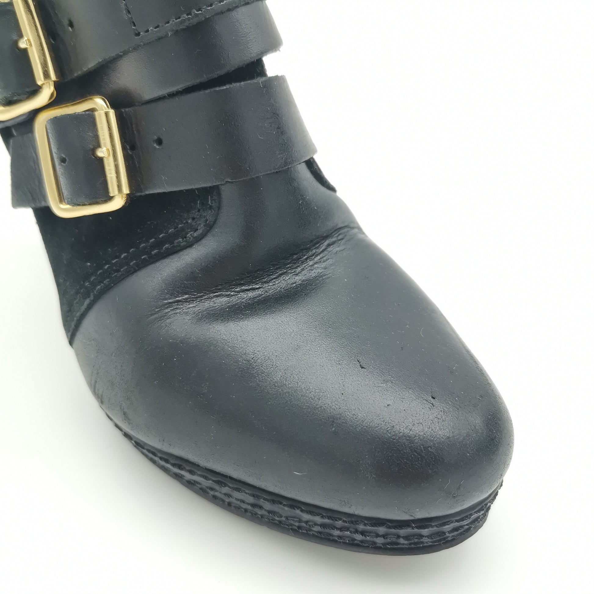 Black leather and suede ankle boots with 9.5 cm heel and 1.5 cm platform. Decorative buckles on the outside and zip on the inside, gold metal finishes. There are some signs on the toes and the leather part in general. Leg height 11 cm, leg width 11.5 cm. Size 37 EU.