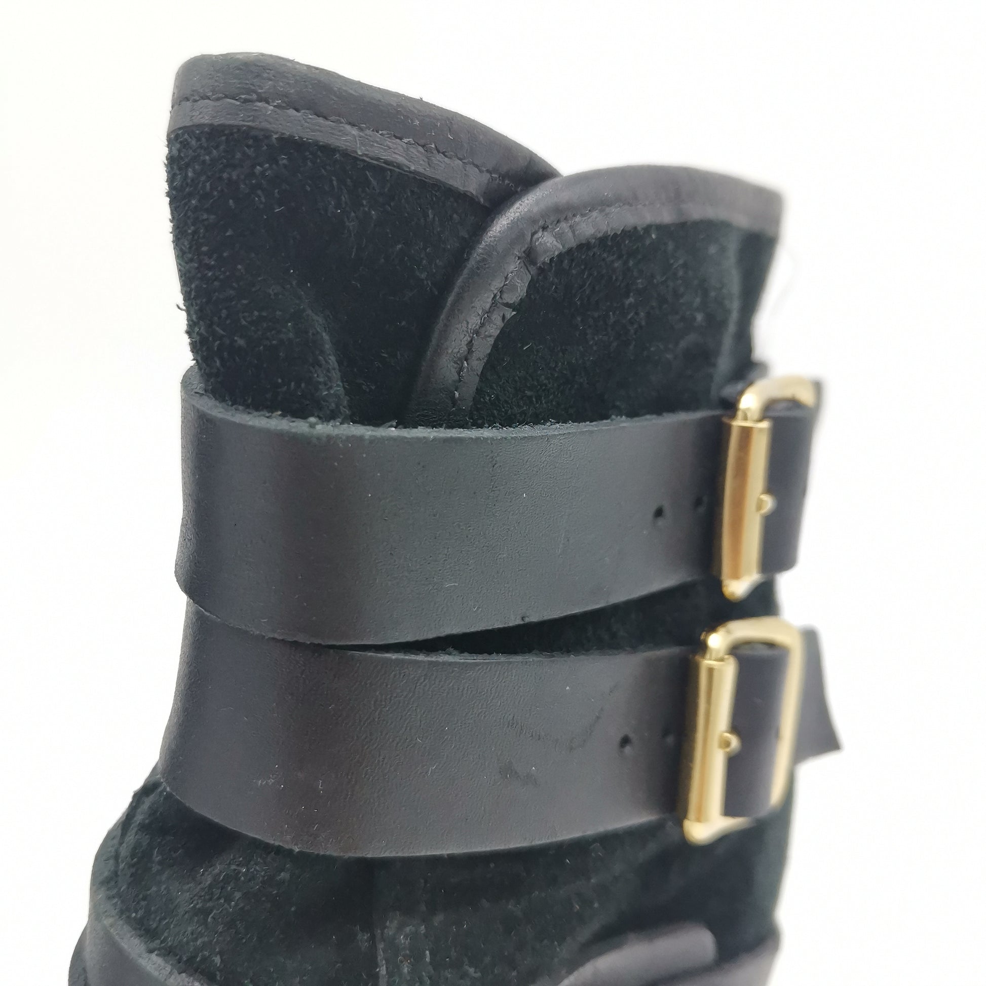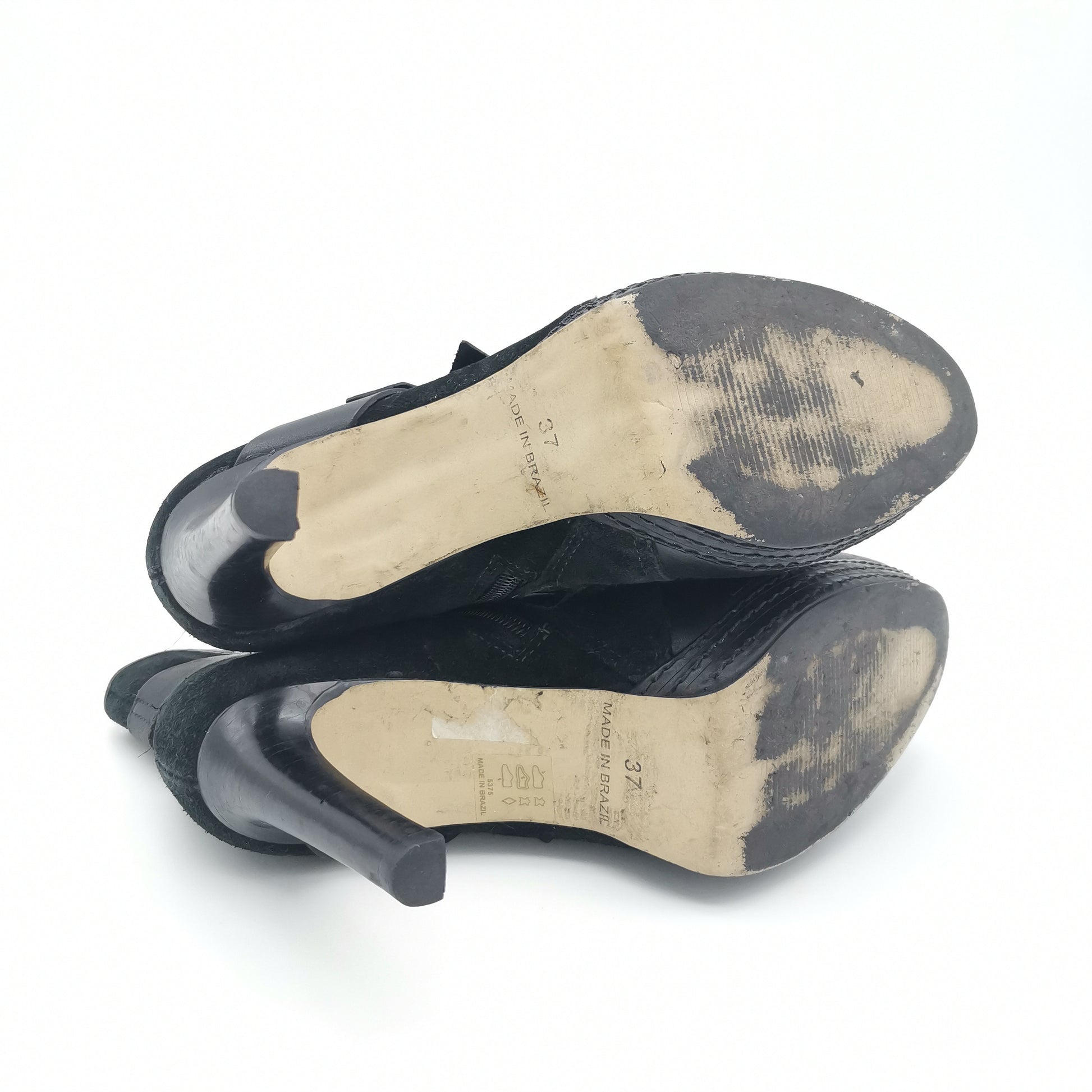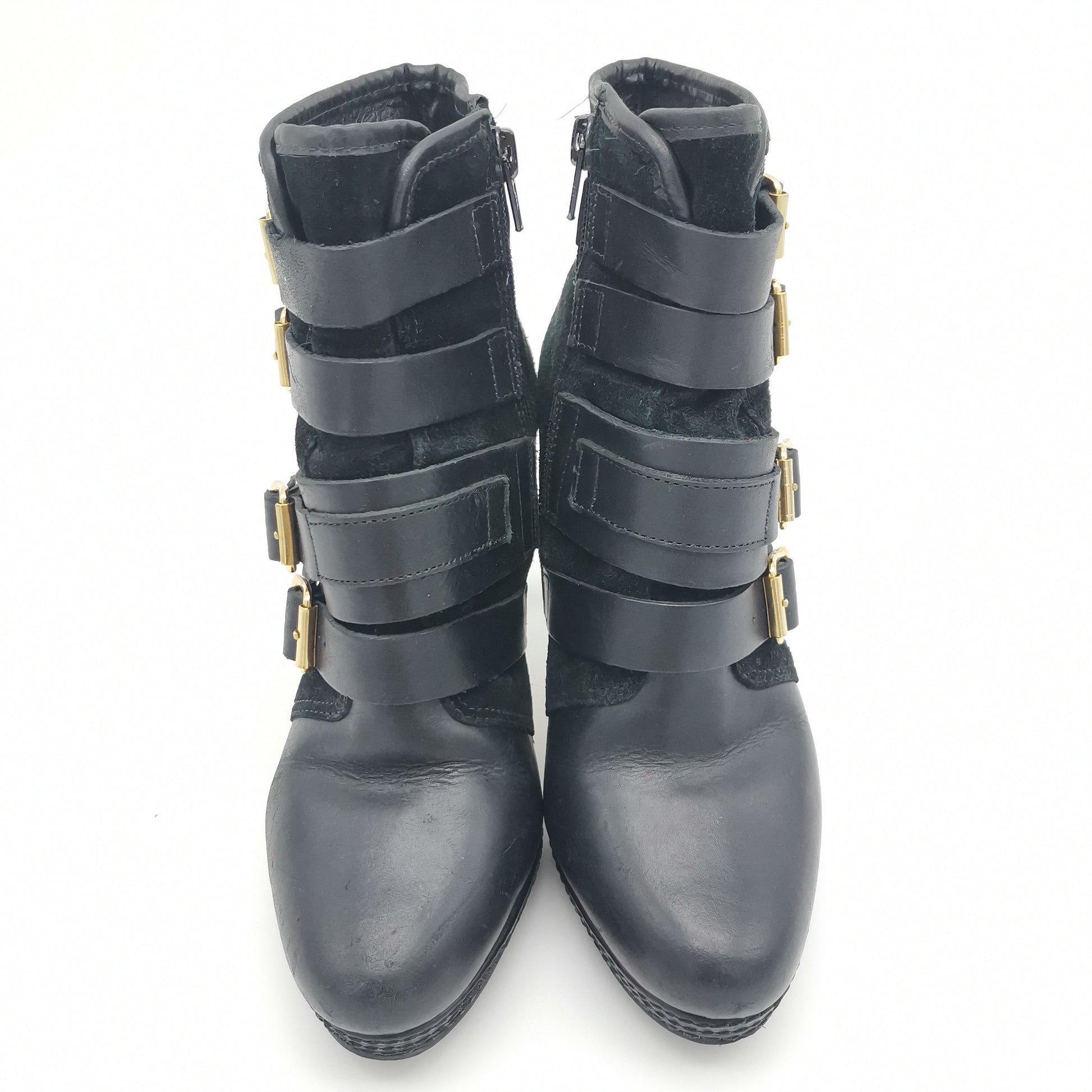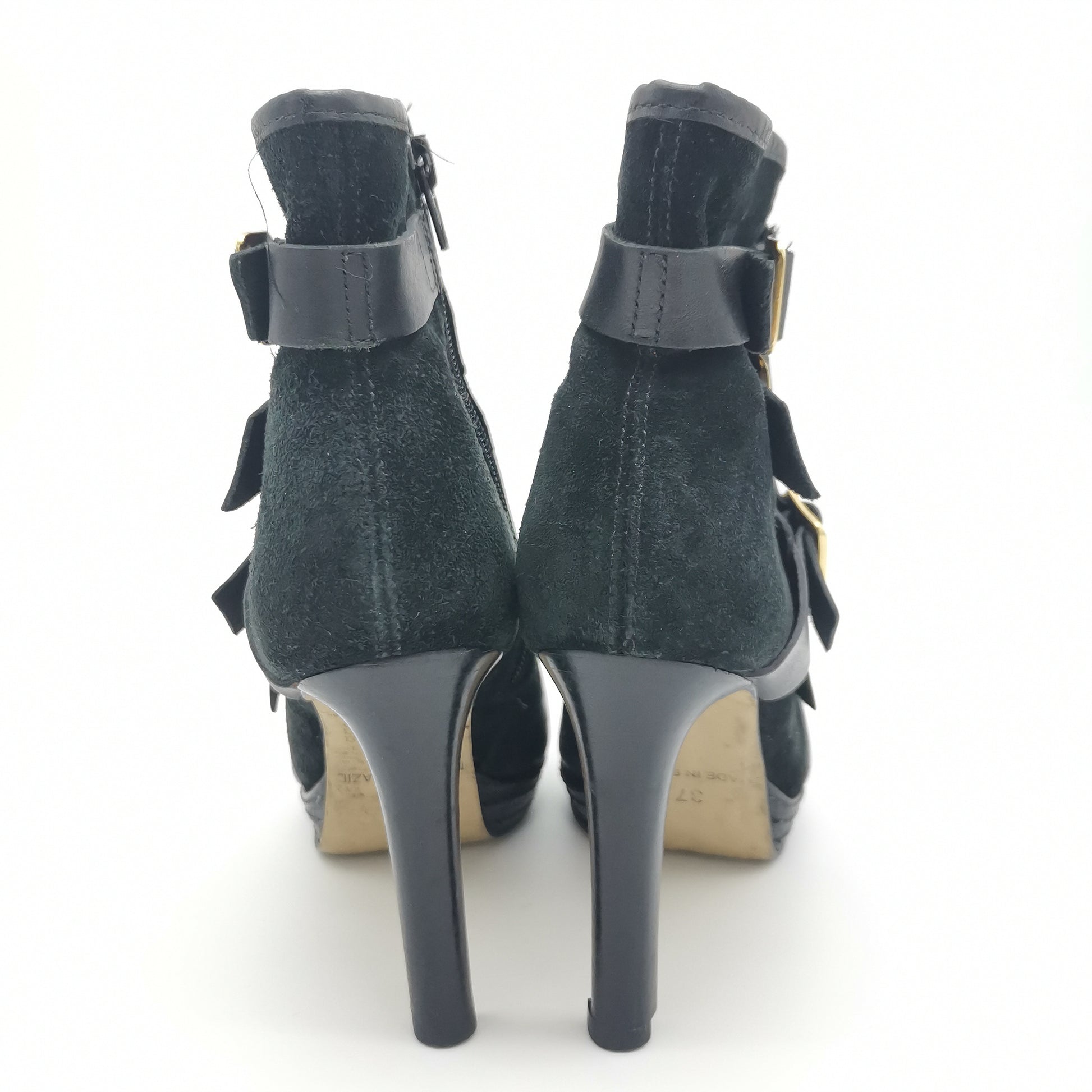 Black leather and suede ankle boots with 9.5 cm heel and 1.5 cm platform. Decorative buckles on the outside and zip on the inside, gold metal finishes. There are some signs on the toes and the leather part in general. Leg height 11 cm, leg width 11.5 cm. Size 37 EU.