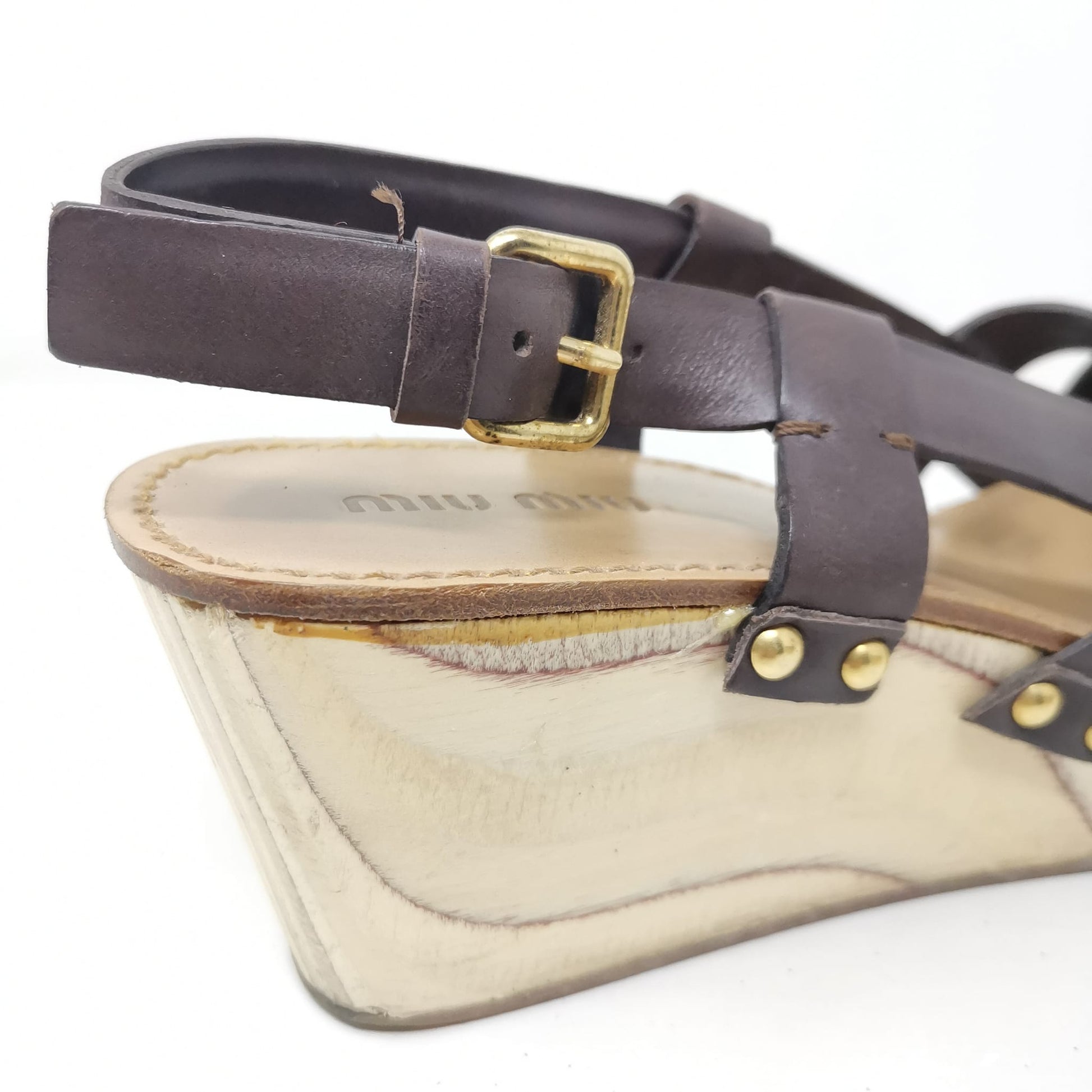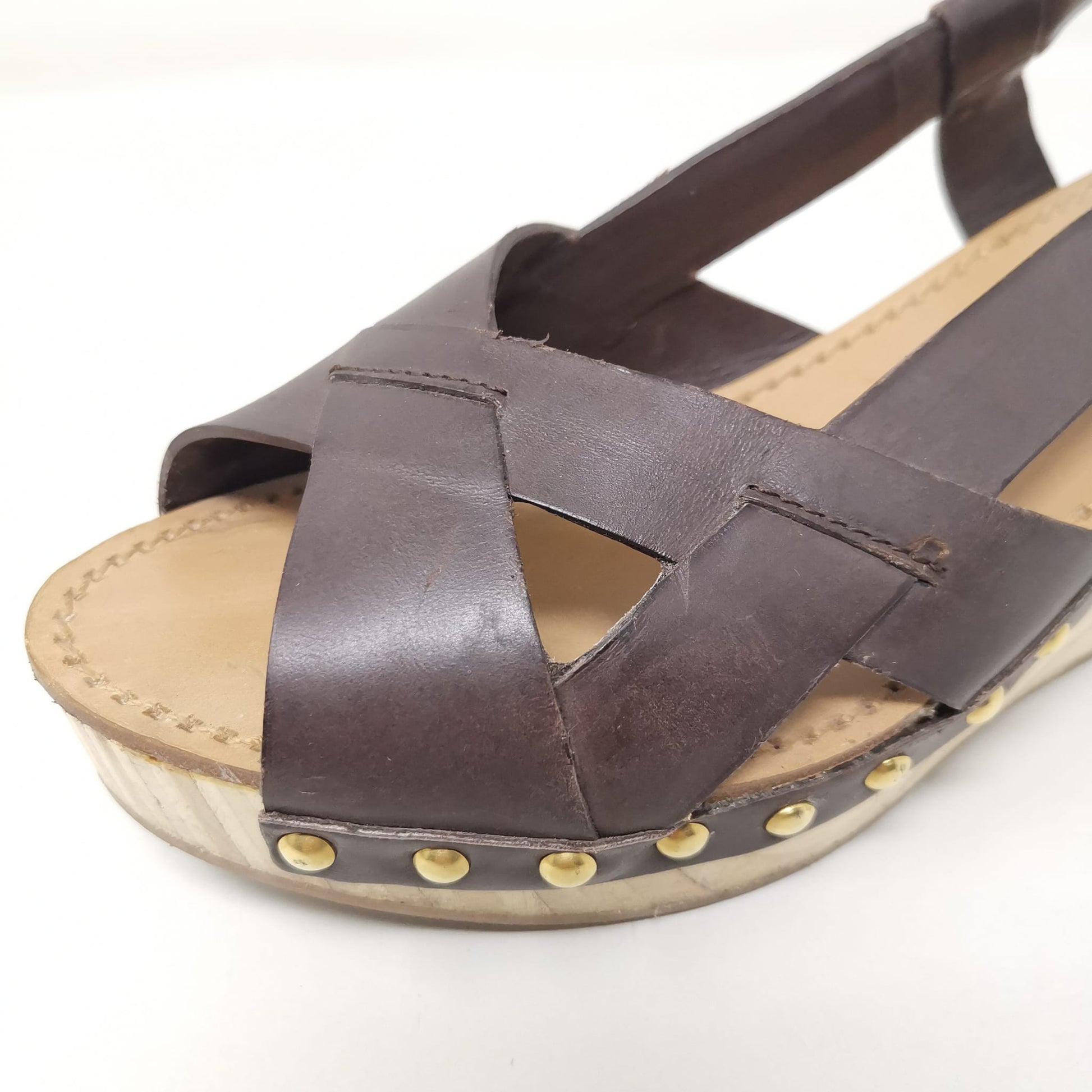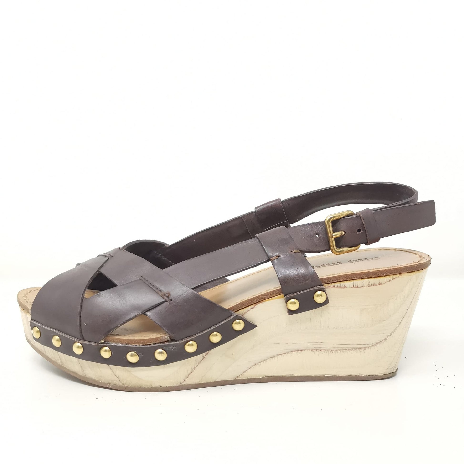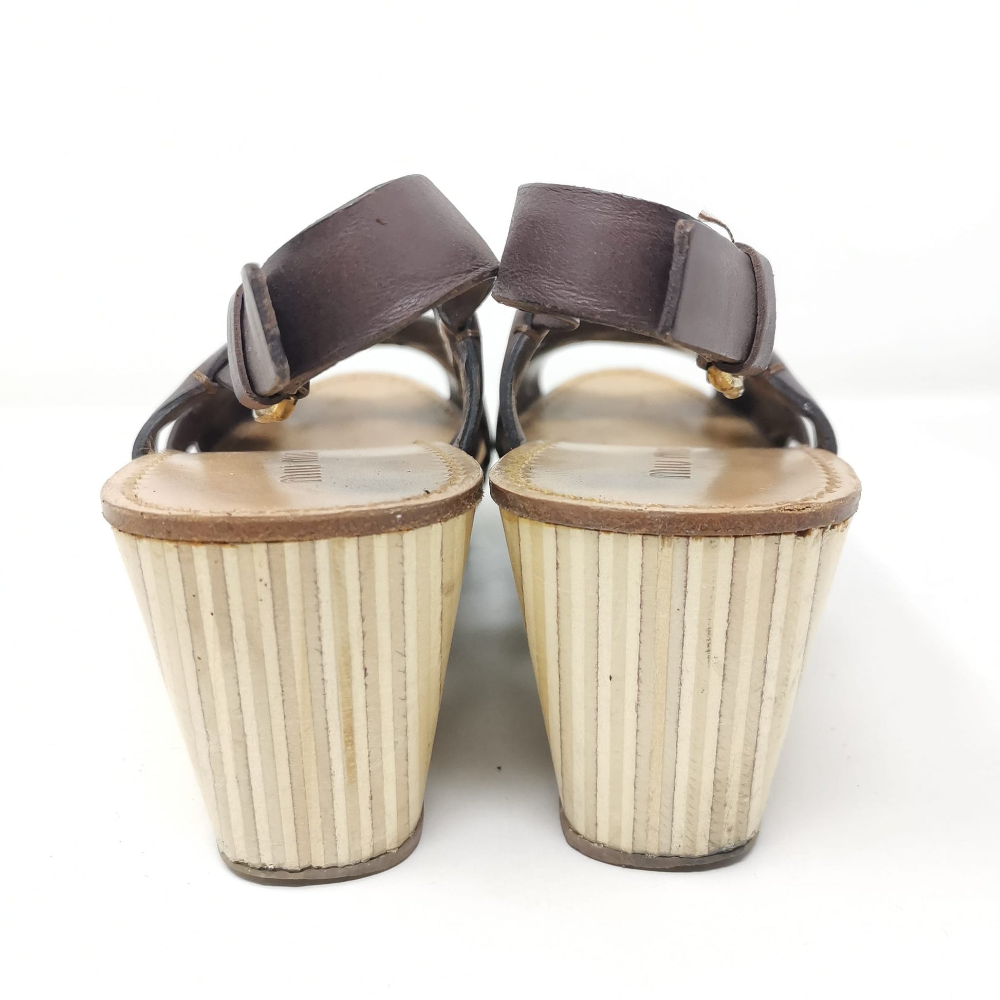 Brown leather sandals with 6.3 cm high wooden wedge and 2.5 cm platform. Leather insole measures 23.8cm, rubber outsole. There are some small marks on the wooden part and soles. Size 36 EU.