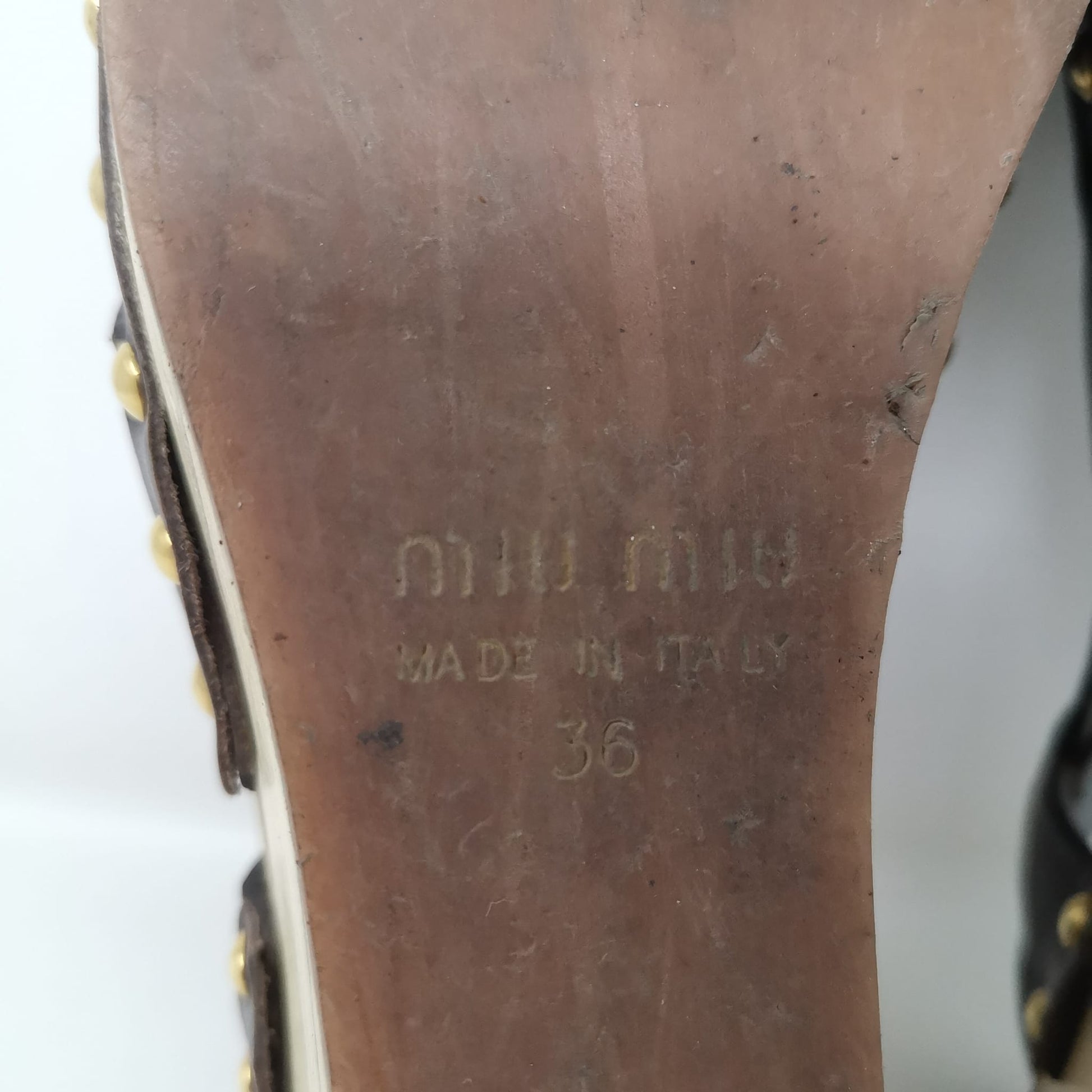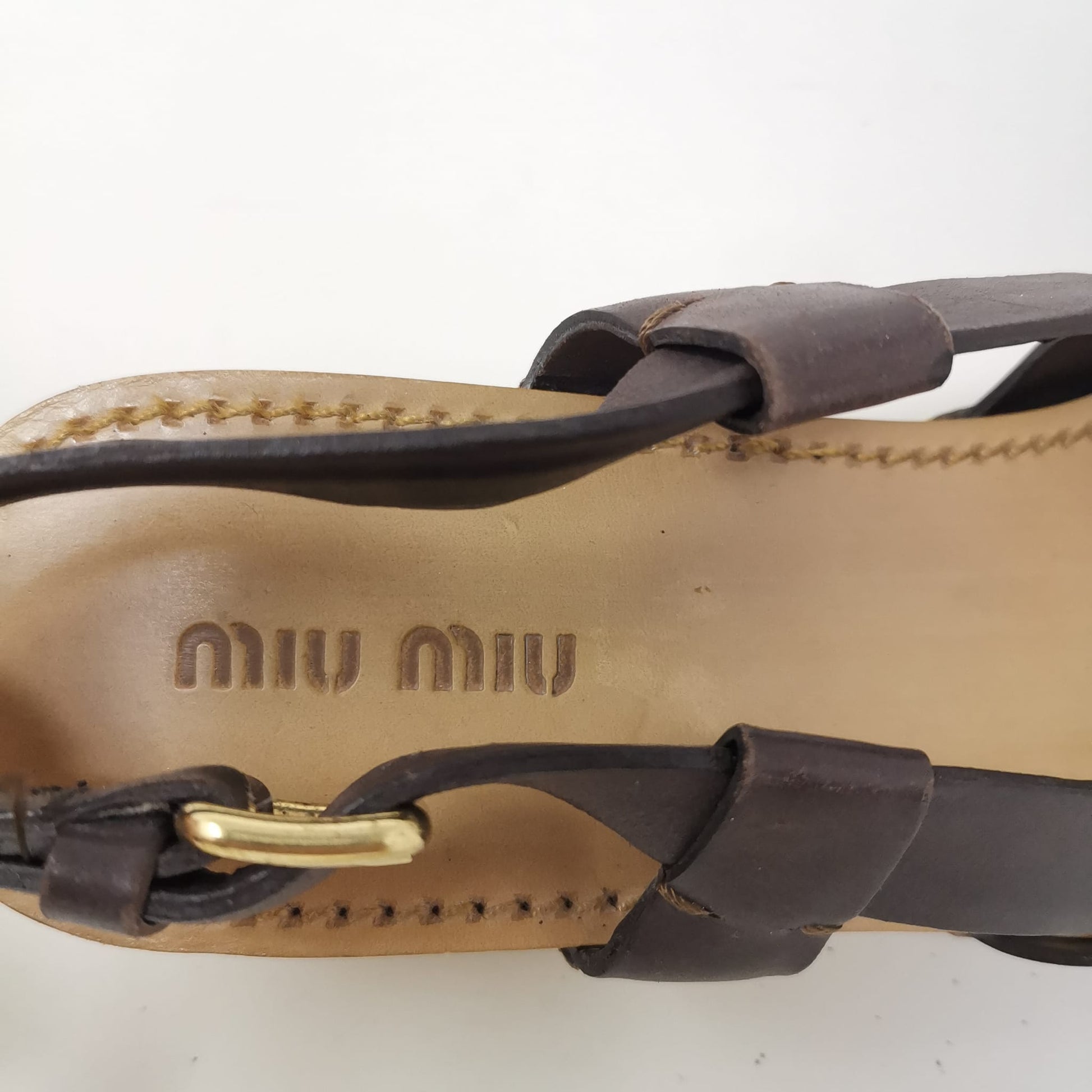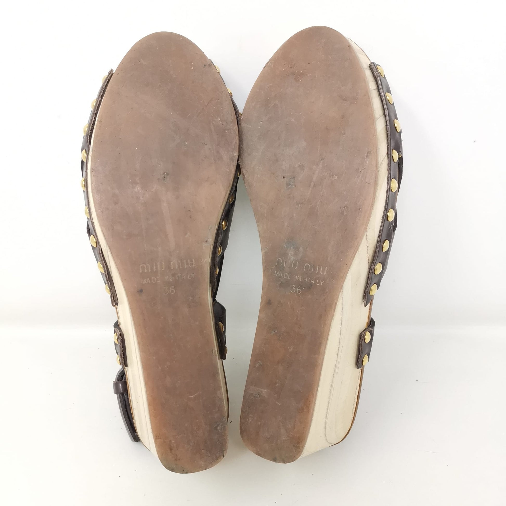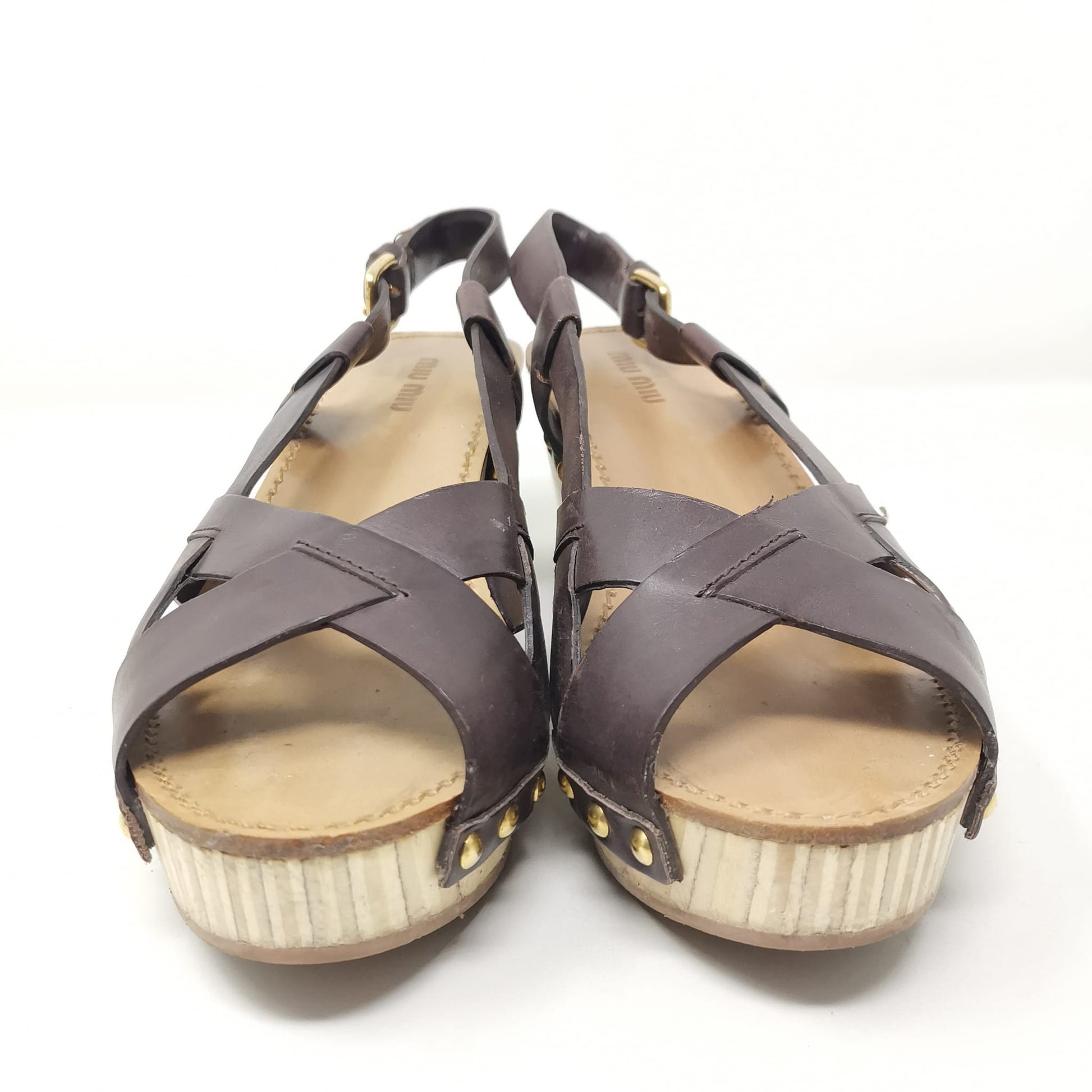 Brown leather sandals with 6.3 cm high wooden wedge and 2.5 cm platform. Leather insole measures 23.8cm, rubber outsole. There are some small marks on the wooden part and soles. Size 36 EU.