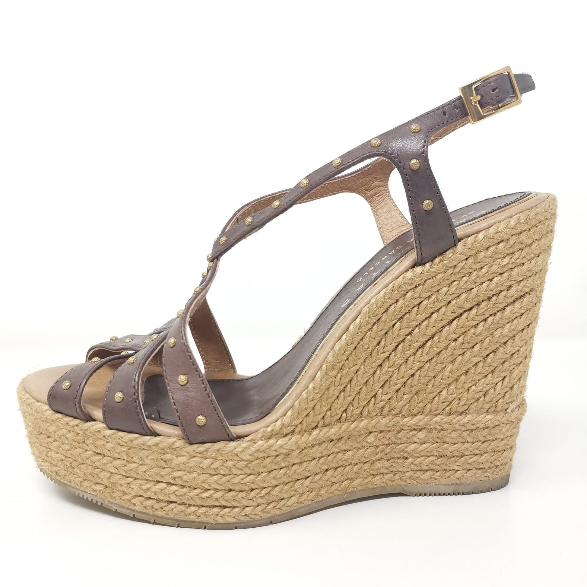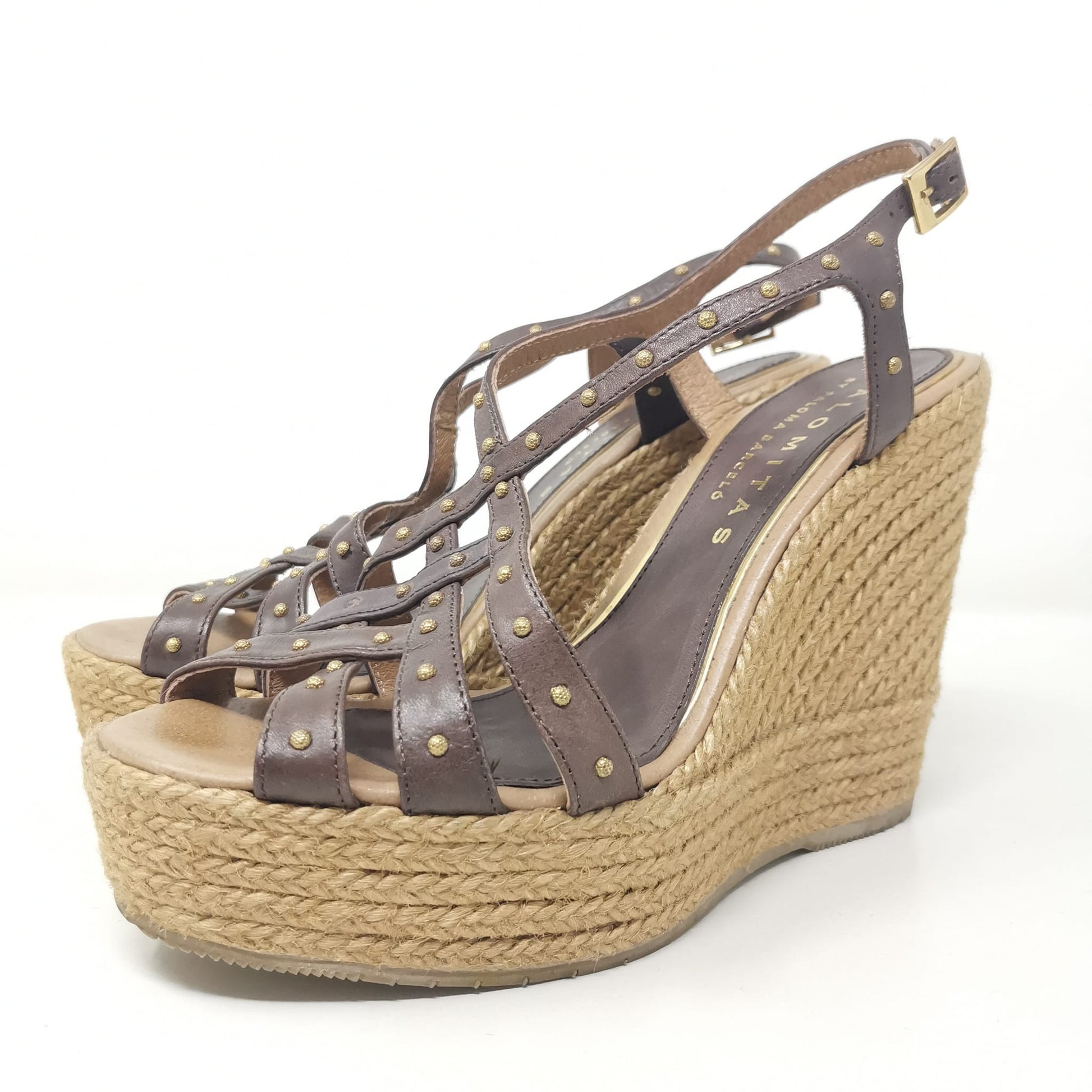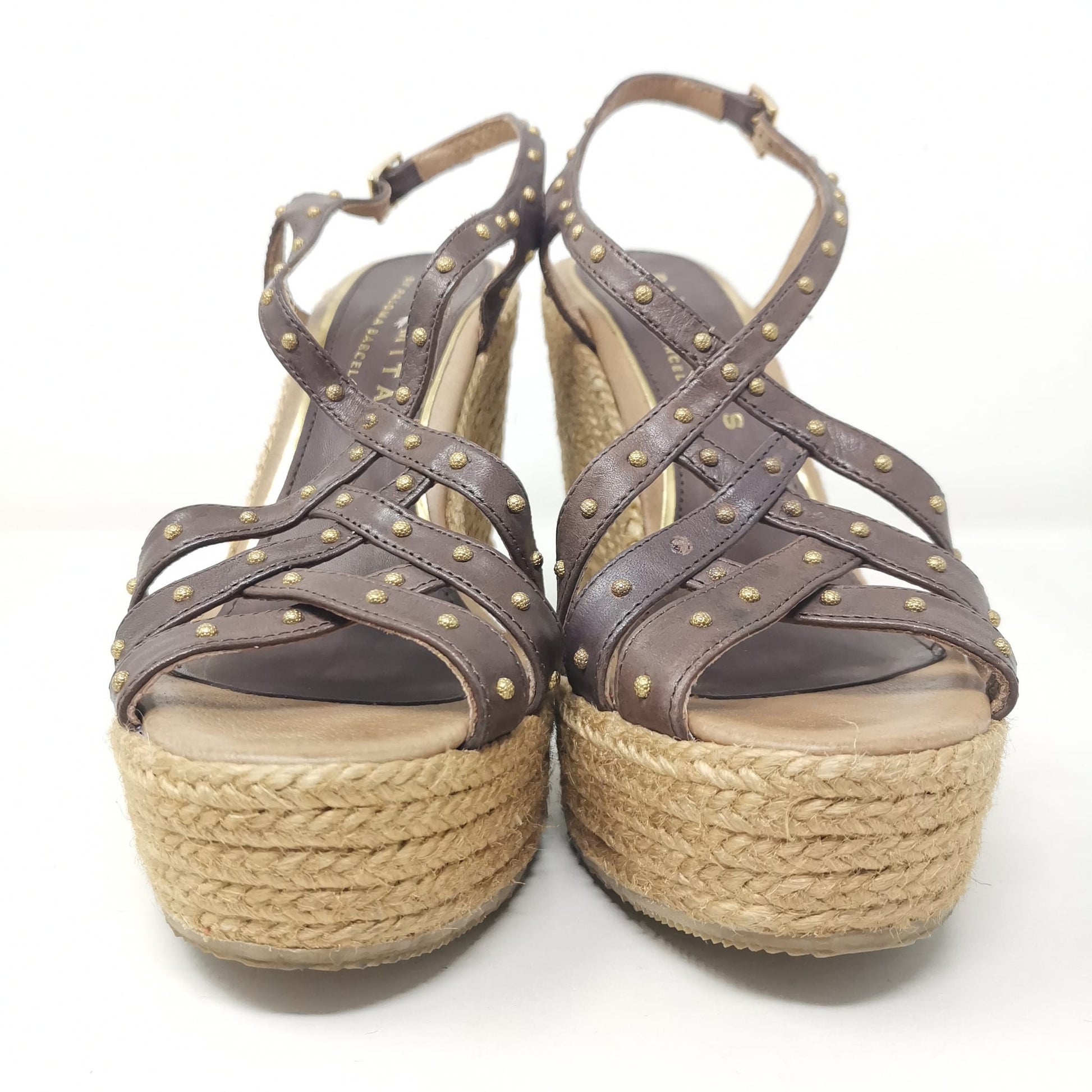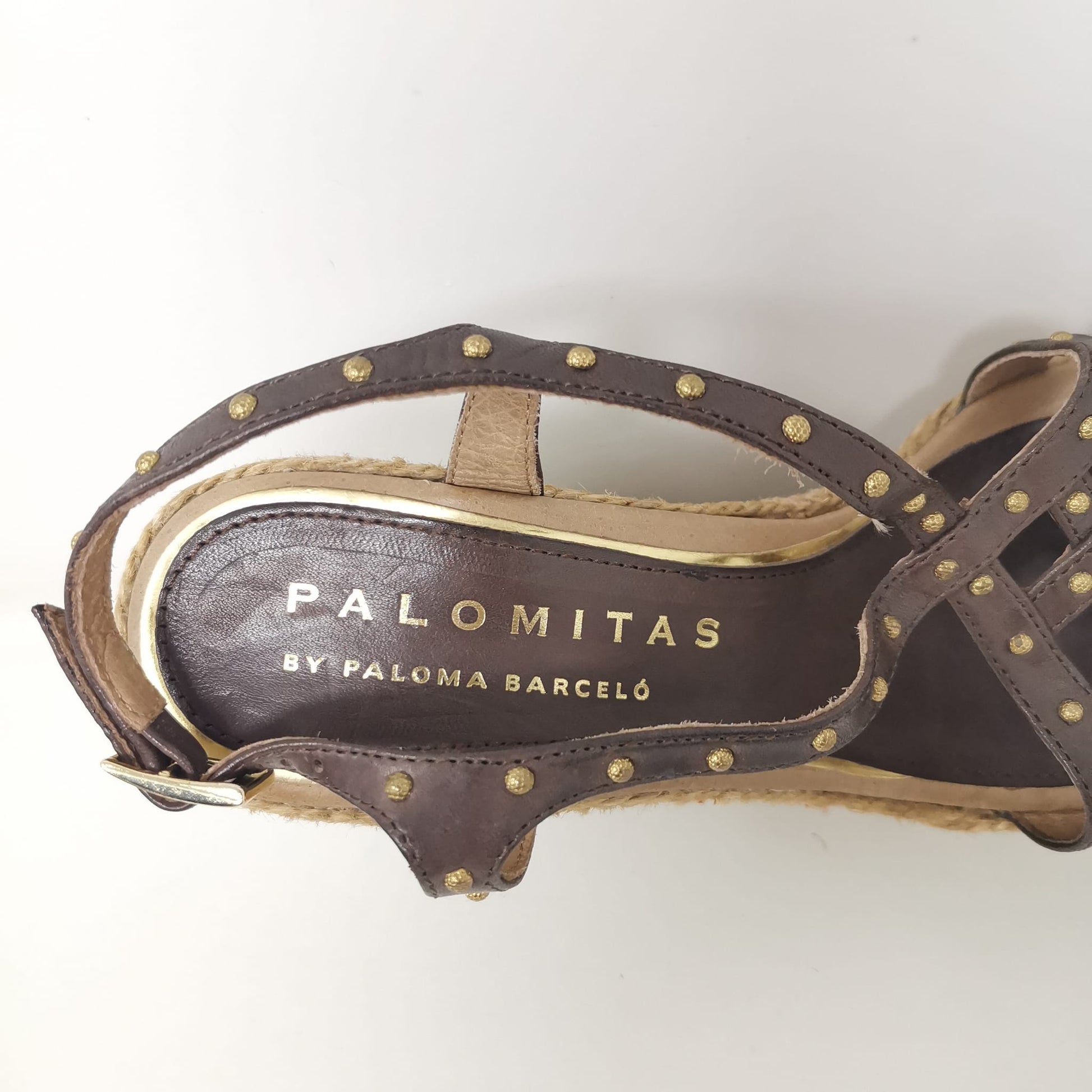 Palomitas by Paloma Barcelò, brown leather sandals with beige rope wedge 11.5 cm high and 3 cm platform. The leather insole measures 23.5 cm, adjustable ankle strap and decoration with small studs, one of which is missing on the left shoe. Rubber outsole. Size 37 EU.