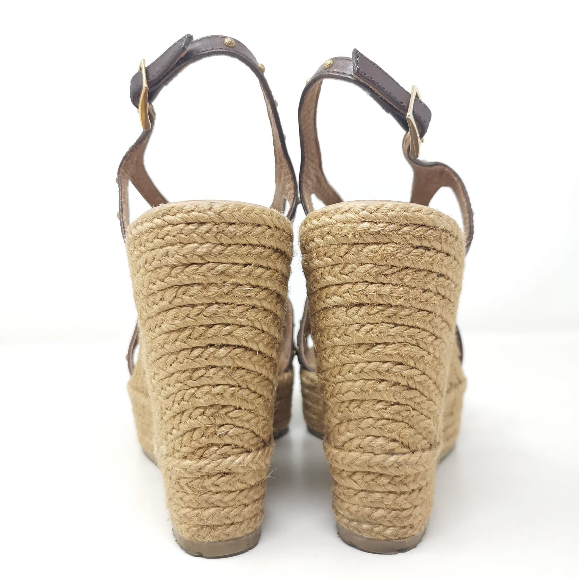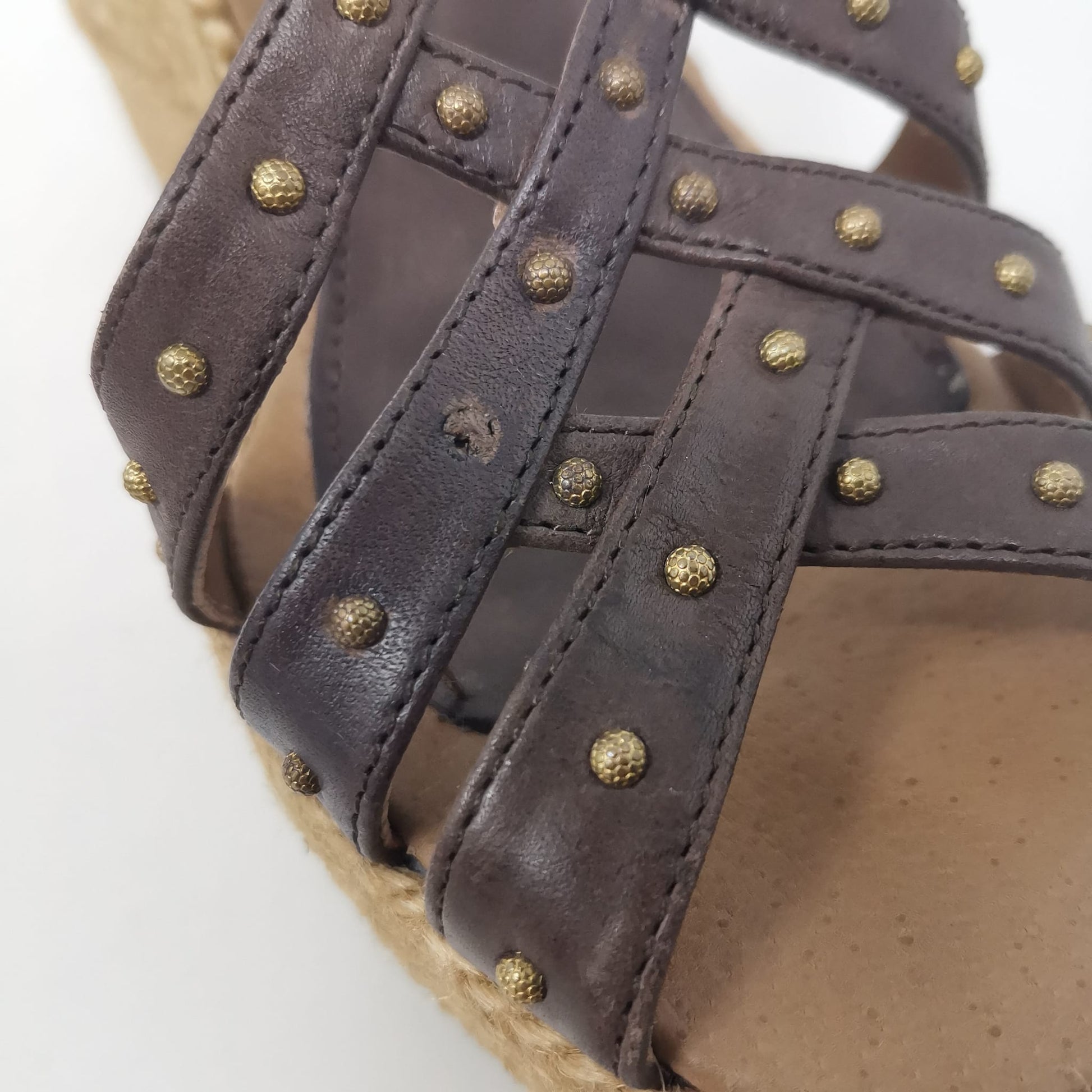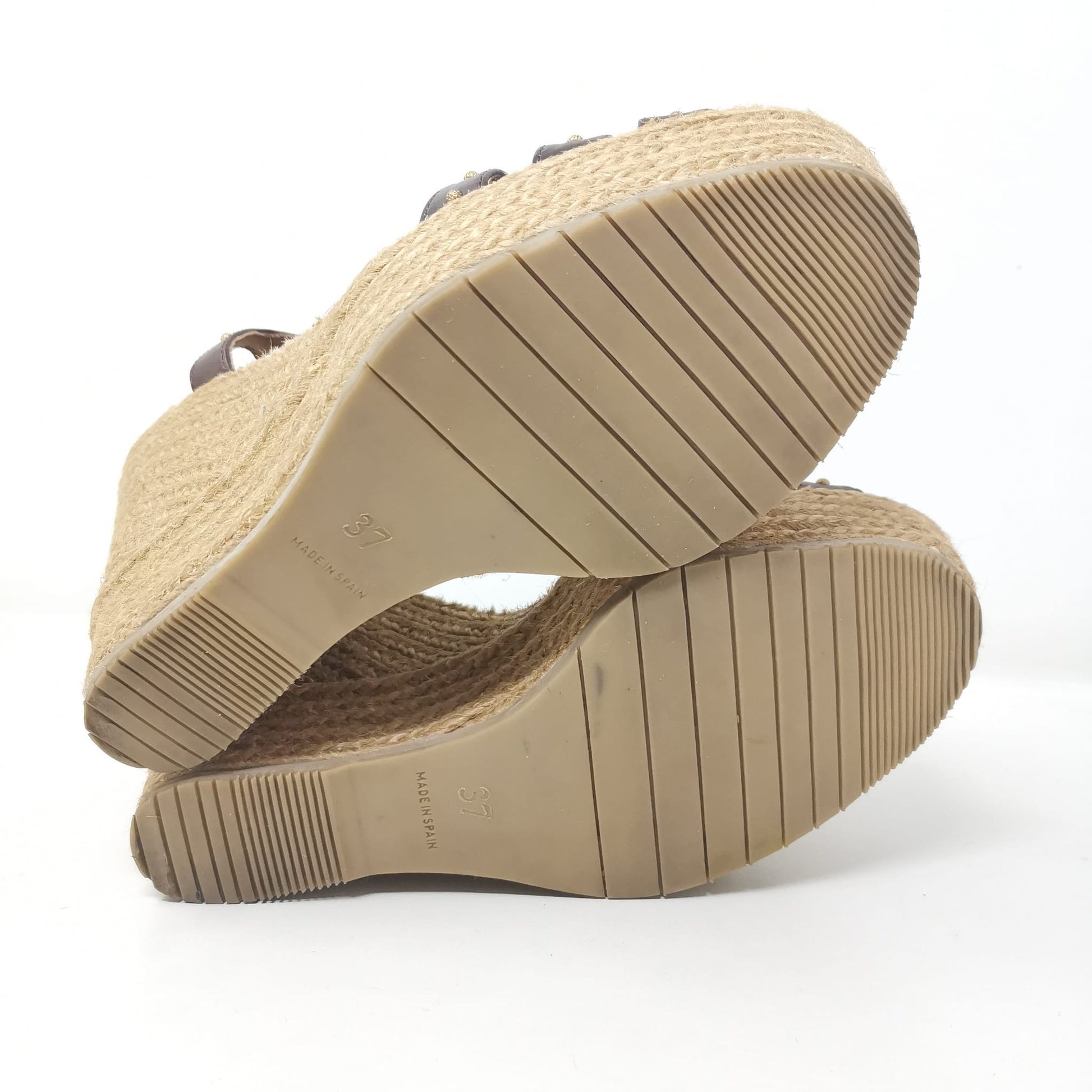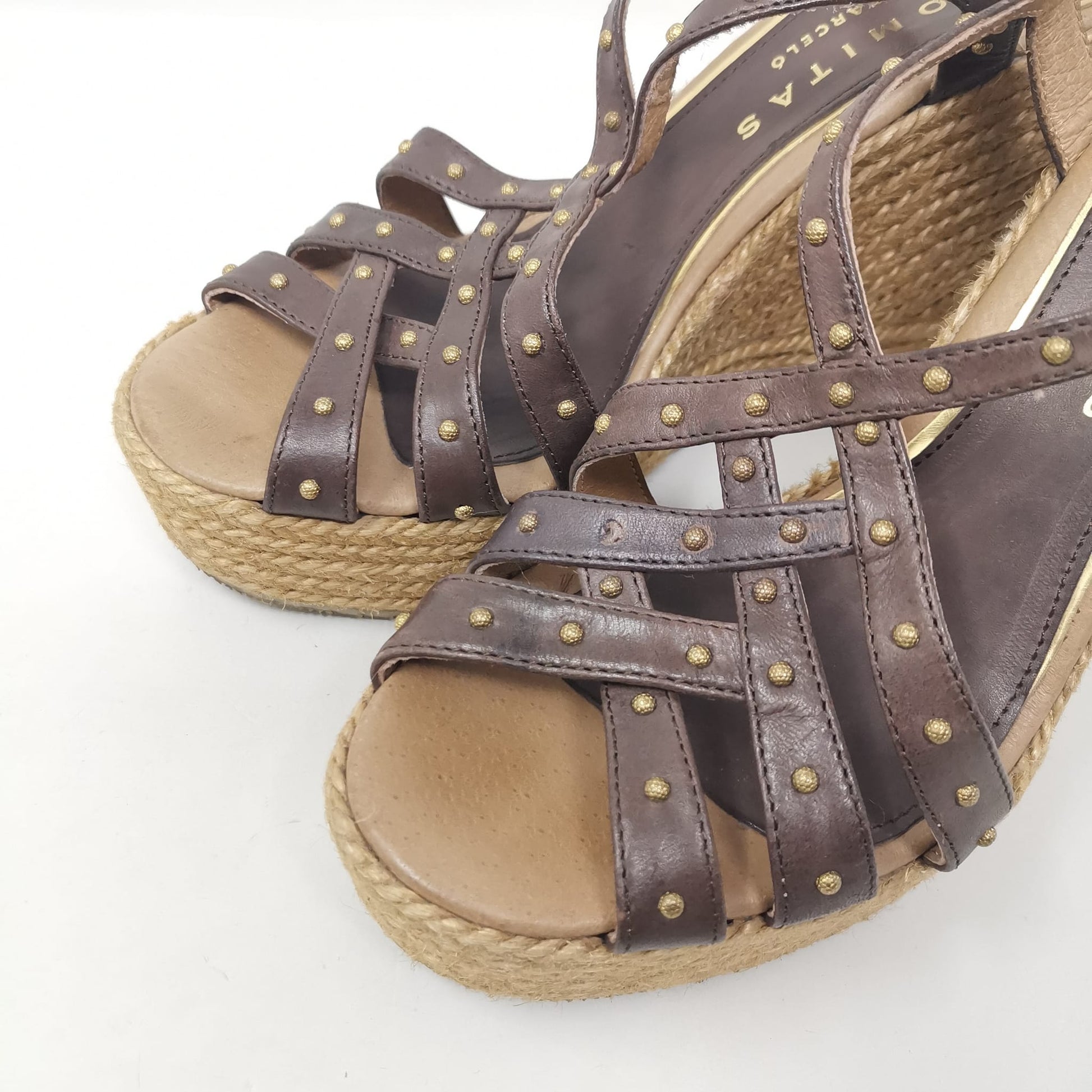 Palomitas by Paloma Barcelò, brown leather sandals with beige rope wedge 11.5 cm high and 3 cm platform. The leather insole measures 23.5 cm, adjustable ankle strap and decoration with small studs, one of which is missing on the left shoe. Rubber outsole. Size 37 EU.