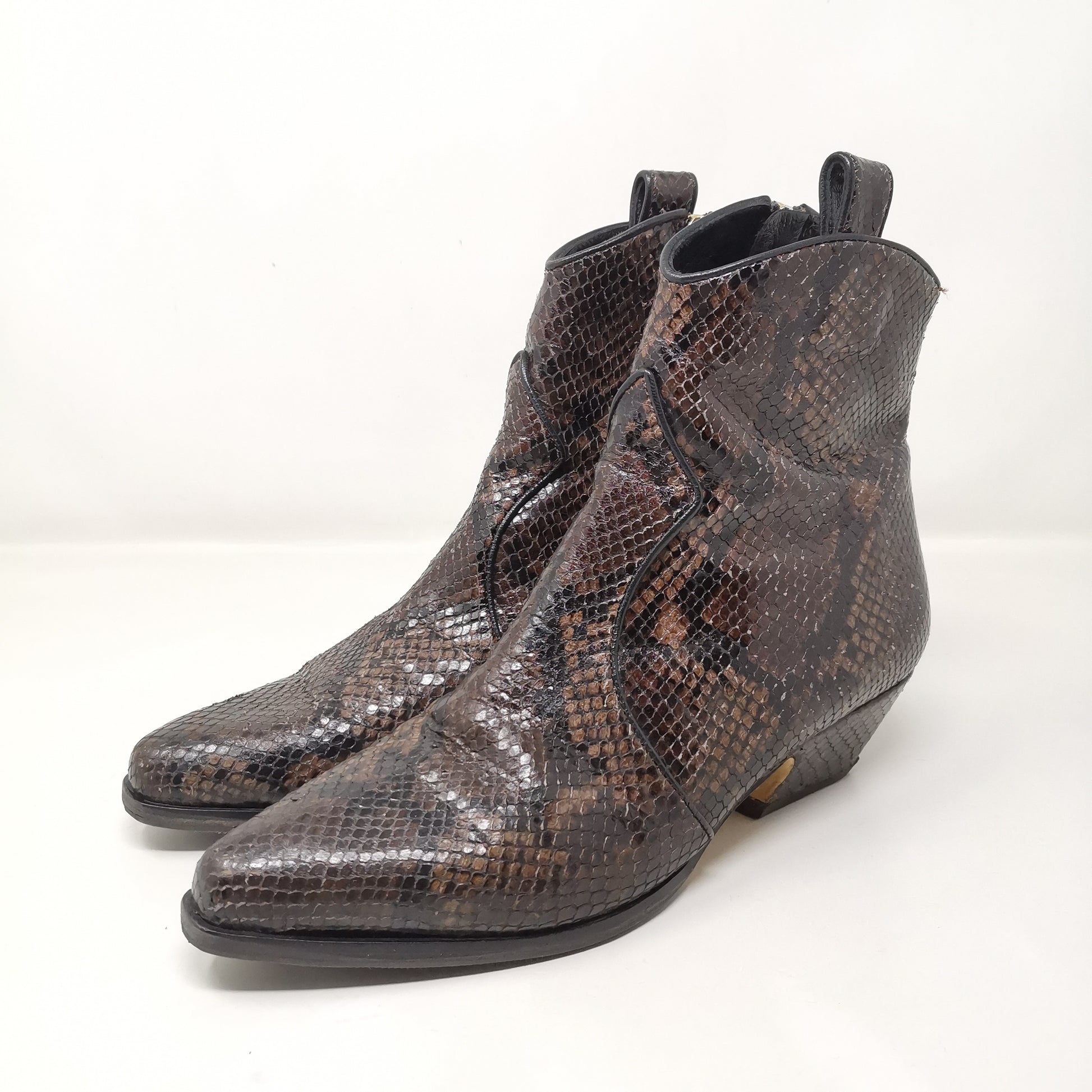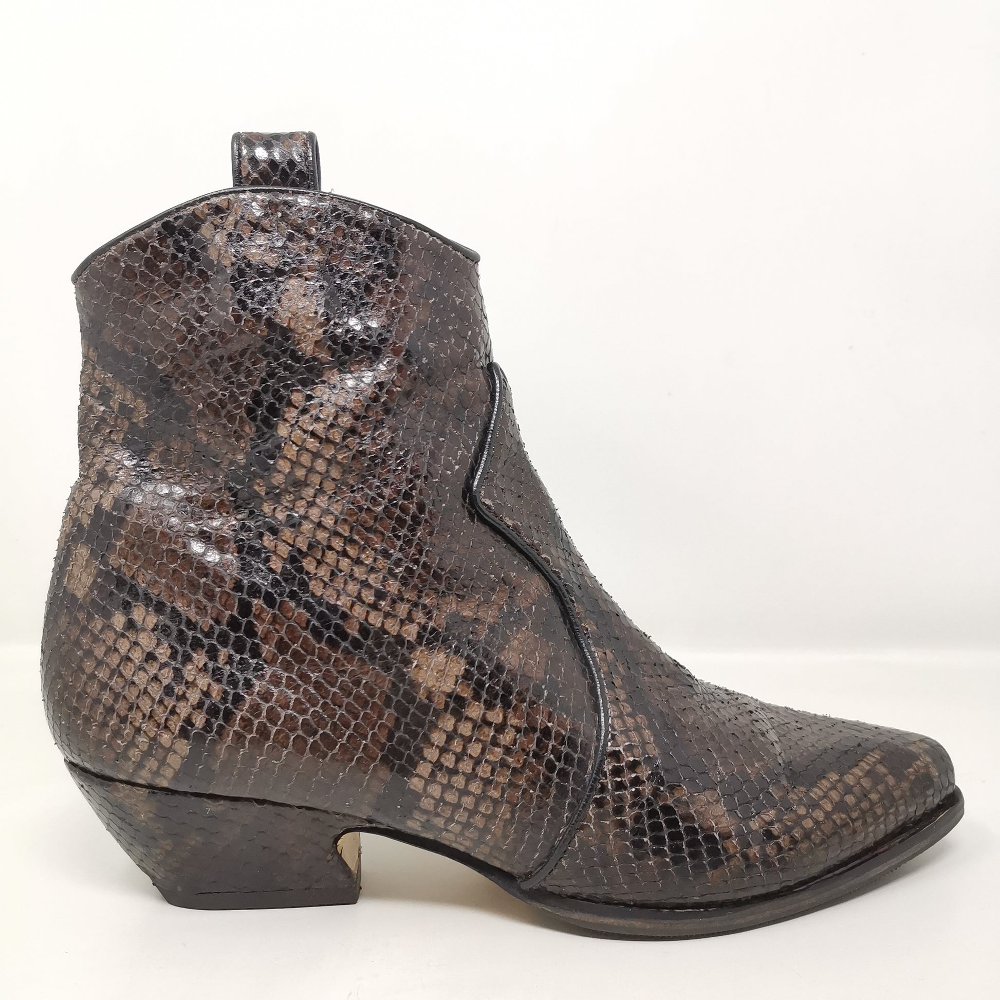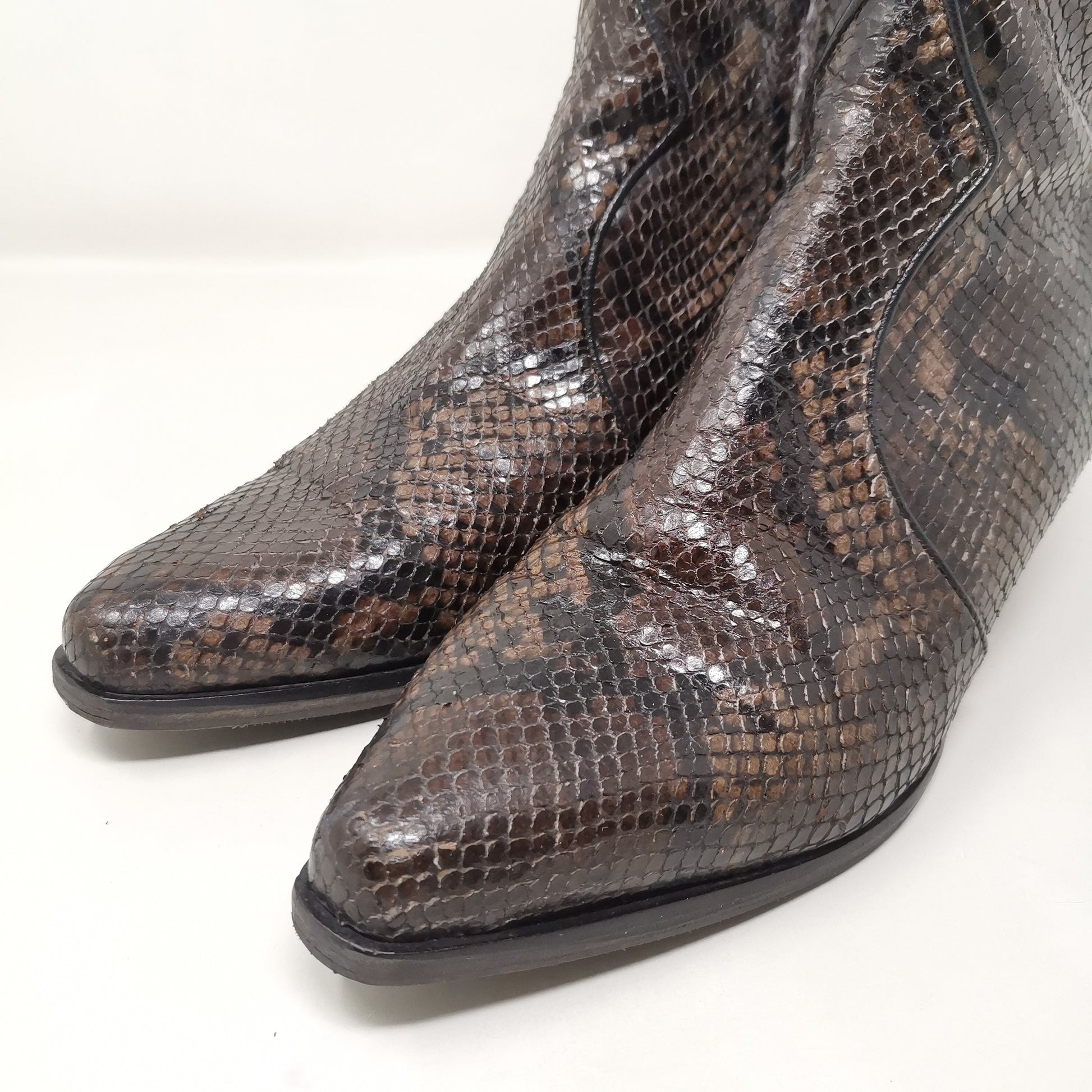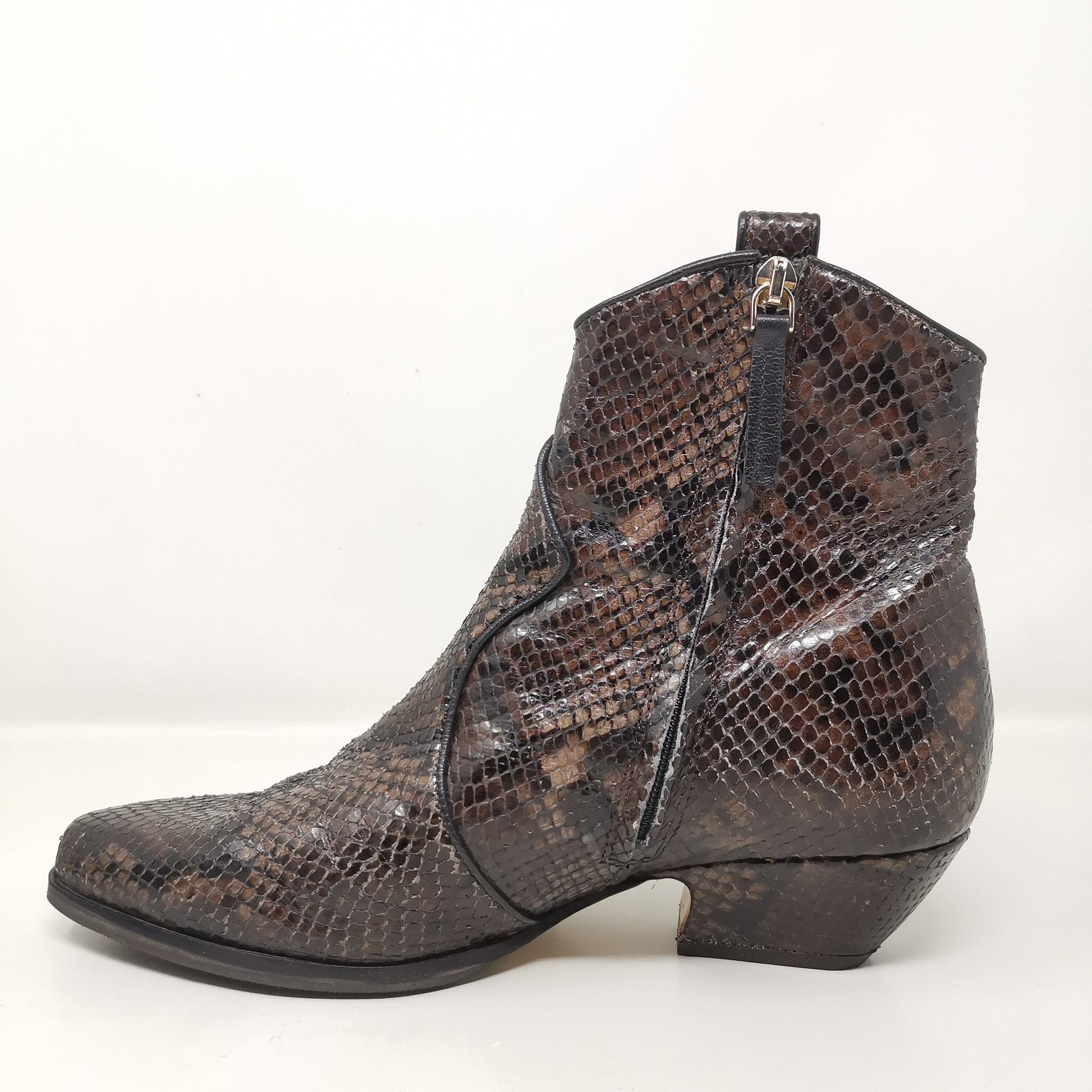 Brown reptile leather ankle boots with 4.5 cm high heel, leather insole and leather outsole covered with non-slip rubber. Side zip inside, there are some small marks on the leather part and soles and heels. Leg height 13 cm, leg width 11 cm. Size 38 EU.
