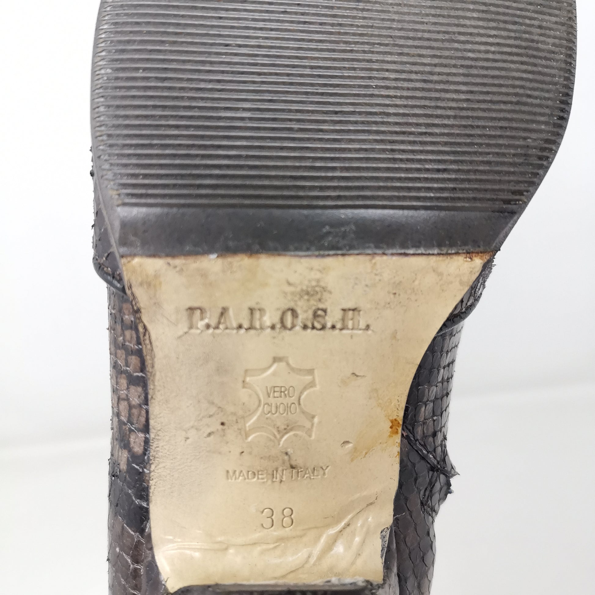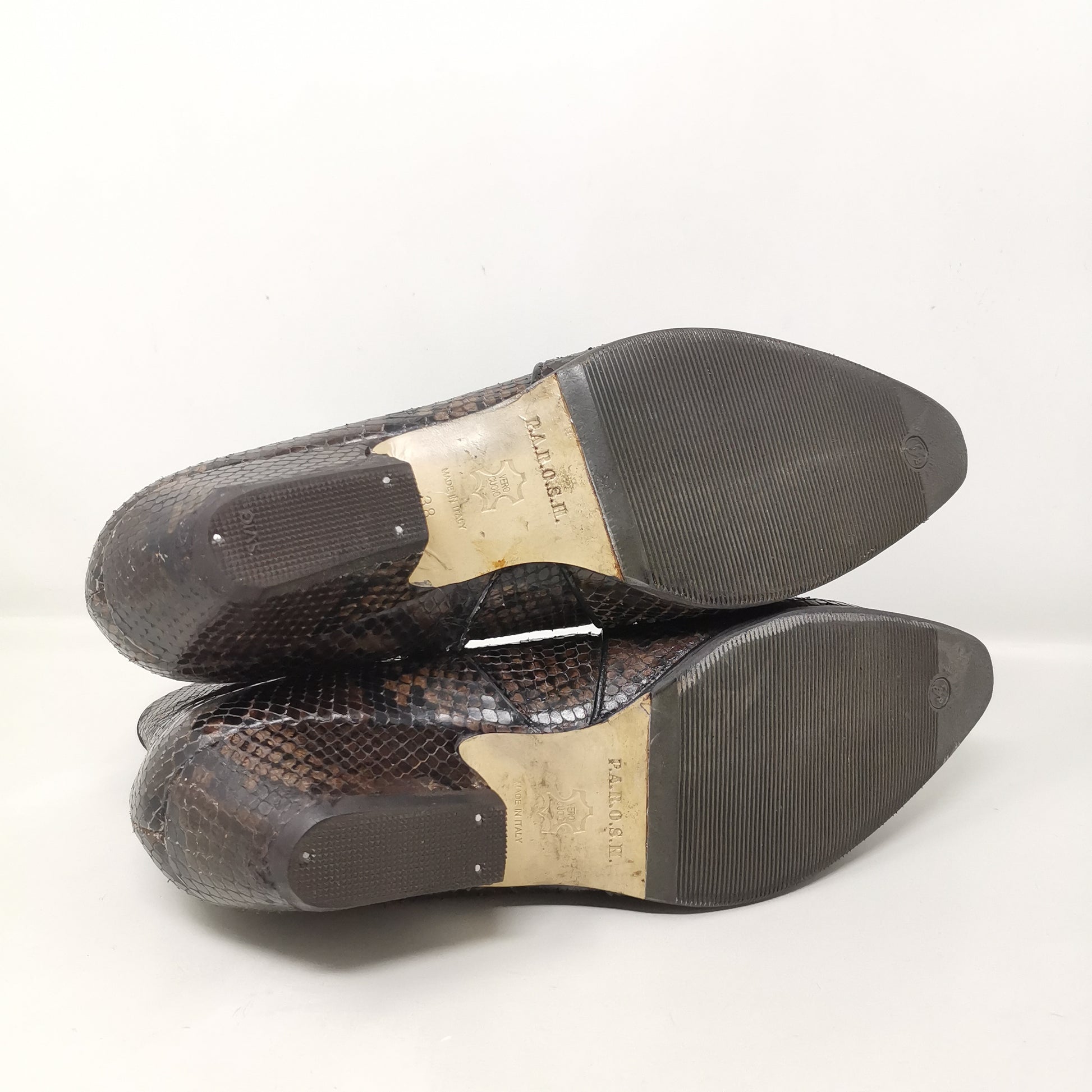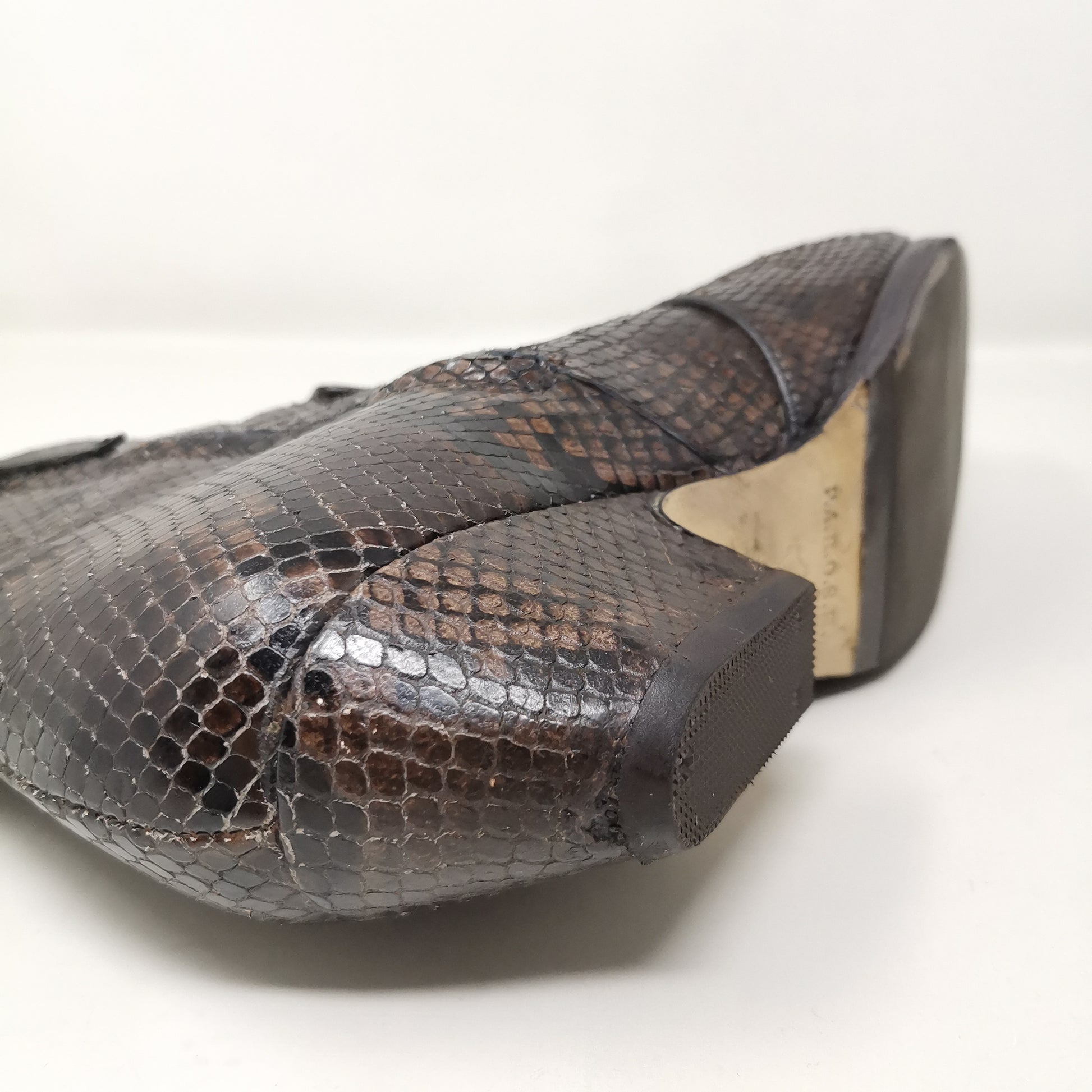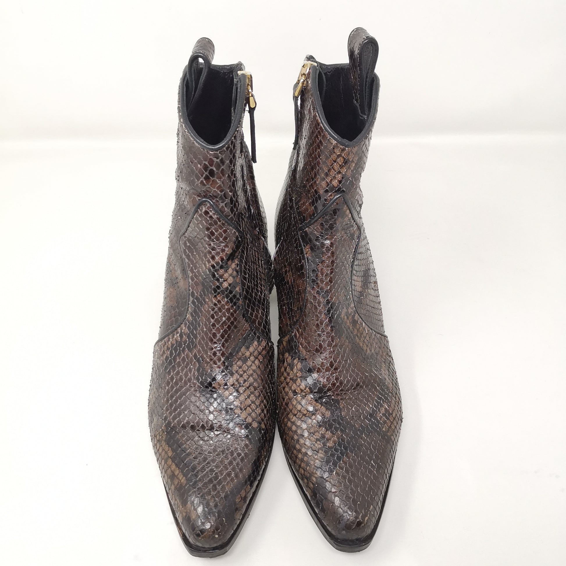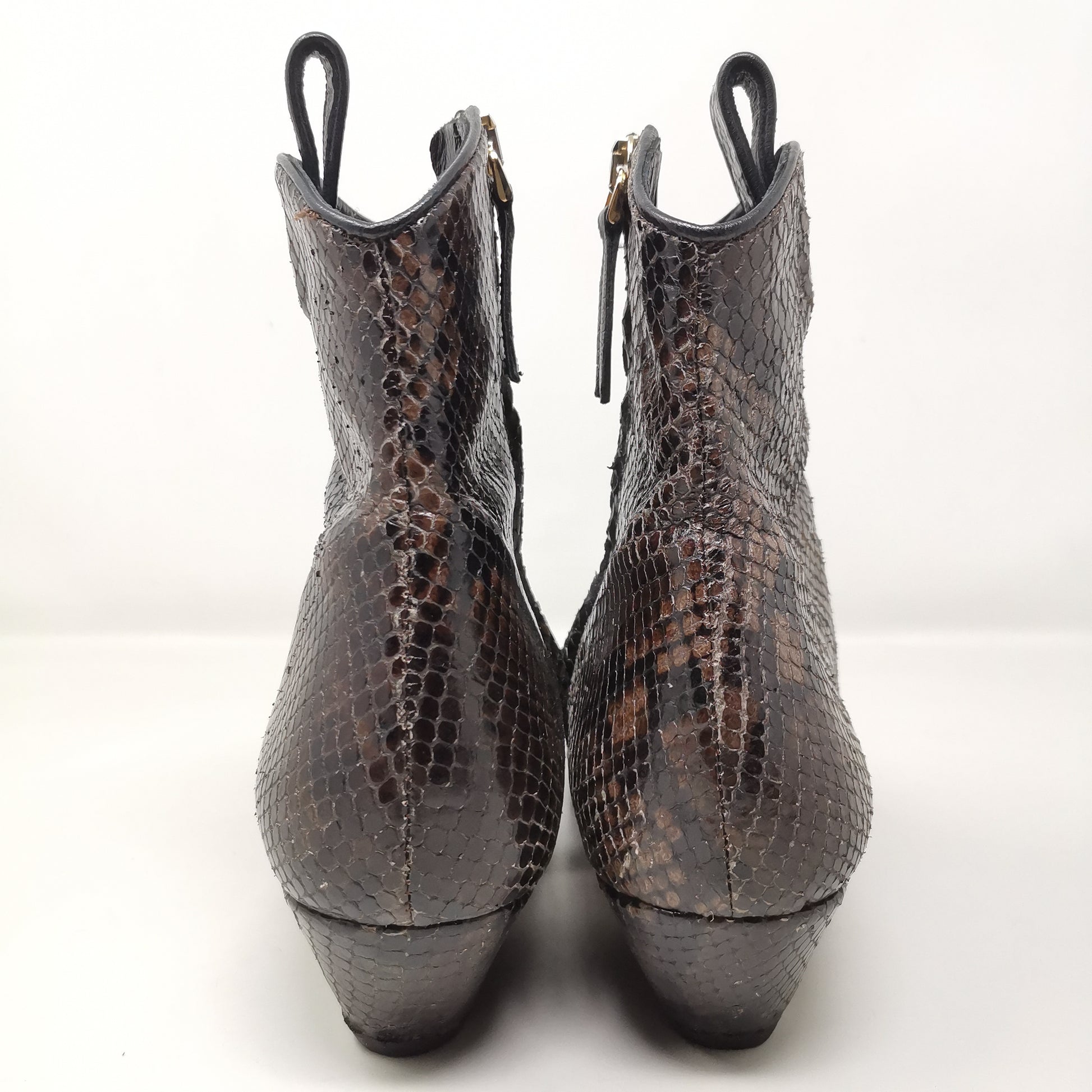 Brown reptile leather ankle boots with 4.5 cm high heel, leather insole and leather outsole covered with non-slip rubber. Side zip inside, there are some small marks on the leather part and soles and heels. Leg height 13 cm, leg width 11 cm. Size 38 EU.