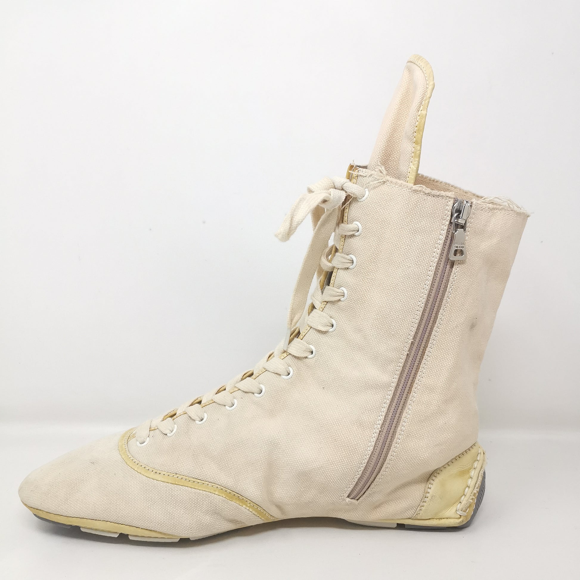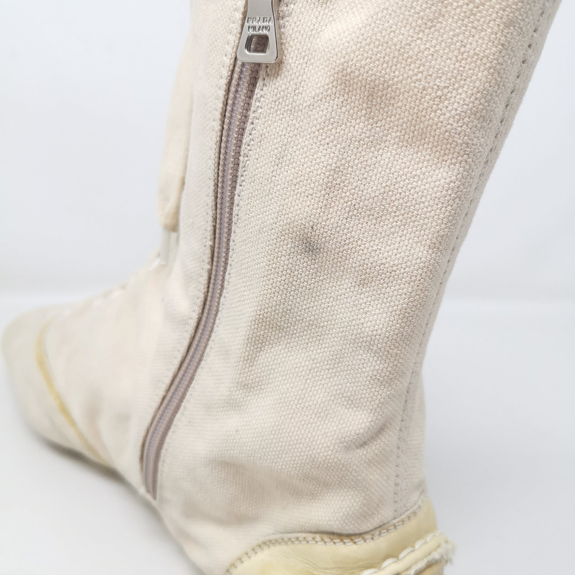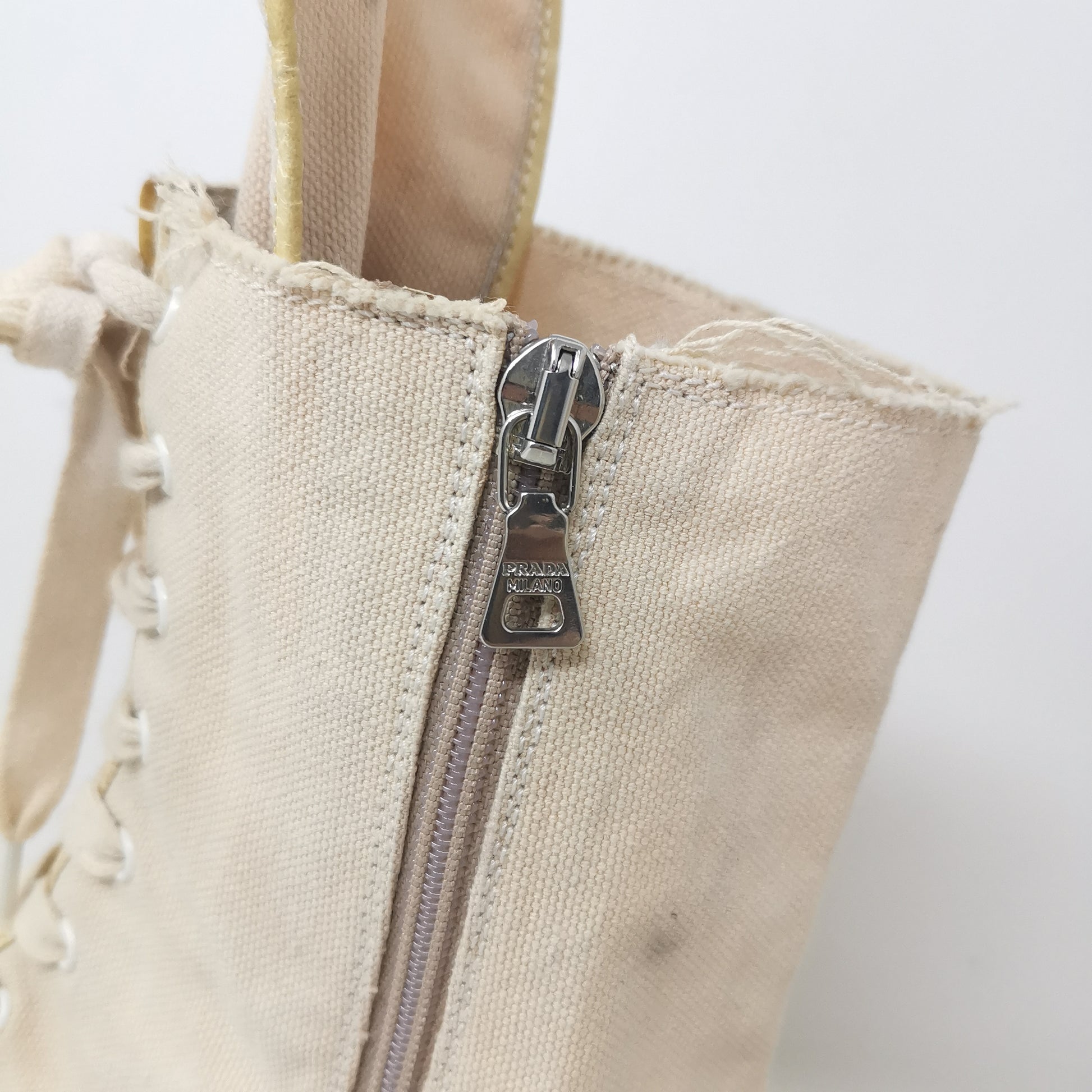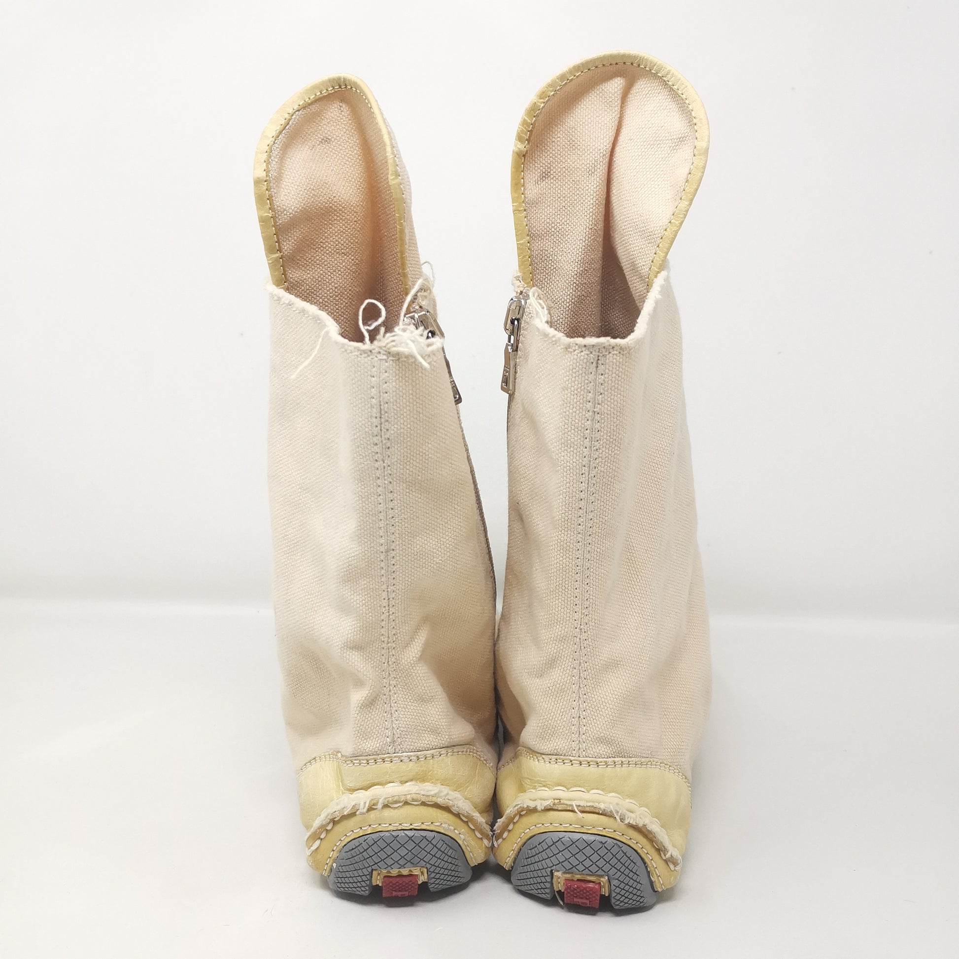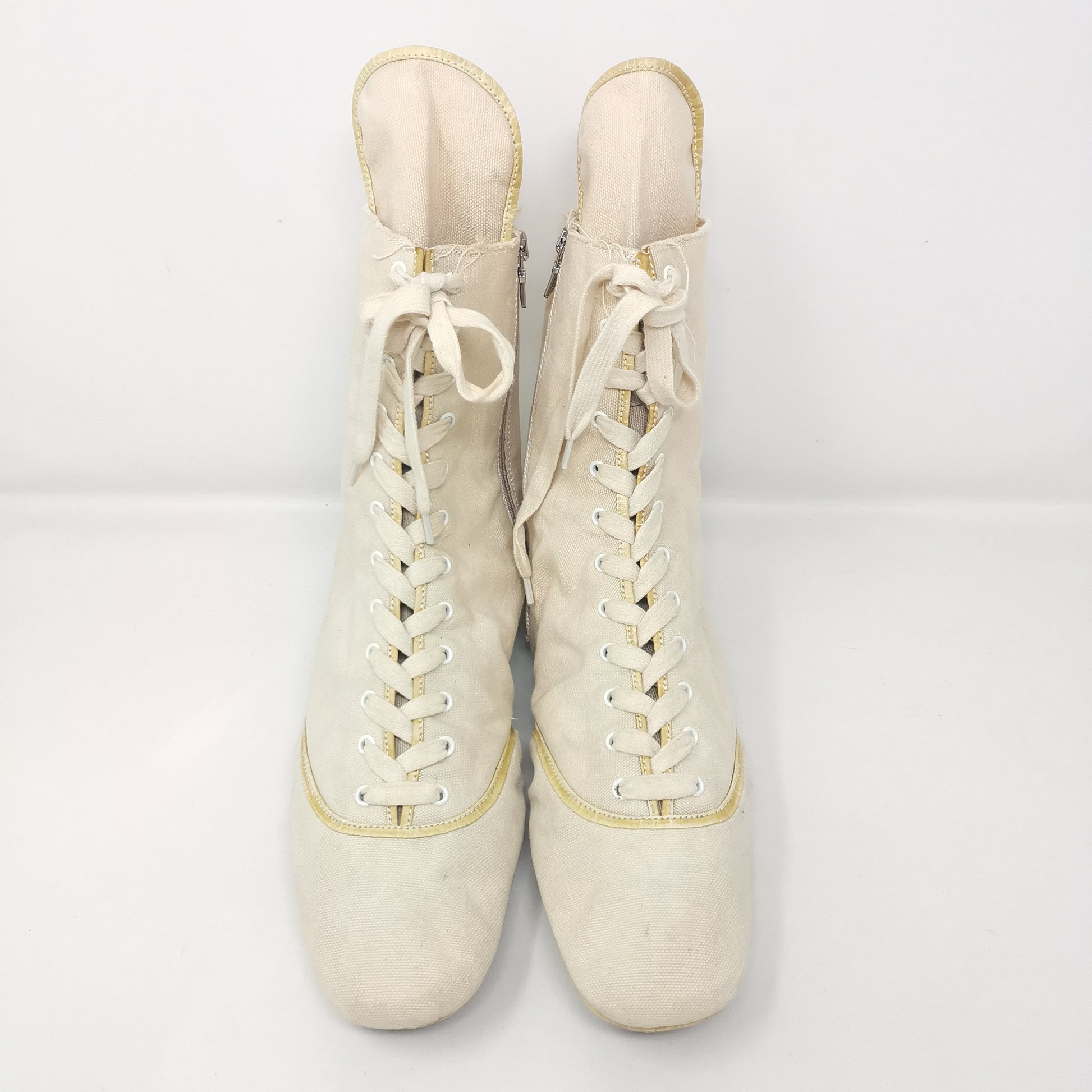 Canvas ankle boots with laces and internal side zip,leather insole and rubber external sole. There are some small halos and small dots on the fabric part in general and leather on the heels. Rare model, fit 40 EU. Leg height 15 cm, leg width 11 cm.