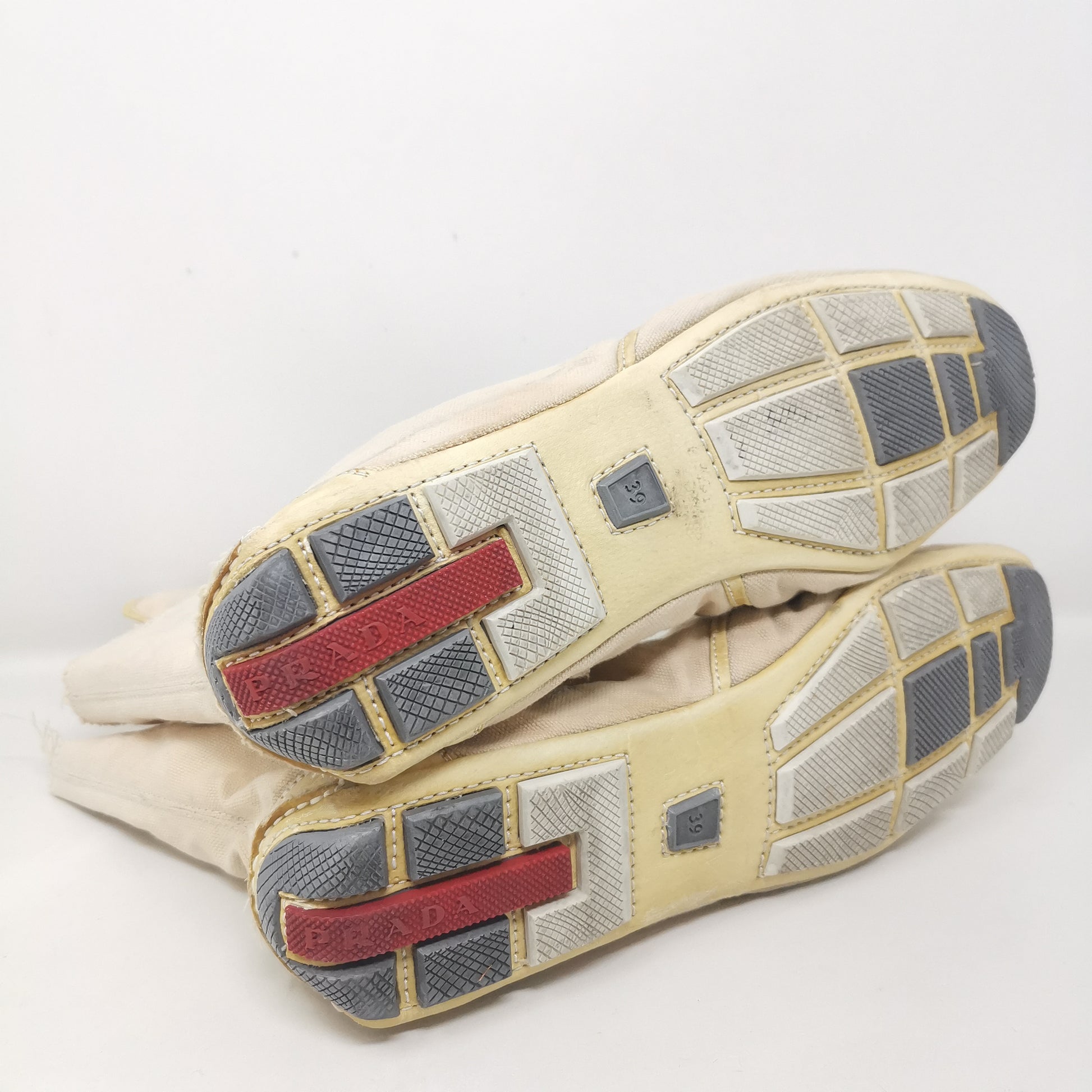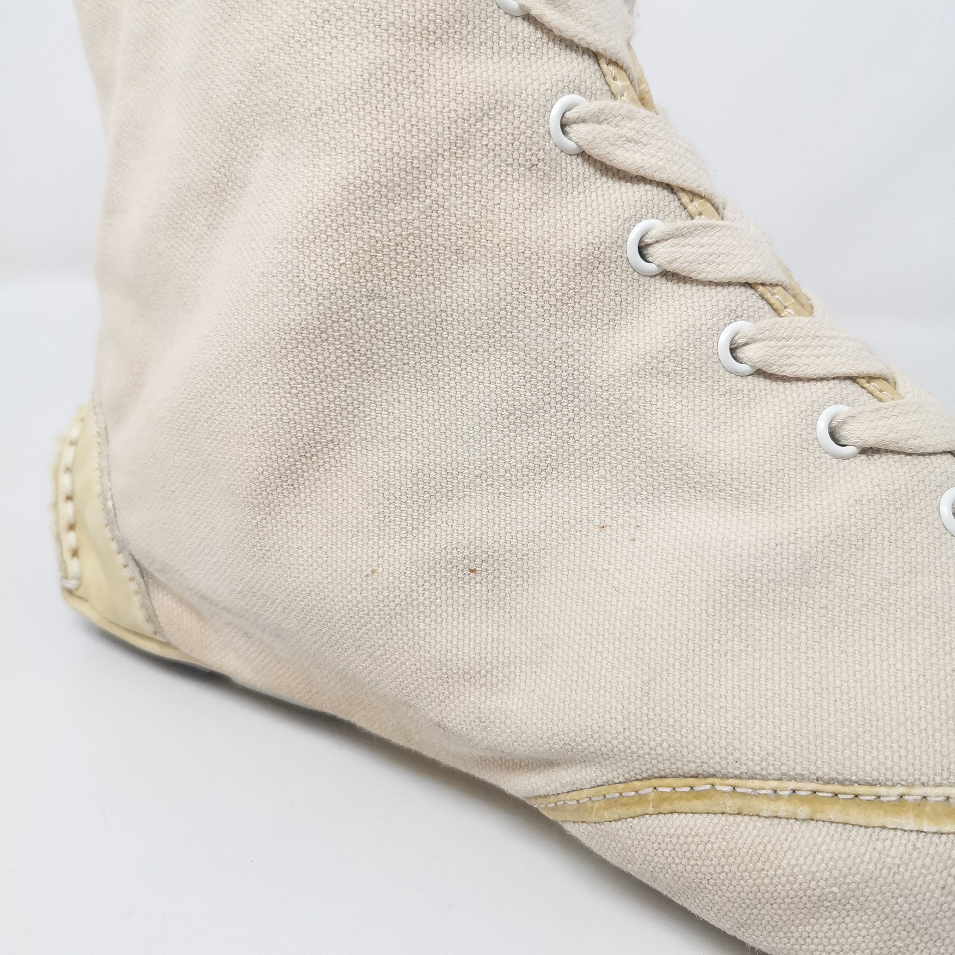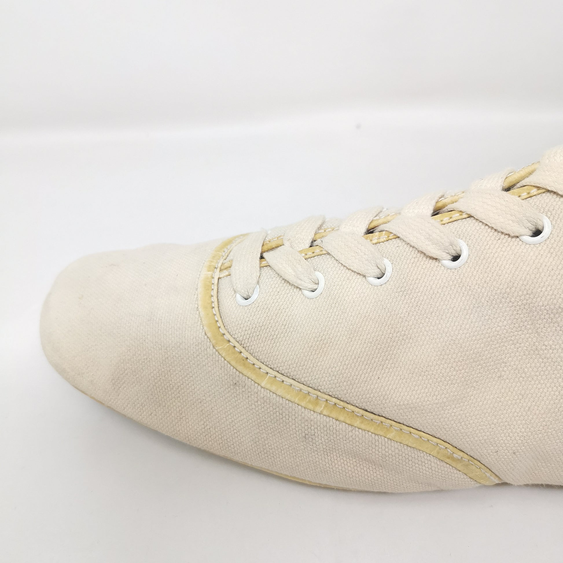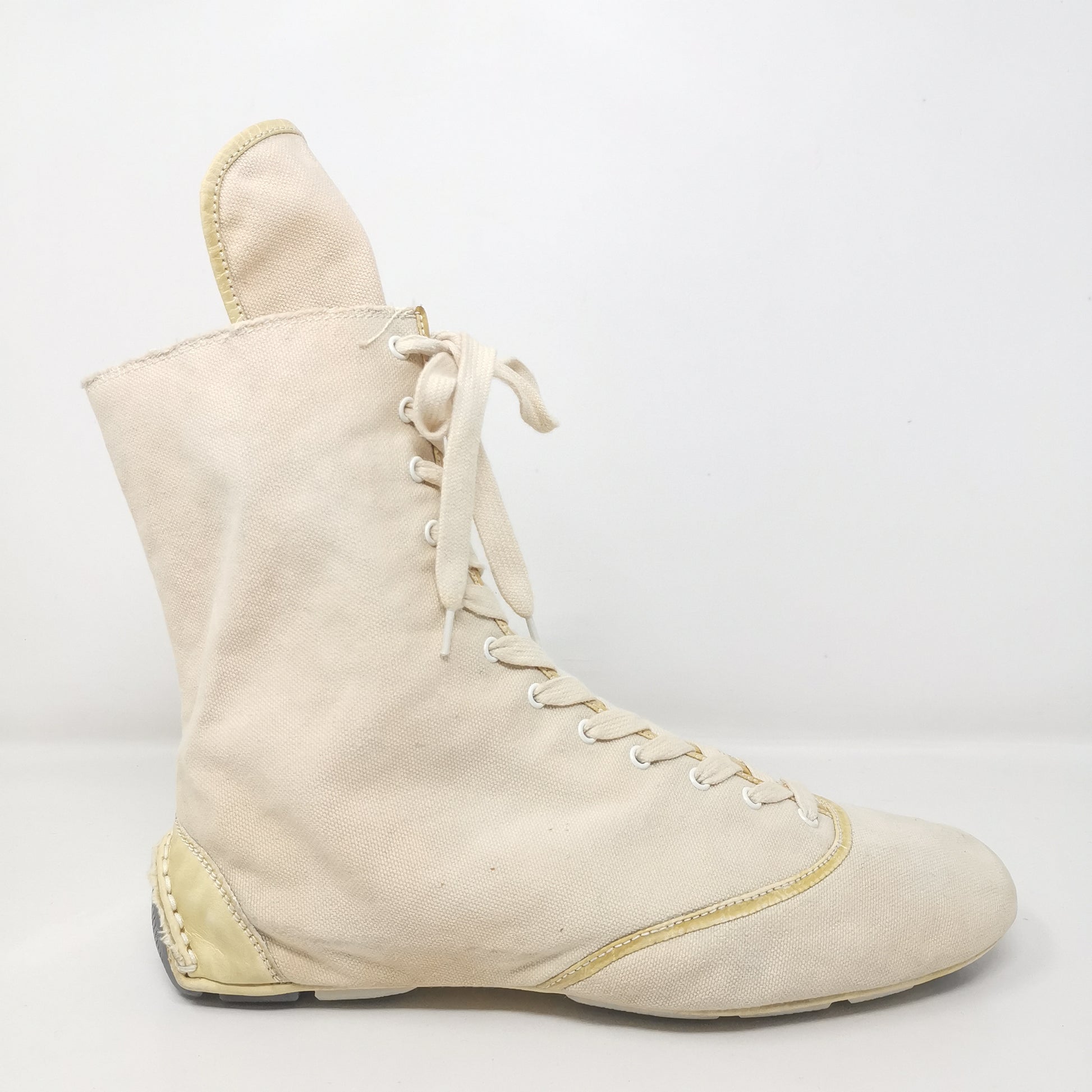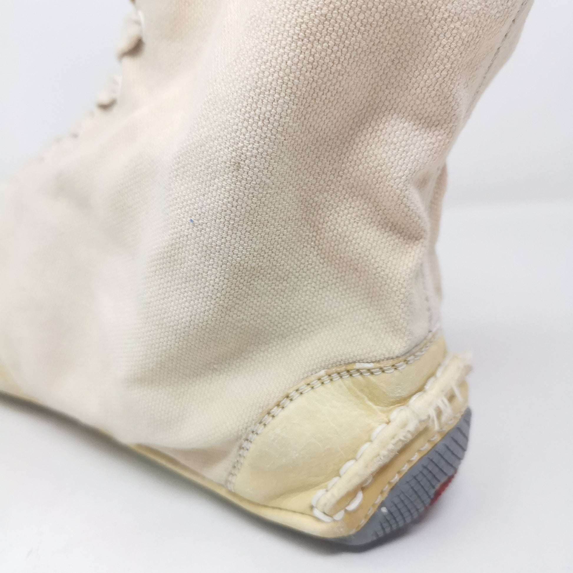 Canvas ankle boots with laces and internal side zip,leather insole and rubber external sole. There are some small halos and small dots on the fabric part in general and leather on the heels. Rare model, fit 40 EU. Leg height 15 cm, leg width 11 cm.