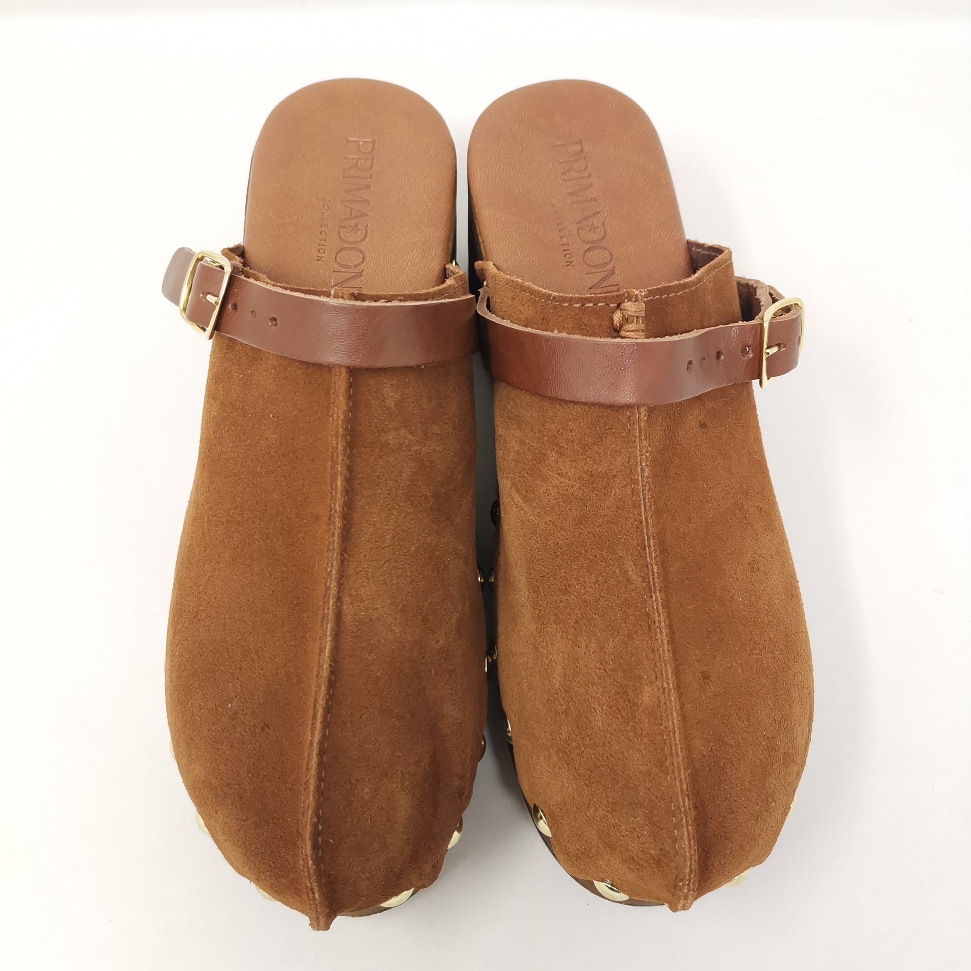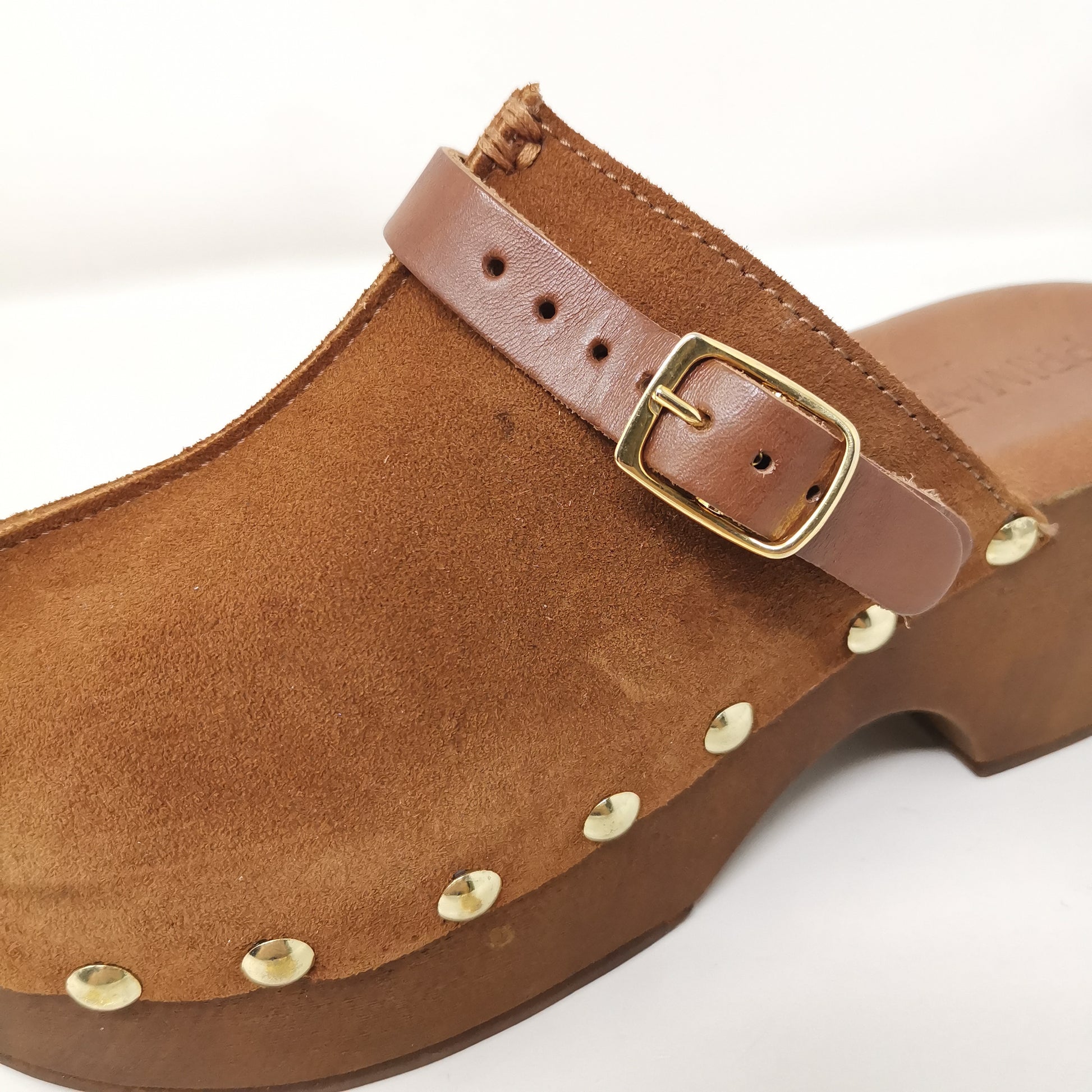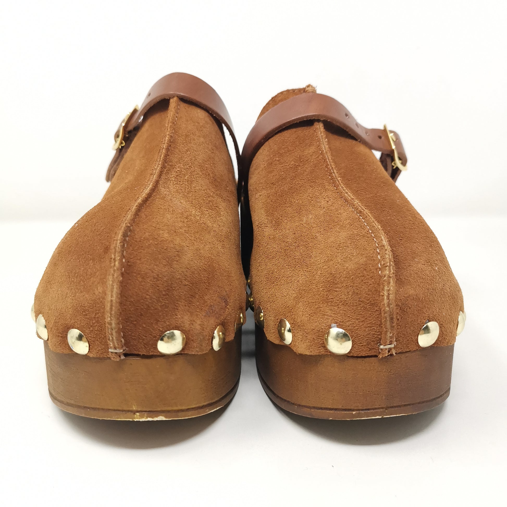Brown suede clogs with 6 cm high heel and 4 cm platform. Internal sole in eco leather and external rubber. Decorative buckle on the upper and metallic stitches on the sides. The insole measures 25cm. A few small marks. Size 39 EU.