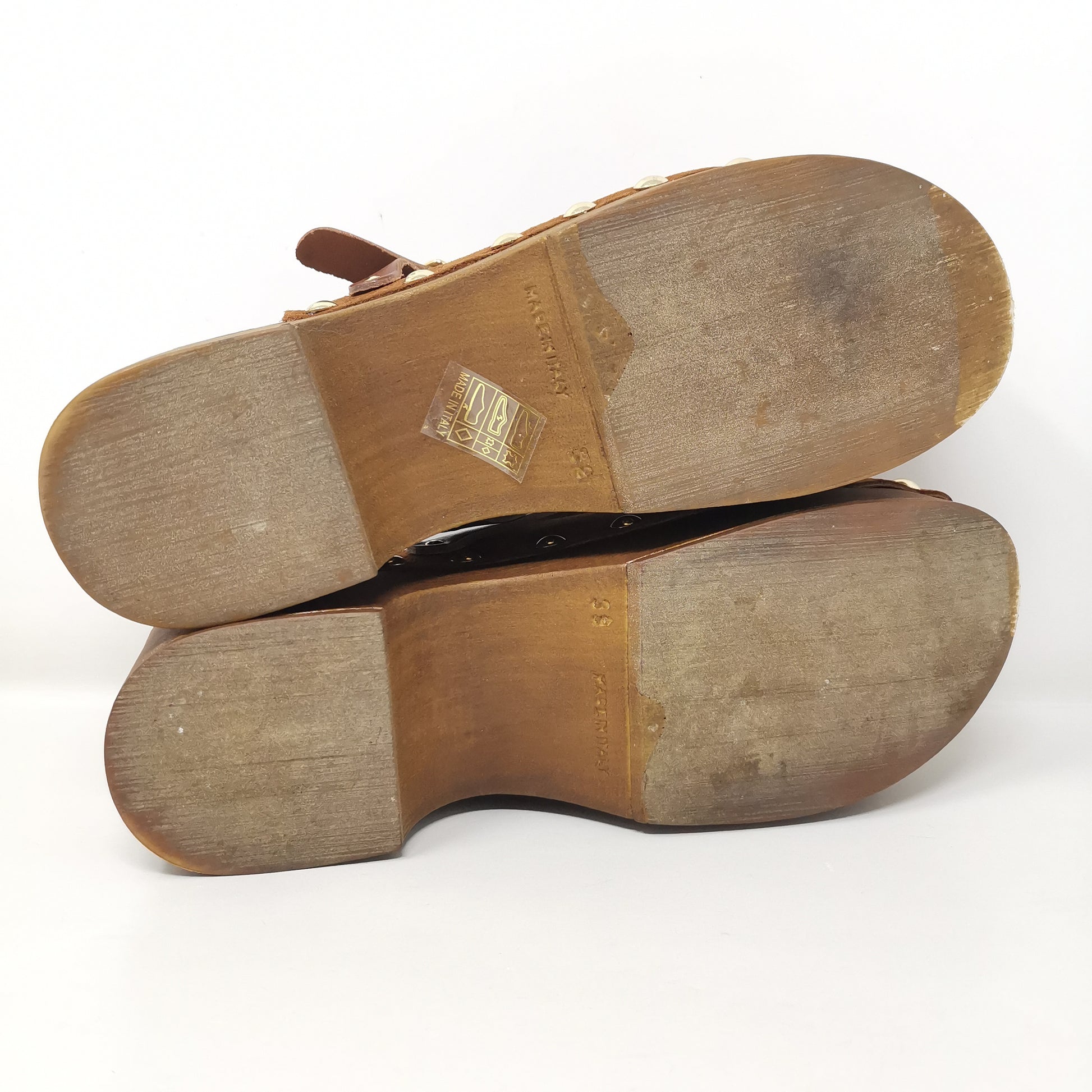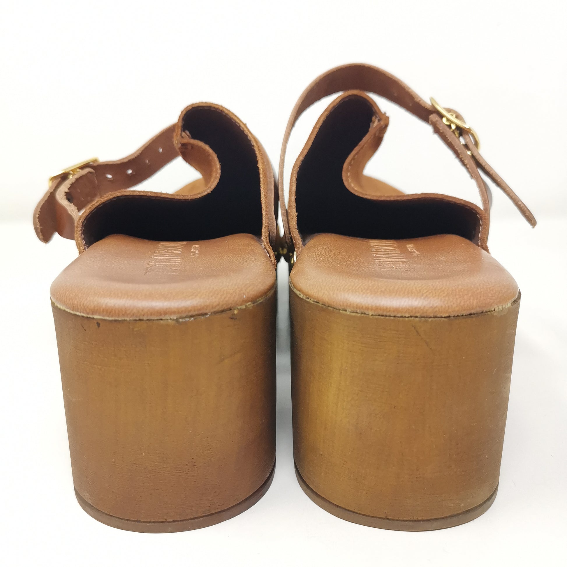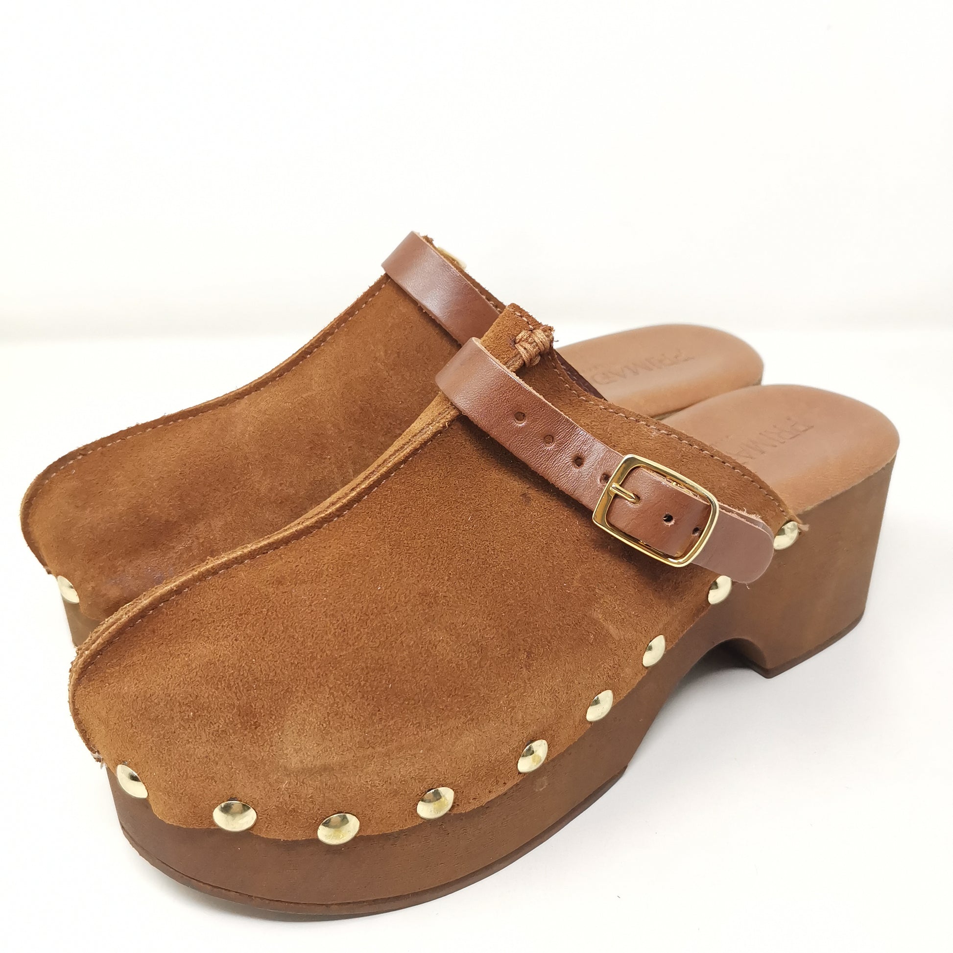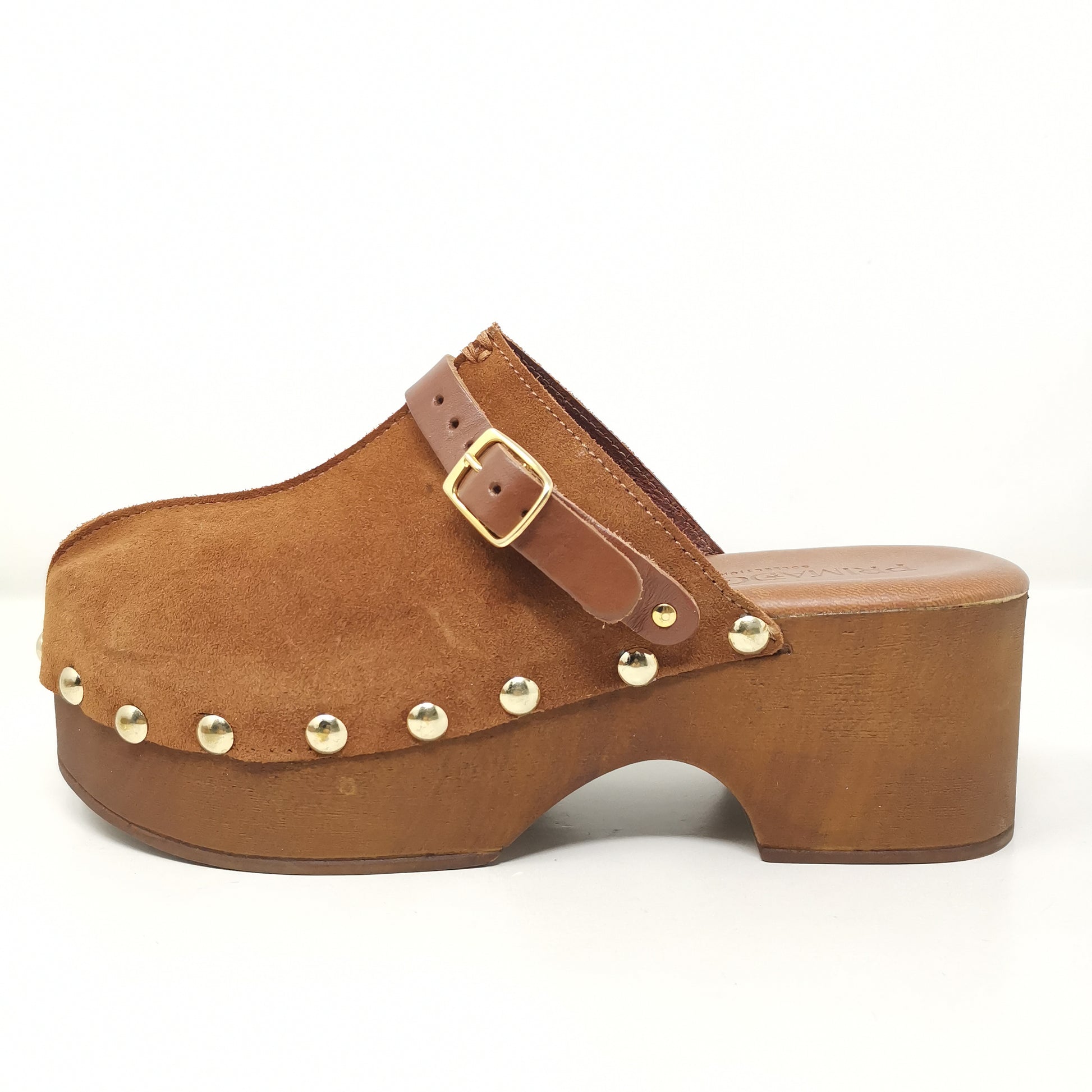 Brown suede clogs with 6 cm high heel and 4 cm platform. Internal sole in eco leather and external rubber. Decorative buckle on the upper and metallic stitches on the sides. The insole measures 25cm. A few small marks. Size 39 EU.