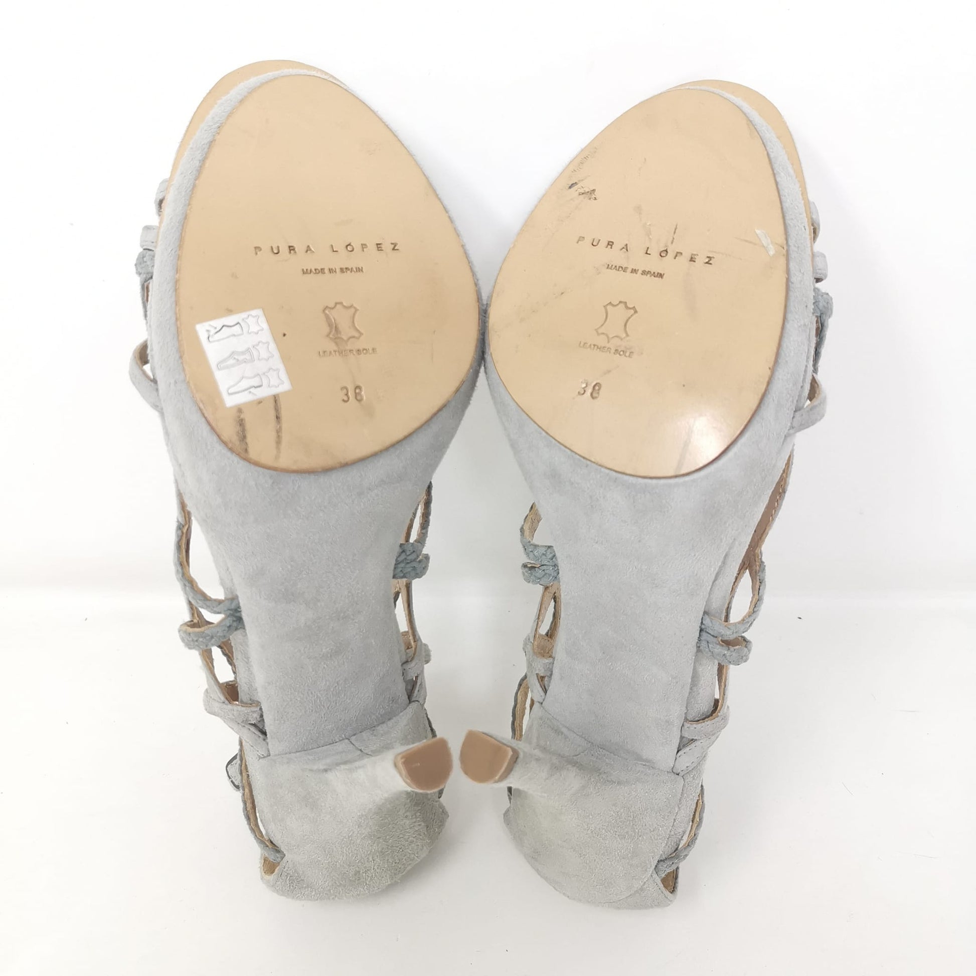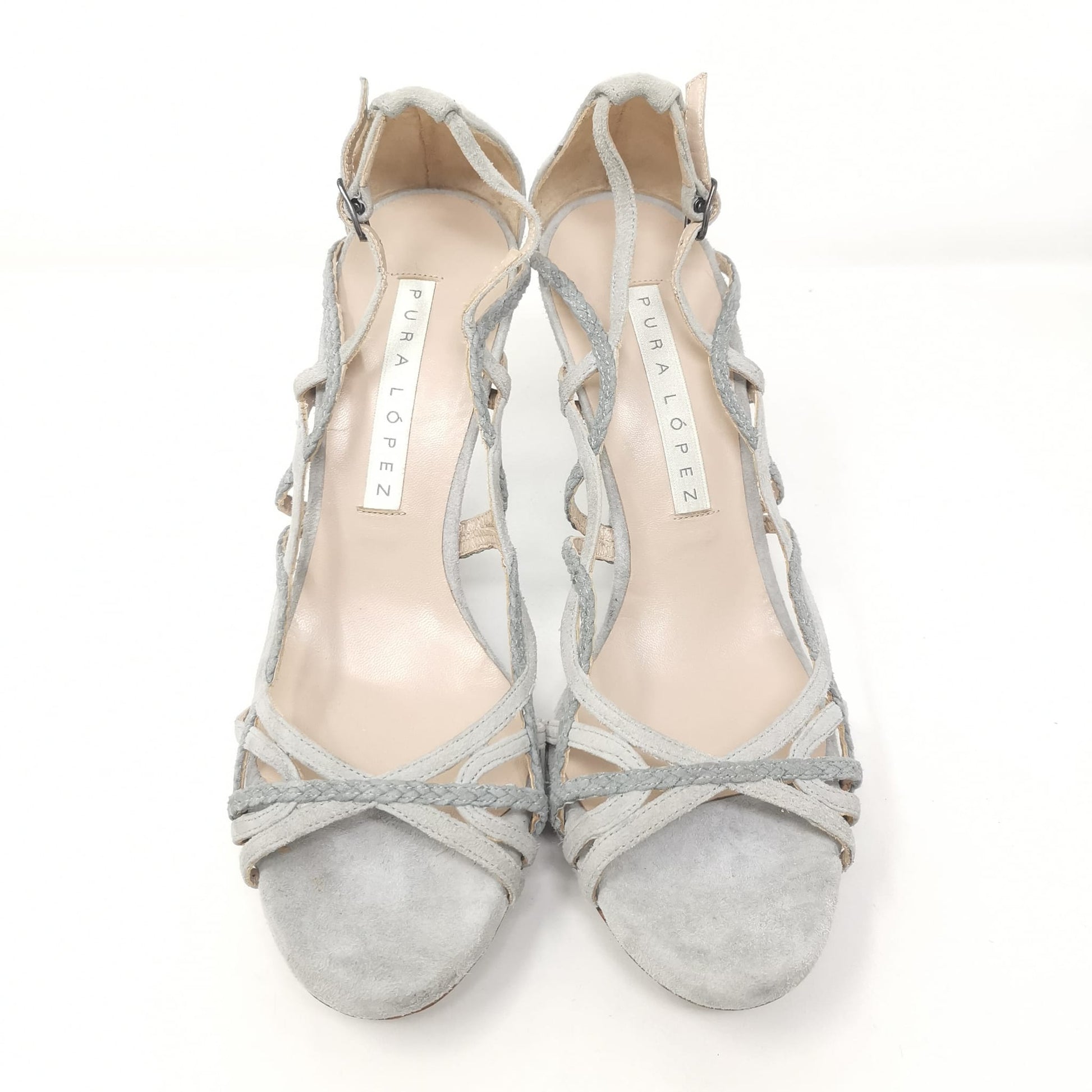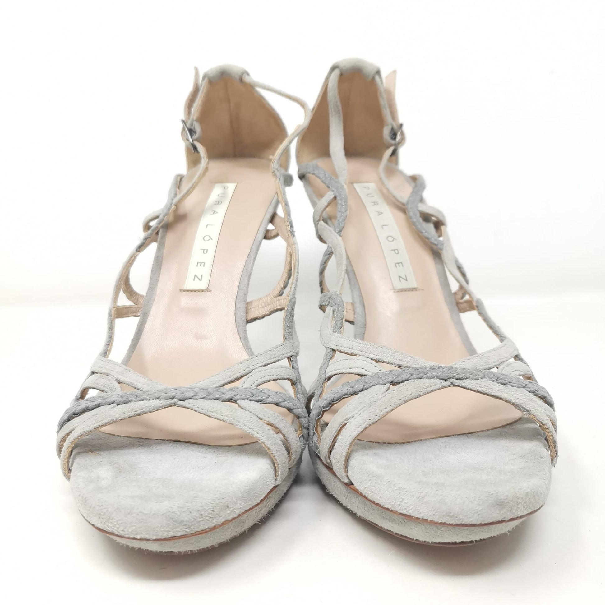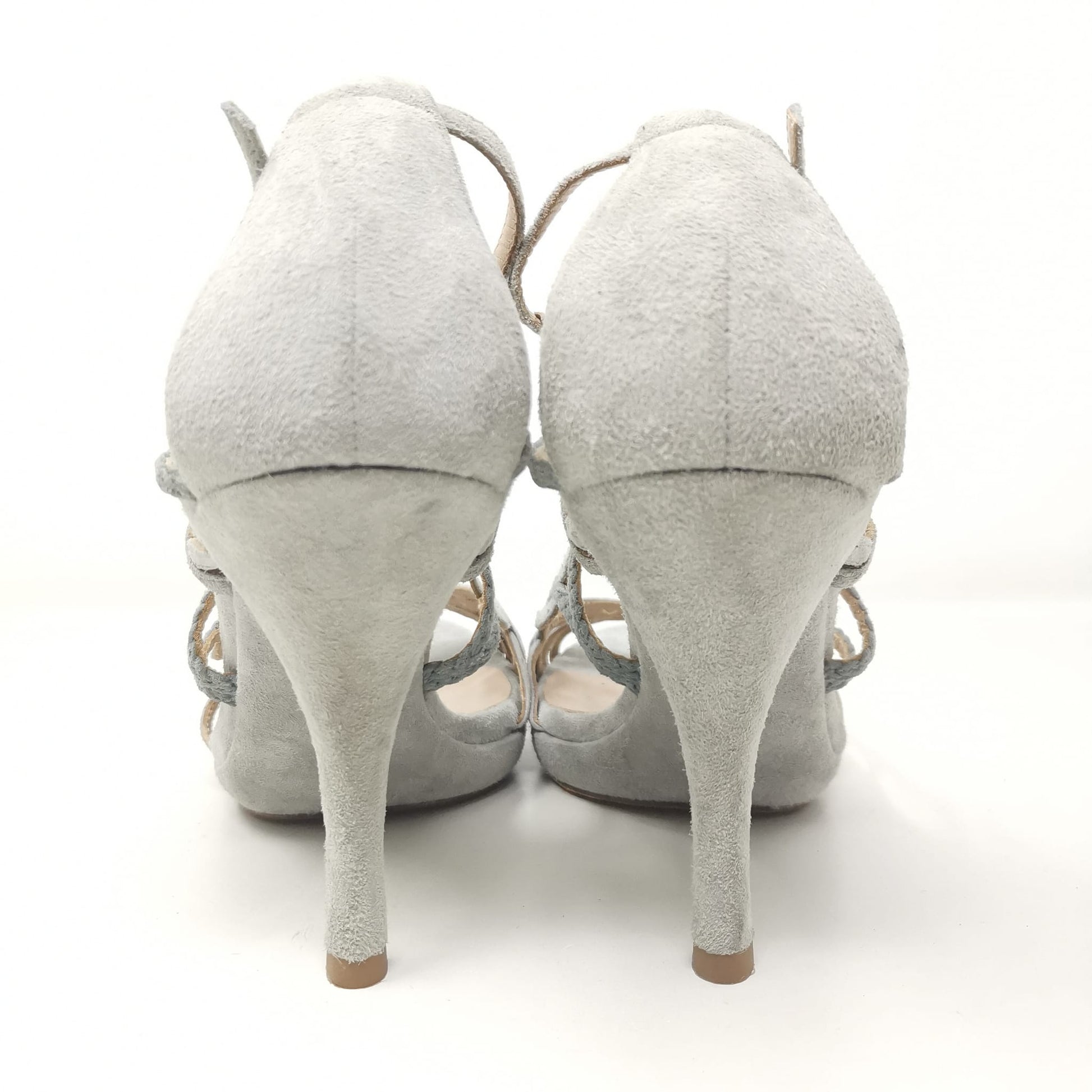 Grey/light blue suede sandals with 10.5 cm high heel and 1 cm platform. Adjustable ankle strap, the insole measures about 25 cm, leather outsole. A few small marks, excellent condition. Size 38 EU.