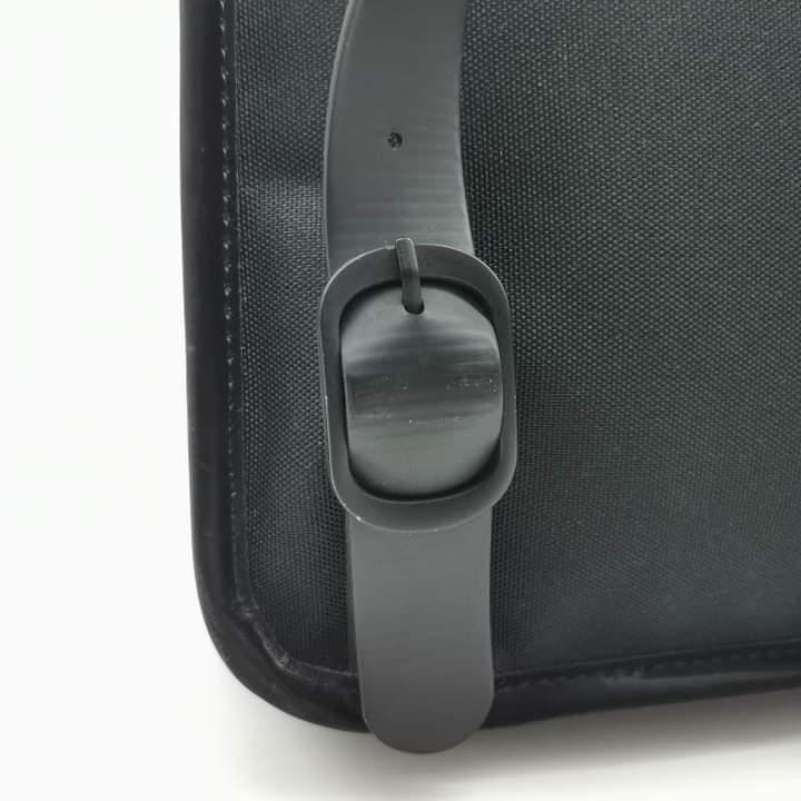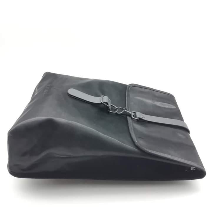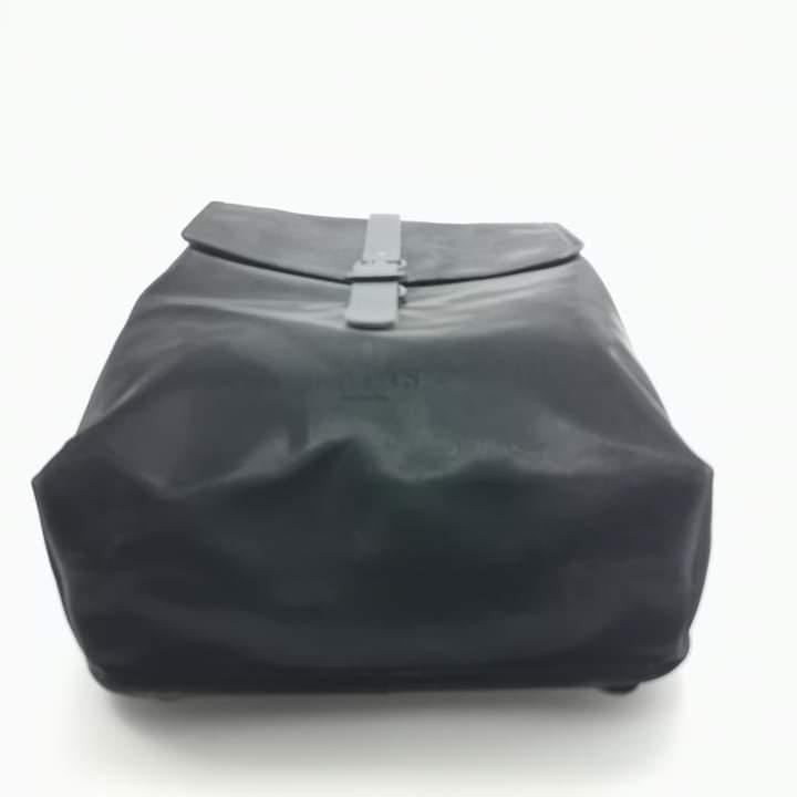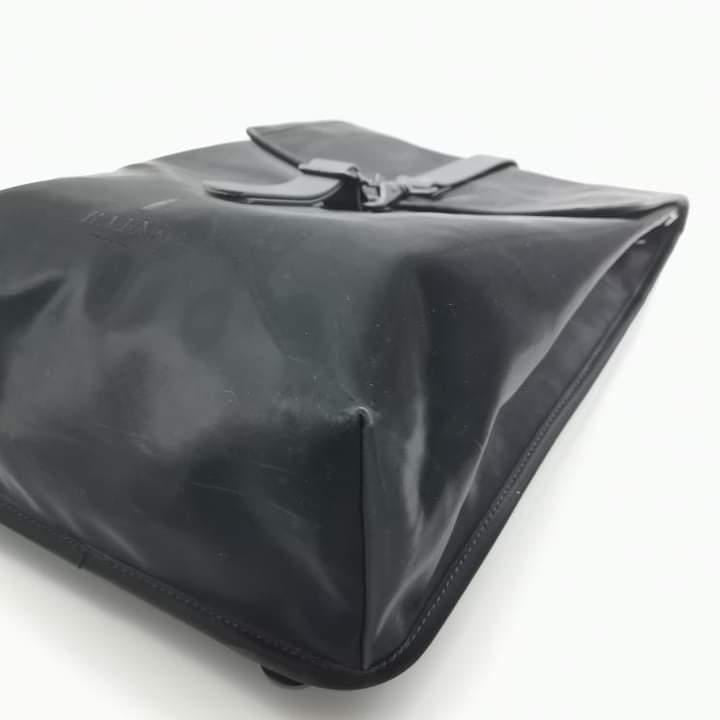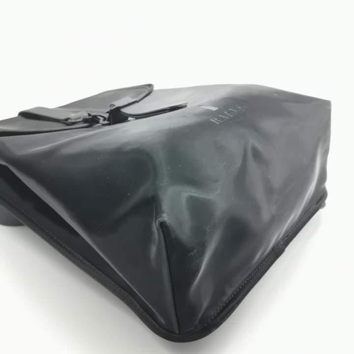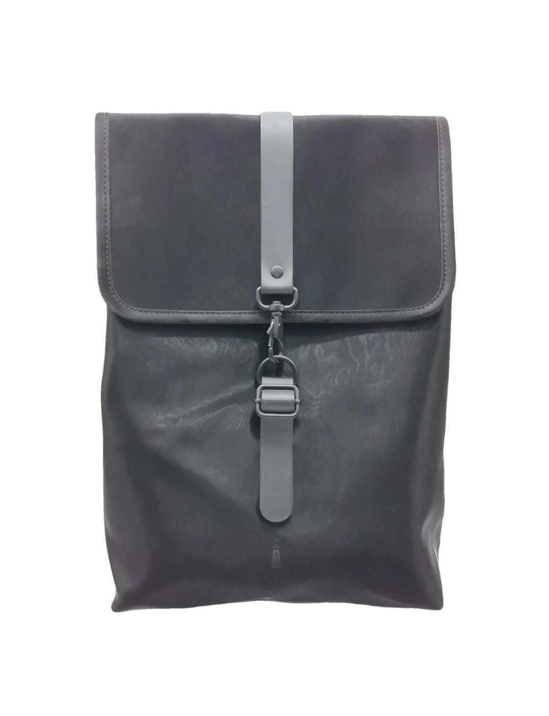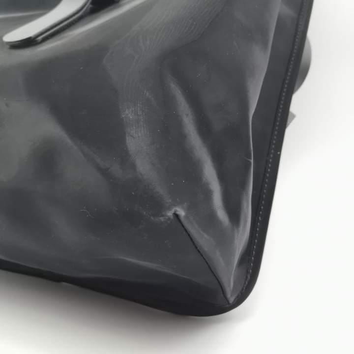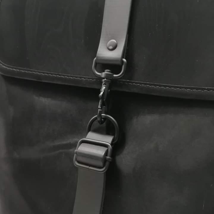 Black waterproof synthetic fabric backpack with adjustable straps, flap closure and carabiner strap. Fabric interior with laptop pocket. A few small marks.