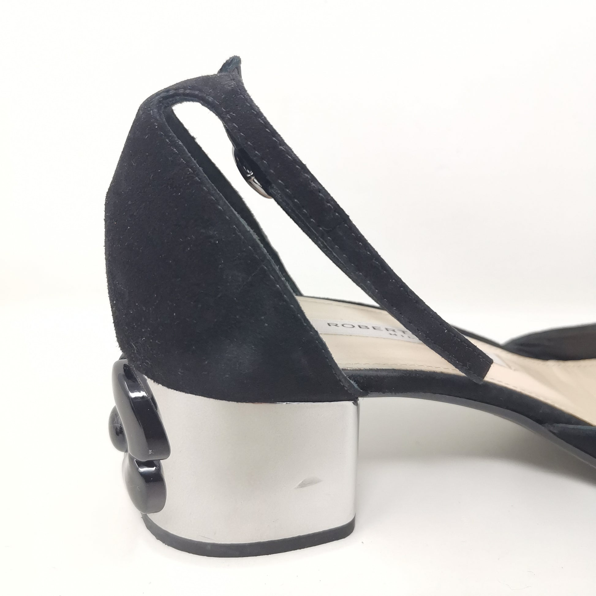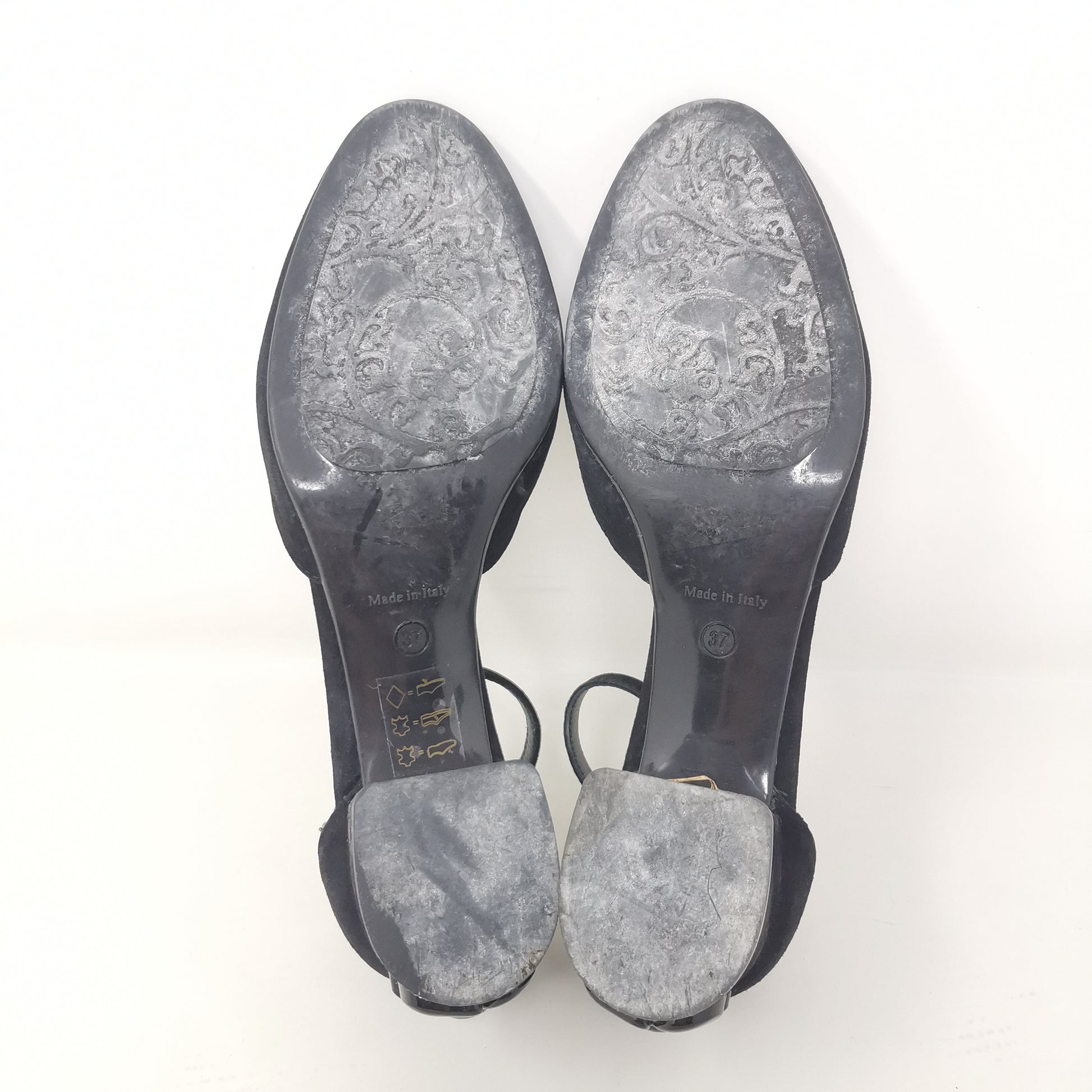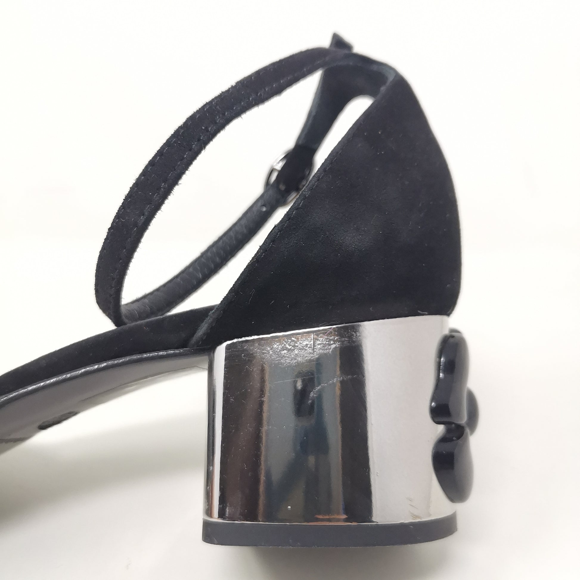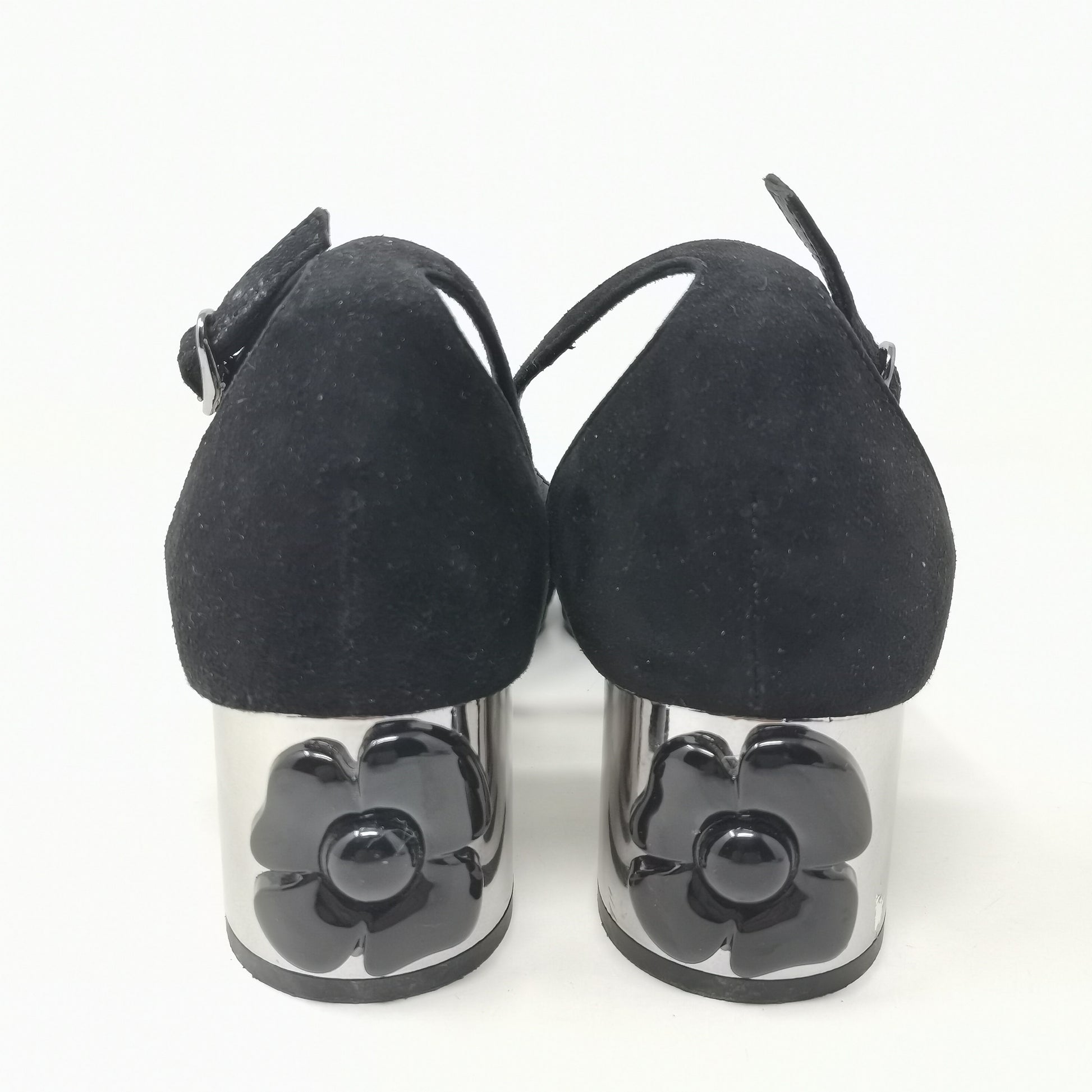 Black suede pumps with 4.5 cm high mirrored heel with embossed black flower decoration, adjustable ankle strap and inner sole in leather and outer sole in rubber. Present some small on heels and inner and outer soles. Size 37 EU.