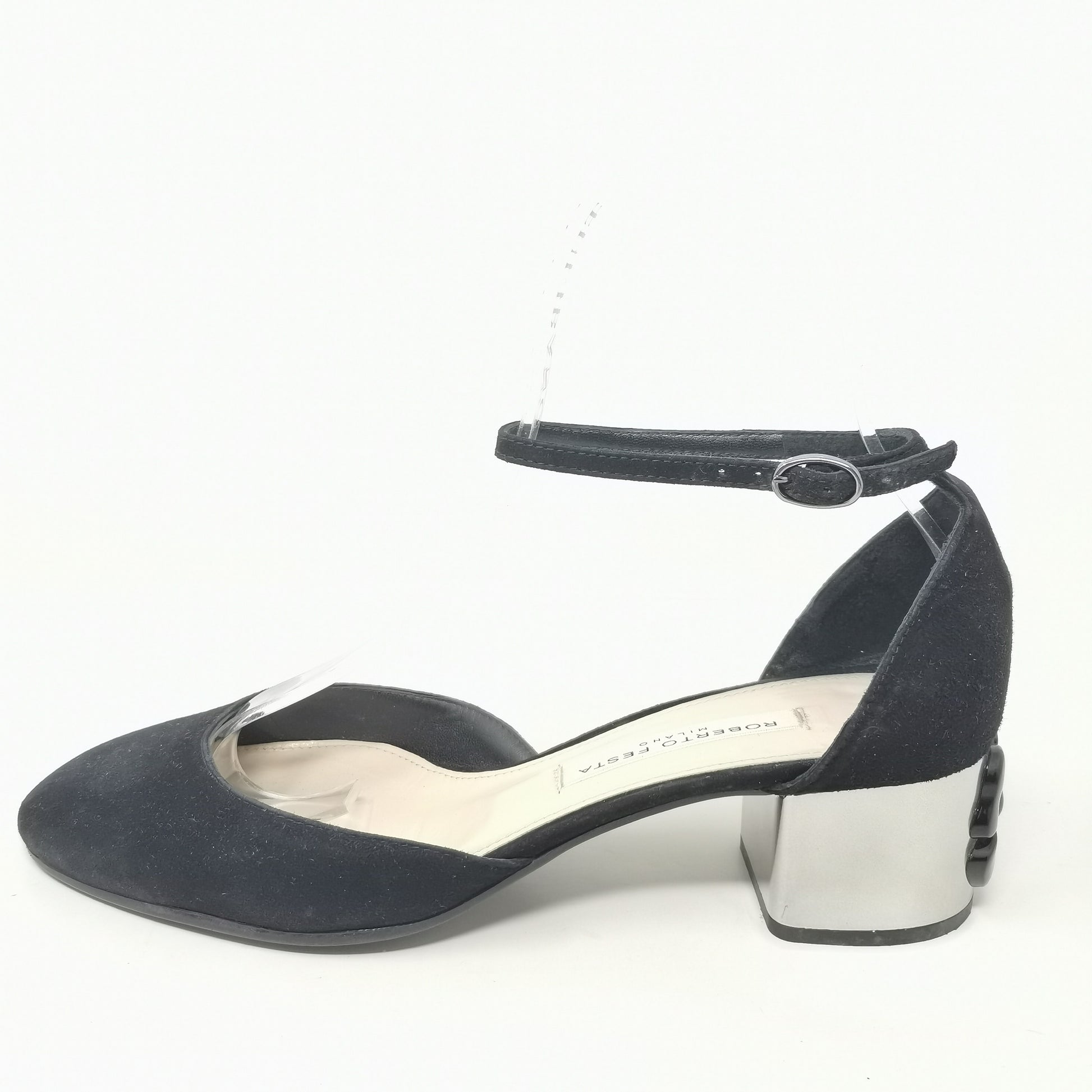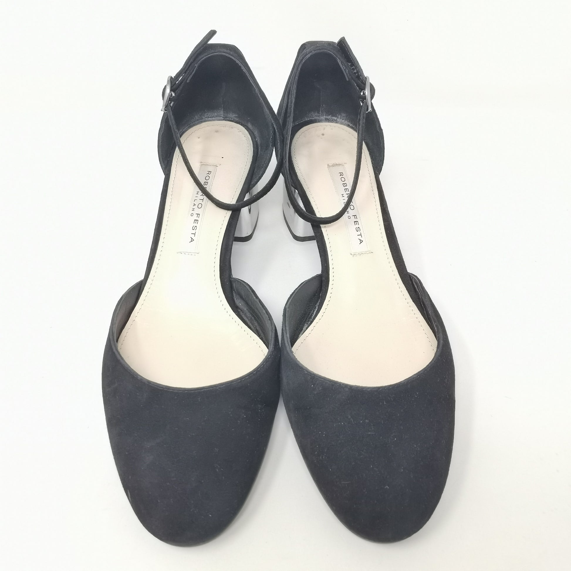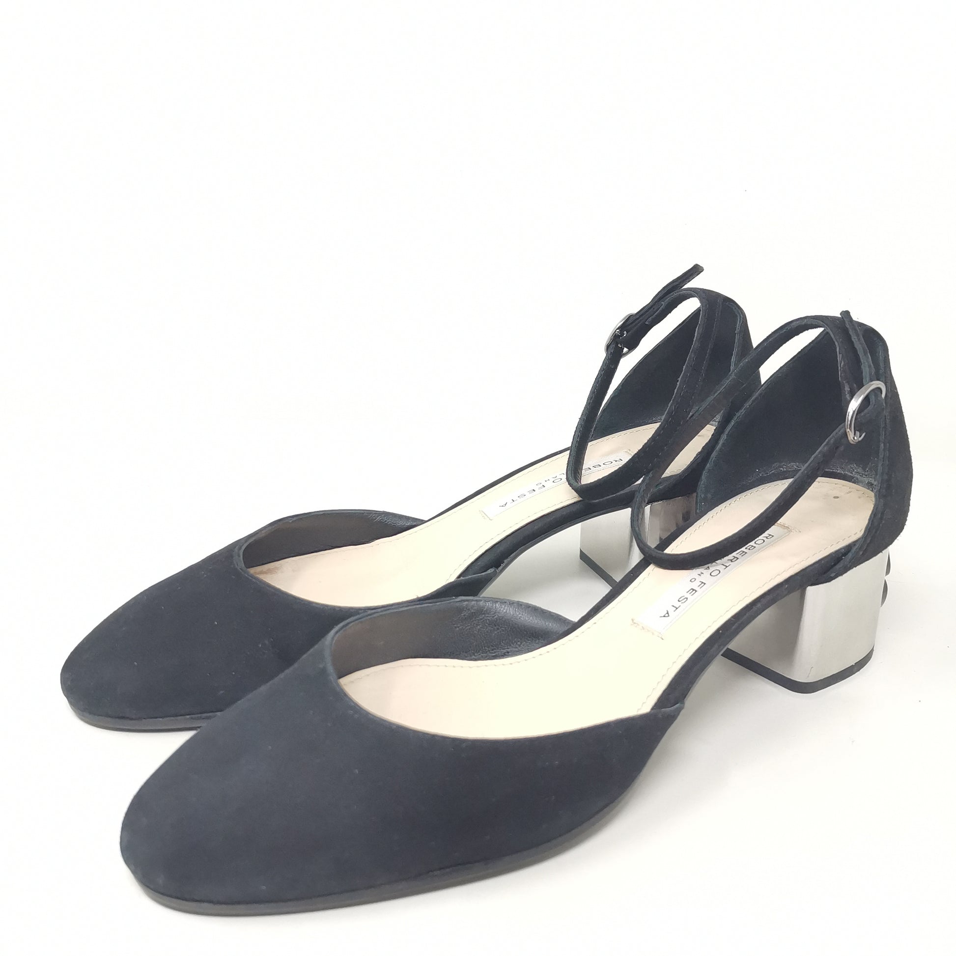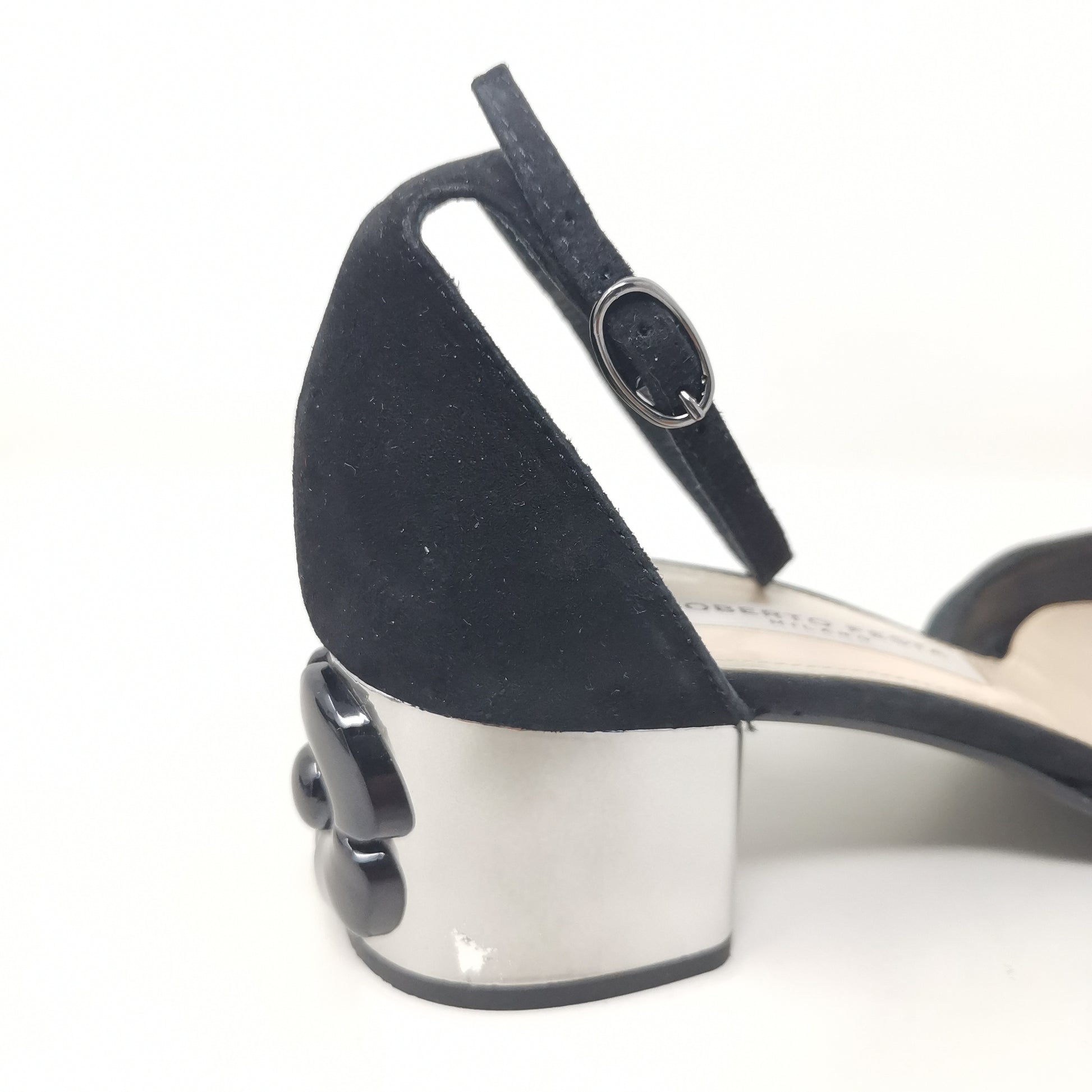 Black suede pumps with 4.5 cm high mirrored heel with embossed black flower decoration, adjustable ankle strap and inner sole in leather and outer sole in rubber. Present some small on heels and inner and outer soles. Size 37 EU.