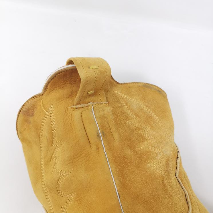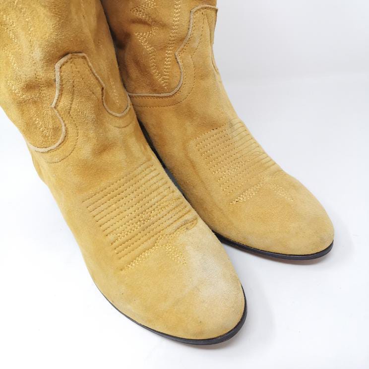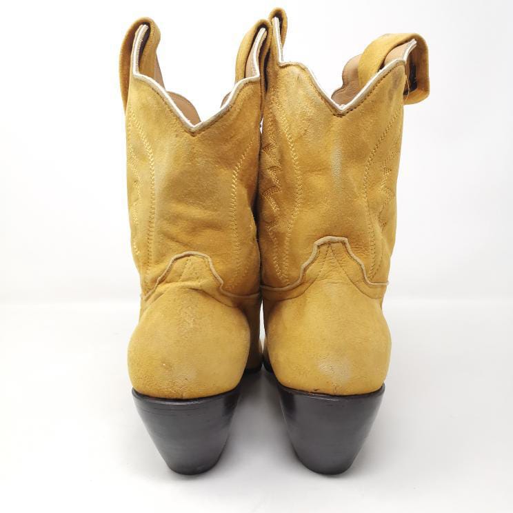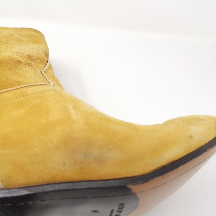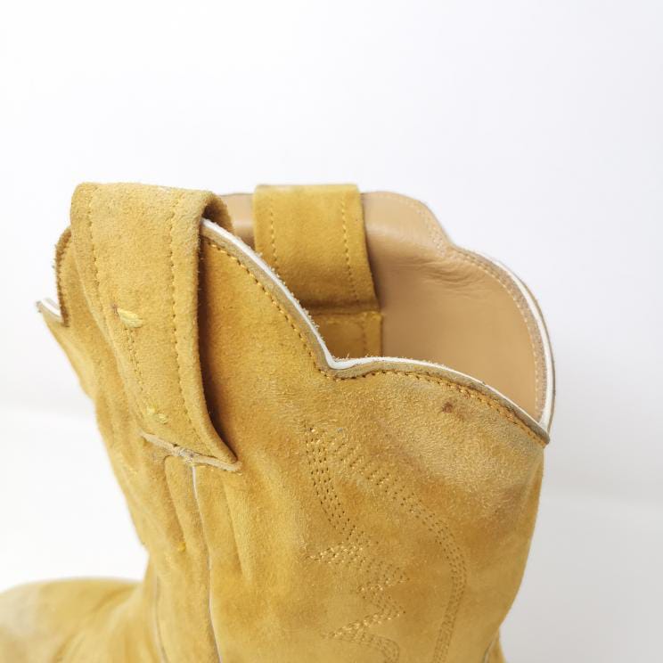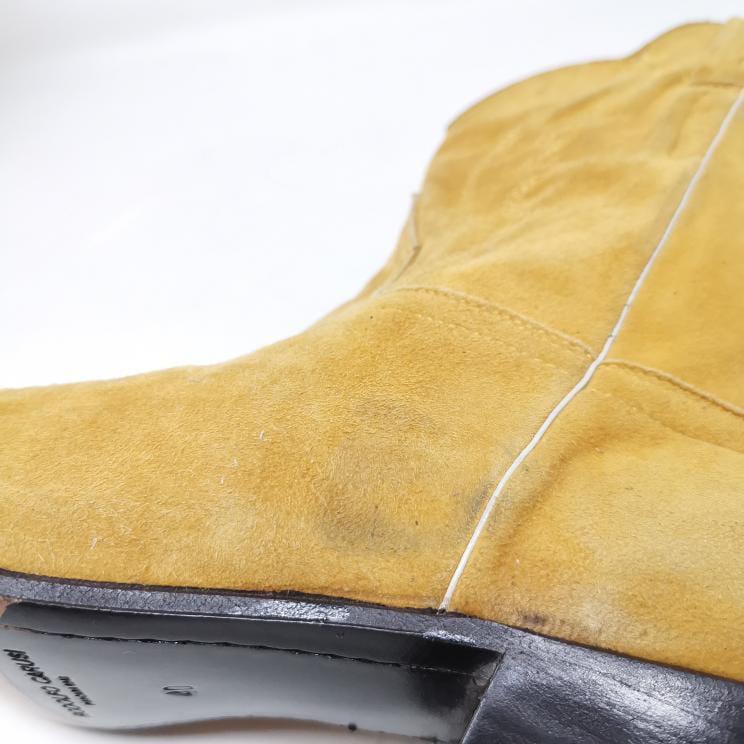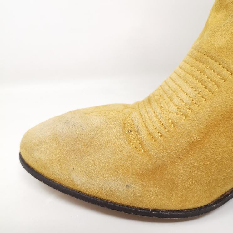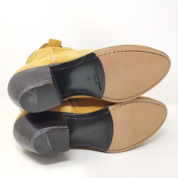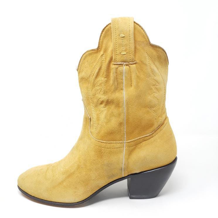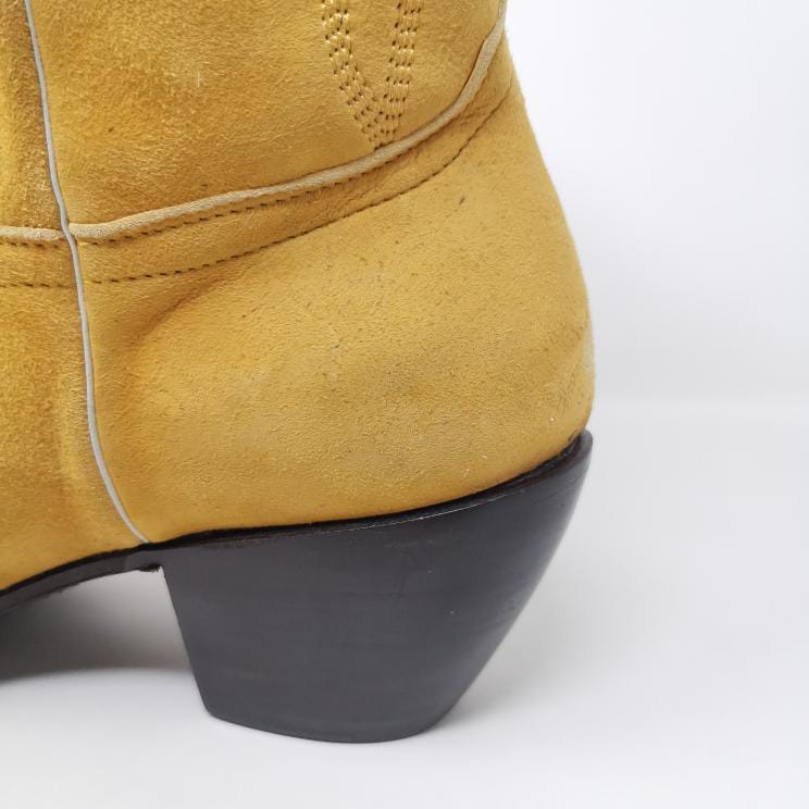 Rodolfo Carusi Texan ankle boots in mustard yellow suede, 7 cm high heel, leather lining and leather outer sole.