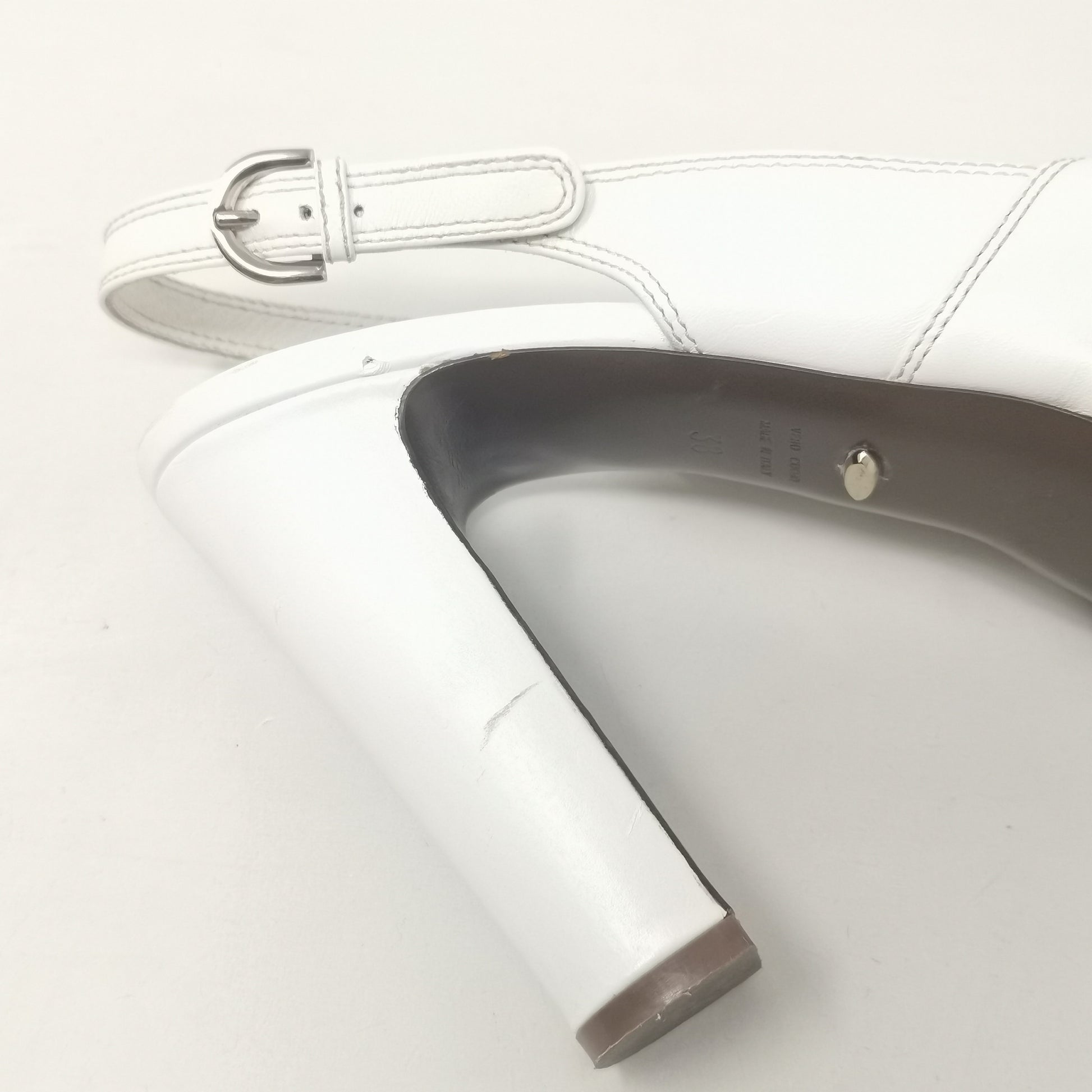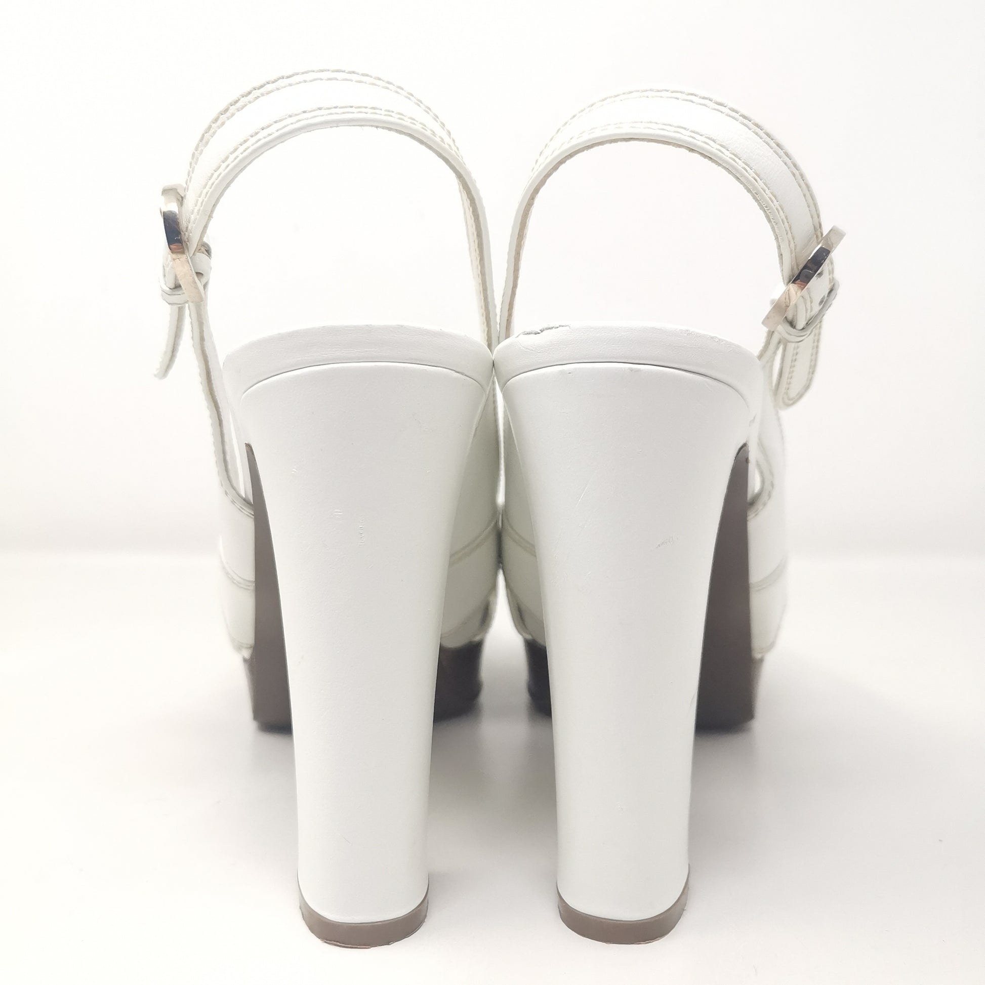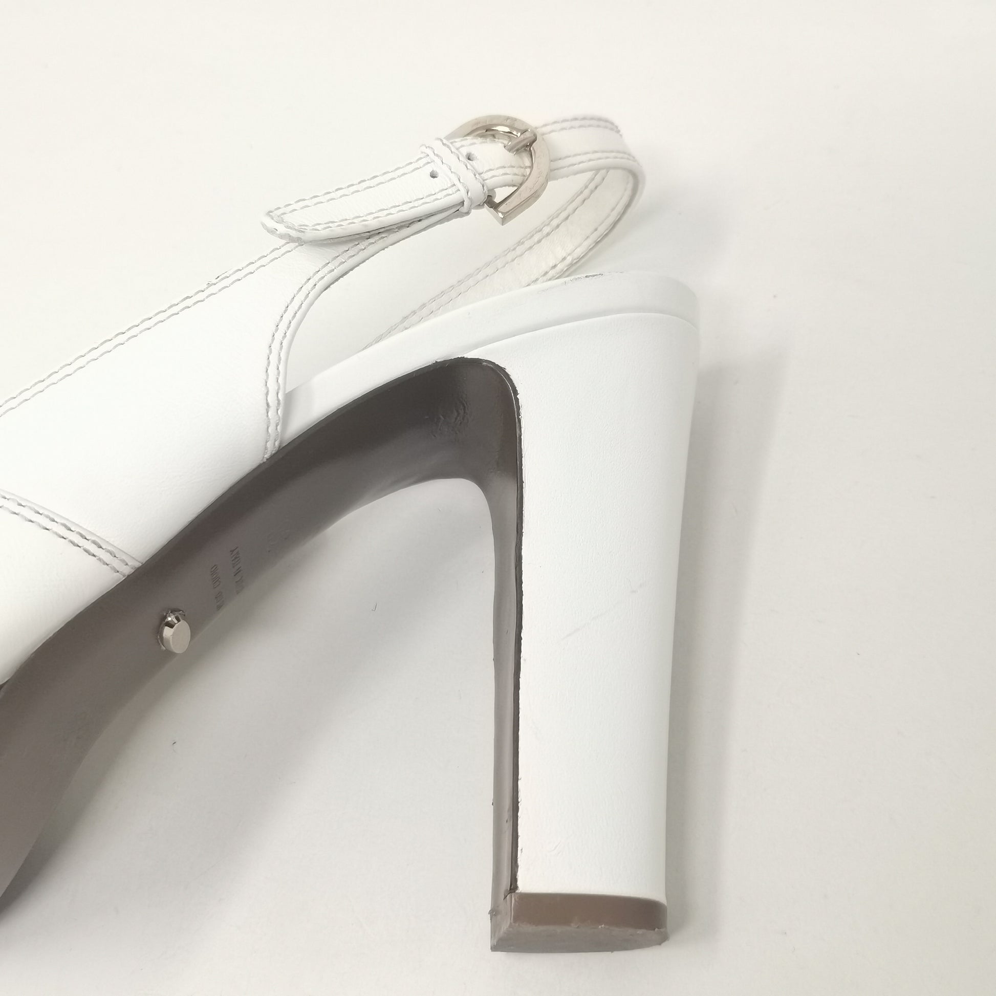 Pumps in white leather with 11 cm high heel and 2 cm platform. The leather insole measures 24 cm, the leather outer sole is slightly marked. Adjustable ankle strap, some small marks on heels and soles. Size 38 EU.