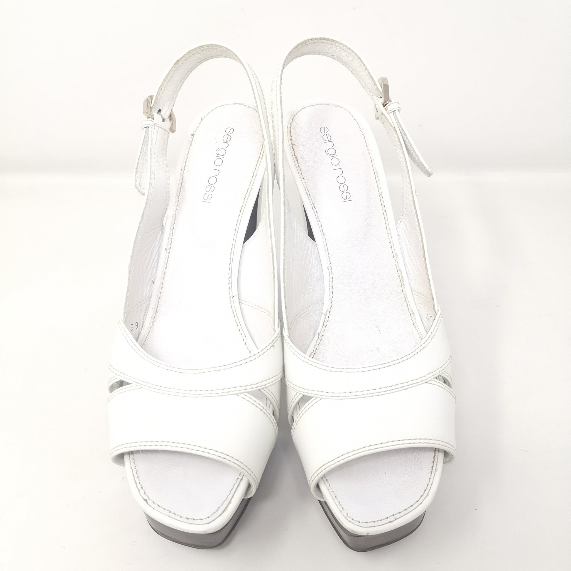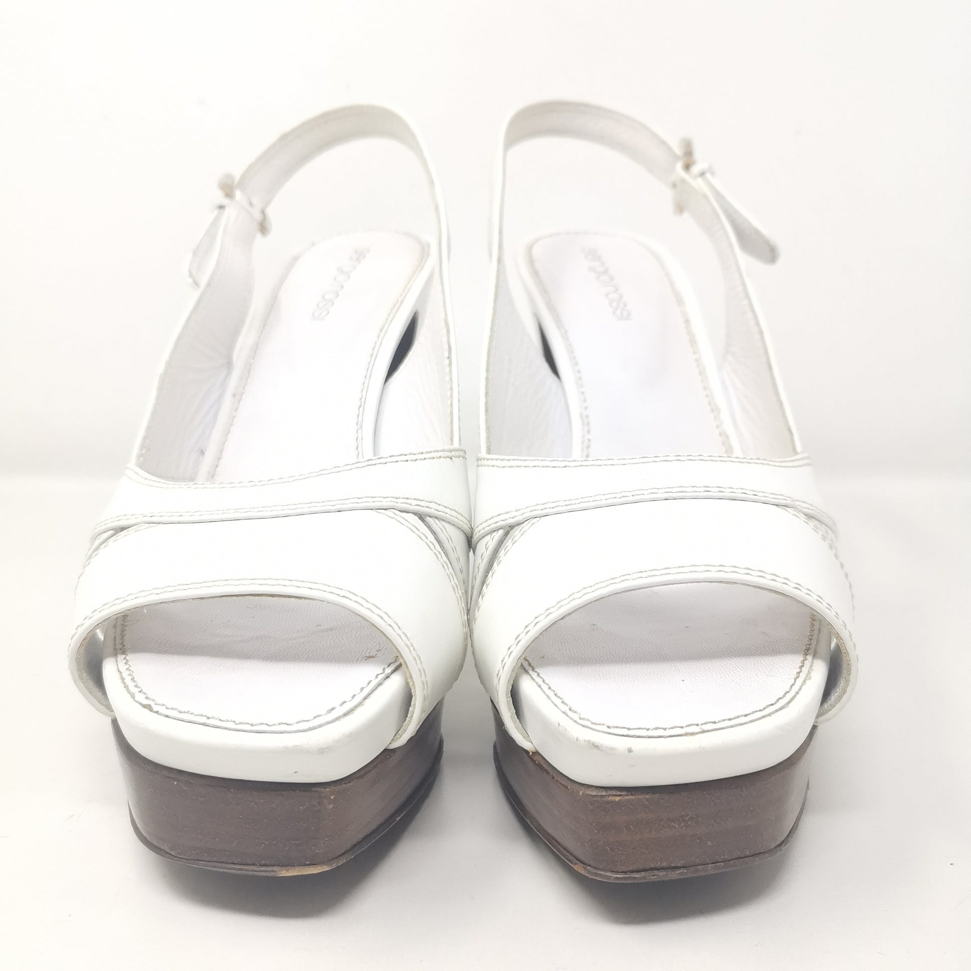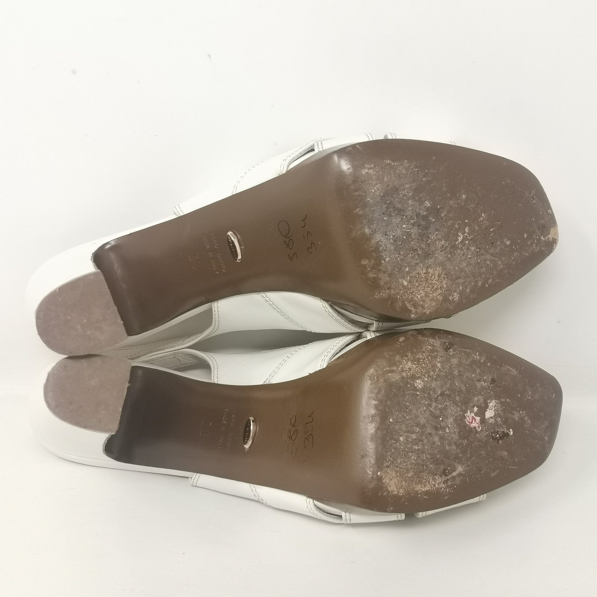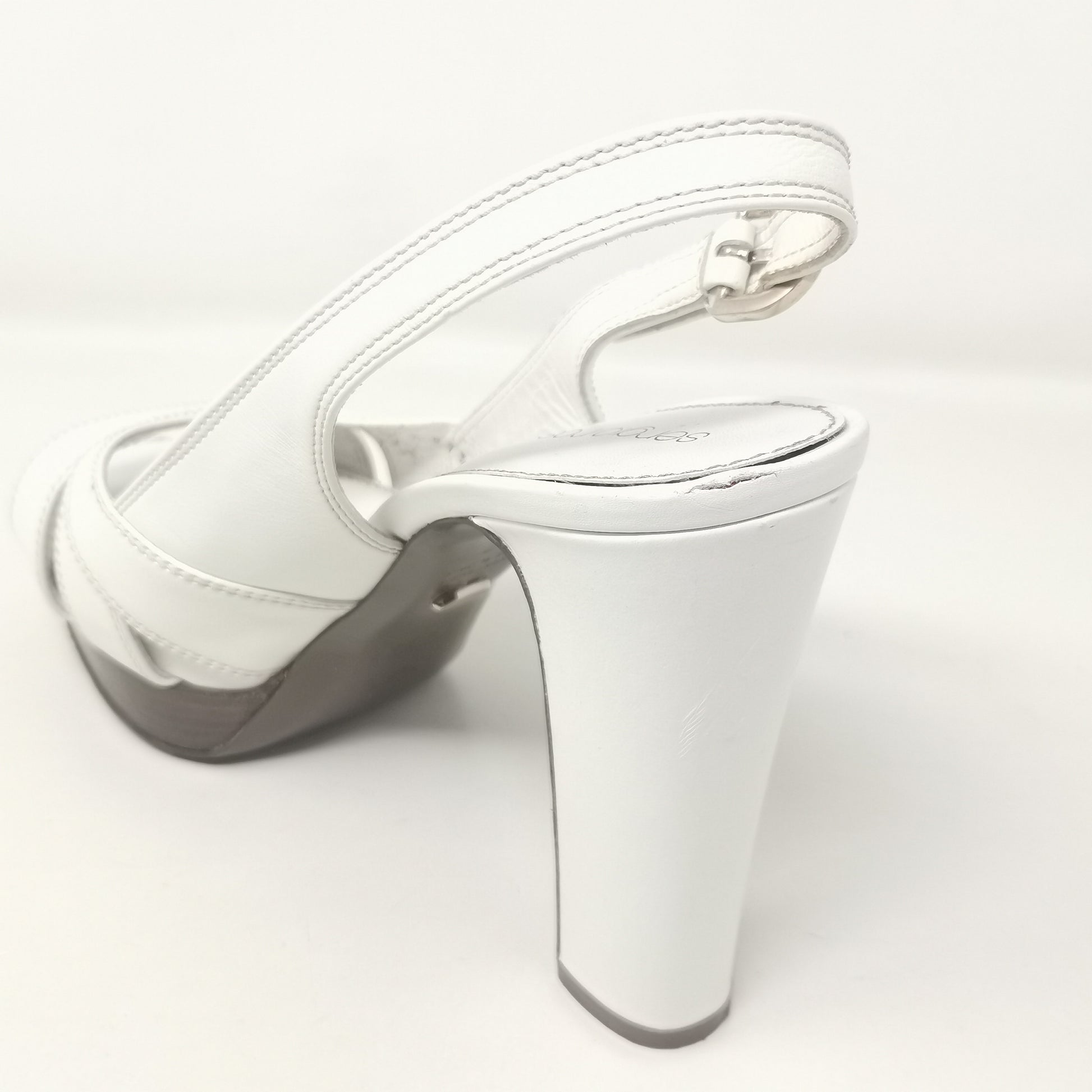 Pumps in white leather with 11 cm high heel and 2 cm platform. The leather insole measures 24 cm, the leather outer sole is slightly marked. Adjustable ankle strap, some small marks on heels and soles. Size 38 EU.