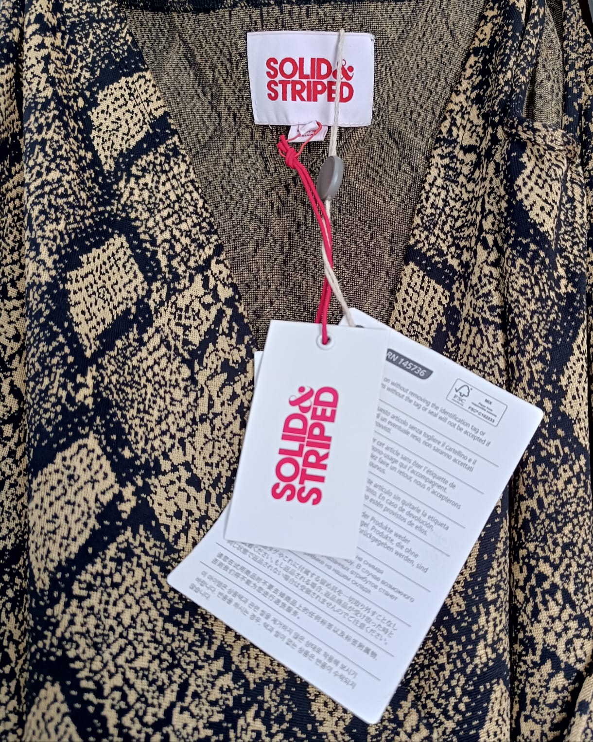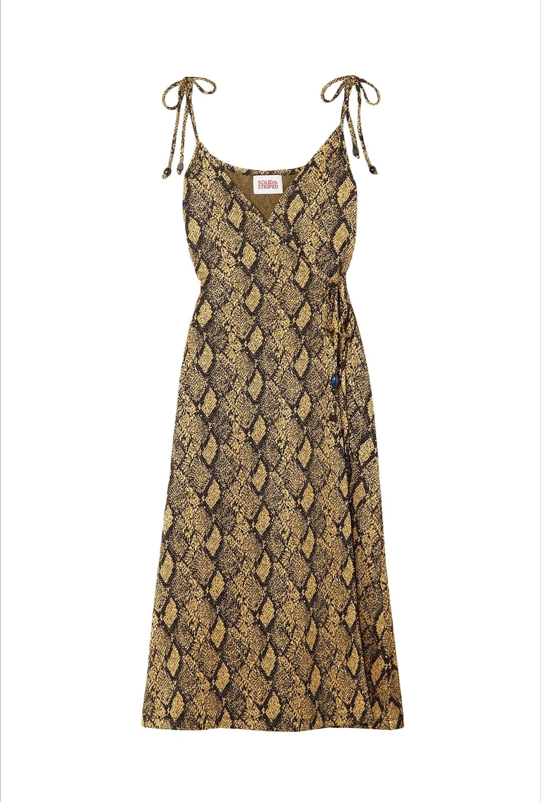 Polyamide and nylon midi wrap dress in black and beige python pattern. Toggle fastening with internal and external ties, adjustable straps with knots and V-neckline. New complete with original tags.