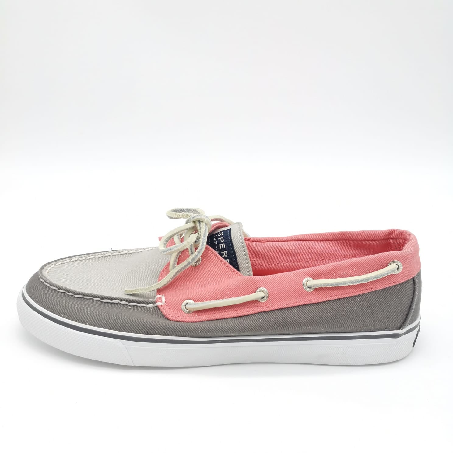 Sperry Top Sider boat sneaker in pink and grey, soft canvas upper, signature moc-toe stitching, removable full-length footbed ensures lasting comfort.