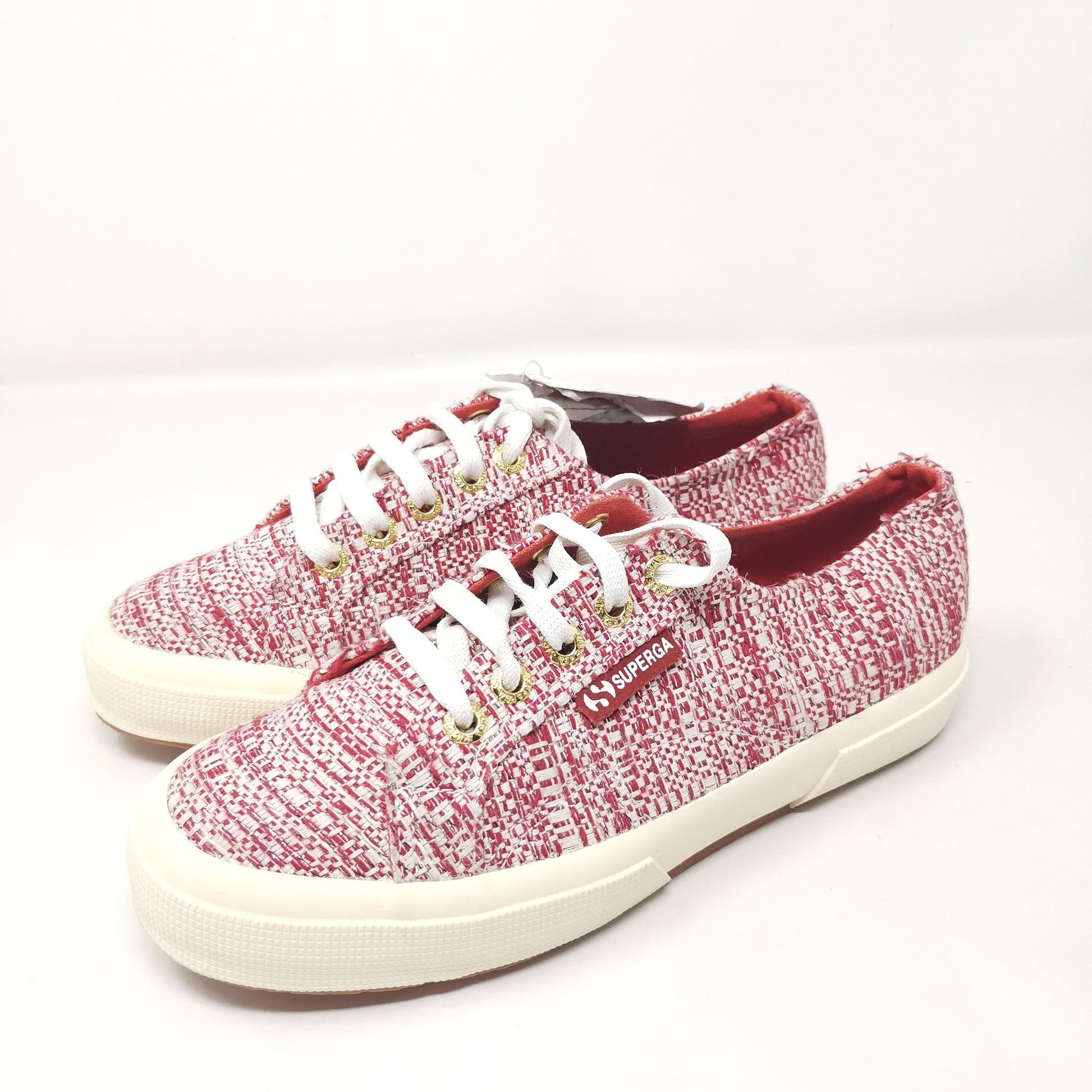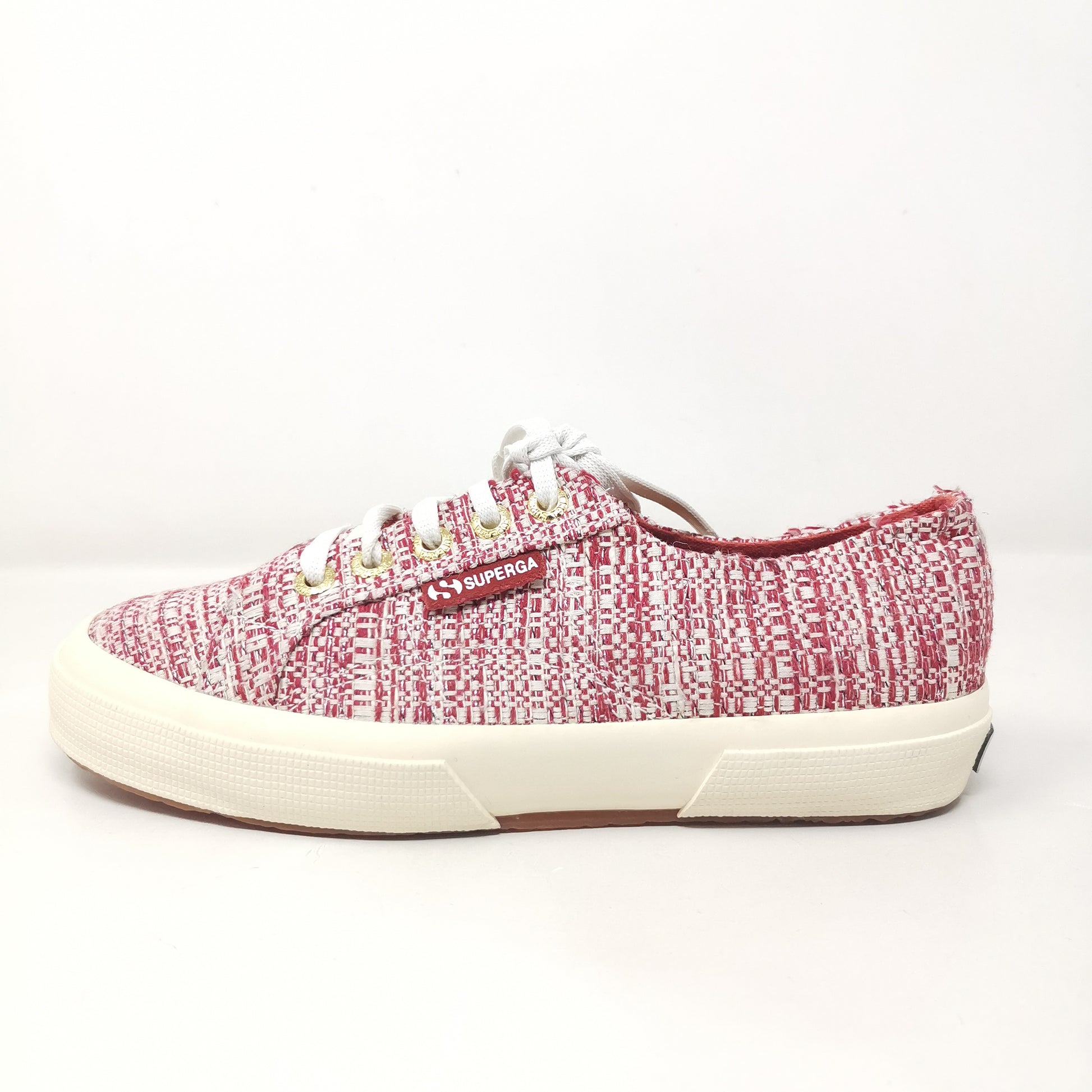 Classic Superga model, made in Italy in red, white and silver woven fabric. Internal sole in cotton and external in rubber, never used and complete with tags. A few small marks. Size 35 EU.