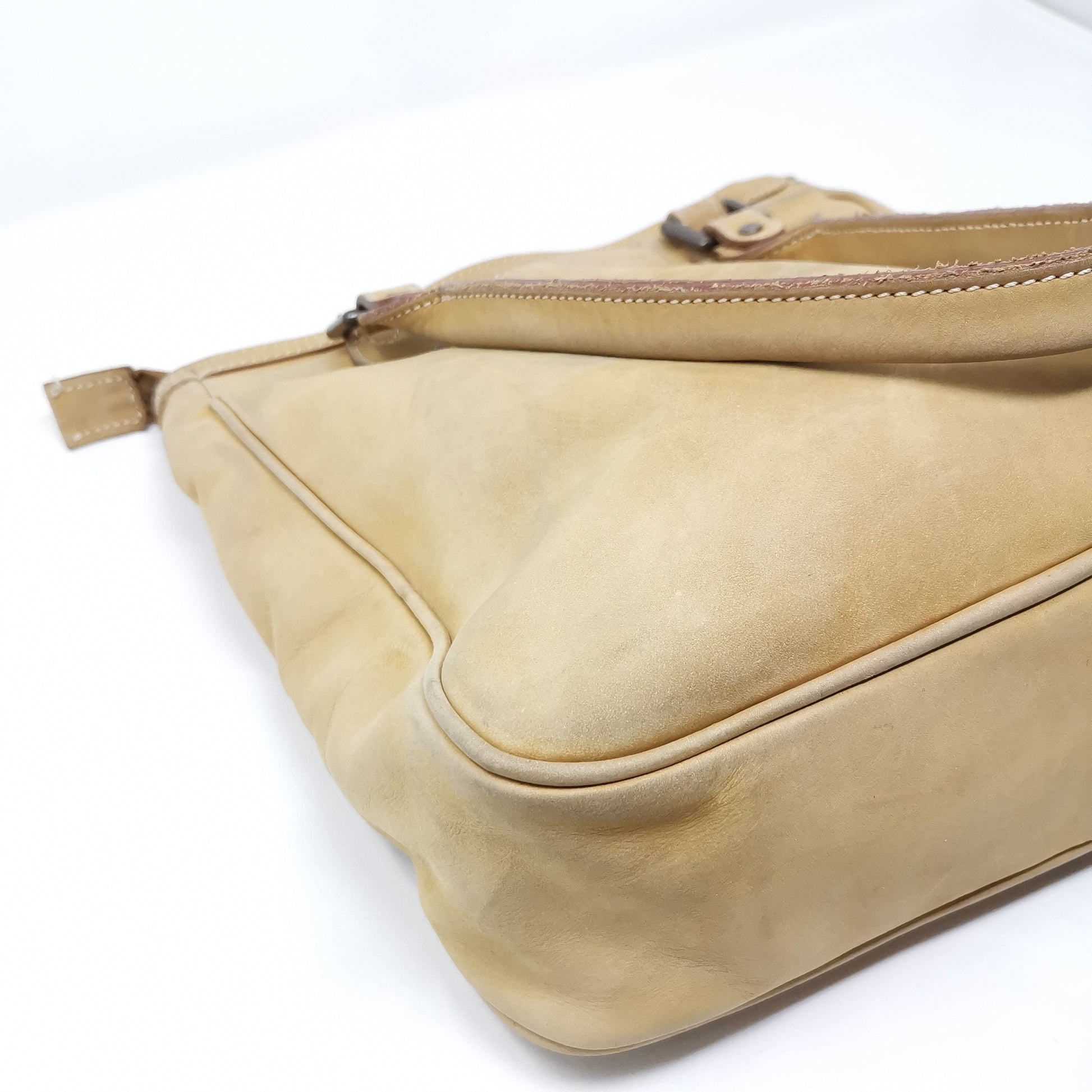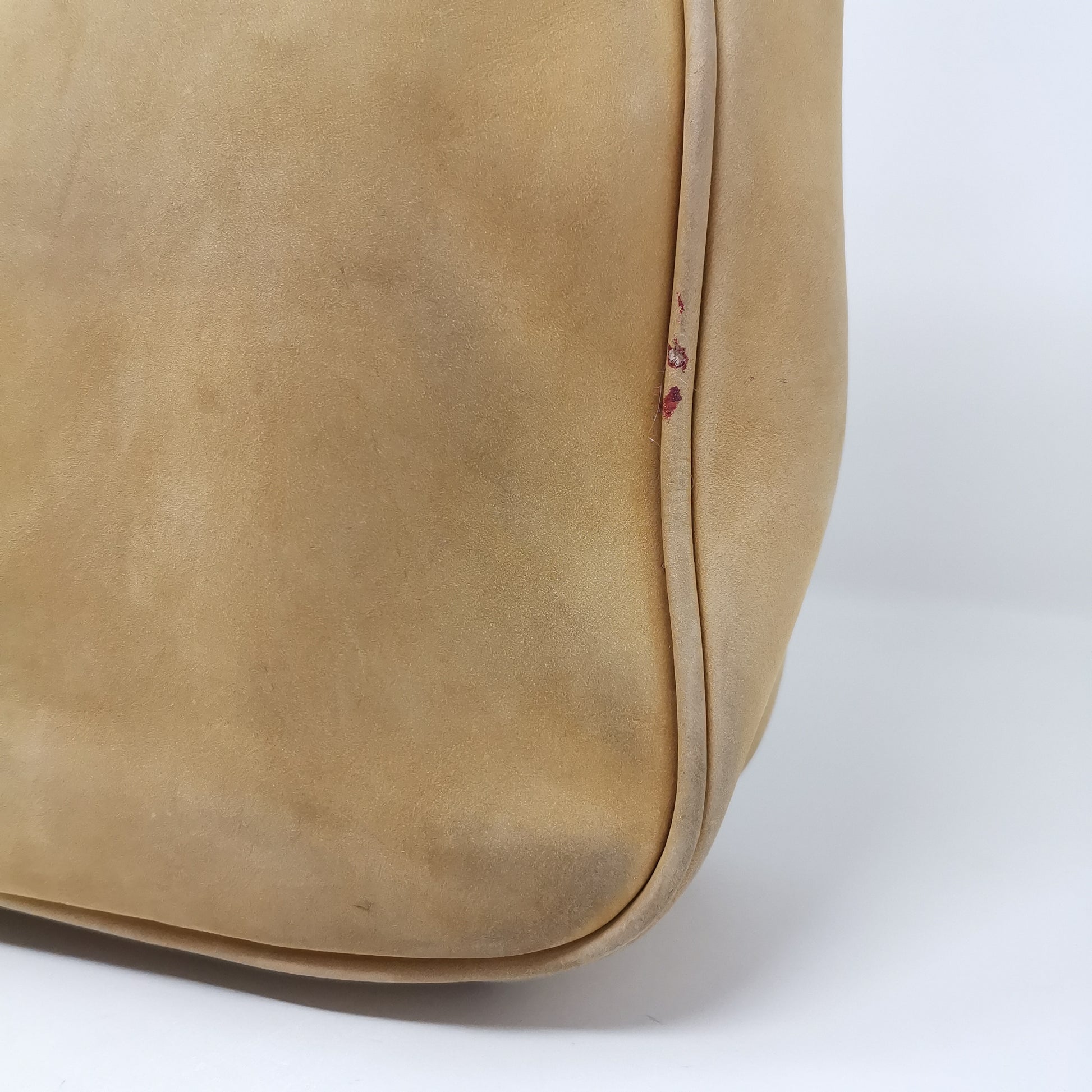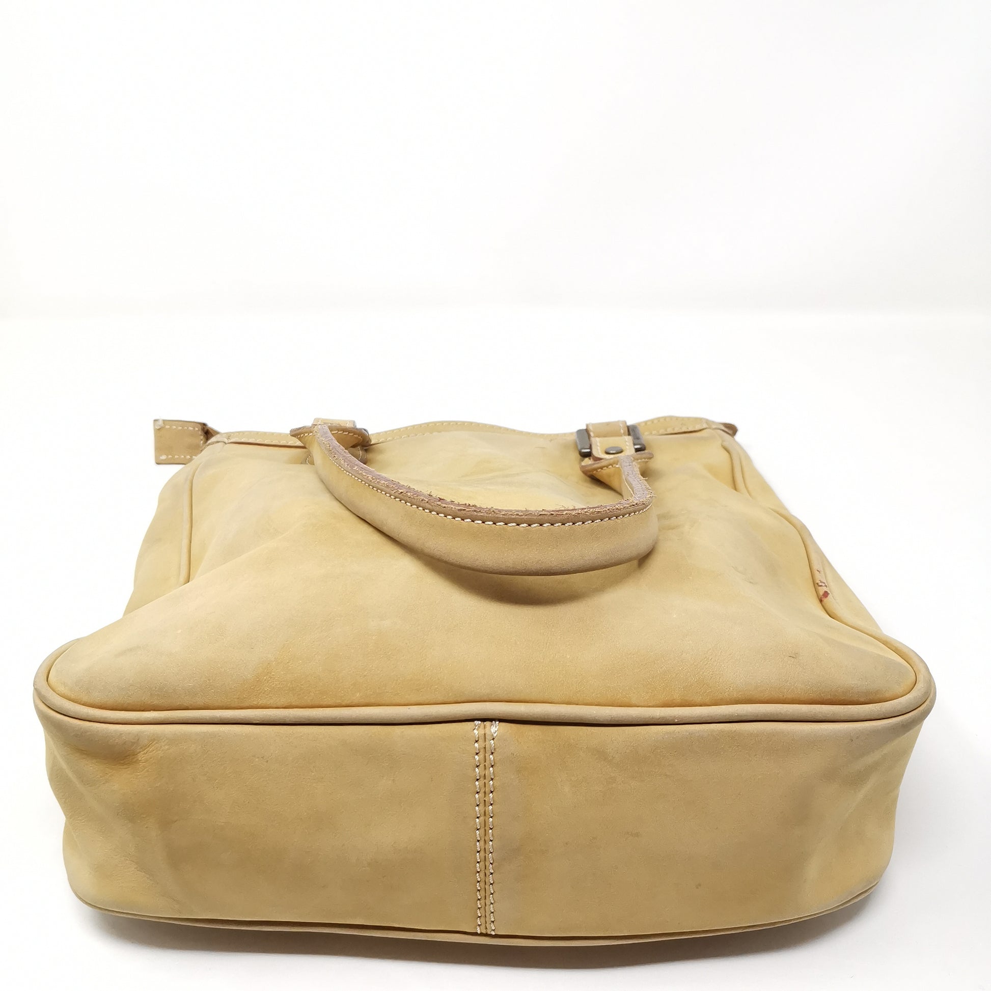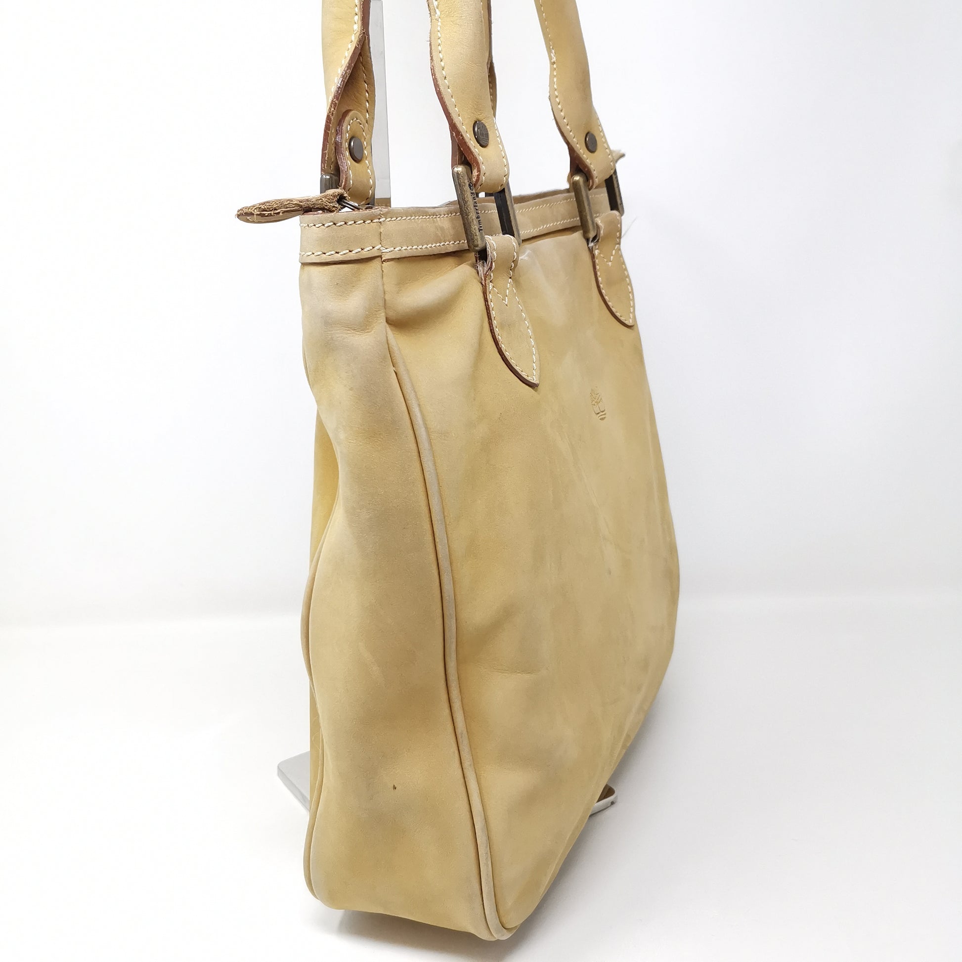 Beige/camel suede bag with double handles. Zip opening and fabric interior with pockets.