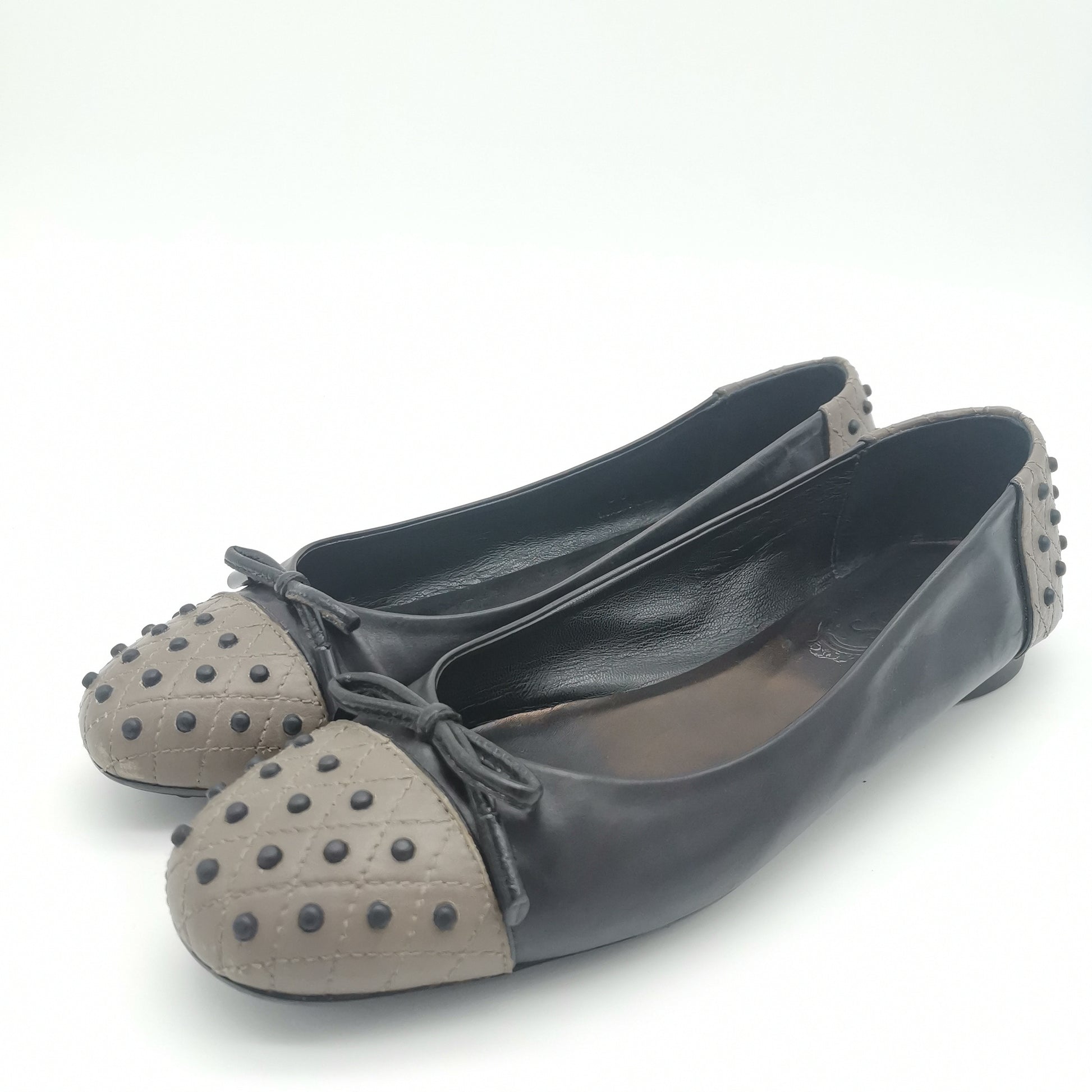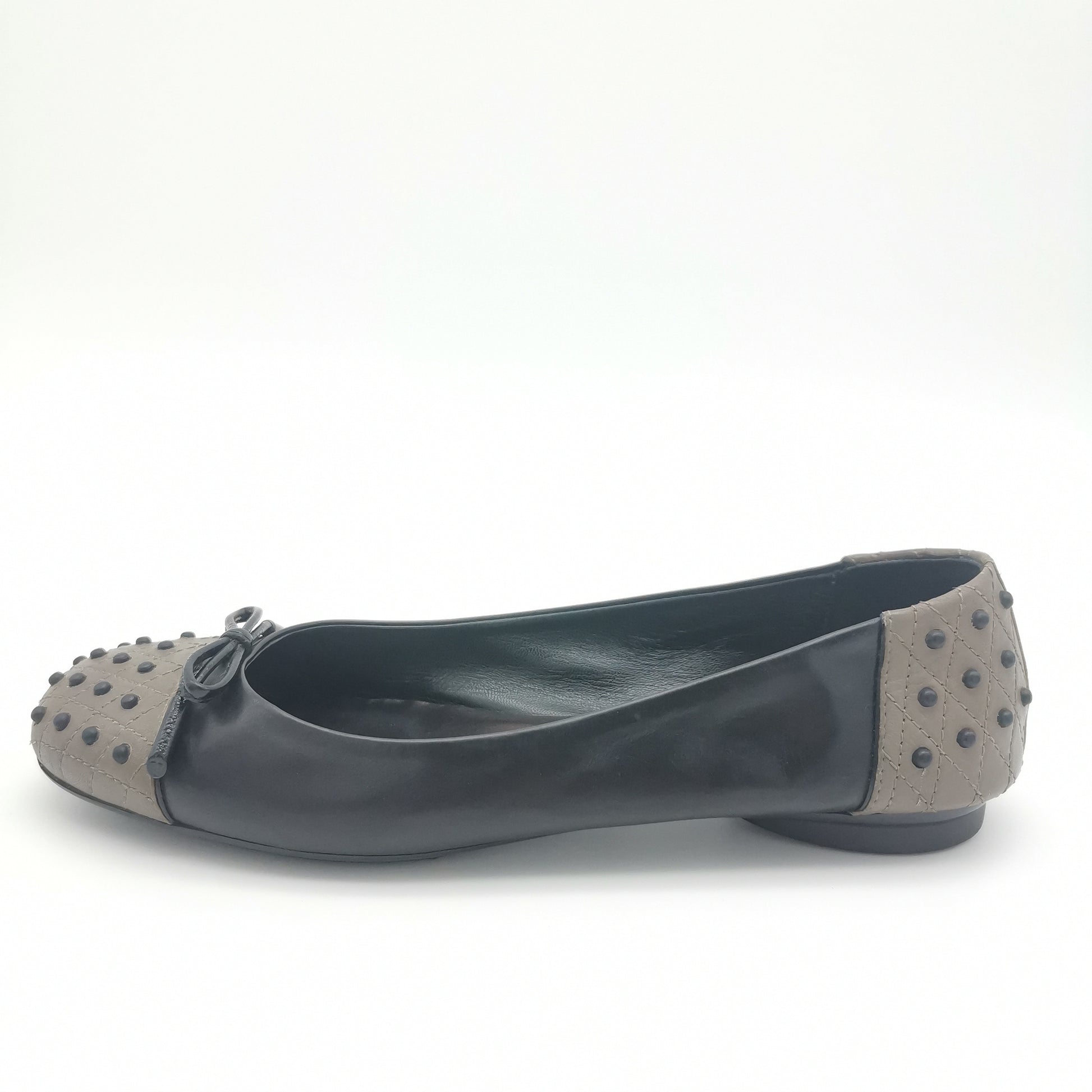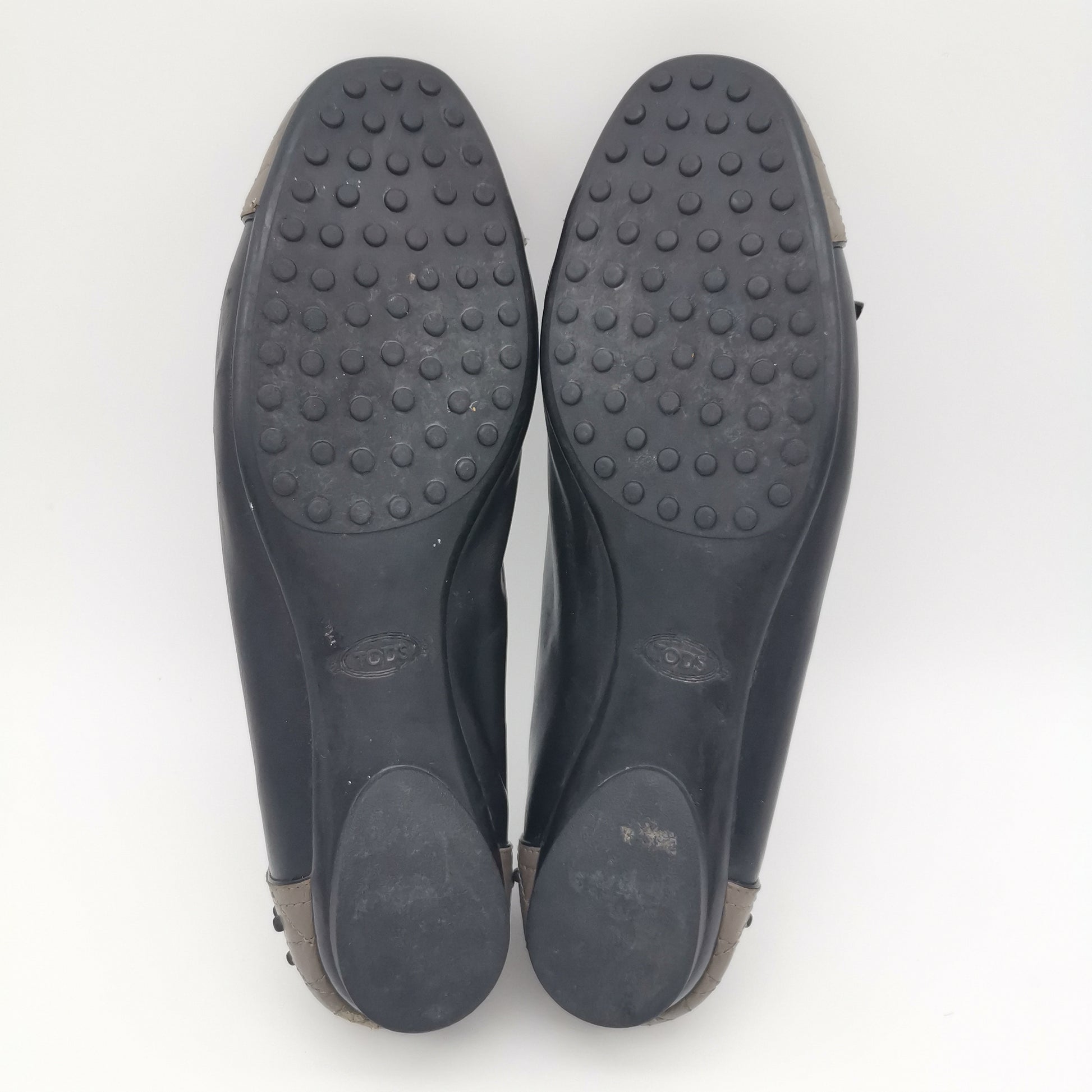 Black and taupe leather ballet flats, leather insole and rubber outsole with typical Tod's brand "gommini".