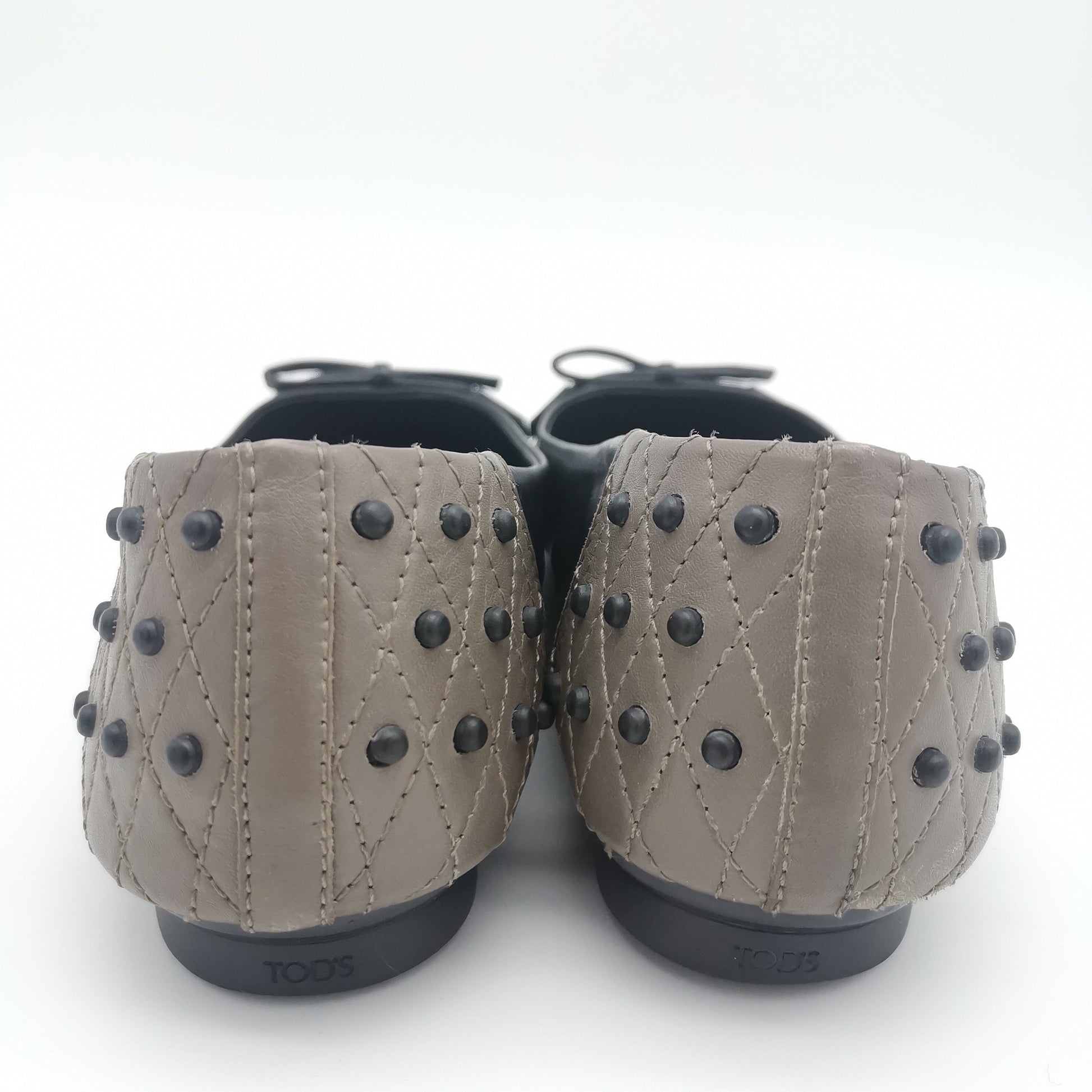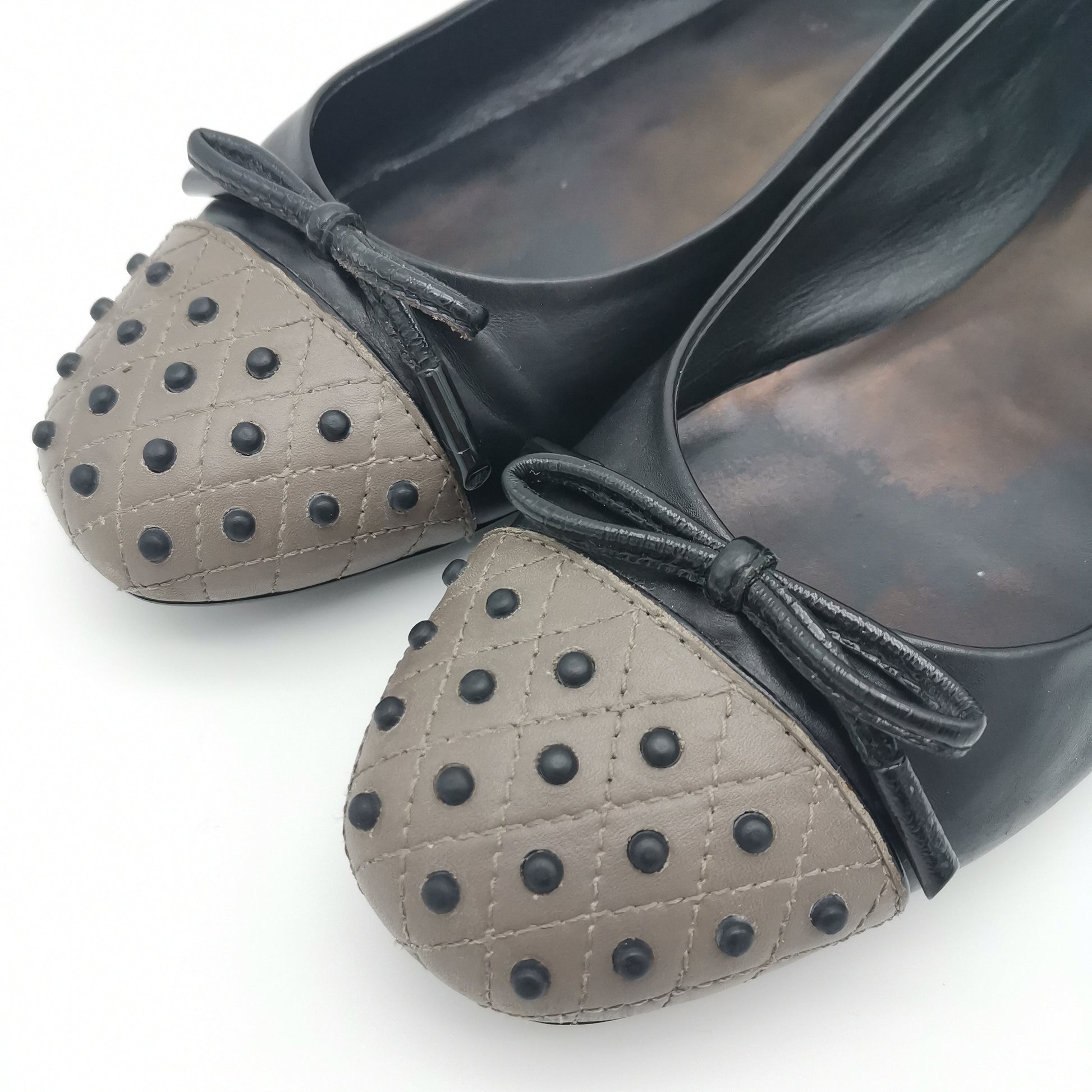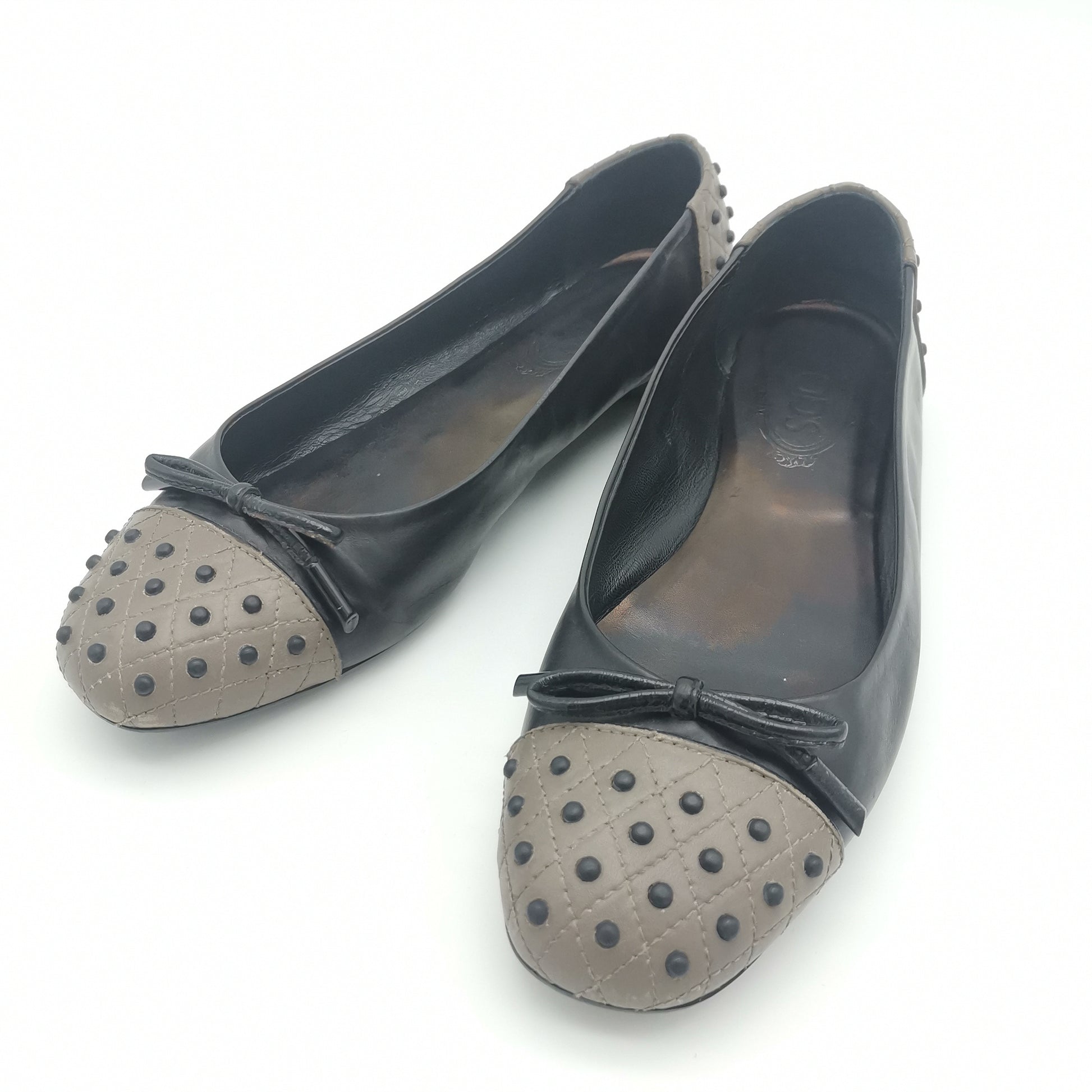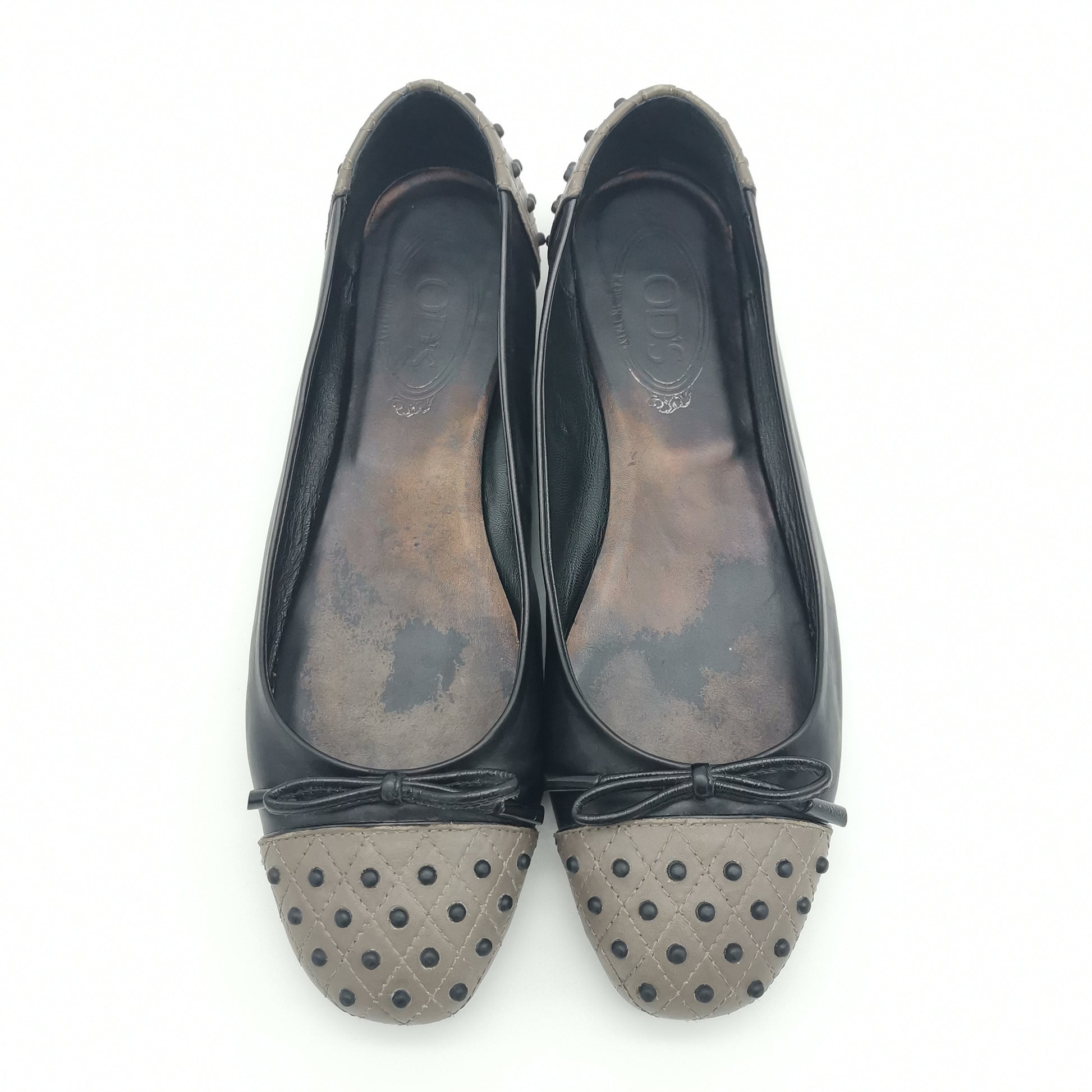Black and taupe leather ballet flats, leather insole and rubber outsole with typical Tod's brand "gommini".