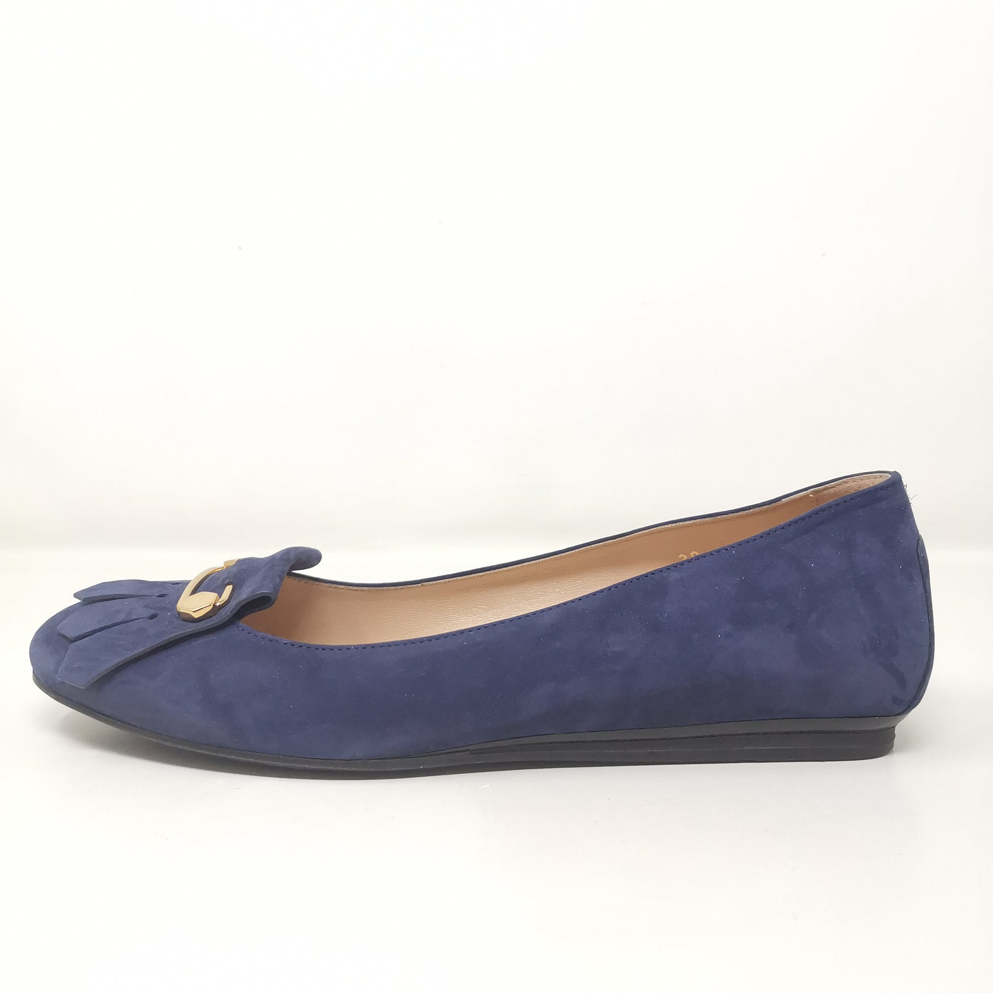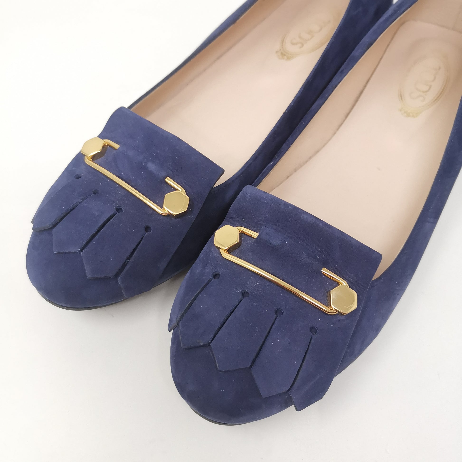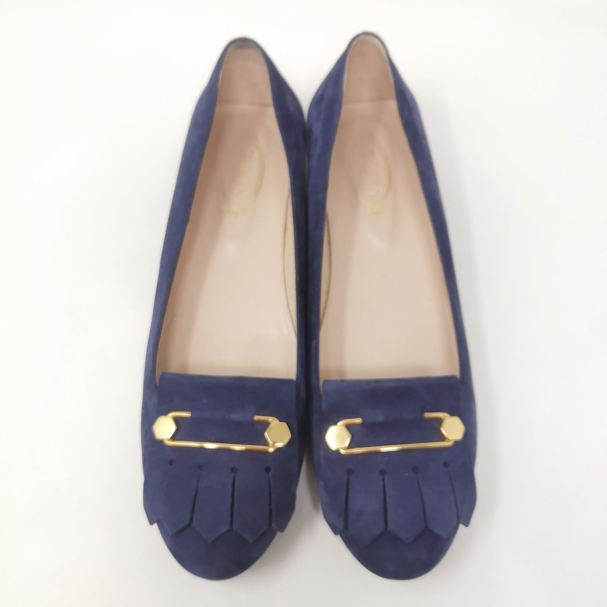 Blue suede ballet flats with gold-colored metal decoration and fringe on the upper. Leather interior and black rubber outer sole with some marks 0.8 cm high. The insole measures approximately 25.5 cm.