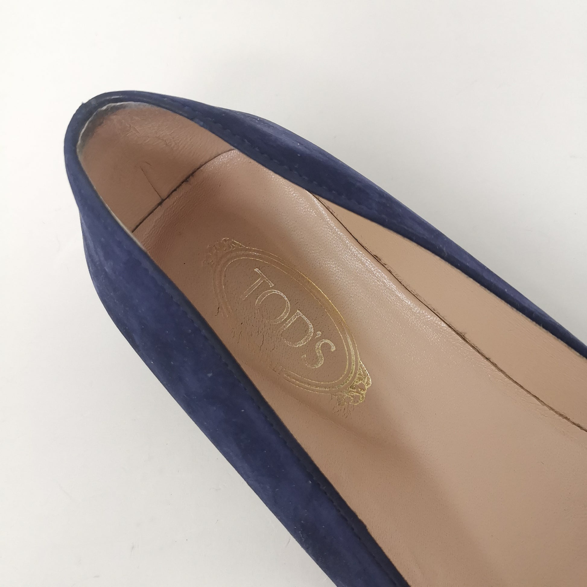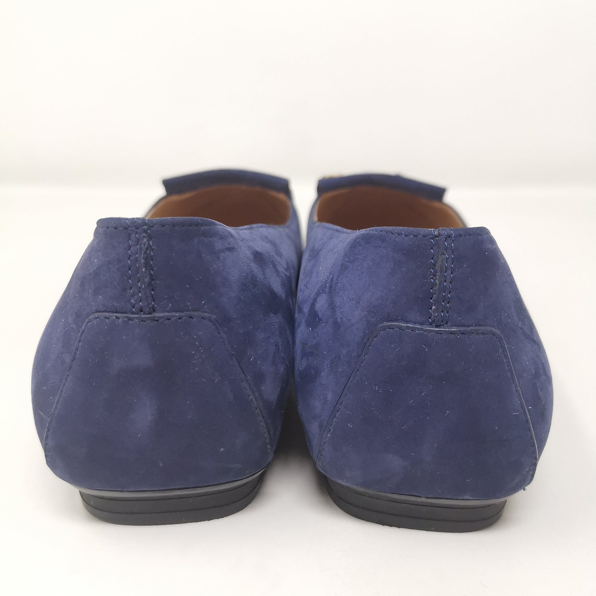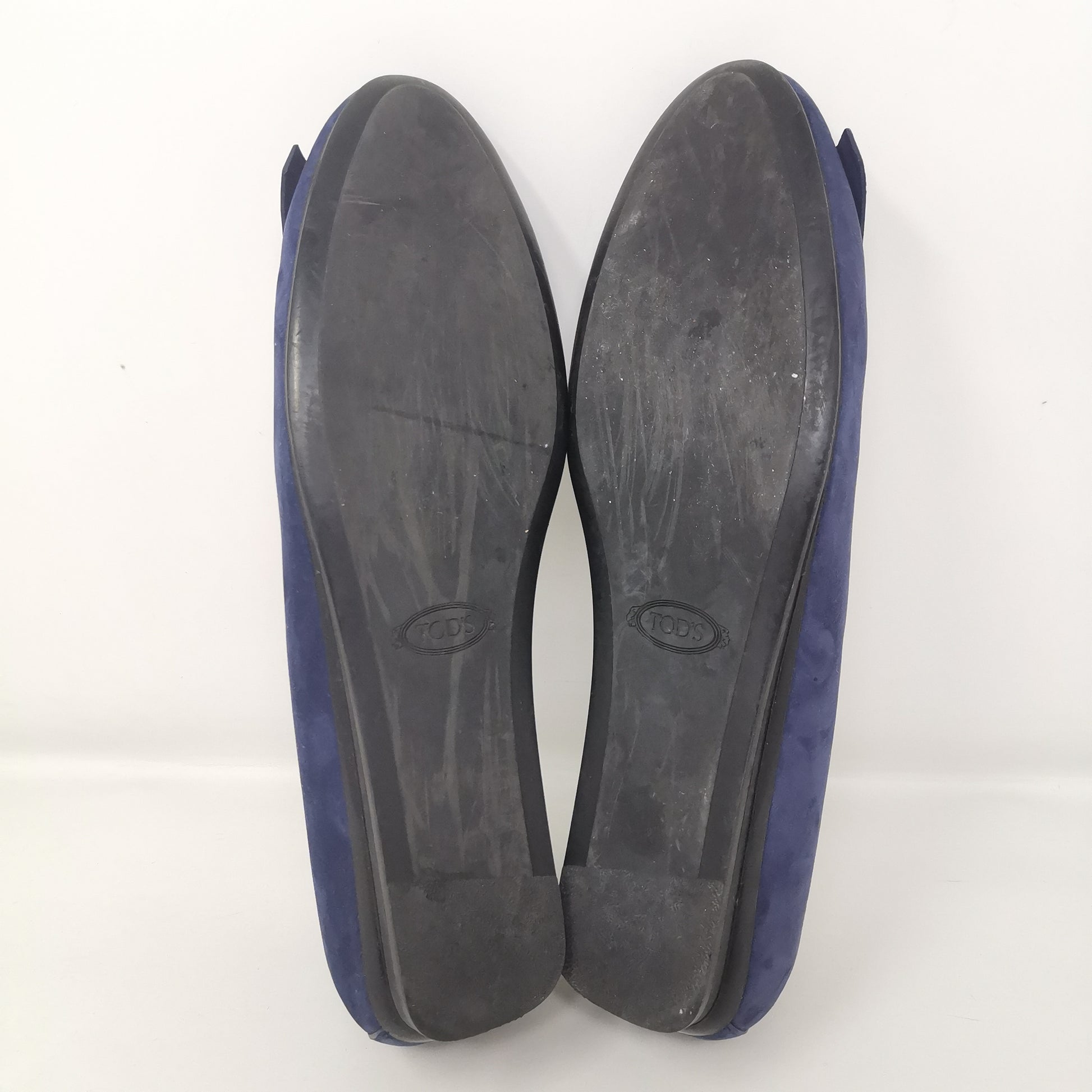 Blue suede ballet flats with gold-colored metal decoration and fringe on the upper. Leather interior and black rubber outer sole with some marks 0.8 cm high. The insole measures approximately 25.5 cm.