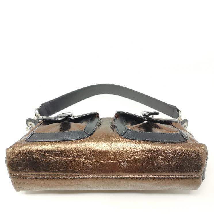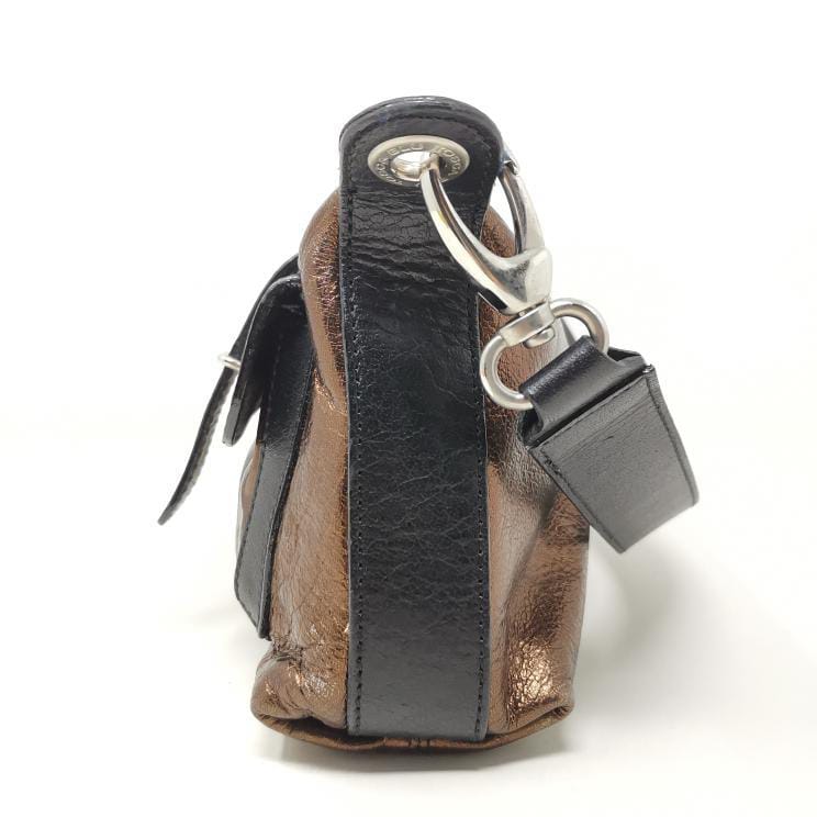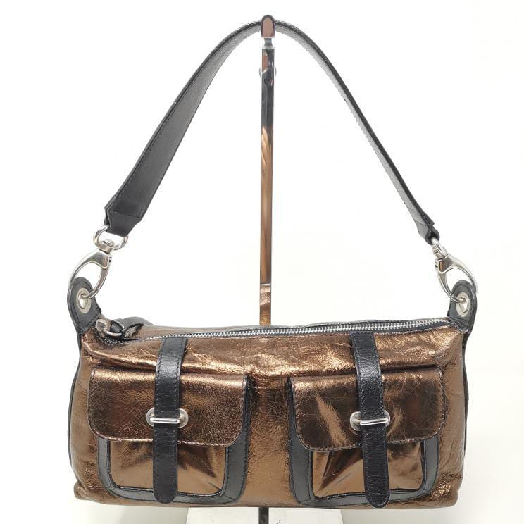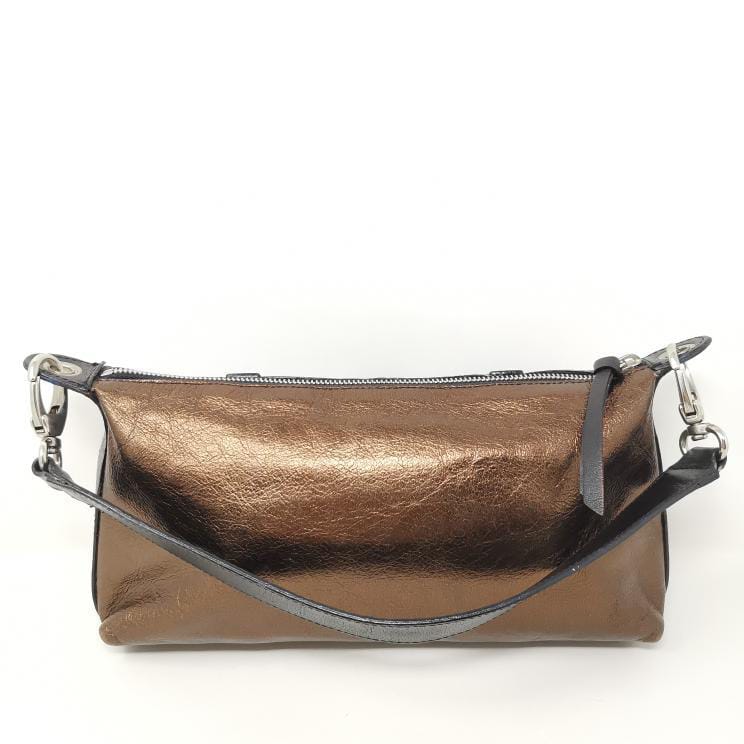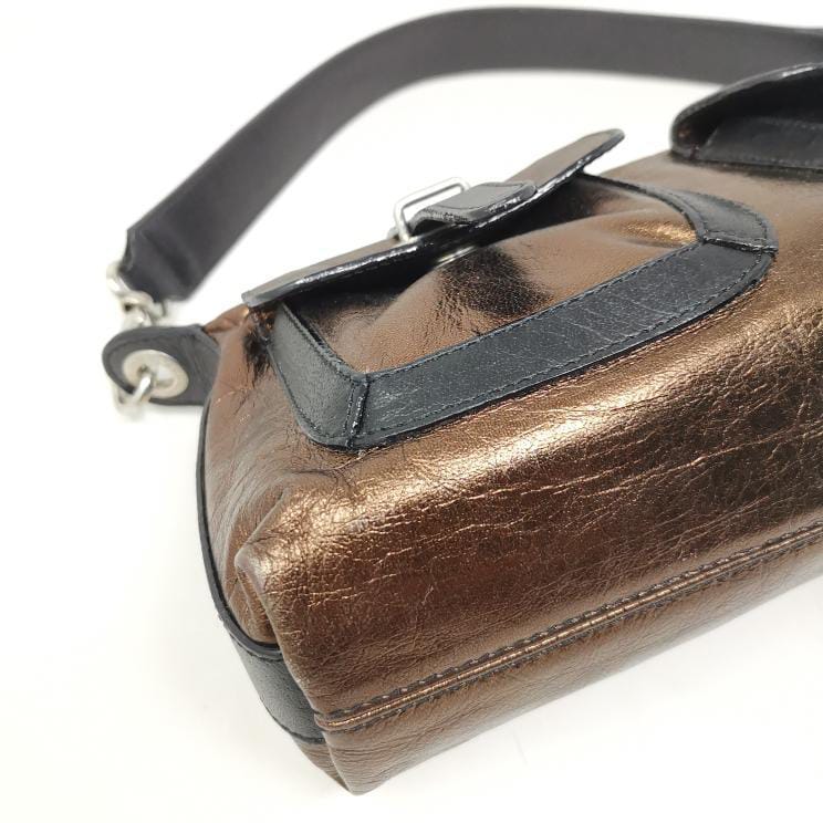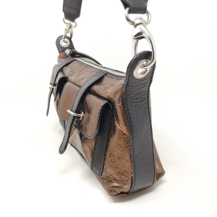 Metallic bronze and black leather handbag with removable single handle. Zip opening and fabric interior with pocket, silver-coloured metal hardware and two exterior pockets. Present a few small marks on corners and bottom.