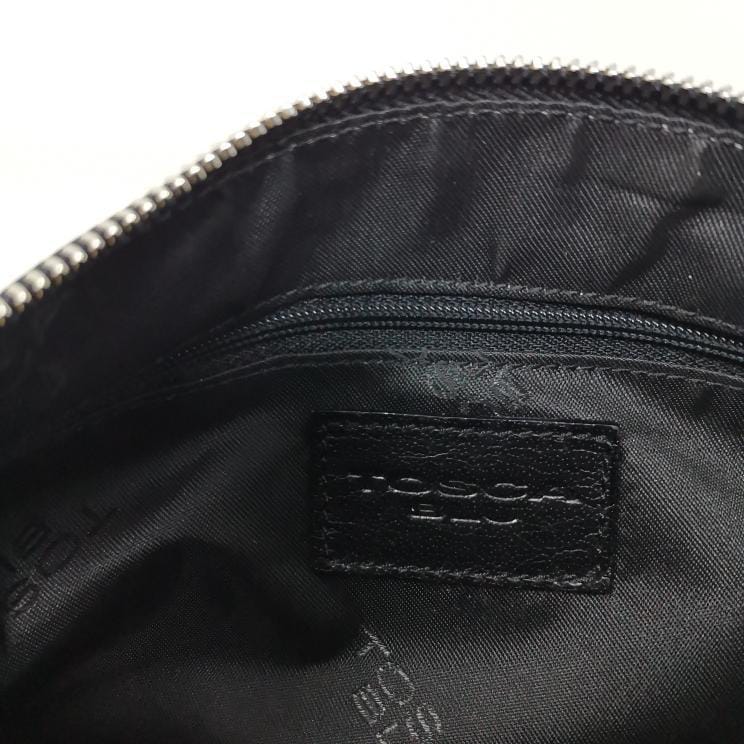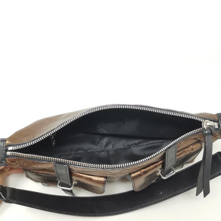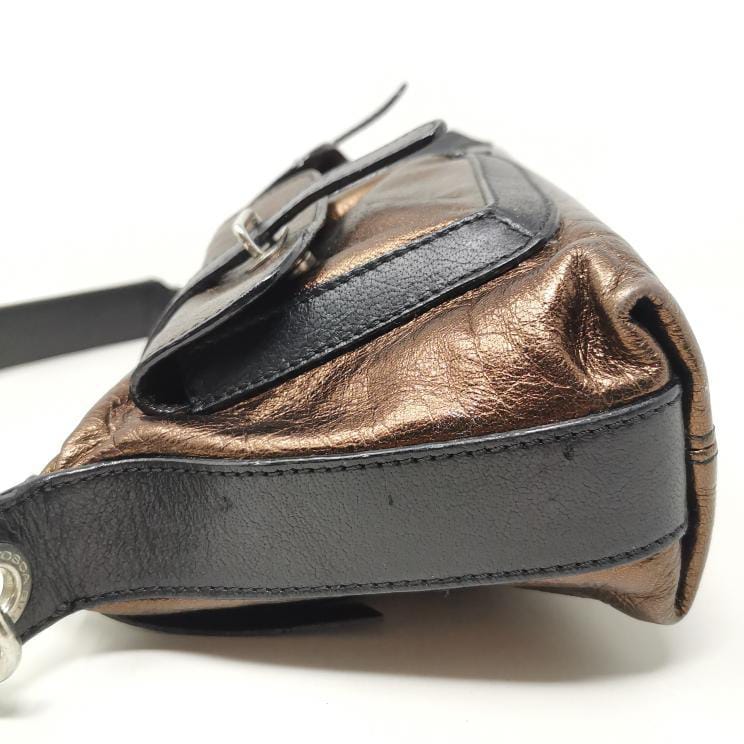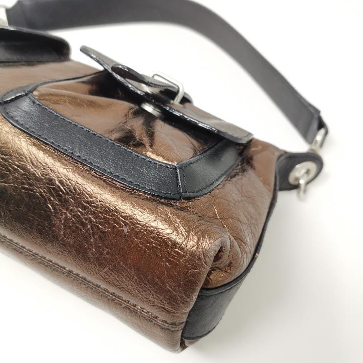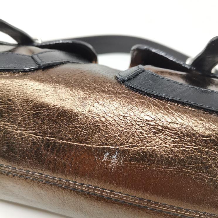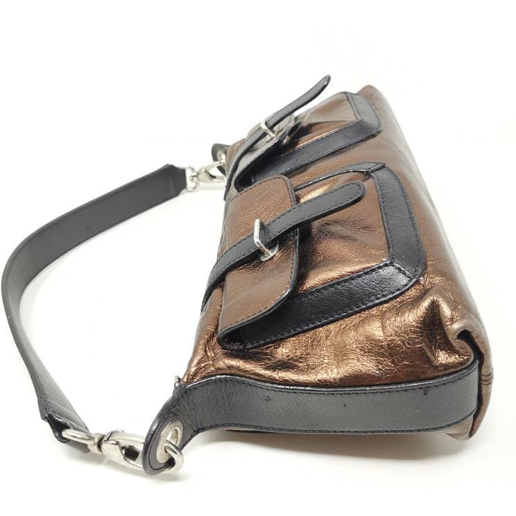 Metallic bronze and black leather handbag with removable single handle. Zip opening and fabric interior with pocket, silver-coloured metal hardware and two exterior pockets. Present a few small marks on corners and bottom.