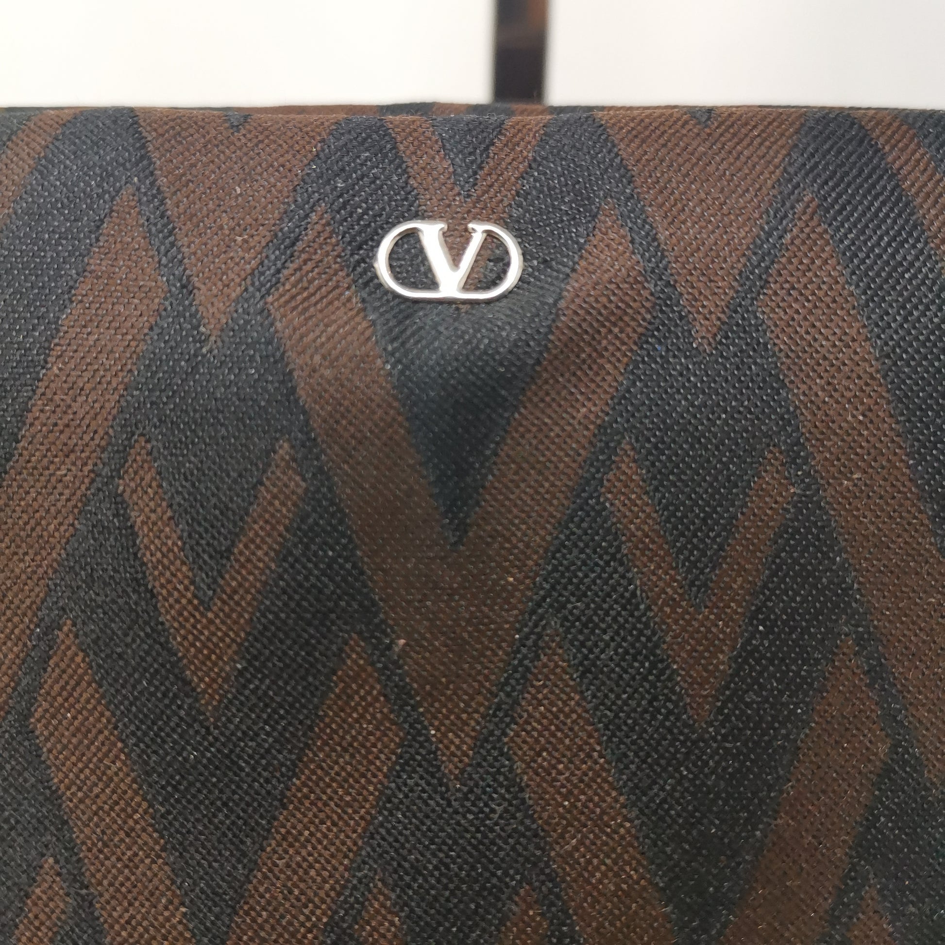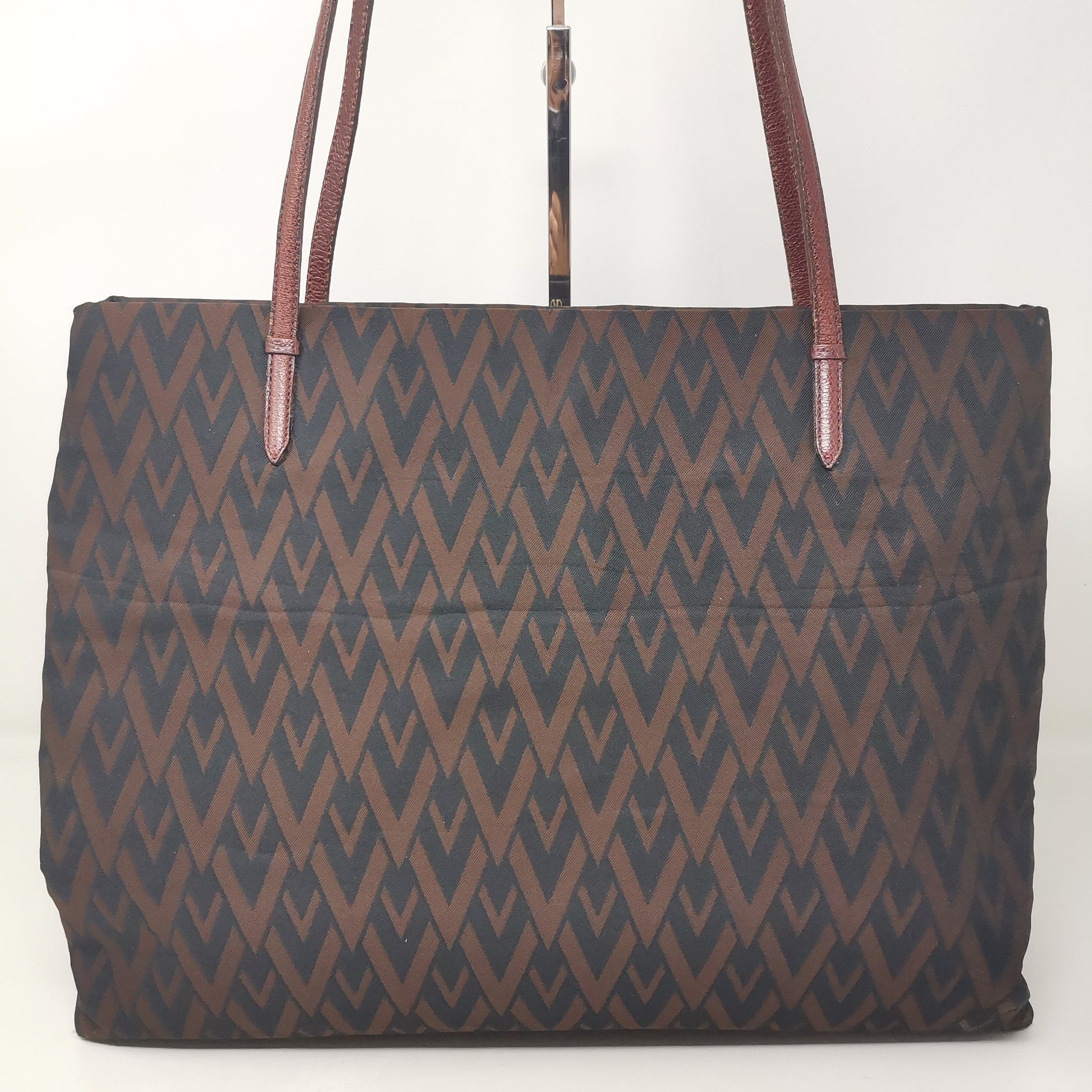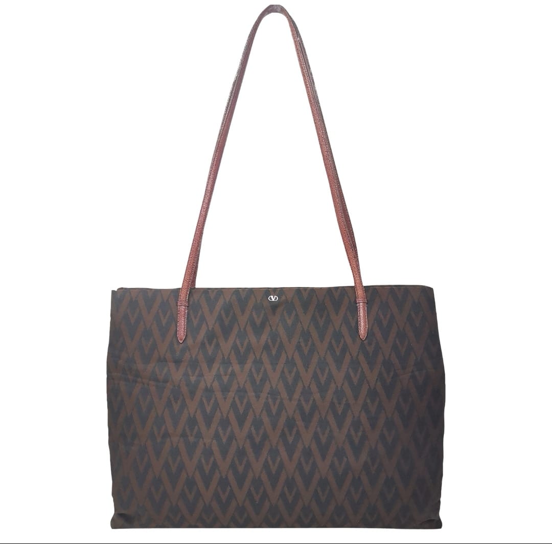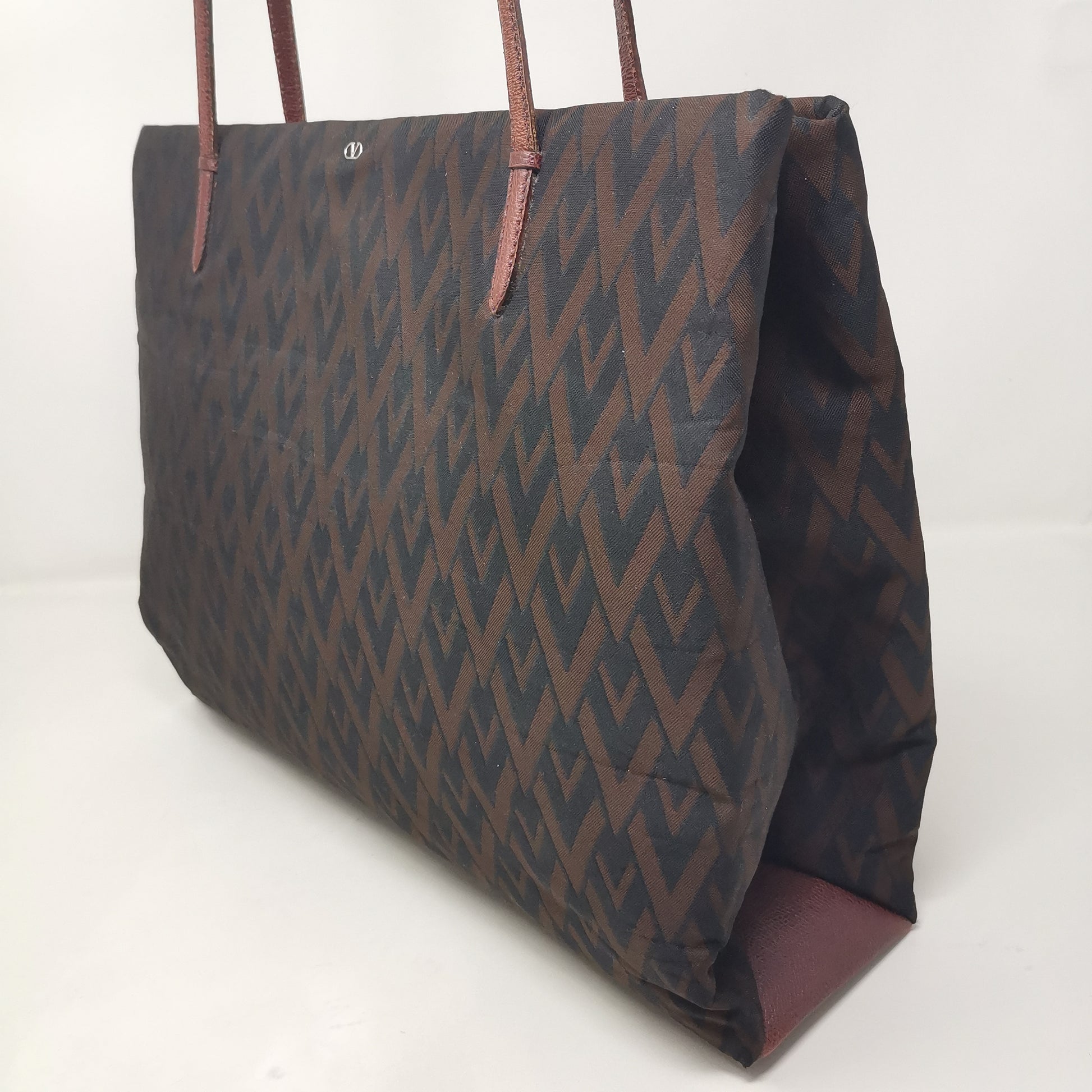 Valentino Les Sacs. Brown and black V patterned fabric bag, double leather handles with some signs of wear. Button opening and fabric interior with pocket. Leather bottom with some markings and silver-colored metal hardware. There are some small marks on corners, handles and in general. 37x29x9.5 cm, handle height 30 cm.
