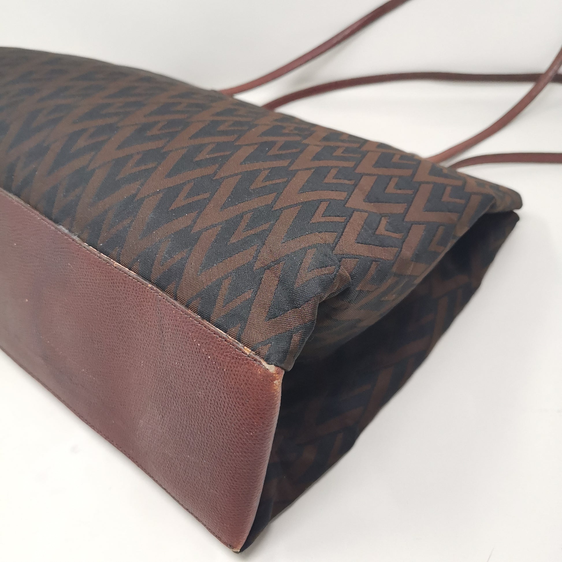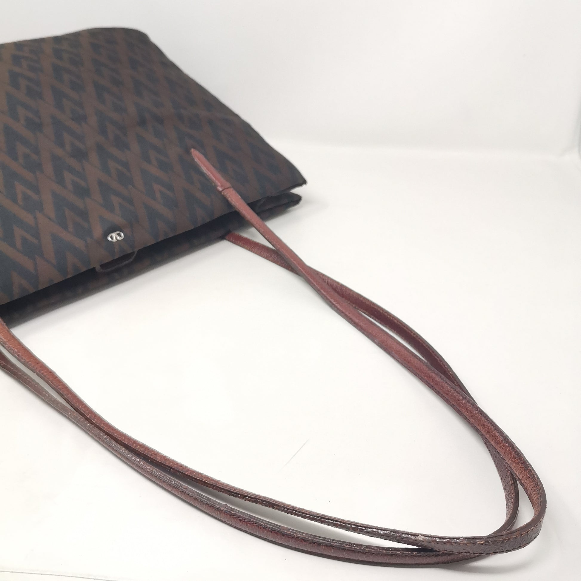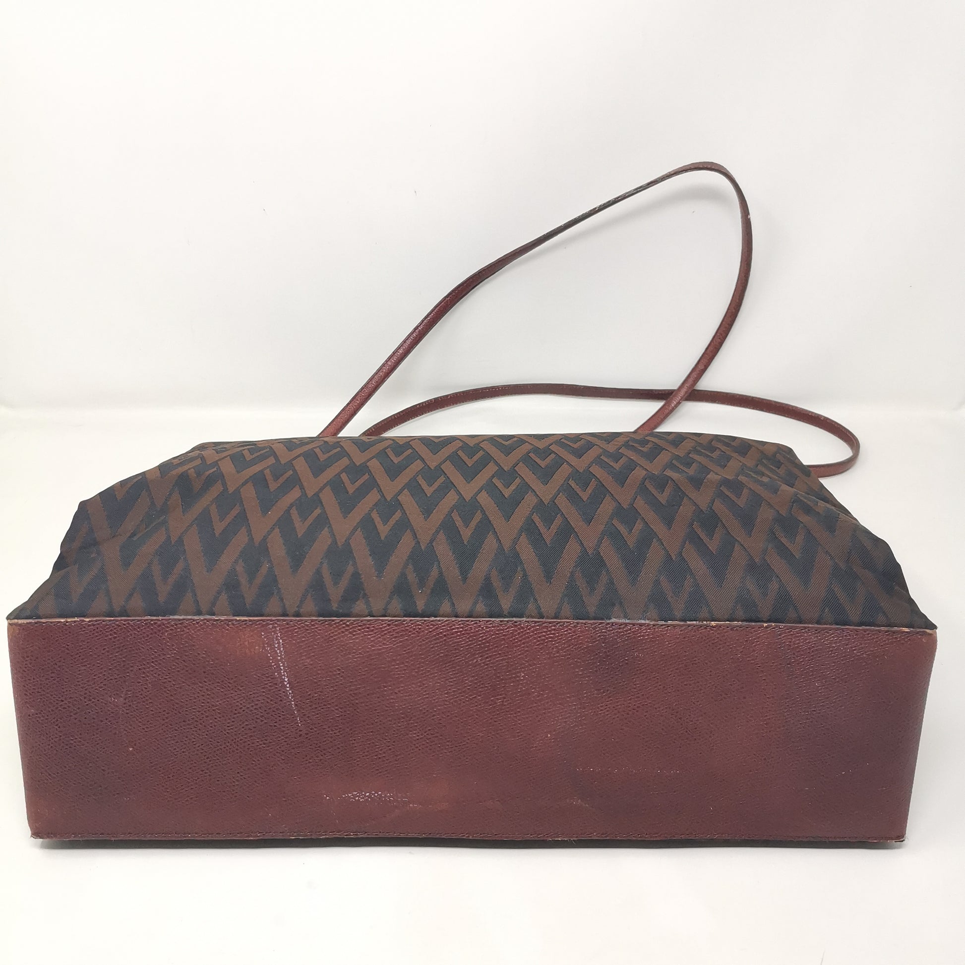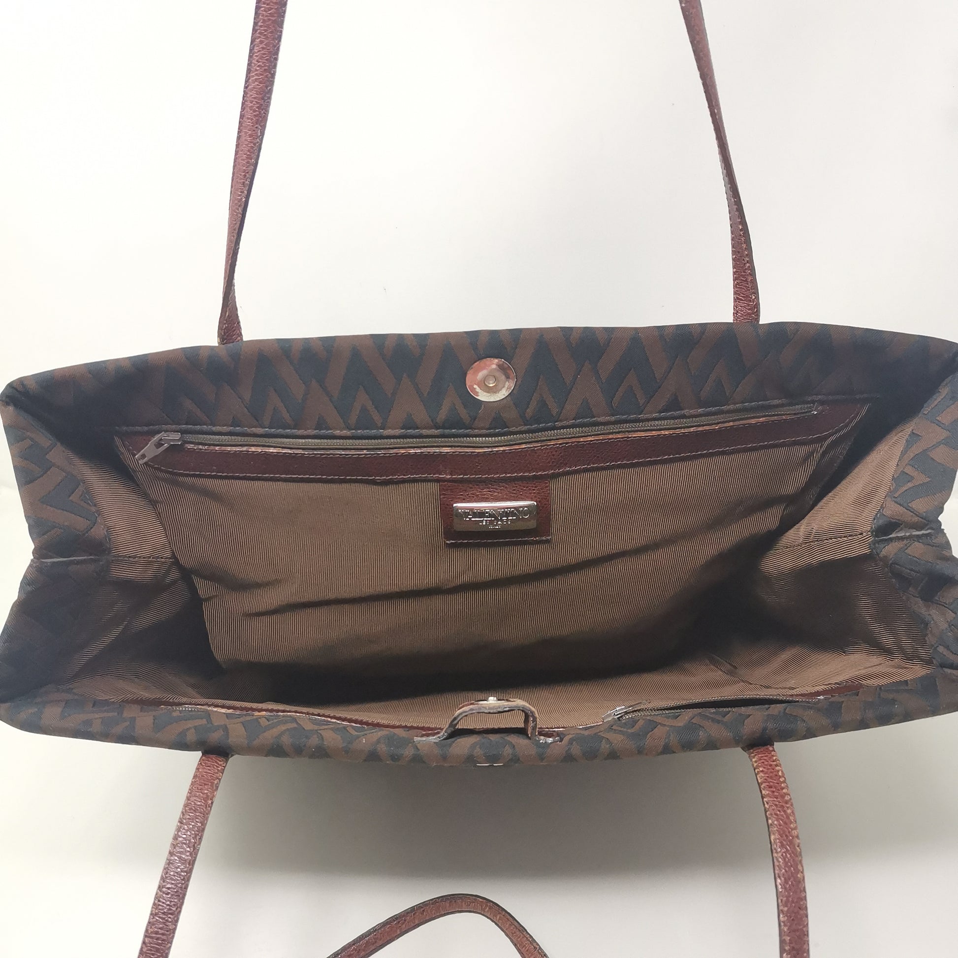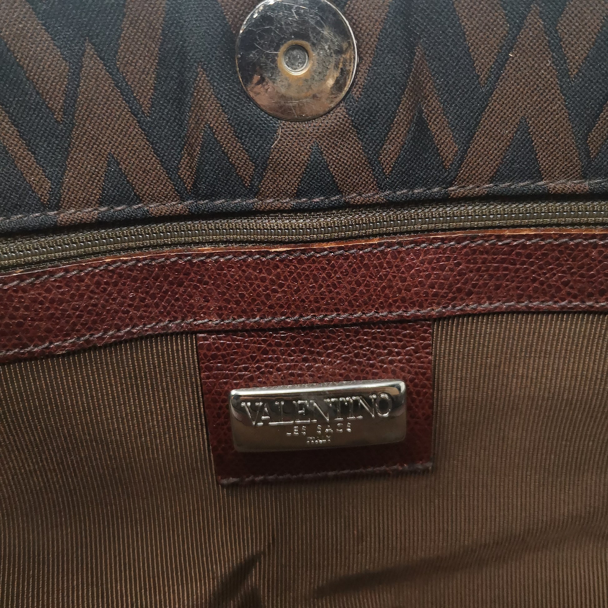 Valentino Les Sacs. Brown and black V patterned fabric bag, double leather handles with some signs of wear. Button opening and fabric interior with pocket. Leather bottom with some markings and silver-colored metal hardware. There are some small marks on corners, handles and in general. 37x29x9.5 cm, handle height 30 cm.