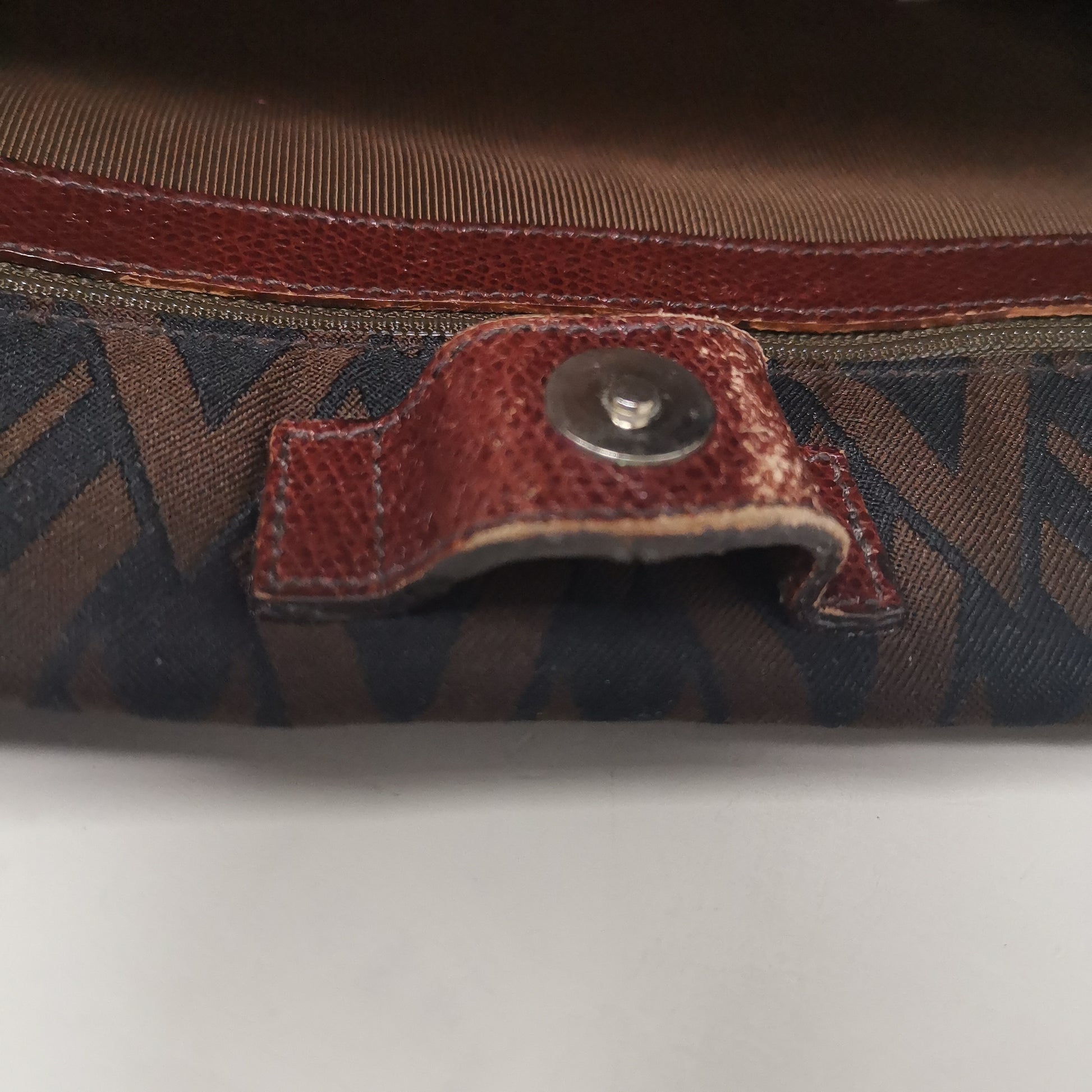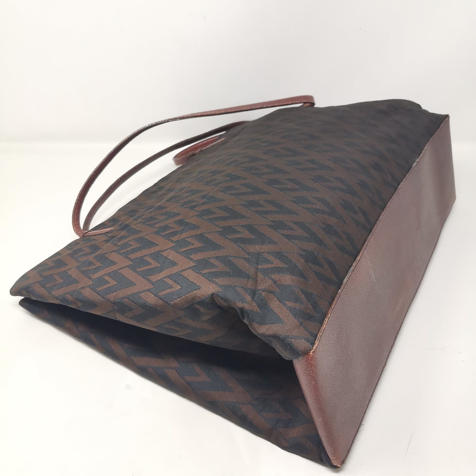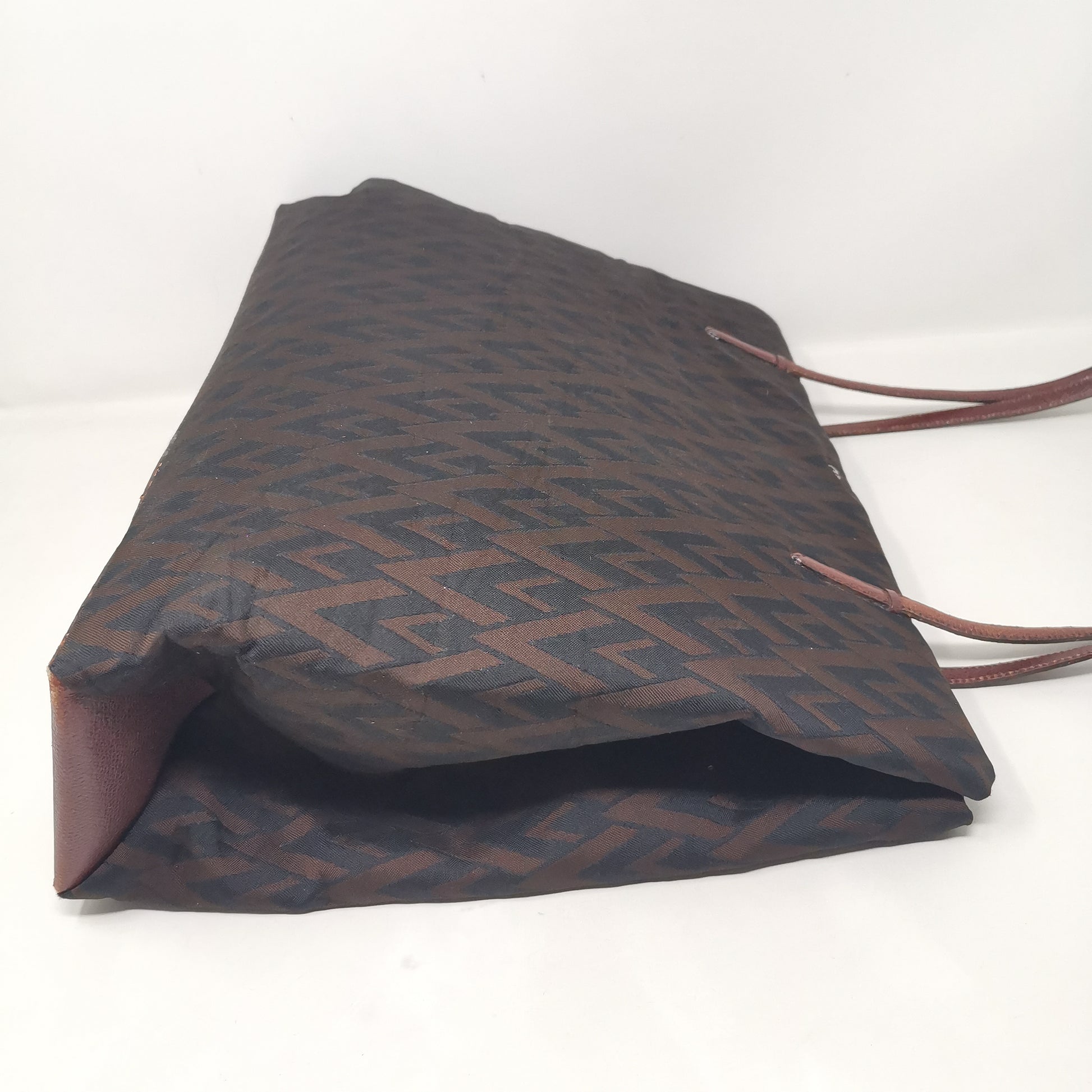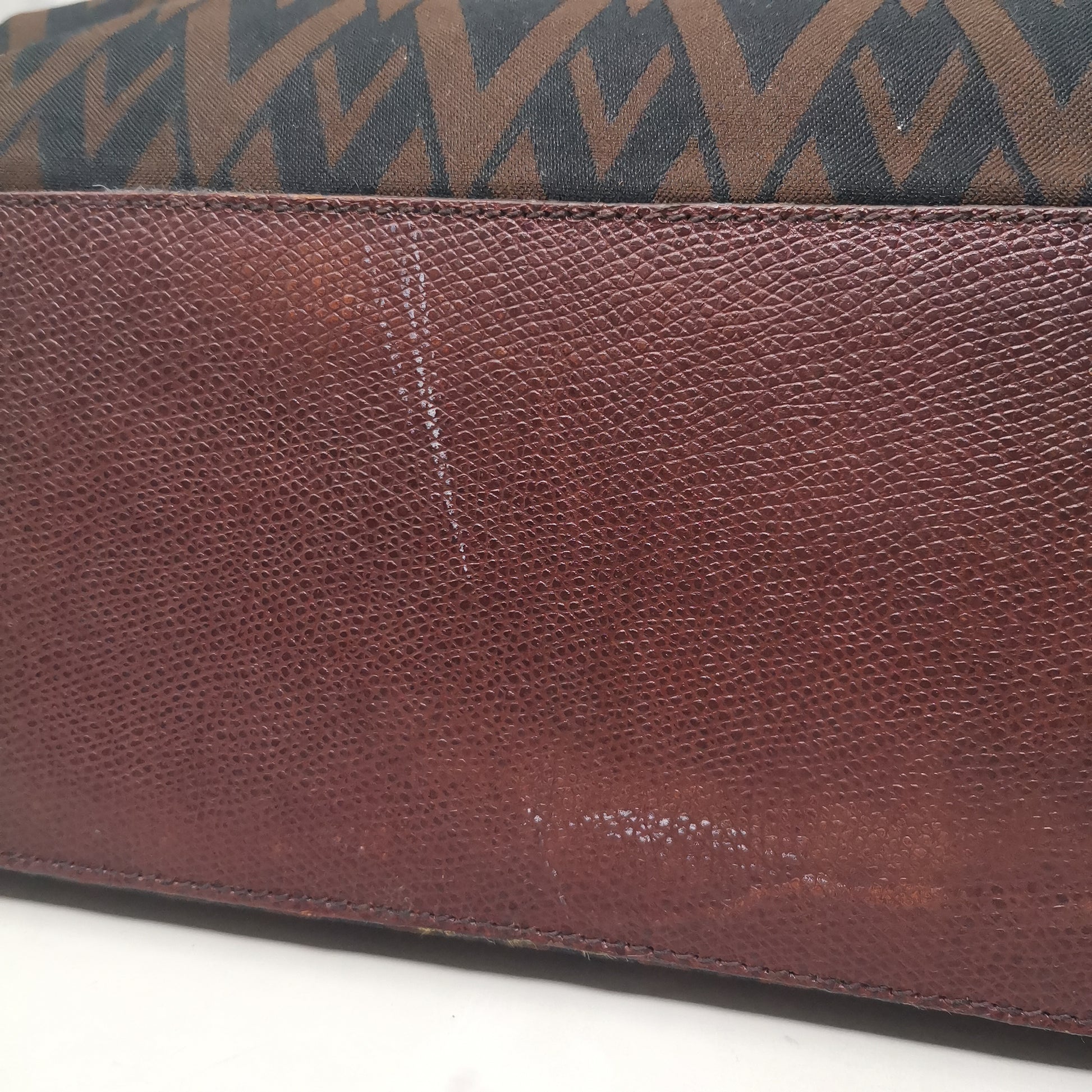 Valentino Les Sacs. Brown and black V patterned fabric bag, double leather handles with some signs of wear. Button opening and fabric interior with pocket. Leather bottom with some markings and silver-colored metal hardware. There are some small marks on corners, handles and in general. 37x29x9.5 cm, handle height 30 cm.